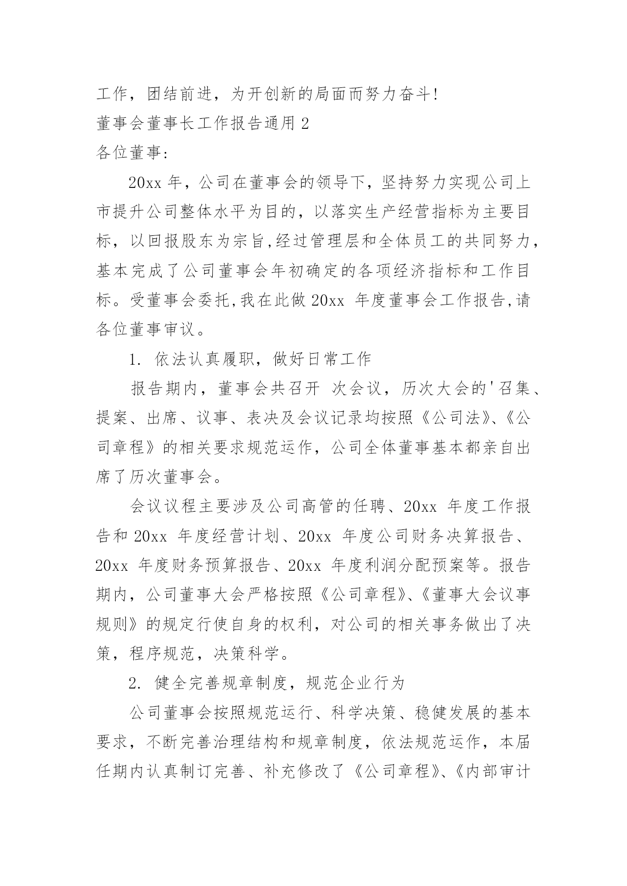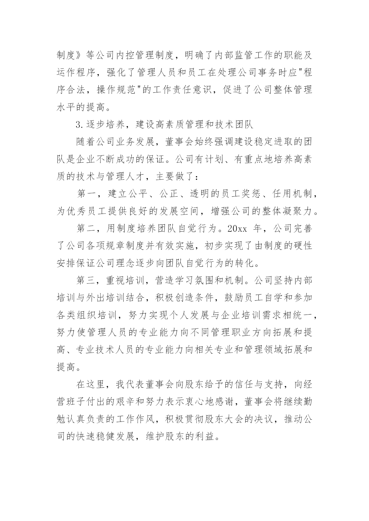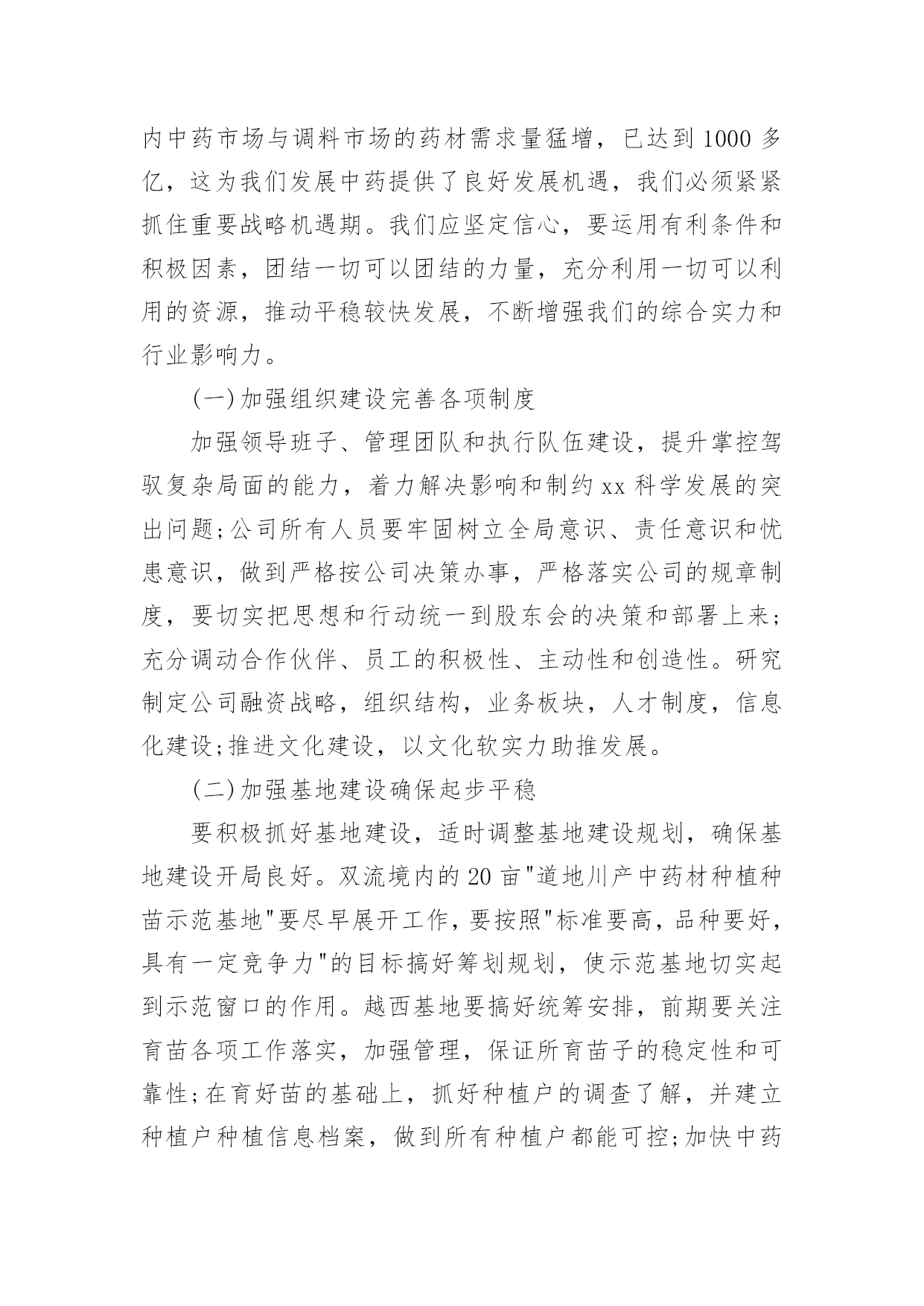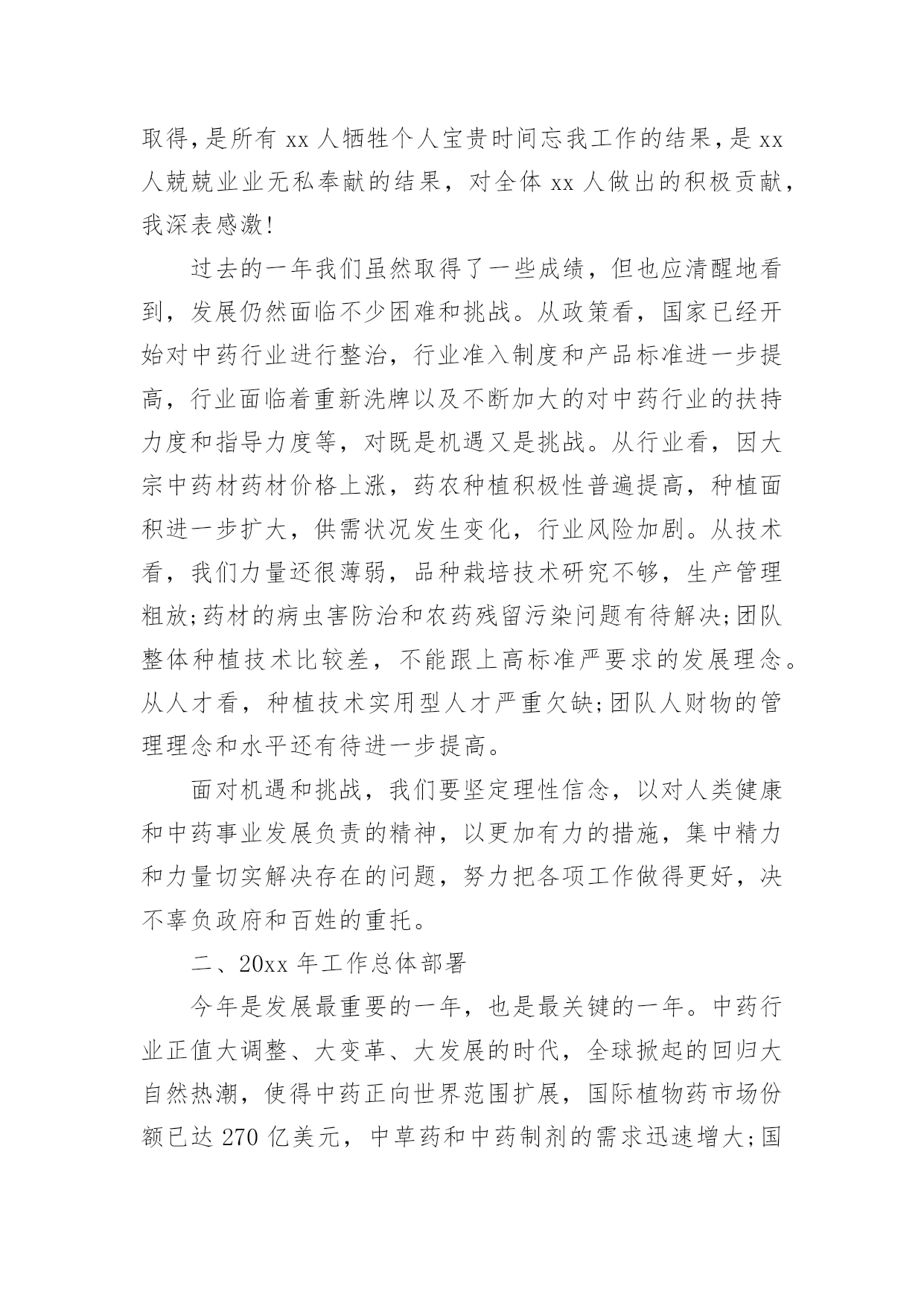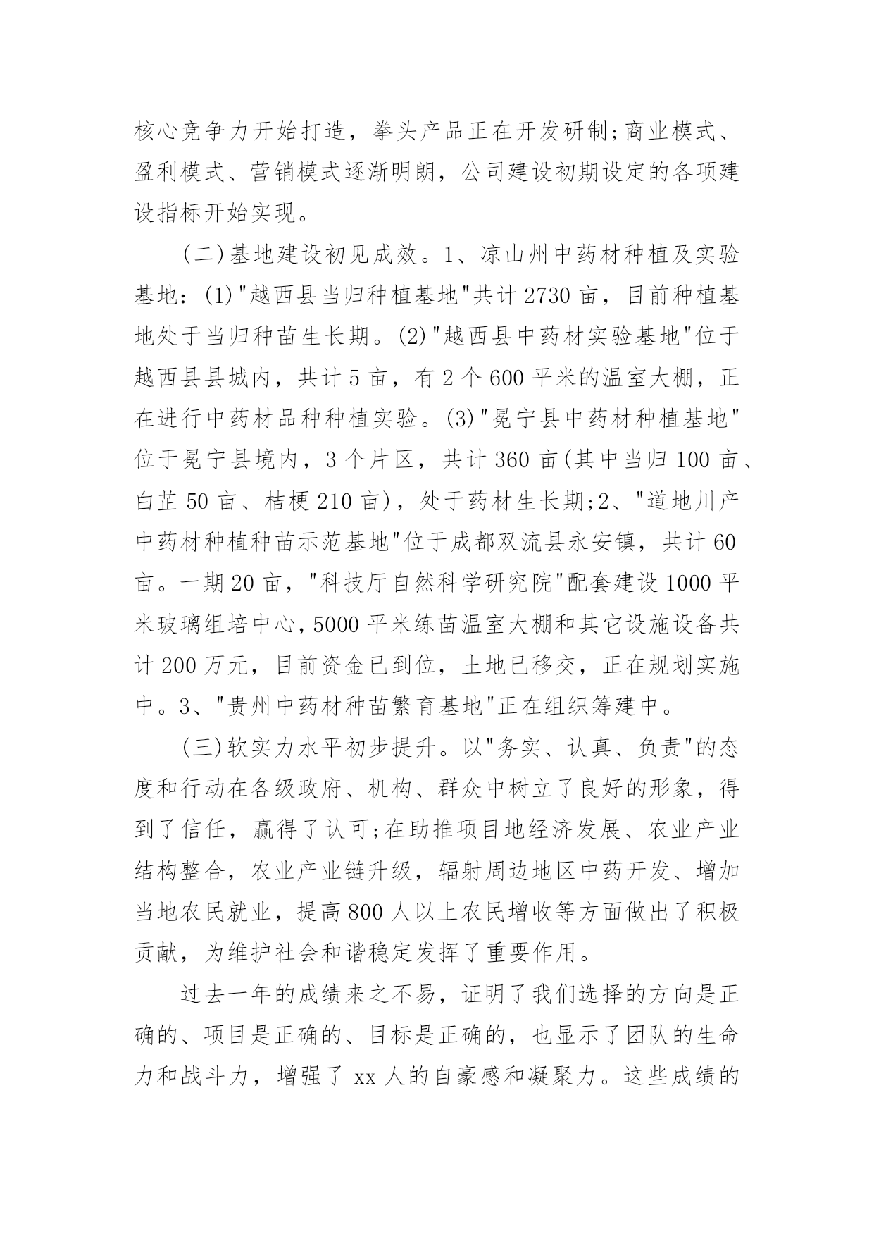 董事会董事长工作报告董事会董事长工作报告通用在当下社会,报告与我们的生活紧密相连,不同的报告内容同样也是不同的。那么一般报告是怎么写的呢?下面是小编精心整理的董事会董事长工作报告通用,欢迎阅读,希望大家能够喜欢。董事会董事长工作报告通用1各位股东、董事、监事:现在,我代表董事会,向各位报告工作,请各位审议,并提出意见。一、20xx年工作总结过去的一年,是创建之年,是不平凡之年。面对复杂多变的市场形势和艰巨繁重的发展任务,xx人同心同德,团结奋进,攻坚克难,扎实推进各项工作有序开展。xx人牢牢把握"加快建设核心竞争力"这个主题和"拳头产品发展"这条主线,坚定信心,开拓进取,加强同各行各地的交流合作,积极参与健康产业发展,为中药事业发展做出了积极贡献,取得了一定成绩。一年来,我们主要做了以下工作:(一)组织建设基本成型。组织机构已初步搭建,人员素质、能力得到一定提升,前期磨合基本完成;行业优势进一步凸显,争取政策支持、拓展市场渠道方面取得一定成效;核心竞争力开始打造,拳头产品正在开发研制;商业模式、盈利模式、营销模式逐渐明朗,公司建设初期设定的各项建设指标开始实现。(二)基地建设初见成效。1、凉山州中药材种植及实验基地:(1)"越西县当归种植基地"共计2730亩,目前种植基地处于当归种苗生长期。(2)"越西县中药材实验基地"位于越西县县城内,共计5亩,有2个600平米的温室大棚,正在进行中药材品种种植实验。(3)"冕宁县中药材种植基地"位于冕宁县境内,3个片区,共计360亩(其中当归100亩、白芷50亩、桔梗210亩),处于药材生长期;2、"道地川产中药材种植种苗示范基地"位于成都双流县永安镇,共计60亩。一期20亩,"科技厅自然科学研究院"配套建设1000平米玻璃组培中心,5000平米练苗温室大棚和其它设施设备共计200万元,目前资金已到位,土地已移交,正在规划实施中。3、"贵州中药材种苗繁育基地"正在组织筹建中。(三)软实力水平初步提升。以"务实、认真、负责"的态度和行动在各级政府、机构、群众中树立了良好的形象,得到了信任,赢得了认可;在助推项目地经济发展、农业产业结构整合,农业产业链升级,辐射周边地区中药开发、增加当地农民就业,提高800人以上农民增收等方面做出了积极贡献,为维护社会和谐稳定发挥了重要作用。过去一年的成绩来之不易,证明了我们选择的方向是正确的、项目是正确的、目标是正确的,也显示了团队的生命力和战斗力,增强了xx人的自豪感和凝聚力。这些成绩的取得,是所有xx人牺牲个人宝贵时间忘我工作的结果,是xx人兢兢业业无私奉献的结果,对全体xx人做出的积极贡献,我深表感激!过去的一年我们虽然取得了一些成绩,但也应清醒地看到,发展仍然面临不少困难和挑战。从政策看,国家已经开始对中药行业进行整治,行业准入制度和产品标准进一步提高,行业面临着重新洗牌以及不断加大的对中药行业的扶持力度和指导力度等,对既是机遇又是挑战。从行业看,因大宗中药材药材价格上涨,药农种植积极性普遍提高,种植面积进一步扩大,供需状况发生变化,行业风险加剧。从技术看,我们力量还很薄弱,品种栽培技术研究不够,生产管理粗放;药材的病虫害防治和农药残留污染问题有待解决;团队整体种植技术比较差,不能跟上高标准严要求的发展理念。从人才看,种植技术实用型人才严重欠缺;团队人财物的管理理念和水平还有待进一步提高。面对机遇和挑战,我们要坚定理性信念,以对人类健康和中药事业发展负责的精神,以更加有力的措施,集中精力和力量切实解决存在的问题,努力把各项工作做得更好,决不辜负政府和百姓的重托。二、20xx年工作总体部署今年是发展最重要的一年,也是最关键的一年。中药行业正值大调整、大变革、大发展的时代,全球掀起的回归大自然热潮,使得中药正向世界范围扩展,国际植物药市场份额已达270亿美元,中草药和中药制剂的需求迅速增大;国内中药市场与调料市场的药材需求量猛增,已达到1000多亿,这为我们发展中药提供了良好发展机遇,我们必须紧紧抓住重要战略机遇期。我们应坚定信心,要运用有利条件和积极因素,团结一切可以团结的力量,充分利用一切可以利用的资源,推动平稳较快发展,不断增强我们的综合实力和行业影响力。(一)加强组织建设完善各项制度加强领导班子、管理团队和执行队伍建设,提升掌控驾驭复杂局面的能力,着力解决影响和制约xx科学发展的突出问题;公司所有人员要牢固树立全局意识、责任意识和忧患意识,做到严格按公司决策办事,严格落实公司的规章制度,要切实把思想和行动统一到股东会的决策和部署上来;充分调动合作伙伴、员工的积极性、主动性和创造性。研究制定公司融资战略,组织结构,业务板块,人才制度,信息化建设;推进文化建设,以文化软实力助推发展。(二)加强基地建设确保起步平稳要积极抓好基地建设,适时调整基地建