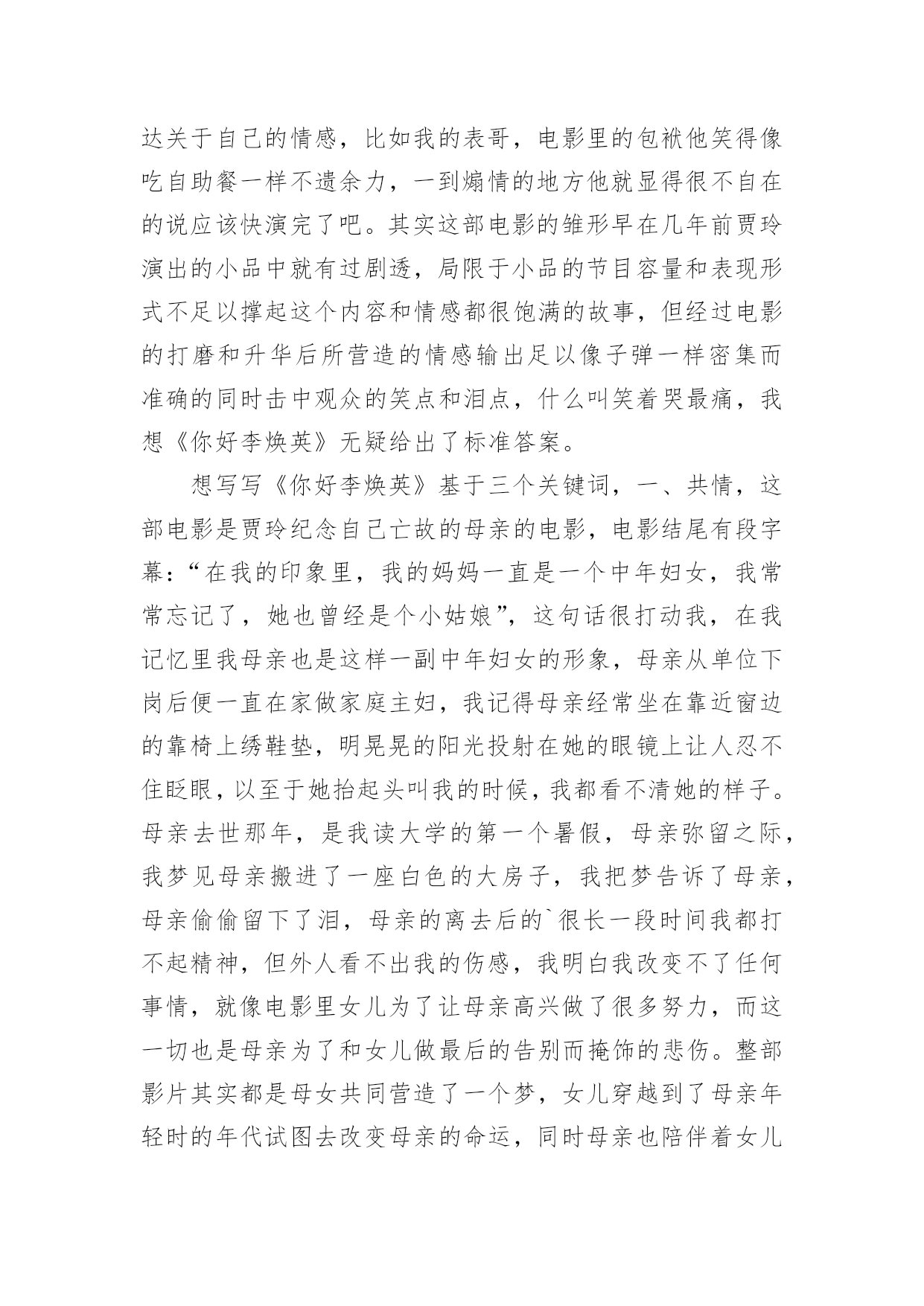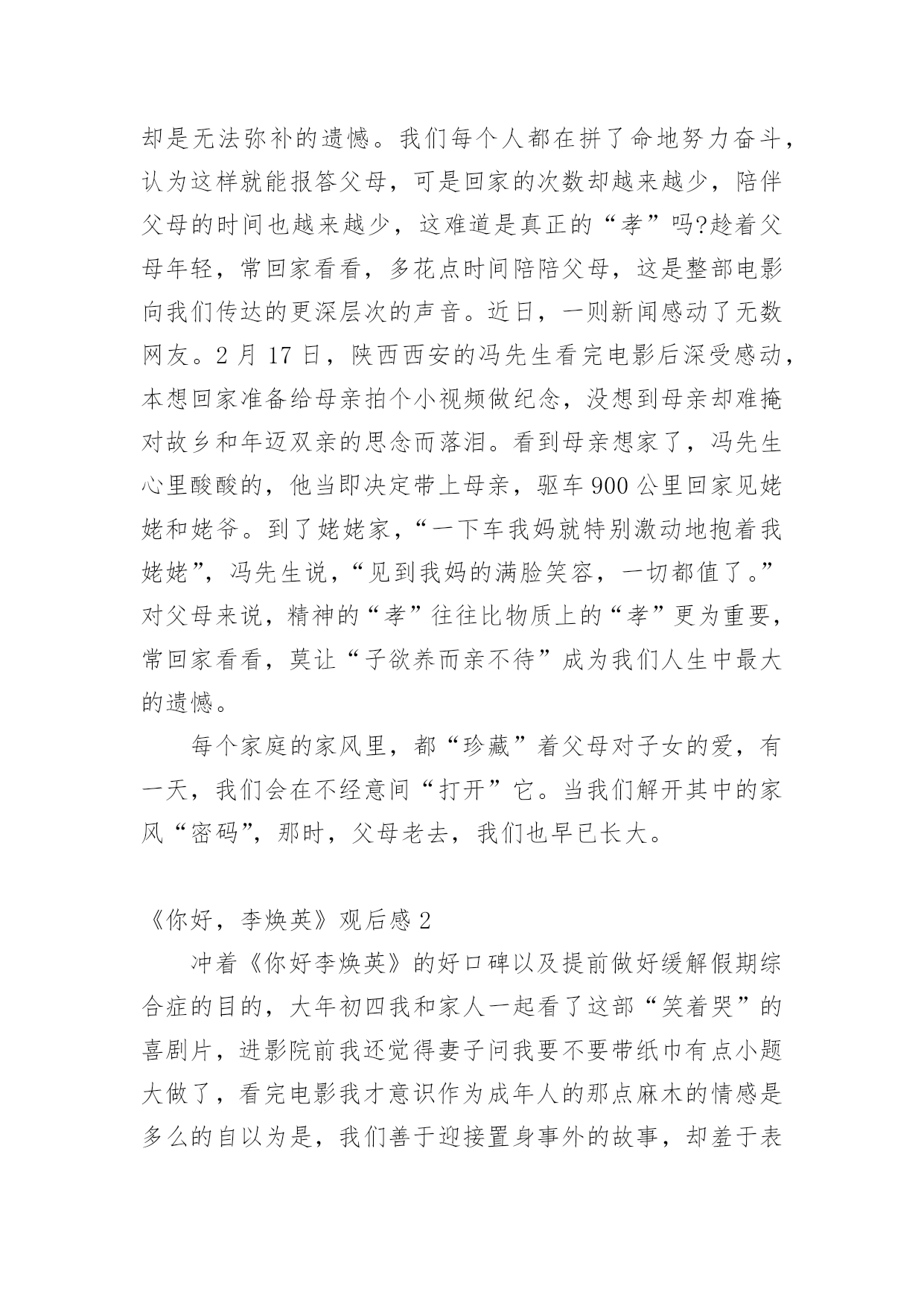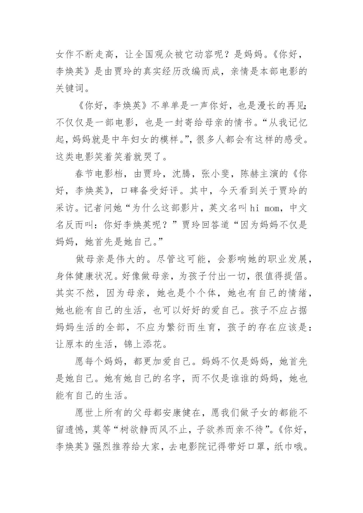 《你好,李焕英》观后感认真品味一部作品后,这次观看让你有什么领悟呢?需要好好地对所收获的东西写一篇观后感了。为了让您不再为写观后感头疼,以下是小编为大家整理的《你好,李焕英》观后感,希望能够帮助到大家。《你好,李焕英》观后感1家风里有父母对子女最深沉的爱,好家风,更是父母对子女最丰厚的馈赠。大年初一,电影《你好,李焕英》上映,除了令人捧腹大笑的有趣情节,这部电影更流露出了浓浓的爱与亲情。这样一部电影,珍藏着回忆,更生动地刻画出中华民族“母慈子孝”的优良传统。这部电影,讲述了女儿贾晓玲意外穿越回20年前,与正值青春的母亲李焕英相遇的故事。电影一经上映,好评如潮,“又笑又哭”“后劲儿太大”成了许多观众的评价。从二八式大梁自行车,到蓝色工装裤,再到黑白电视机……电影中那些怀旧元素,瞬间勾起了我们儿时的回忆。然而,真正引发我们共鸣的,则是电影中李焕英与贾晓玲这对母女间最为真挚的情感,也是那“慈”与“孝”的优良家风。宁肯自己苦点累点,只要能让儿女健康快乐,一切都是值得的。“我只要我的女儿,健康快乐就好。”这是母亲李焕英对贾晓玲说的一句话,也是整部电影中最感人的一句话。简单的一句话,却道出了天底下所有母亲对儿女无私的爱。看着儿女一天天长大,我们的母亲也已然从一个亭亭玉立的少女变成了白发苍苍的老人。为此,《人民日报》专门做了一期“你好,这是我的李焕英”的稿件征集,不少网友翻出妈妈的旧照。有网友留言说,“我妈妈真的挺能吃苦的,岁月侵蚀下,原本苗条的身材和纤细的手指也变得越来越没有少女感。”也有网友留言道:“老妈得了重病,我瞒着她。她自己偷偷知道,又偷偷装起自己的知道,让我们以为她不知道,这就是爱。”为母则刚,为了儿女牺牲一切,甚至燃烧自己的生命,这便是一种充满爱的家风。希望儿女出人头地是每一位母亲共同的心愿,但最重要的`,是儿女能健康快乐地成长。让母亲李焕英快乐一回,是电影中女儿贾晓玲“穿越”后最大的动力。为母亲“抢购”电视机,与母亲一起打排球比赛,甚至为了让母亲能过上好生活而“阻止”其与父亲结婚,女儿希望通过这样,来弥补“没出息”的自己对母亲的愧疚。可李焕英却说:“只要我的女儿,健康快乐就好。”一瞬间,贾晓玲泪如泉涌。希望儿女能够健康快乐地成长,是天底下所有母亲最大的心愿。常言道:“德不配位,必有灾殃。”如果不重视品德修养,即使获得“成功”,也是经不起考验的,而经历成长的“阵痛”,虽然可能遭遇挫折,走一些弯路,但能够在成长中感悟人生,一步一步走向真正的成功,这便是这部电影中所表达的。正是这样一种注重品德教育的优良家风,才铸就了中华民族坚韧且向上的优秀品质。“子欲养而亲不待”,电影里可以“穿越”,而在现实中却是无法弥补的遗憾。我们每个人都在拼了命地努力奋斗,认为这样就能报答父母,可是回家的次数却越来越少,陪伴父母的时间也越来越少,这难道是真正的“孝”吗?趁着父母年轻,常回家看看,多花点时间陪陪父母,这是整部电影向我们传达的更深层次的声音。近日,一则新闻感动了无数网友。2月17日,陕西西安的冯先生看完电影后深受感动,本想回家准备给母亲拍个小视频做纪念,没想到母亲却难掩对故乡和年迈双亲的思念而落泪。看到母亲想家了,冯先生心里酸酸的,他当即决定带上母亲,驱车900公里回家见姥姥和姥爷。到了姥姥家,“一下车我妈就特别激动地抱着我姥姥”,冯先生说,“见到我妈的满脸笑容,一切都值了。”对父母来说,精神的“孝”往往比物质上的“孝”更为重要,常回家看看,莫让“子欲养而亲不待”成为我们人生中最大的遗憾。每个家庭的家风里,都“珍藏”着父母对子女的爱,有一天,我们会在不经意间“打开”它。当我们解开其中的家风“密码”,那时,父母老去,我们也早已长大。《你好,李焕英》观后感2冲着《你好李焕英》的好口碑以及提前做好缓解假期综合症的目的,大年初四我和家人一起看了这部“笑着哭”的喜剧片,进影院前我还觉得妻子问我要不要带纸巾有点小题大做了,看完电影我才意识作为成年人的那点麻木的情感是多么的自以为是,我们善于迎接置身事外的故事,却羞于表达关于自己的情感,比如我的表哥,电影里的包袱他笑得像吃自助餐一样不遗余力,一到煽情的地方他就显得很不自在的说应该快演完了吧。其实这部电影的雏形早在几年前贾玲演出的小品中就有过剧透,局限于小品的节目容量和表现形式不足以撑起这个内容和情感都很饱满的故事,但经过电影的打磨和升华后所营造的情感输出足以像子弹一样密集而准确的同时击中观众的笑点和泪点,什么叫笑着哭最痛,我想《你好李焕英》无疑给出了标准答案。想写写《你好李焕英》基于三个关键词,一、共情,这部电影是贾玲纪念自己亡故的母亲的电影,电影结尾有段字幕:“在我的印象里,我的妈妈一直是一个中年妇女,我常常忘记了,她也曾经是个小姑娘”,这句话很打动我,在我记忆里我母亲也是这样一副中年妇女的形象,母亲从单