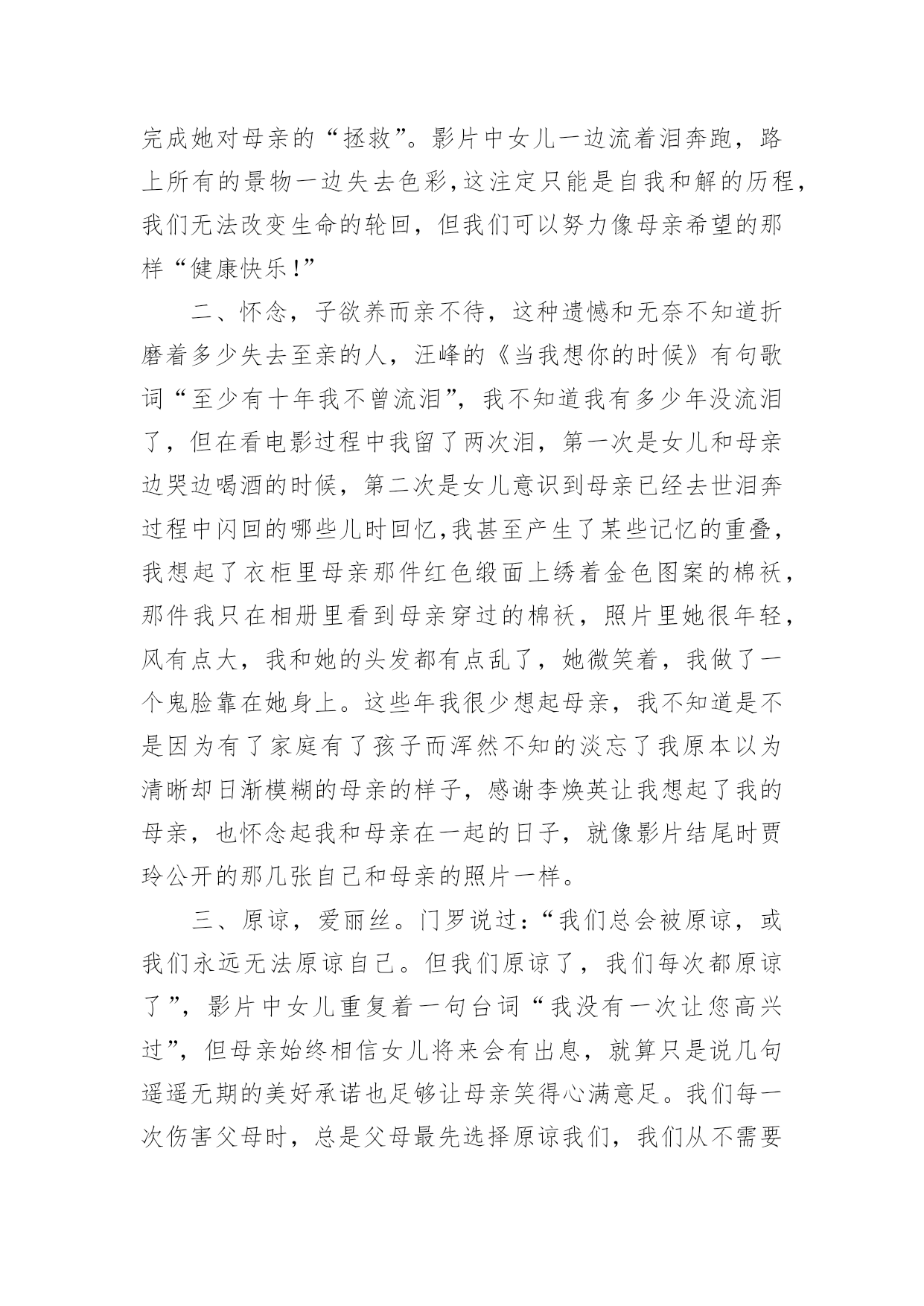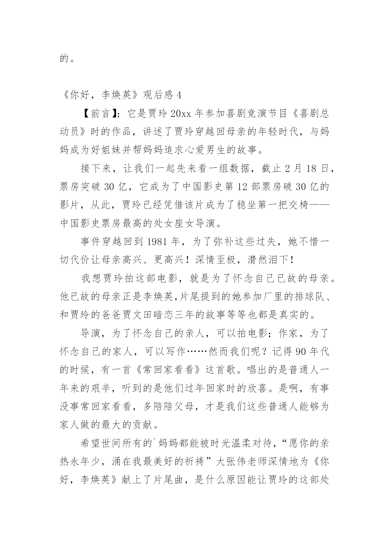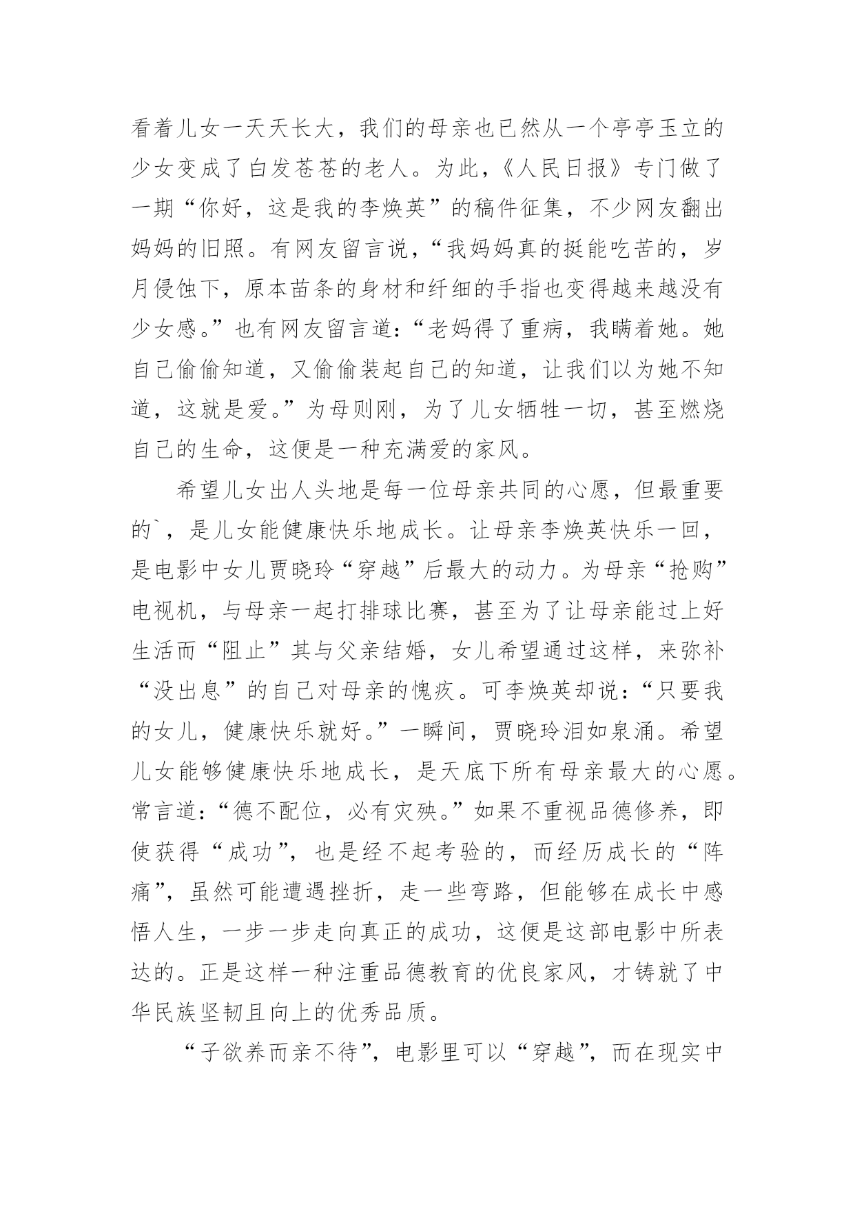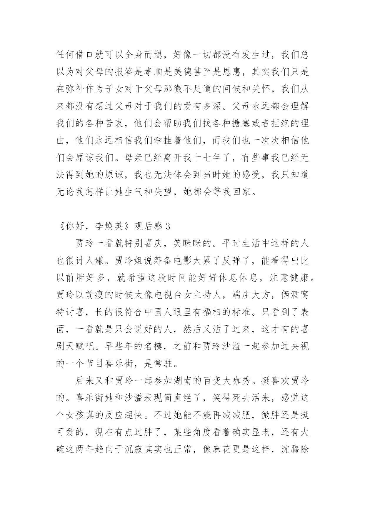 《你好,李焕英》观后感认真品味一部作品后,这次观看让你有什么领悟呢?需要好好地对所收获的东西写一篇观后感了。为了让您不再为写观后感头疼,以下是小编为大家整理的《你好,李焕英》观后感,希望能够帮助到大家。《你好,李焕英》观后感1家风里有父母对子女最深沉的爱,好家风,更是父母对子女最丰厚的馈赠。大年初一,电影《你好,李焕英》上映,除了令人捧腹大笑的有趣情节,这部电影更流露出了浓浓的爱与亲情。这样一部电影,珍藏着回忆,更生动地刻画出中华民族“母慈子孝”的优良传统。这部电影,讲述了女儿贾晓玲意外穿越回20年前,与正值青春的母亲李焕英相遇的故事。电影一经上映,好评如潮,“又笑又哭”“后劲儿太大”成了许多观众的评价。从二八式大梁自行车,到蓝色工装裤,再到黑白电视机……电影中那些怀旧元素,瞬间勾起了我们儿时的回忆。然而,真正引发我们共鸣的,则是电影中李焕英与贾晓玲这对母女间最为真挚的情感,也是那“慈”与“孝”的优良家风。宁肯自己苦点累点,只要能让儿女健康快乐,一切都是值得的。“我只要我的女儿,健康快乐就好。”这是母亲李焕英对贾晓玲说的一句话,也是整部电影中最感人的一句话。简单的一句话,却道出了天底下所有母亲对儿女无私的爱。看着儿女一天天长大,我们的母亲也已然从一个亭亭玉立的少女变成了白发苍苍的老人。为此,《人民日报》专门做了一期“你好,这是我的李焕英”的稿件征集,不少网友翻出妈妈的旧照。有网友留言说,“我妈妈真的挺能吃苦的,岁月侵蚀下,原本苗条的身材和纤细的手指也变得越来越没有少女感。”也有网友留言道:“老妈得了重病,我瞒着她。她自己偷偷知道,又偷偷装起自己的知道,让我们以为她不知道,这就是爱。”为母则刚,为了儿女牺牲一切,甚至燃烧自己的生命,这便是一种充满爱的家风。希望儿女出人头地是每一位母亲共同的心愿,但最重要的`,是儿女能健康快乐地成长。让母亲李焕英快乐一回,是电影中女儿贾晓玲“穿越”后最大的动力。为母亲“抢购”电视机,与母亲一起打排球比赛,甚至为了让母亲能过上好生活而“阻止”其与父亲结婚,女儿希望通过这样,来弥补“没出息”的自己对母亲的愧疚。可李焕英却说:“只要我的女儿,健康快乐就好。”一瞬间,贾晓玲泪如泉涌。希望儿女能够健康快乐地成长,是天底下所有母亲最大的心愿。常言道:“德不配位,必有灾殃。”如果不重视品德修养,即使获得“成功”,也是经不起考验的,而经历成长的“阵痛”,虽然可能遭遇挫折,走一些弯路,但能够在成长中感悟人生,一步一步走向真正的成功,这便是这部电影中所表达的。正是这样一种注重品德教育的优良家风,才铸就了中华民族坚韧且向上的优秀品质。“子欲养而亲不待”,电影里可以“穿越”,而在现实中却是无法弥补的遗憾。我们每个人都在拼了命地努力奋斗,认为这样就能报答父母,可是回家的次数却越来越少,陪伴父母的时间也越来越少,这难道是真正的“孝”吗?趁着父母年轻,常回家看看,多花点时间陪陪父母,这是整部电影向我们传达的更深层次的声音。近日,一则新闻感动了无数网友。2月17日,陕西西安的冯先生看完电影后深受感动,本想回家准备给母亲拍个小视频做纪念,没想到母亲却难掩对故乡和年迈双亲的思念而落泪。看到母亲想家了,冯先生心里酸酸的,他当即决定带上母亲,驱车900公里回家见姥姥和姥爷。到了姥姥家,“一下车我妈就特别激动地抱着我姥姥”,冯先生说,“见到我妈的满脸笑容,一切都值了。”对父母来说,精神的“孝”往往比物质上的“孝”更为重要,常回家看看,莫让“子欲养而亲不待”成为我们人生中最大的遗憾。每个家庭的家风里,都“珍藏”着父母对子女的爱,有一天,我们会在不经意间“打开”它。当我们解开其中的家风“密码”,那时,父母老去,我们也早已长大。《你好,李焕英》观后感2冲着《你好李焕英》的好口碑以及提前做好缓解假期综合症的目的,大年初四我和家人一起看了这部“笑着哭”的喜剧片,进影院前我还觉得妻子问我要不要带纸巾有点小题大做了,看完电影我才意识作为成年人的那点麻木的情感是多么的自以为是,我们善于迎接置身事外的故事,却羞于表达关于自己的情感,比如我的表哥,电影里的包袱他笑得像吃自助餐一样不遗余力,一到煽情的地方他就显得很不自在的说应该快演完了吧。其实这部电影的雏形早在几年前贾玲演出的小品中就有过剧透,局限于小品的节目容量和表现形式不足以撑起这个内容和情感都很饱满的故事,但经过电影的打磨和升华后所营造的情感输出足以像子弹一样密集而准确的同时击中观众的笑点和泪点,什么叫笑着哭最痛,我想《你好李焕英》无疑给出了标准答案。想写写《你好李焕英》基于三个关键词,一、共情,这部电影是贾玲纪念自己亡故的母亲的电影,电影结尾有段字幕:“在我的印象里,我的妈妈一直是一个中年妇女,我常常忘记了,她也曾经是个小姑娘”,这句话很打动我,在我记忆里我母亲也是这样一副中年妇女的形象,母亲从单