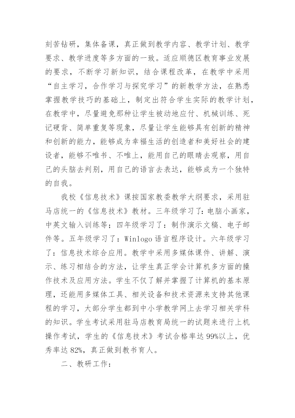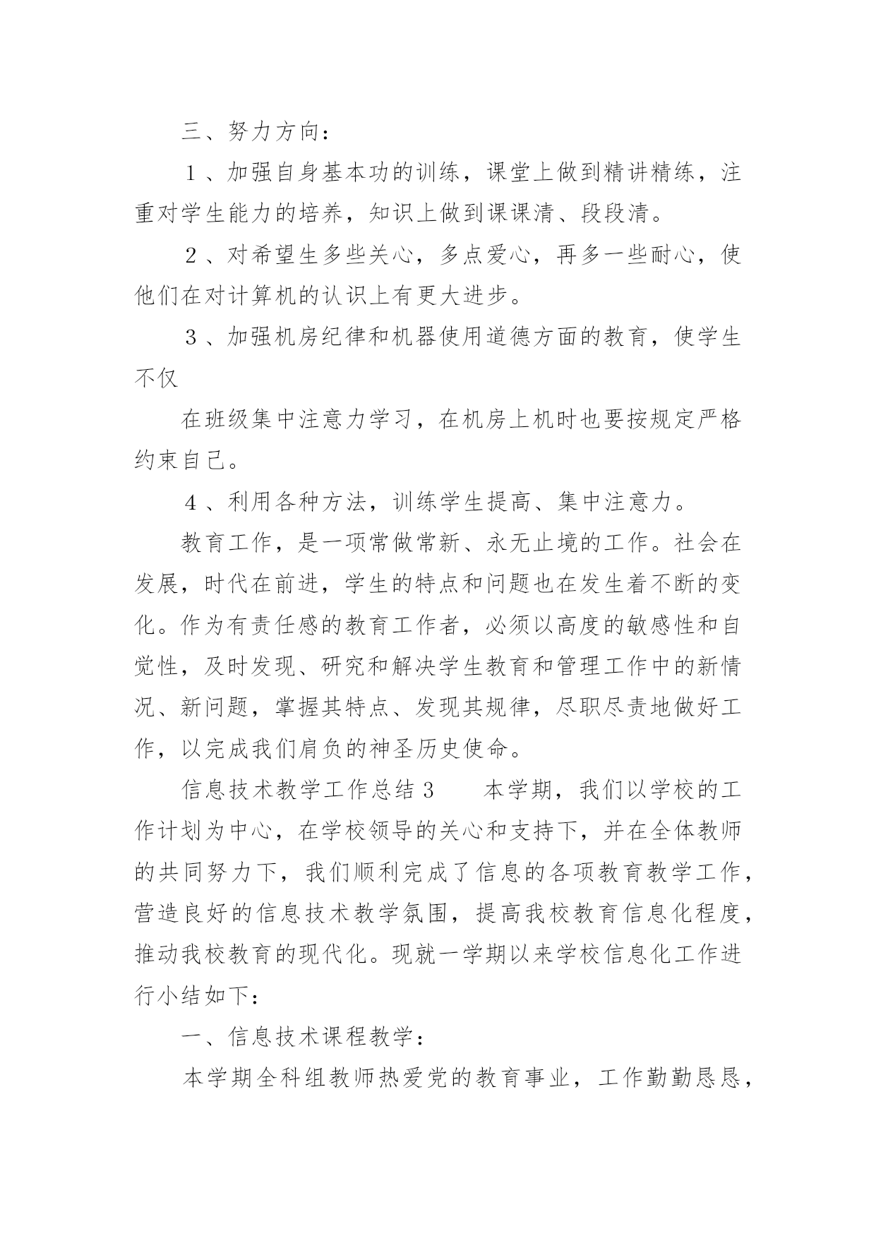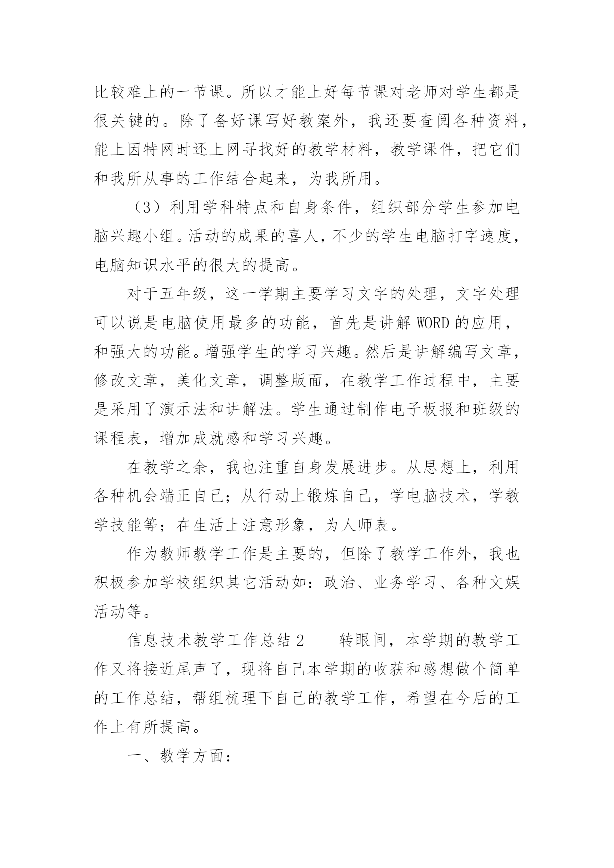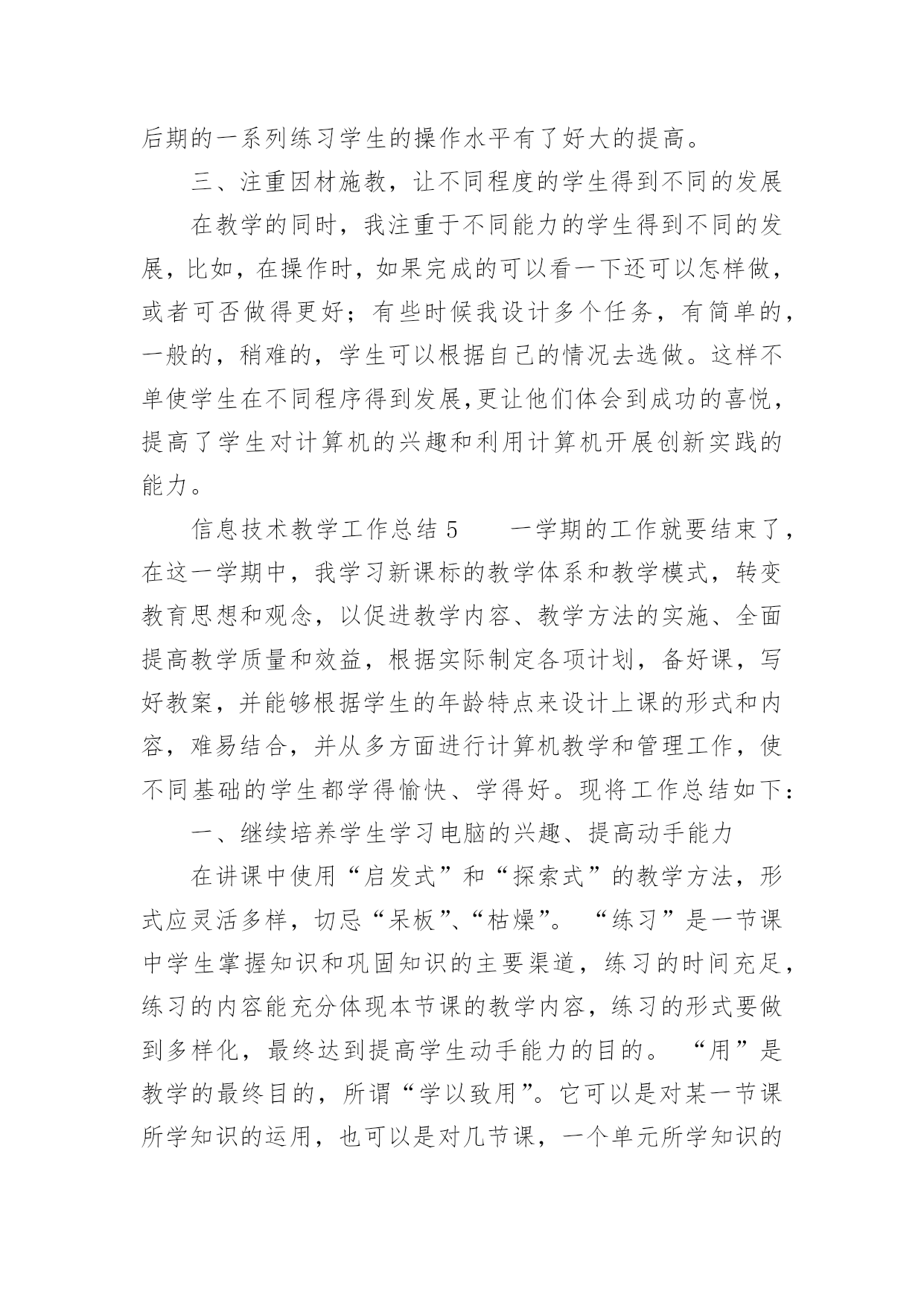 信息技术教学工作总结信息技术教学工作总结范文(通用6篇)时间是看不见也摸不到的,就在你不注意的时候,它已经悄悄的和你擦肩而过,回顾一段时间以来的教学经历,付出了汗水,也收获了成果,不如来个总结以对过去教学工作做个分析和借鉴。想必许多人都在为如何写好教学总结而烦恼吧,以下是小编整理的信息技术教学工作总结范文(通用6篇),仅供参考,大家一起来看看吧。信息技术教学工作总结1本学期比较顺利地完成任务。当然在工作中我享受到收获喜悦,也在工作中发现一些存在的问题。我所享有的收获我会用于下个学期的工作中,我所碰到的问题我要认真思考想办法解决。从教学上讲我主要做了这一些工作:(1)做到期初有计划,有教学进度,使教学工作能有条不紊地顺利进行下去;虽然其中出现一些突发事件如课程的临时调整,但由于教学计划安排的比较好,所以并没有给工作带来太大的影响,当然也有不利的一面即学生没有办法上机,缺少实践机会,这个问题在下个学期要特别加于重视解决。(2)按照学校工作管理规定,认真备好课,写好教案,努力上好每一节课。电脑课学校安排的课时比较少(一周每班一节)这对于学生来讲的很重要的一节课;对老师来讲是比较难上的一节课。所以才能上好每节课对老师对学生都是很关键的。除了备好课写好教案外,我还要查阅各种资料,能上因特网时还上网寻找好的教学材料,教学课件,把它们和我所从事的工作结合起来,为我所用。(3)利用学科特点和自身条件,组织部分学生参加电脑兴趣小组。活动的成果的喜人,不少的学生电脑打字速度,电脑知识水平的很大的提高。对于五年级,这一学期主要学习文字的处理,文字处理可以说是电脑使用最多的功能,首先是讲解WORD的应用,和强大的功能。增强学生的学习兴趣。然后是讲解编写文章,修改文章,美化文章,调整版面,在教学工作过程中,主要是采用了演示法和讲解法。学生通过制作电子板报和班级的课程表,增加成就感和学习兴趣。在教学之余,我也注重自身发展进步。从思想上,利用各种机会端正自己;从行动上锻炼自己,学电脑技术,学教学技能等;在生活上注意形象,为人师表。作为教师教学工作是主要的,但除了教学工作外,我也积极参加学校组织其它活动如:政治、业务学习、各种文娱活动等。信息技术教学工作总结2转眼间,本学期的教学工作又将接近尾声了,现将自己本学期的收获和感想做个简单的工作总结,帮组梳理下自己的教学工作,希望在今后的工作上有所提高。一、教学方面:1、备课开学初,根据学校要求,认真写好教学计划,提前备好课,写好教案。平时做到周前备课。备课时认真钻研教材,虚心向其他教师学习、请教。力求吃透教材,找准重点、难点。2、上课上好课的前提是做好课前准备,不打无准备之仗,尤其本学科主要课程都要上机完成,因此每节课前都要认真做好上机备课,检查机器状态,有无“不可用机器”。上课时认真讲课,力求抓住重点,突破难点,精讲精练,充分调动学生的学习积极性,在学习过程中充分发挥学生个人的想象力和创造力,在掌握基础知识的前提下,使学生能做出有创新、有创意的作品。通过一节课的教学使学生既掌握知识又掌握技巧,使他们有成就感,学生上了每一节课都有收获。在学生完成上机任务时,在各台计算机前巡视,注意对后进生进行手把手的辅导,课后及时找出不足。二、个人学习:对于课程改革环境下的教师,光有一桶水是不够的,教师必须拥有自来水。为此在工作中,我抓住一切机会认真学习,在不断学习、不断实践中提高自己的教育教学水平。虚心、主动地向其他信息技术教师和教学经验丰富的教师学习,丰富教学手段,抓住学校安排听课的机会,不耻下问,及时消化,吸取别人的好的教学方法,在自己的教学中不断实践,不断总结,不断提高。三、努力方向:1、加强自身基本功的训练,课堂上做到精讲精练,注重对学生能力的培养,知识上做到课课清、段段清。2、对希望生多些关心,多点爱心,再多一些耐心,使他们在对计算机的认识上有更大进步。3、加强机房纪律和机器使用道德方面的教育,使学生不仅在班级集中注意力学习,在机房上机时也要按规定严格约束自己。4、利用各种方法,训练学生提高、集中注意力。教育工作,是一项常做常新、永无止境的工作。社会在发展,时代在前进,学生的特点和问题也在发生着不断的变化。作为有责任感的教育工作者,必须以高度的敏感性和自觉性,及时发现、研究和解决学生教育和管理工作中的新情况、新问题,掌握其特点、发现其规律,尽职尽责地做好工作,以完成我们肩负的神圣历史使命。信息技术教学工作总结3本学期,我们以学校的工作计划为中心,在学校领导的关心和支持下,并在全体教师的共同努力下,我们顺利完成了信息的各项教育教学工作,营造良好的信息技术教学氛围,提高我校教育信息化程度,推动我校教育的现代化。现就一学期以来学校信息化工作进行小结如下:一、信息技术课程教学:本学期全科组教师热爱党的教育事业,工作勤勤恳