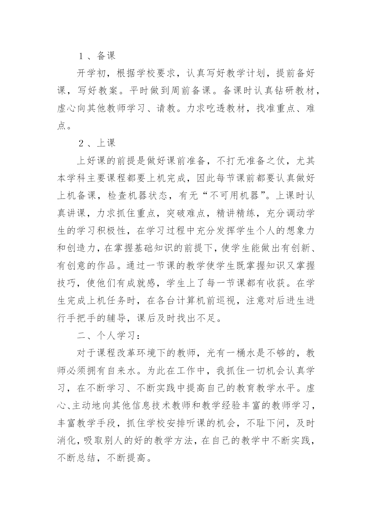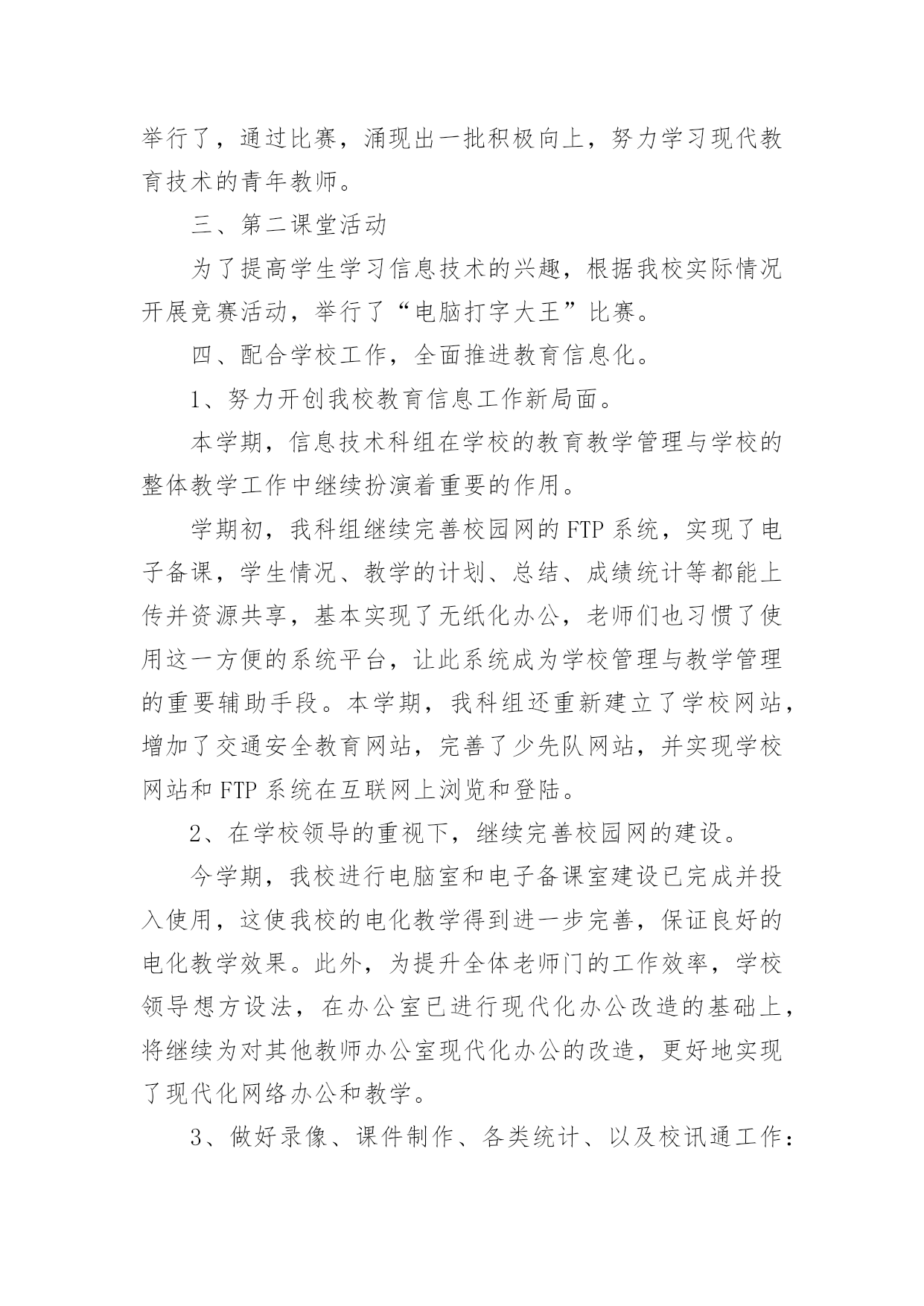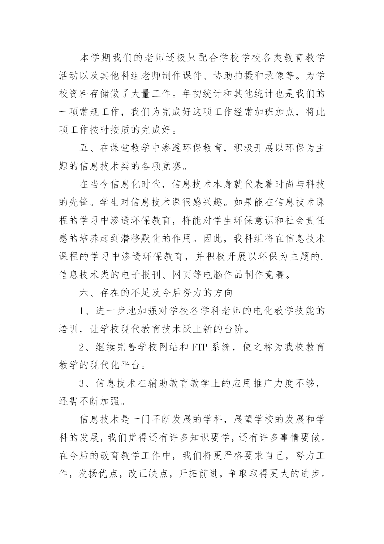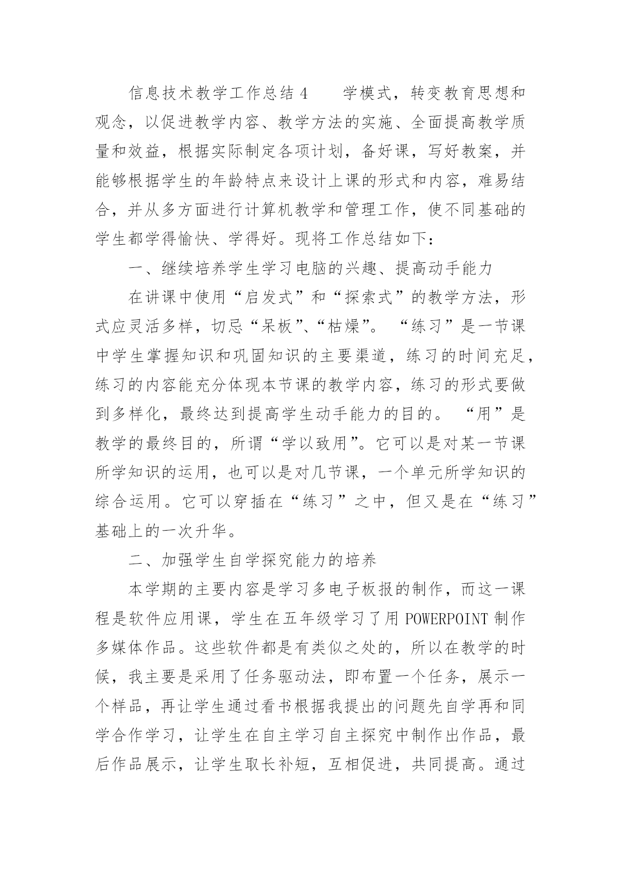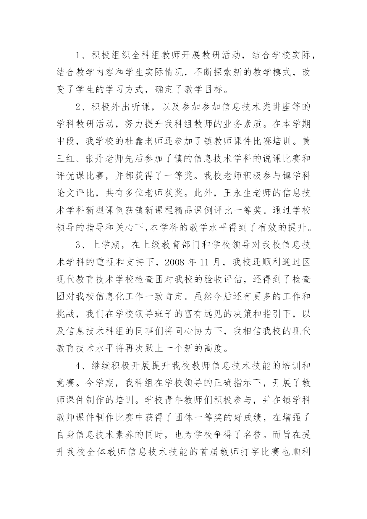 信息技术教学工作总结信息技术教学工作总结范文(通用6篇)时间是看不见也摸不到的,就在你不注意的时候,它已经悄悄的和你擦肩而过,回顾一段时间以来的教学经历,付出了汗水,也收获了成果,不如来个总结以对过去教学工作做个分析和借鉴。想必许多人都在为如何写好教学总结而烦恼吧,以下是小编整理的信息技术教学工作总结范文(通用6篇),仅供参考,大家一起来看看吧。信息技术教学工作总结1本学期比较顺利地完成任务。当然在工作中我享受到收获喜悦,也在工作中发现一些存在的问题。我所享有的收获我会用于下个学期的工作中,我所碰到的问题我要认真思考想办法解决。从教学上讲我主要做了这一些工作:(1)做到期初有计划,有教学进度,使教学工作能有条不紊地顺利进行下去;虽然其中出现一些突发事件如课程的临时调整,但由于教学计划安排的比较好,所以并没有给工作带来太大的影响,当然也有不利的一面即学生没有办法上机,缺少实践机会,这个问题在下个学期要特别加于重视解决。(2)按照学校工作管理规定,认真备好课,写好教案,努力上好每一节课。电脑课学校安排的课时比较少(一周每班一节)这对于学生来讲的很重要的一节课;对老师来讲是比较难上的一节课。所以才能上好每节课对老师对学生都是很关键的。除了备好课写好教案外,我还要查阅各种资料,能上因特网时还上网寻找好的教学材料,教学课件,把它们和我所从事的工作结合起来,为我所用。(3)利用学科特点和自身条件,组织部分学生参加电脑兴趣小组。活动的成果的喜人,不少的学生电脑打字速度,电脑知识水平的很大的提高。对于五年级,这一学期主要学习文字的处理,文字处理可以说是电脑使用最多的功能,首先是讲解WORD的应用,和强大的功能。增强学生的学习兴趣。然后是讲解编写文章,修改文章,美化文章,调整版面,在教学工作过程中,主要是采用了演示法和讲解法。学生通过制作电子板报和班级的课程表,增加成就感和学习兴趣。在教学之余,我也注重自身发展进步。从思想上,利用各种机会端正自己;从行动上锻炼自己,学电脑技术,学教学技能等;在生活上注意形象,为人师表。作为教师教学工作是主要的,但除了教学工作外,我也积极参加学校组织其它活动如:政治、业务学习、各种文娱活动等。信息技术教学工作总结2转眼间,本学期的教学工作又将接近尾声了,现将自己本学期的收获和感想做个简单的工作总结,帮组梳理下自己的教学工作,希望在今后的工作上有所提高。一、教学方面:1、备课开学初,根据学校要求,认真写好教学计划,提前备好课,写好教案。平时做到周前备课。备课时认真钻研教材,虚心向其他教师学习、请教。力求吃透教材,找准重点、难点。2、上课上好课的前提是做好课前准备,不打无准备之仗,尤其本学科主要课程都要上机完成,因此每节课前都要认真做好上机备课,检查机器状态,有无“不可用机器”。上课时认真讲课,力求抓住重点,突破难点,精讲精练,充分调动学生的学习积极性,在学习过程中充分发挥学生个人的想象力和创造力,在掌握基础知识的前提下,使学生能做出有创新、有创意的作品。通过一节课的教学使学生既掌握知识又掌握技巧,使他们有成就感,学生上了每一节课都有收获。在学生完成上机任务时,在各台计算机前巡视,注意对后进生进行手把手的辅导,课后及时找出不足。二、个人学习:对于课程改革环境下的教师,光有一桶水是不够的,教师必须拥有自来水。为此在工作中,我抓住一切机会认真学习,在不断学习、不断实践中提高自己的教育教学水平。虚心、主动地向其他信息技术教师和教学经验丰富的教师学习,丰富教学手段,抓住学校安排听课的机会,不耻下问,及时消化,吸取别人的好的教学方法,在自己的教学中不断实践,不断总结,不断提高。三、努力方向:1、加强自身基本功的训练,课堂上做到精讲精练,注重对学生能力的培养,知识上做到课课清、段段清。2、对希望生多些关心,多点爱心,再多一些耐心,使他们在对计算机的认识上有更大进步。3、加强机房纪律和机器使用道德方面的教育,使学生不仅在班级集中注意力学习,在机房上机时也要按规定严格约束自己。4、利用各种方法,训练学生提高、集中注意力。教育工作,是一项常做常新、永无止境的工作。社会在发展,时代在前进,学生的特点和问题也在发生着不断的变化。作为有责任感的教育工作者,必须以高度的敏感性和自觉性,及时发现、研究和解决学生教育和管理工作中的新情况、新问题,掌握其特点、发现其规律,尽职尽责地做好工作,以完成我们肩负的神圣历史使命。信息技术教学工作总结3本学期,我们以学校的工作计划为中心,在学校领导的关心和支持下,并在全体教师的共同努力下,我们顺利完成了信息的各项教育教学工作,营造良好的信息技术教学氛围,提高我校教育信息化程度,推动我校教育的现代化。现就一学期以来学校信息化工作进行小结如下:一、信息技术课程教学:本学期全科组教师热爱党的教育事业,工作勤勤恳