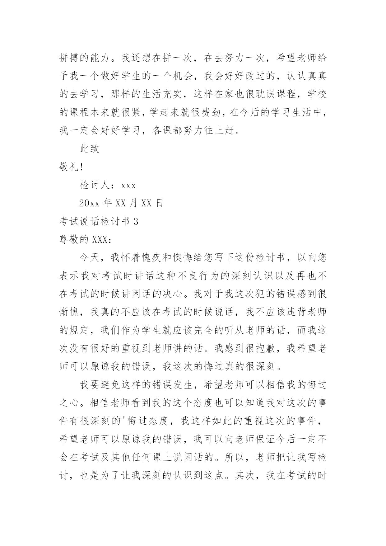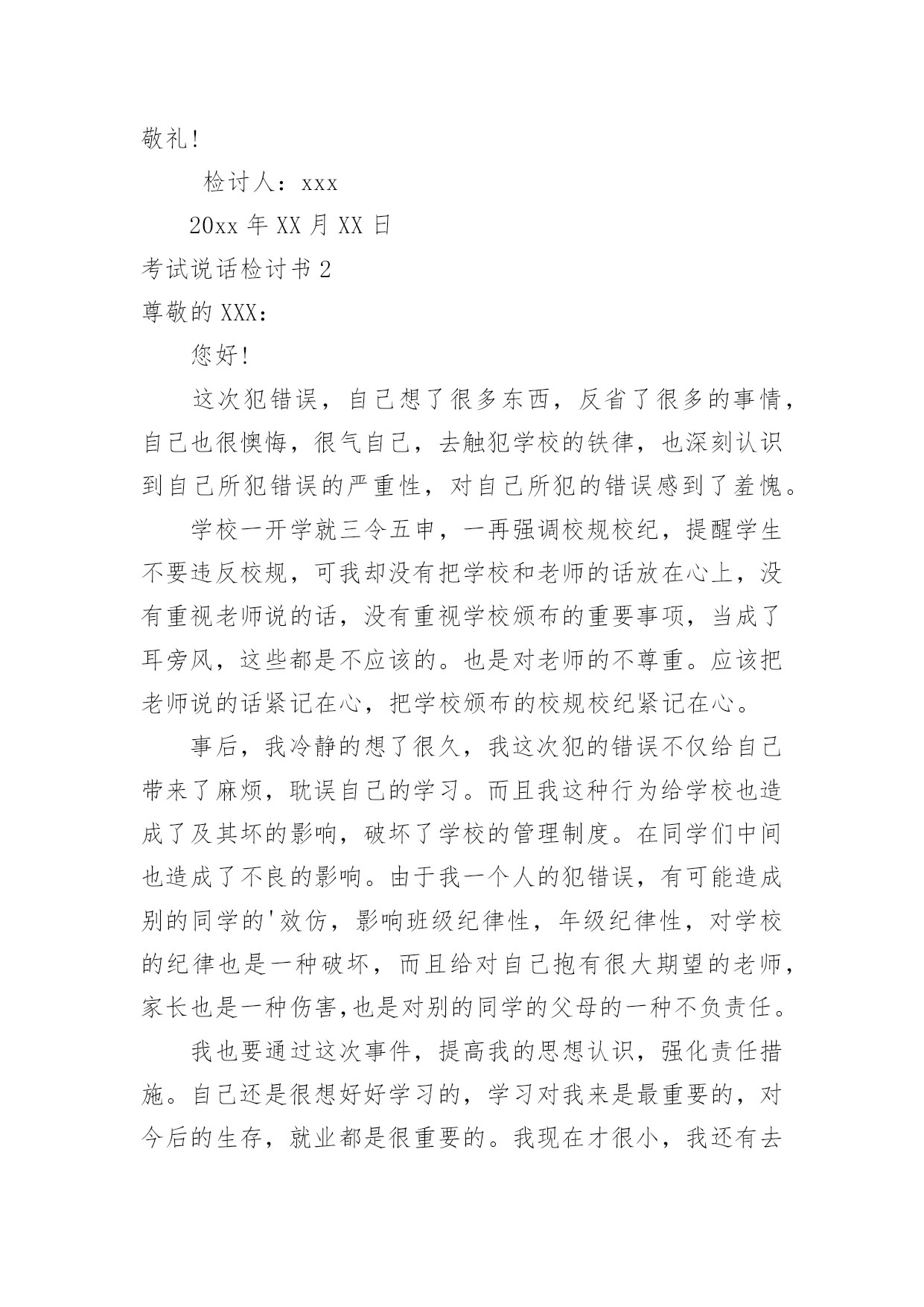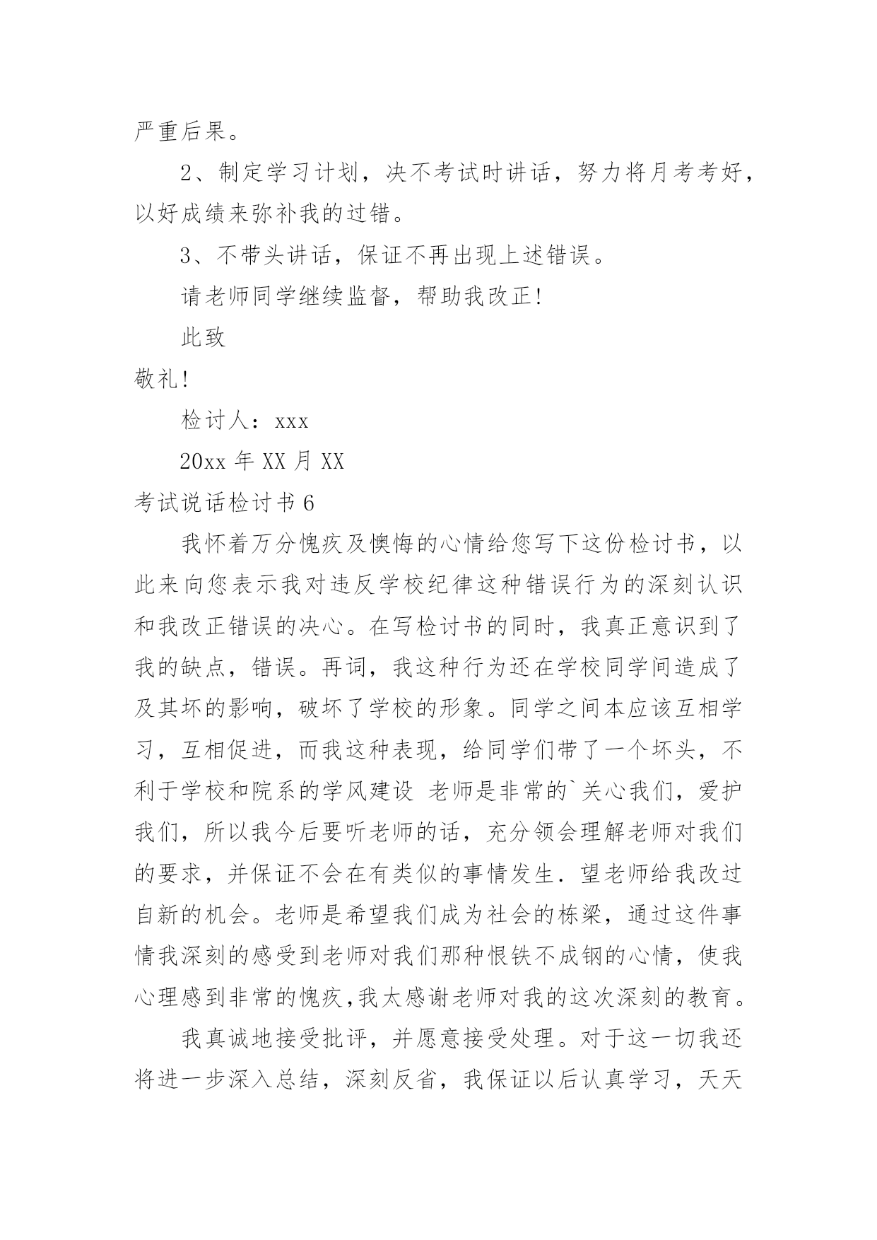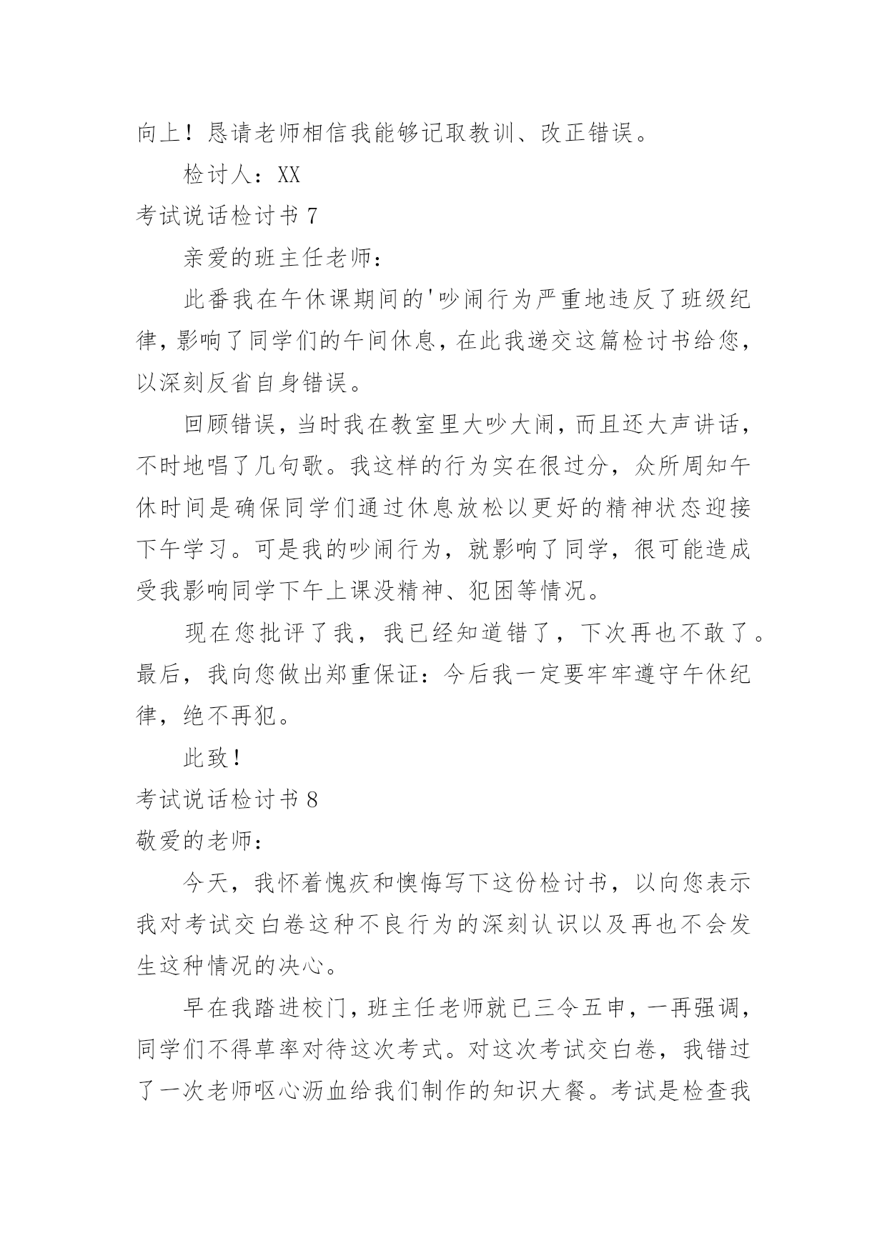 考试说话检讨书考试说话检讨书在某件事出现差错以后,为了避免再次出现相同情况,我们要通过写检讨书来进行自我反省,请注意写检讨书的心态要端正。来参考自己需要的检讨书吧!下面是小编为大家整理的考试说话检讨书,欢迎大家借鉴与参考,希望对大家有所帮助。考试说话检讨书1敬爱的老师:您好!对不起!作为一名学生,我深知好好学习、遵守校纪校规是我们每个学生应该做的,也是中华民族的优良传统美德,可是我作为当代的学生却没有好好的把它传承下来。我在无知中违犯了纪律,不明白自己的学习目的。错误的性质是严重的。我在考试的时候和别的同学说话,并且打扰到其他的同学,其结果损害了多方利益。这种行为,即使是并没有给别人带来伤害,仍然是不对的,此举本身就是违背了做学生的原则。我只是顾着自己的玩乐和一时的想法,完全不理会老师的感受,这也是不对的,人是社会的人,大家不应该只是想着自己,我这么做,害的是我自己;我这样做,看似在现在玩的开心,实际上是在害自己。而且,一旦考试的时候我现在不会也是对老师的不尊重。所以,当老师对我进行批评教育的时候,也是为了让我深刻的认识到这点。其二,我考试的时候和别的同学说话也是一种对老师的工作不尊敬的'表现。中国是一个礼仪之邦,自古就讲究尊师重道,这是一种传统的美德,过去我一直忽视了它。其三,父母送我上学,此乃望子成龙之举,而我却上课说话,对于知识无动于衷,所以我同时也是对父母的一种间接性的不孝。这次上课讲话违背了教育管理,影响了老师的工作正常运转,此乃不忠,一罪也。更让老师您为此事殚精竭虑,伤心失望,此乃不仁,二罪也。又有辜负了伟大父母对我殷切希望,浪费在校学习的时间,乃不孝,三罪也……在写此检讨之时,我深感自己的无知。其实,那次说话是完全可以控制的,因为当时说实话,话题的是有关“二战”的军事知识,我们知道与课堂知识无关,但是我们依旧无法控制我们的情绪,我们在旁若无人中、在得意忘形中扰乱了课堂纪律。这次说话的确影响到了其他同学,这点我反思深刻,想了很多,也许会引起的不只是影响同学上课听讲,而且还会让同学对我们产生厌恶之感,所以这次的教训我是有深刻思考的。我接受老师的批评教导,愿意接受处理,对于这件事我还将进一步深入总结,深刻反省。此致敬礼!检讨人:xxx20xx年XX月XX日考试说话检讨书2尊敬的XXX:您好!这次犯错误,自己想了很多东西,反省了很多的事情,自己也很懊悔,很气自己,去触犯学校的铁律,也深刻认识到自己所犯错误的严重性,对自己所犯的错误感到了羞愧。学校一开学就三令五申,一再强调校规校纪,提醒学生不要违反校规,可我却没有把学校和老师的话放在心上,没有重视老师说的话,没有重视学校颁布的重要事项,当成了耳旁风,这些都是不应该的。也是对老师的不尊重。应该把老师说的话紧记在心,把学校颁布的校规校纪紧记在心。事后,我冷静的想了很久,我这次犯的错误不仅给自己带来了麻烦,耽误自己的学习。而且我这种行为给学校也造成了及其坏的影响,破坏了学校的管理制度。在同学们中间也造成了不良的影响。由于我一个人的犯错误,有可能造成别的同学的'效仿,影响班级纪律性,年级纪律性,对学校的纪律也是一种破坏,而且给对自己抱有很大期望的老师,家长也是一种伤害,也是对别的同学的父母的一种不负责任。我也要通过这次事件,提高我的思想认识,强化责任措施。自己还是很想好好学习的,学习对我来是最重要的,对今后的生存,就业都是很重要的。我现在才很小,我还有去拼搏的能力。我还想在拼一次,在去努力一次,希望老师给予我一个做好学生的一个机会,我会好好改过的,认认真真的去学习,那样的生活充实,这样在家也很耽误课程,学校的课程本来就很紧,学起来就很费劲,在今后的学习生活中,我一定会好好学习,各课都努力往上赶。此致敬礼!检讨人:xxx20xx年XX月XX日考试说话检讨书3尊敬的XXX:今天,我怀着愧疚和懊悔给您写下这份检讨书,以向您表示我对考试时讲话这种不良行为的深刻认识以及再也不在考试的时候讲闲话的决心。我对于我这次犯的错误感到很惭愧,我真的不应该在考试的时候说话,我不应该违背老师的规定,我们作为学生就应该完全的听从老师的话,而我这次没有很好的重视到老师讲的话。我感到很抱歉,我希望老师可以原谅我的错误,我这次的悔过真的很深刻。我要避免这样的错误发生,希望老师可以相信我的悔过之心。相信老师看到我的这个态度也可以知道我对这次的事件有很深刻的'悔过态度,我这样如此的重视这次的事件,希望老师可以原谅我的错误,我可以向老师保证今后一定不会在考试及其他任何课上说闲话的。所以,老师把让我写检讨,也是为了让我深刻的认识到这点。其次,我在考试的时候讲闲话的行为也是一种对老师的工作不尊敬的表现,也是对同学的一种不礼貌的行为。中国是一个礼仪之邦,自古就讲究尊师重道,团结同学,这是一种传统的美德,过去我一直忽视了