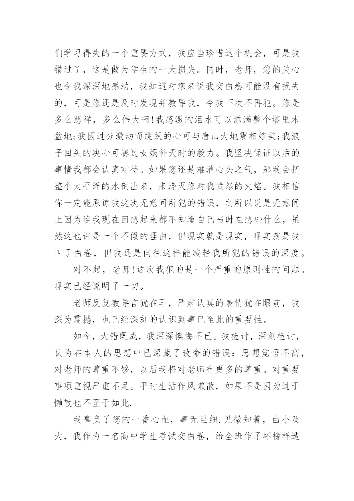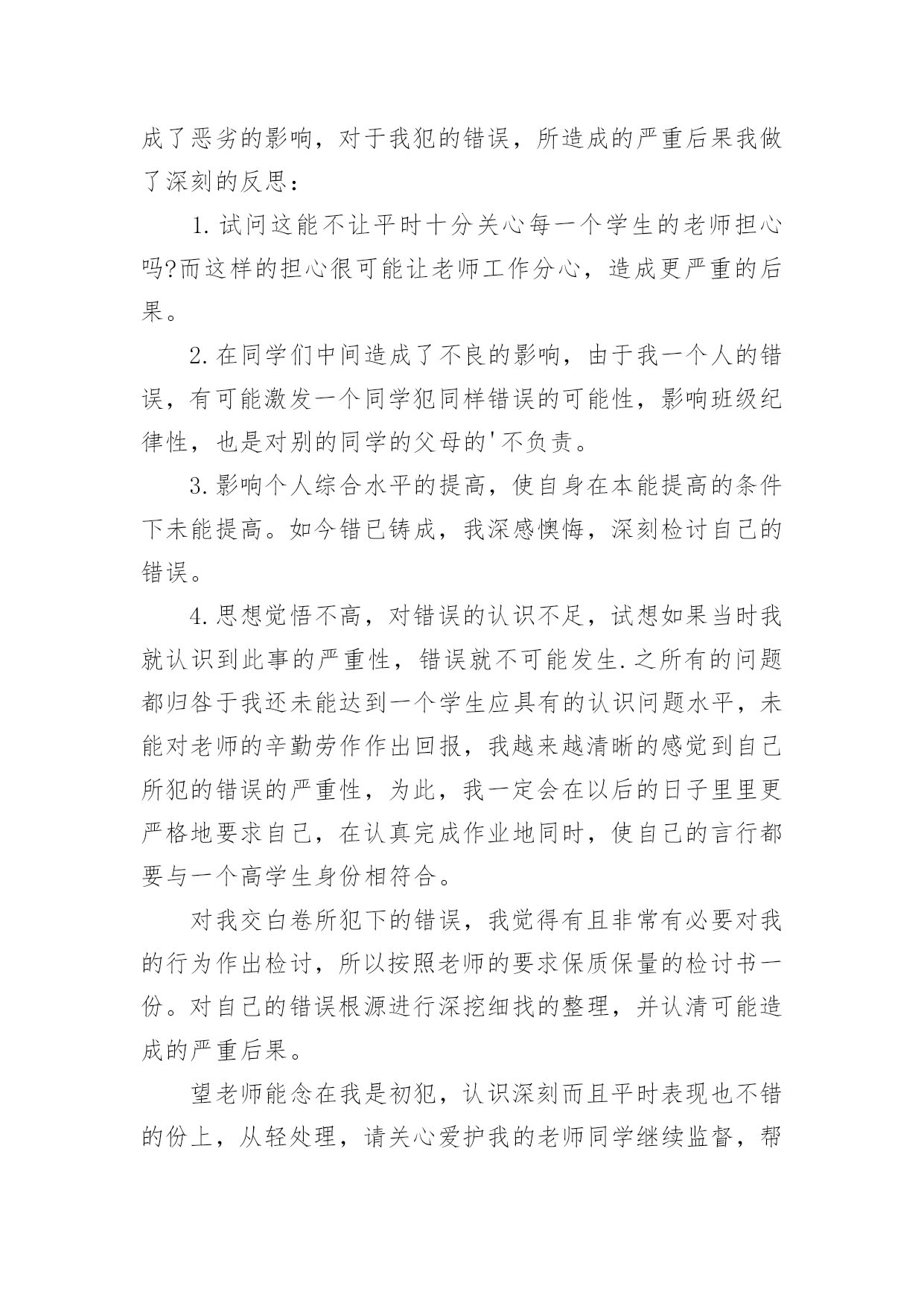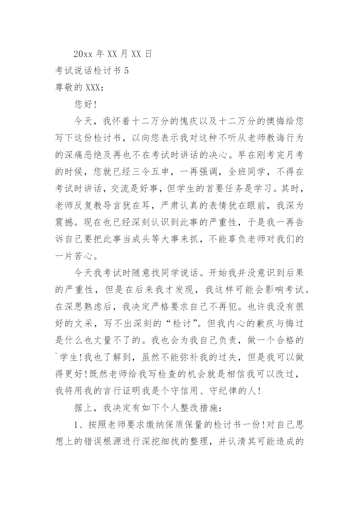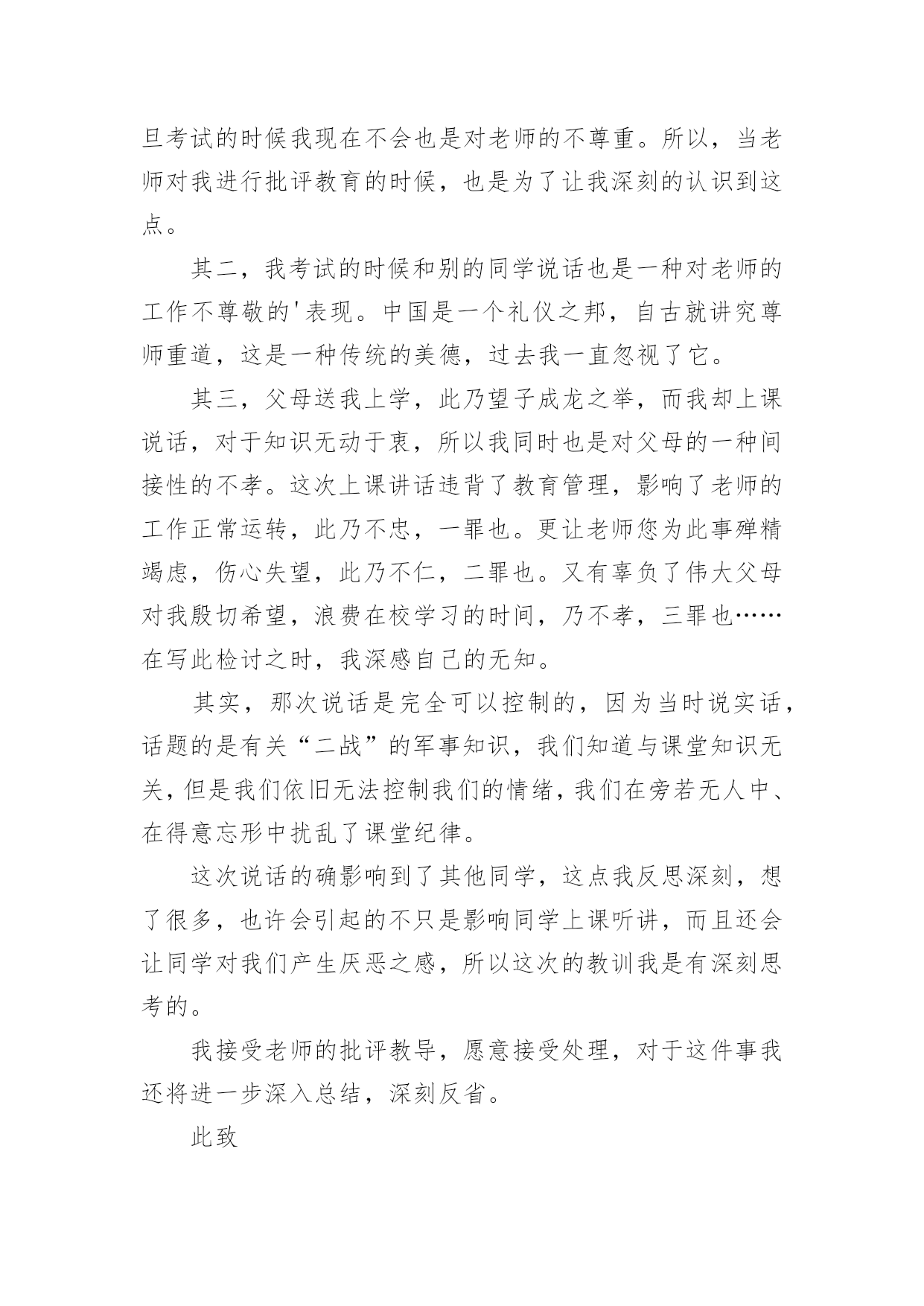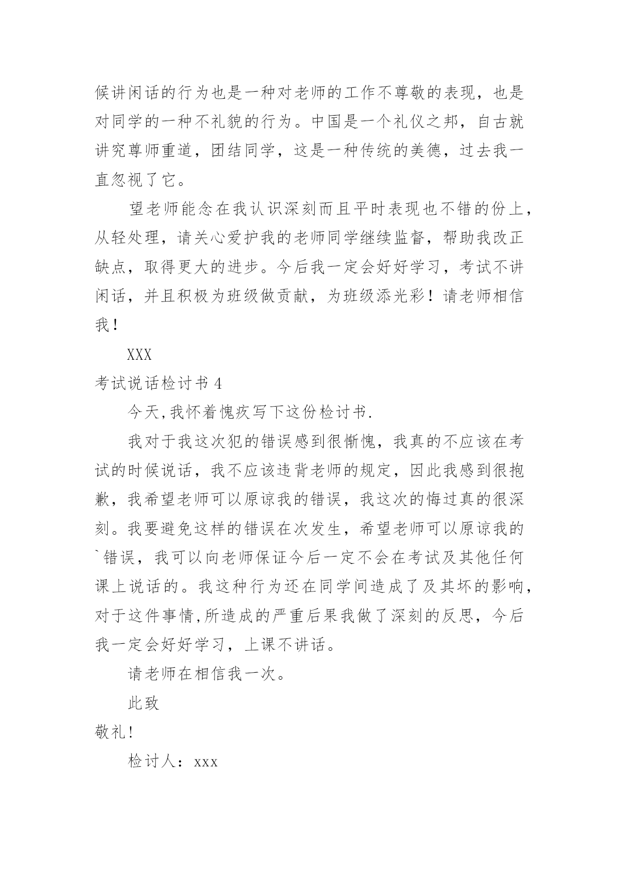 考试说话检讨书考试说话检讨书在某件事出现差错以后,为了避免再次出现相同情况,我们要通过写检讨书来进行自我反省,请注意写检讨书的心态要端正。来参考自己需要的检讨书吧!下面是小编为大家整理的考试说话检讨书,欢迎大家借鉴与参考,希望对大家有所帮助。考试说话检讨书1敬爱的老师:您好!对不起!作为一名学生,我深知好好学习、遵守校纪校规是我们每个学生应该做的,也是中华民族的优良传统美德,可是我作为当代的学生却没有好好的把它传承下来。我在无知中违犯了纪律,不明白自己的学习目的。错误的性质是严重的。我在考试的时候和别的同学说话,并且打扰到其他的同学,其结果损害了多方利益。这种行为,即使是并没有给别人带来伤害,仍然是不对的,此举本身就是违背了做学生的原则。我只是顾着自己的玩乐和一时的想法,完全不理会老师的感受,这也是不对的,人是社会的人,大家不应该只是想着自己,我这么做,害的是我自己;我这样做,看似在现在玩的开心,实际上是在害自己。而且,一旦考试的时候我现在不会也是对老师的不尊重。所以,当老师对我进行批评教育的时候,也是为了让我深刻的认识到这点。其二,我考试的时候和别的同学说话也是一种对老师的工作不尊敬的'表现。中国是一个礼仪之邦,自古就讲究尊师重道,这是一种传统的美德,过去我一直忽视了它。其三,父母送我上学,此乃望子成龙之举,而我却上课说话,对于知识无动于衷,所以我同时也是对父母的一种间接性的不孝。这次上课讲话违背了教育管理,影响了老师的工作正常运转,此乃不忠,一罪也。更让老师您为此事殚精竭虑,伤心失望,此乃不仁,二罪也。又有辜负了伟大父母对我殷切希望,浪费在校学习的时间,乃不孝,三罪也……在写此检讨之时,我深感自己的无知。其实,那次说话是完全可以控制的,因为当时说实话,话题的是有关“二战”的军事知识,我们知道与课堂知识无关,但是我们依旧无法控制我们的情绪,我们在旁若无人中、在得意忘形中扰乱了课堂纪律。这次说话的确影响到了其他同学,这点我反思深刻,想了很多,也许会引起的不只是影响同学上课听讲,而且还会让同学对我们产生厌恶之感,所以这次的教训我是有深刻思考的。我接受老师的批评教导,愿意接受处理,对于这件事我还将进一步深入总结,深刻反省。此致敬礼!检讨人:xxx20xx年XX月XX日考试说话检讨书2尊敬的XXX:您好!这次犯错误,自己想了很多东西,反省了很多的事情,自己也很懊悔,很气自己,去触犯学校的铁律,也深刻认识到自己所犯错误的严重性,对自己所犯的错误感到了羞愧。学校一开学就三令五申,一再强调校规校纪,提醒学生不要违反校规,可我却没有把学校和老师的话放在心上,没有重视老师说的话,没有重视学校颁布的重要事项,当成了耳旁风,这些都是不应该的。也是对老师的不尊重。应该把老师说的话紧记在心,把学校颁布的校规校纪紧记在心。事后,我冷静的想了很久,我这次犯的错误不仅给自己带来了麻烦,耽误自己的学习。而且我这种行为给学校也造成了及其坏的影响,破坏了学校的管理制度。在同学们中间也造成了不良的影响。由于我一个人的犯错误,有可能造成别的同学的'效仿,影响班级纪律性,年级纪律性,对学校的纪律也是一种破坏,而且给对自己抱有很大期望的老师,家长也是一种伤害,也是对别的同学的父母的一种不负责任。我也要通过这次事件,提高我的思想认识,强化责任措施。自己还是很想好好学习的,学习对我来是最重要的,对今后的生存,就业都是很重要的。我现在才很小,我还有去拼搏的能力。我还想在拼一次,在去努力一次,希望老师给予我一个做好学生的一个机会,我会好好改过的,认认真真的去学习,那样的生活充实,这样在家也很耽误课程,学校的课程本来就很紧,学起来就很费劲,在今后的学习生活中,我一定会好好学习,各课都努力往上赶。此致敬礼!检讨人:xxx20xx年XX月XX日考试说话检讨书3尊敬的XXX:今天,我怀着愧疚和懊悔给您写下这份检讨书,以向您表示我对考试时讲话这种不良行为的深刻认识以及再也不在考试的时候讲闲话的决心。我对于我这次犯的错误感到很惭愧,我真的不应该在考试的时候说话,我不应该违背老师的规定,我们作为学生就应该完全的听从老师的话,而我这次没有很好的重视到老师讲的话。我感到很抱歉,我希望老师可以原谅我的错误,我这次的悔过真的很深刻。我要避免这样的错误发生,希望老师可以相信我的悔过之心。相信老师看到我的这个态度也可以知道我对这次的事件有很深刻的'悔过态度,我这样如此的重视这次的事件,希望老师可以原谅我的错误,我可以向老师保证今后一定不会在考试及其他任何课上说闲话的。所以,老师把让我写检讨,也是为了让我深刻的认识到这点。其次,我在考试的时候讲闲话的行为也是一种对老师的工作不尊敬的表现,也是对同学的一种不礼貌的行为。中国是一个礼仪之邦,自古就讲究尊师重道,团结同学,这是一种传统的美德,过去我一直忽视了