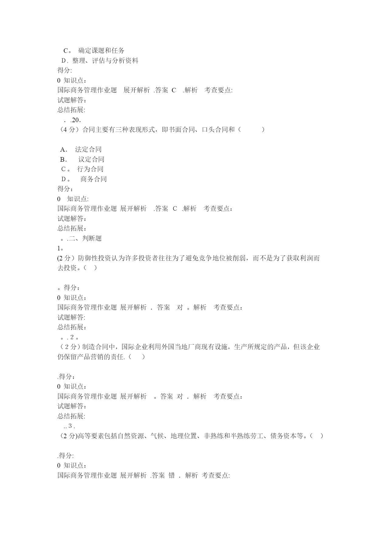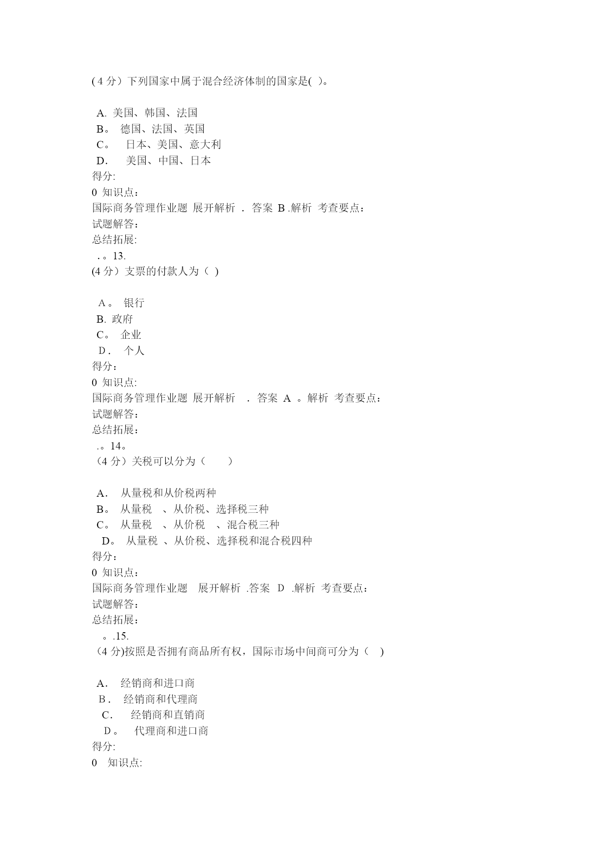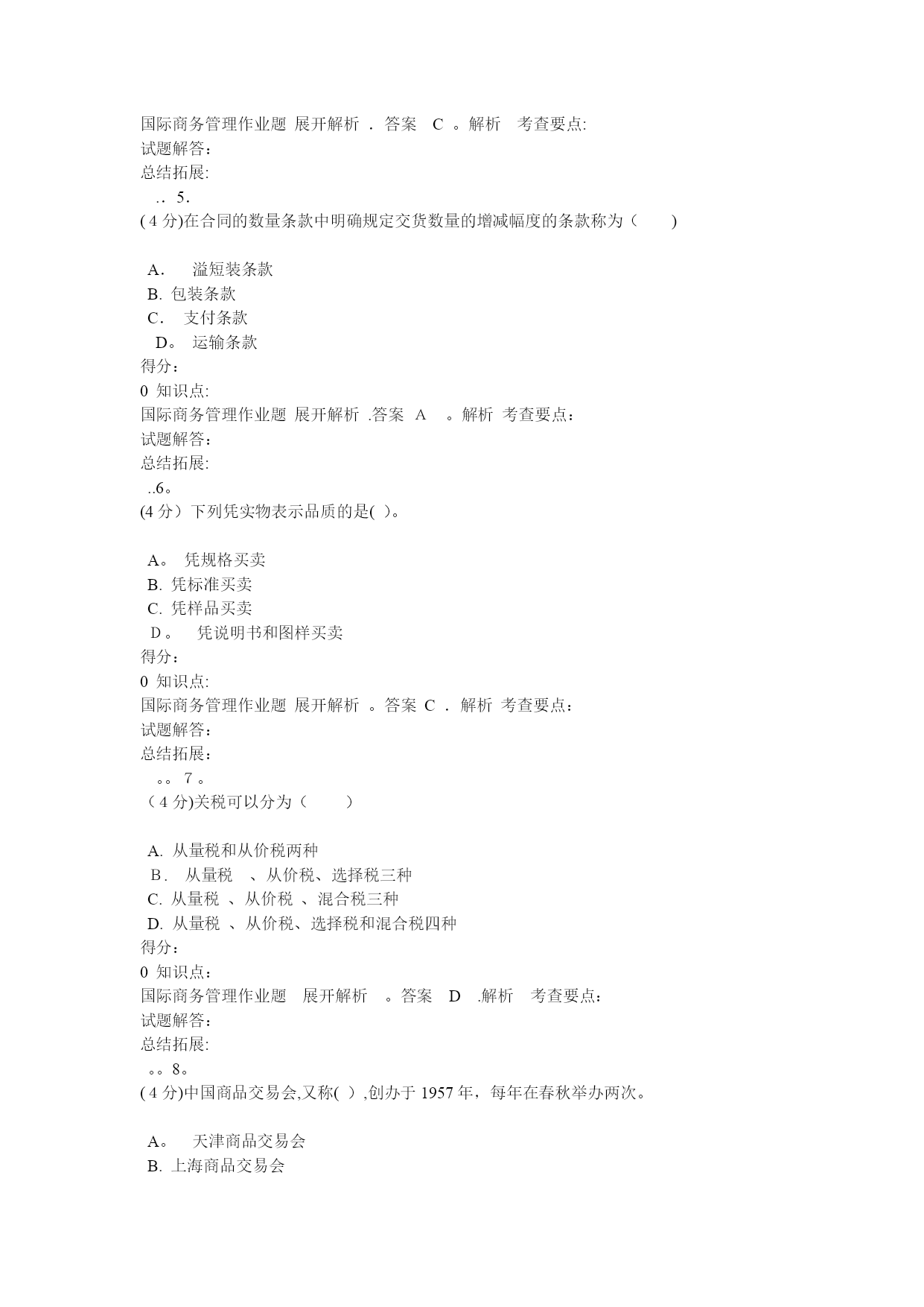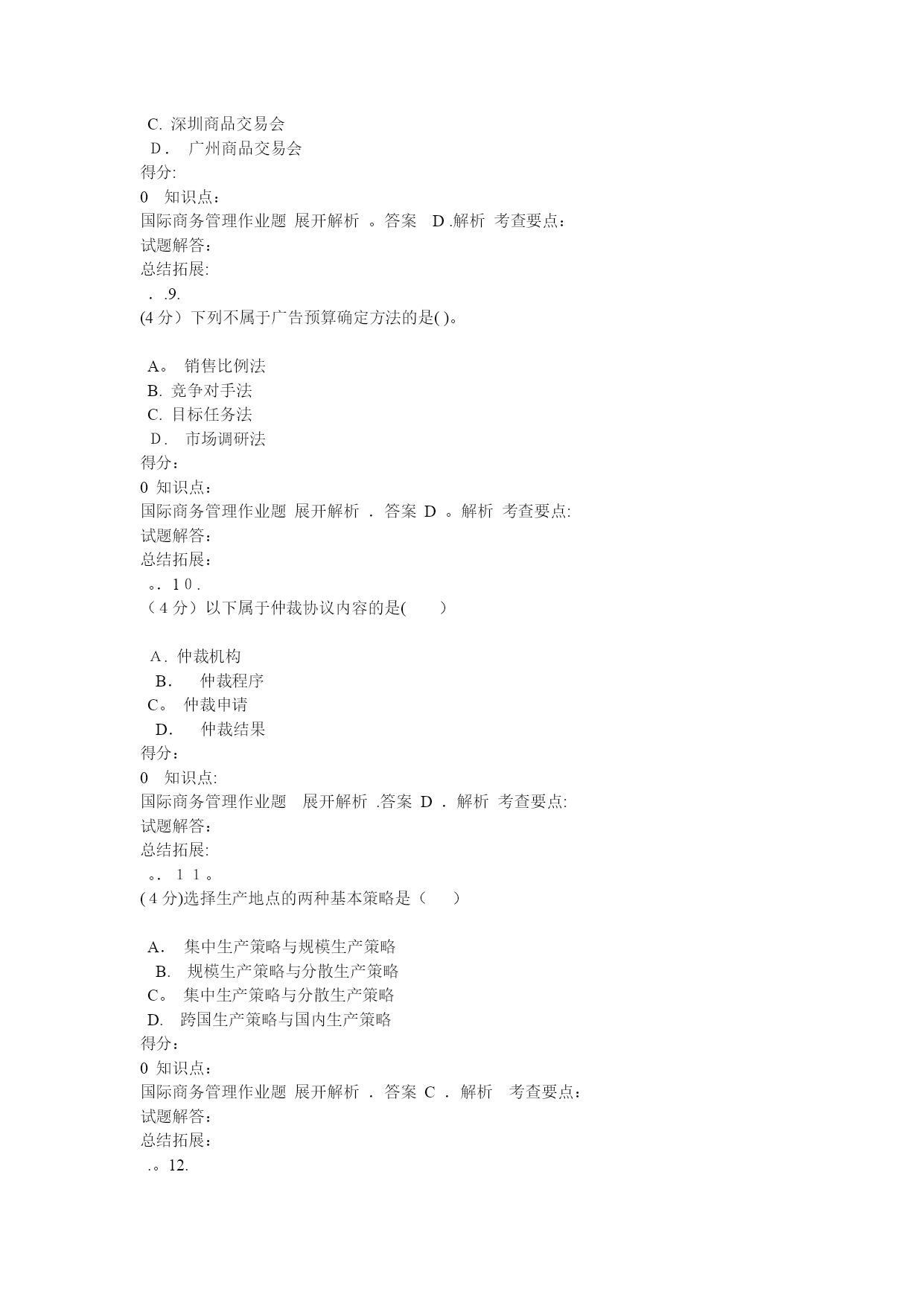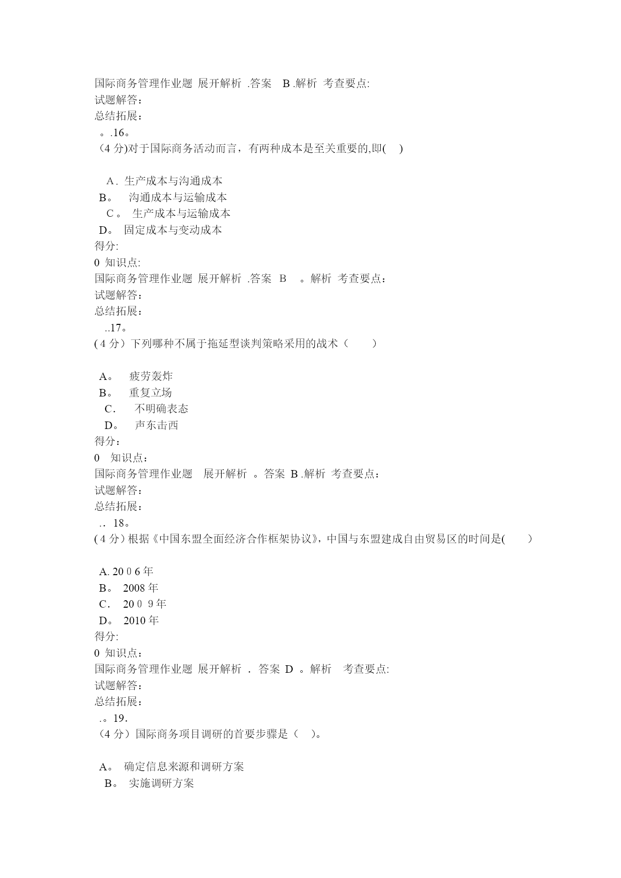 国际商务管理(完整资料)(可以直接使用,可编辑优秀版资料,欢迎下载)格条款中()组成。A.单价和总值B。单位价格和计量单位C.计价货币和总值D。单位价格金额和价格术语得分:0知识点:国际商务管理作业题展开解析.答案A。解析考查要点:试题解答:总结拓展:。.2.(4分)经营地域比较广阔而且地域差异较大的企业,一般而言,应建立()A.职能型组织B。产品型组织C.分散型组织D。地域型组织得分:0知识点:国际商务管理作业题展开解析.答案D.解析考查要点:试题解答:总结拓展:..3.(4分)下列哪一项不属于限制性条款的内容?()A.格式条款B。搭售条款C.限制交易对象D。固定价格得分:0知识点:国际商务管理作业题展开解析.答案A。解析考查要点:试题解答:总结拓展:..4.(4分)国际货币基金组织成立于()。A。1935年B.1940年C.1945年D。1950年得分:0知识点:国际商务管理作业题展开解析.答案C。解析考查要点:试题解答:总结拓展:..5.(4分)在合同的数量条款中明确规定交货数量的增减幅度的条款称为()A.溢短装条款B.包装条款C.支付条款D。运输条款得分:0知识点:国际商务管理作业题展开解析.答案A。解析考查要点:试题解答:总结拓展:..6。(4分)下列凭实物表示品质的是()。A。凭规格买卖B.凭标准买卖C.凭样品买卖D。凭说明书和图样买卖得分:0知识点:国际商务管理作业题展开解析。答案C.解析考查要点:试题解答:总结拓展:。。7。(4分)关税可以分为()A.从量税和从价税两种B.从量税、从价税、选择税三种C.从量税、从价税、混合税三种D.从量税、从价税、选择税和混合税四种得分:0知识点:国际商务管理作业题展开解析。答案D.解析考查要点:试题解答:总结拓展:。。8。(4分)中国商品交易会,又称(),创办于1957年,每年在春秋举办两次。A。天津商品交易会B.上海商品交易会C.深圳商品交易会D.广州商品交易会得分:0知识点:国际商务管理作业题展开解析。答案D.解析考查要点:试题解答:总结拓展:..9.(4分)下列不属于广告预算确定方法的是()。A。销售比例法B.竞争对手法C.目标任务法D.市场调研法得分:0知识点:国际商务管理作业题展开解析.答案D。解析考查要点:试题解答:总结拓展:。.10.(4分)以下属于仲裁协议内容的是()A.仲裁机构B.仲裁程序C。仲裁申请D.仲裁结果得分:0知识点:国际商务管理作业题展开解析.答案D.解析考查要点:试题解答:总结拓展:。.11。(4分)选择生产地点的两种基本策略是()A.集中生产策略与规模生产策略B.规模生产策略与分散生产策略C。集中生产策略与分散生产策略D.跨国生产策略与国内生产策略得分:0知识点:国际商务管理作业题展开解析.答案C.解析考查要点:试题解答:总结拓展:.。12.(4分)下列国家中属于混合经济体制的国家是()。A.美国、韩国、法国B。德国、法国、英国C。日本、美国、意大利D.美国、中国、日本得分:0知识点:国际商务管理作业题展开解析.答案B.解析考查要点:试题解答:总结拓展:.。13.(4分)支票的付款人为()A。银行B.政府C。企业D.个人得分:0知识点:国际商务管理作业题展开解析.答案A。解析考查要点:试题解答:总结拓展:.。14。(4分)关税可以分为()A.从量税和从价税两种B。从量税、从价税、选择税三种C。从量税、从价税、混合税三种D。从量税、从价税、选择税和混合税四种得分:0知识点:国际商务管理作业题展开解析.答案D.解析考查要点:试题解答:总结拓展:。.15.(4分)按照是否拥有商品所有权,国际市场中间商可分为()A.经销商和进口商B.经销商和代理商C.经销商和直销商D。代理商和进口商得分:0知识点:国际商务管理作业题展开解析.答案B.解析考查要点:试题解答:总结拓展:。.16。(4分)对于国际商务活动而言,有两种成本是至关重要的,即()A.生产成本与沟通成本B。沟通成本与运输成本C。生产成本与运输成本D。固定成本与变动成本得分:0知识点:国际商务管理作业题展开解析.答案B。解析考查要点:试题解答:总结拓展:..17。(4分)下列哪种不属于拖延型谈判策略采用的战术()A。疲劳轰炸B。重复立场C.不明确表态D。声东击西得分:0知识点:国际商务管理作业题展开解