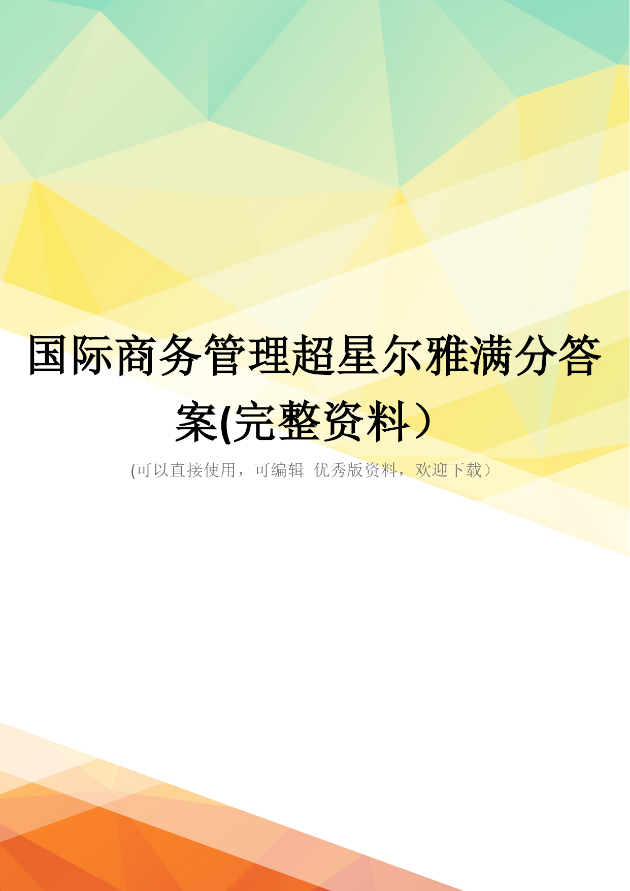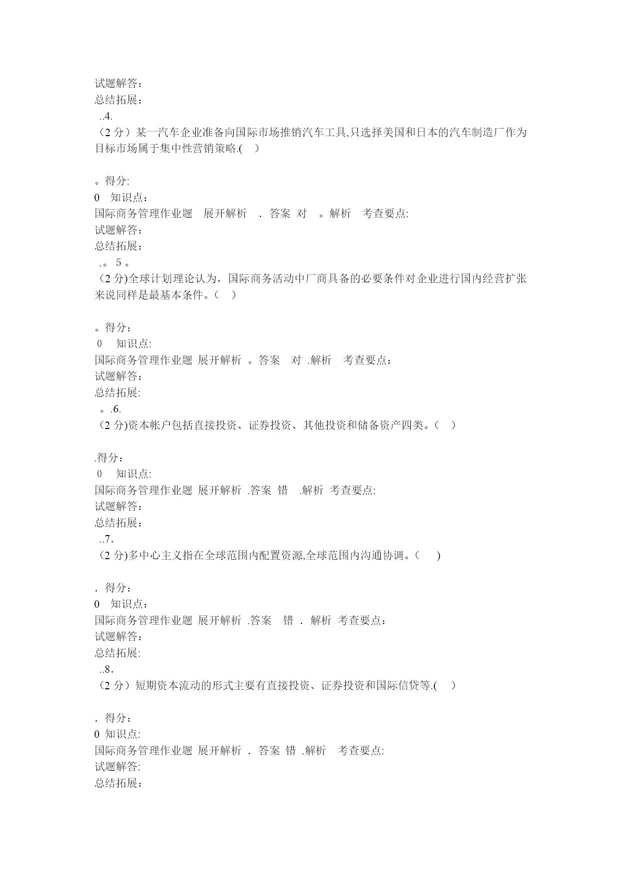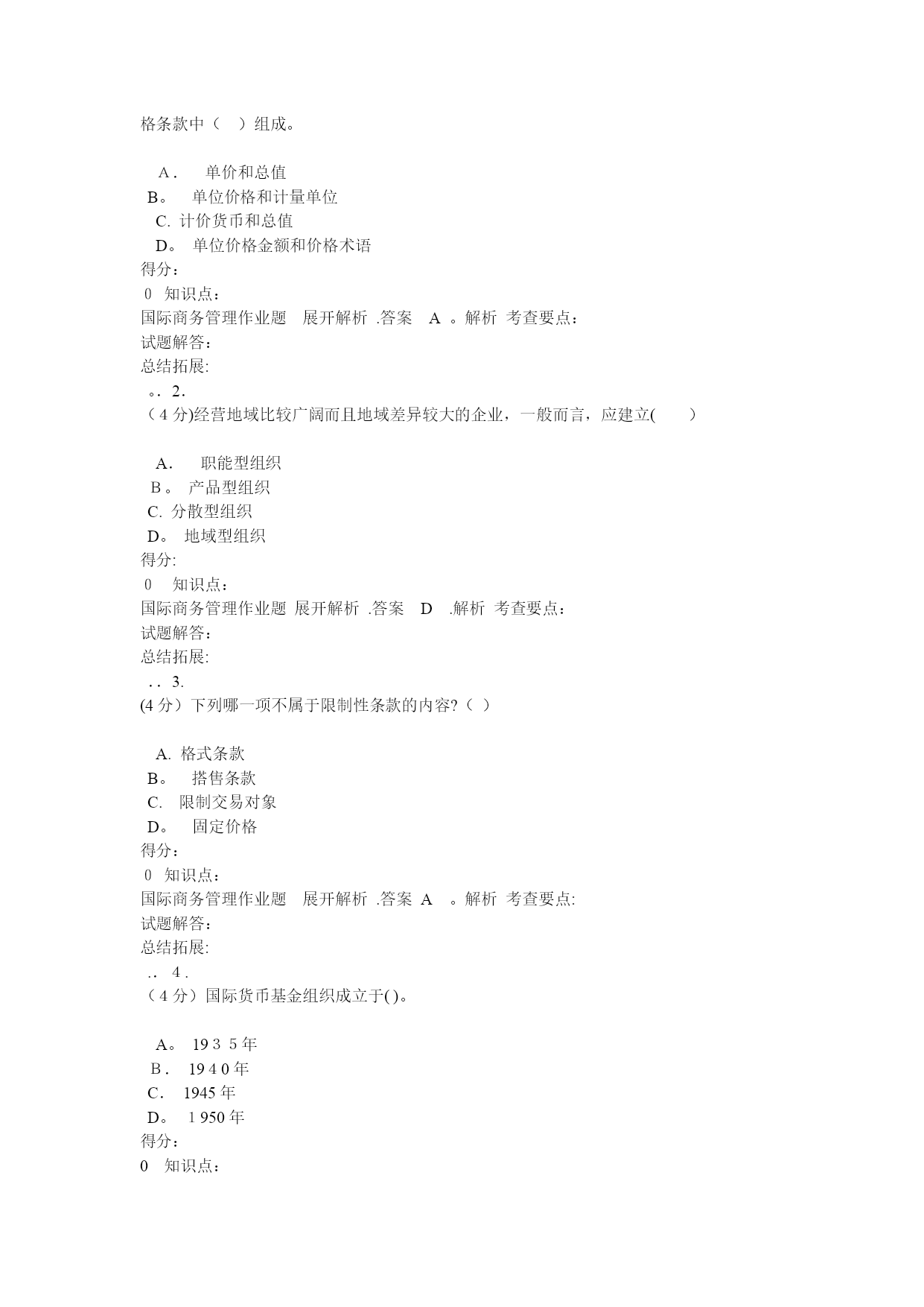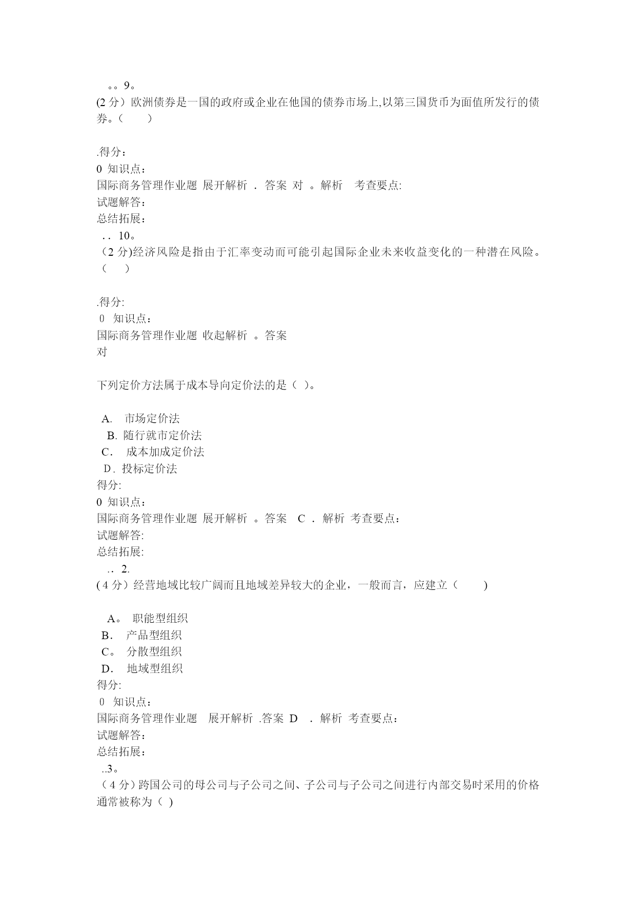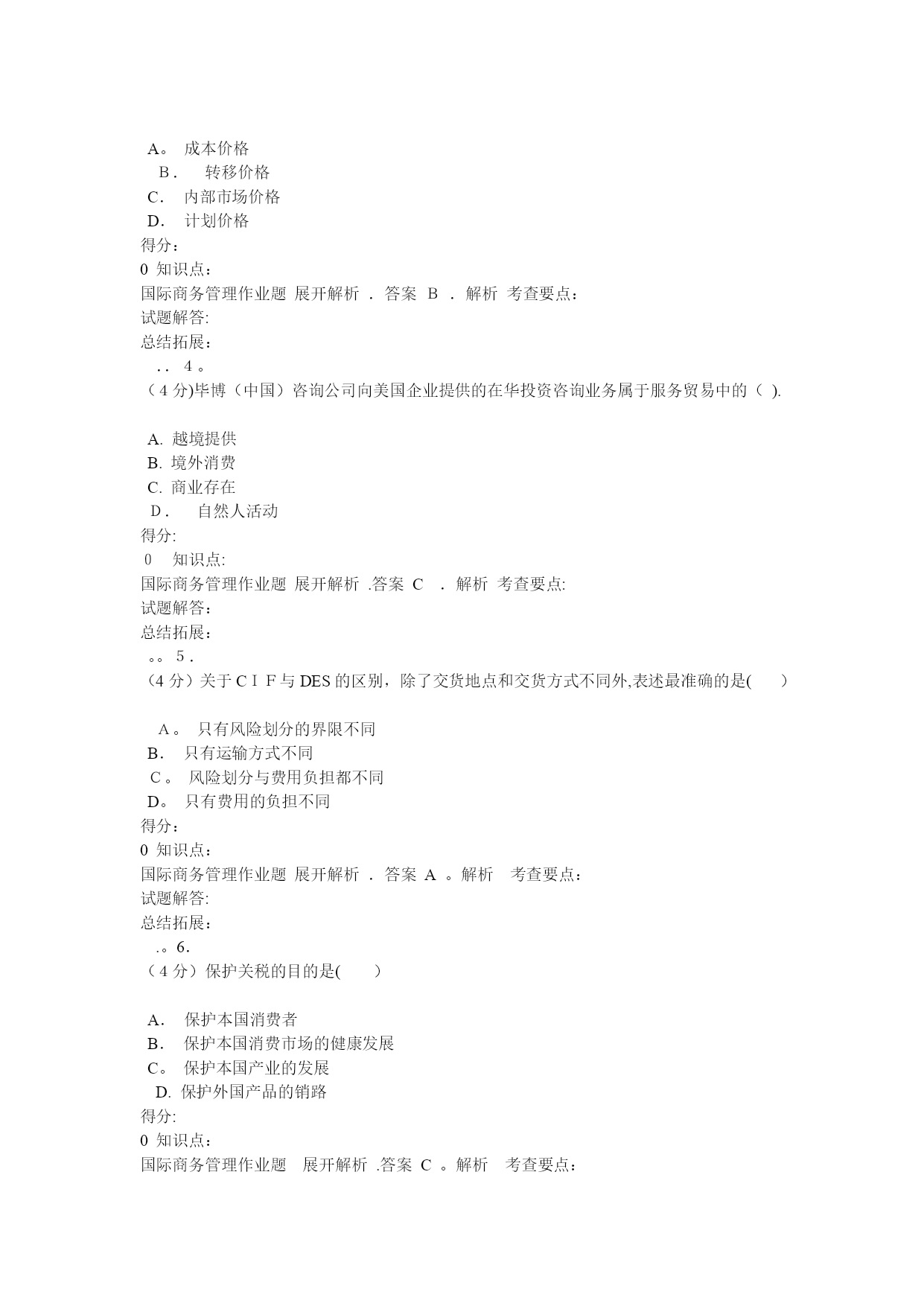 国际商务管理(完整资料)(可以直接使用,可编辑优秀版资料,欢迎下载)格条款中()组成。A.单价和总值B。单位价格和计量单位C.计价货币和总值D。单位价格金额和价格术语得分:0知识点:国际商务管理作业题展开解析.答案A。解析考查要点:试题解答:总结拓展:。.2.(4分)经营地域比较广阔而且地域差异较大的企业,一般而言,应建立()A.职能型组织B。产品型组织C.分散型组织D。地域型组织得分:0知识点:国际商务管理作业题展开解析.答案D.解析考查要点:试题解答:总结拓展:..3.(4分)下列哪一项不属于限制性条款的内容?()A.格式条款B。搭售条款C.限制交易对象D。固定价格得分:0知识点:国际商务管理作业题展开解析.答案A。解析考查要点:试题解答:总结拓展:..4.(4分)国际货币基金组织成立于()。A。1935年B.1940年C.1945年D。1950年得分:0知识点:国际商务管理作业题展开解析.答案C。解析考查要点:试题解答:总结拓展:..5.(4分)在合同的数量条款中明确规定交货数量的增减幅度的条款称为()A.溢短装条款B.包装条款C.支付条款D。运输条款得分:0知识点:国际商务管理作业题展开解析.答案A。解析考查要点:试题解答:总结拓展:..6。(4分)下列凭实物表示品质的是()。A。凭规格买卖B.凭标准买卖C.凭样品买卖D。凭说明书和图样买卖得分:0知识点:国际商务管理作业题展开解析。答案C.解析考查要点:试题解答:总结拓展:。。7。(4分)关税可以分为()A.从量税和从价税两种B.从量税、从价税、选择税三种C.从量税、从价税、混合税三种D.从量税、从价税、选择税和混合税四种得分:0知识点:国际商务管理作业题展开解析。答案D.解析考查要点:试题解答:总结拓展:。。8。(4分)中国商品交易会,又称(),创办于1957年,每年在春秋举办两次。A。天津商品交易会B.上海商品交易会C.深圳商品交易会D.广州商品交易会得分:0知识点:国际商务管理作业题展开解析。答案D.解析考查要点:试题解答:总结拓展:..9.(4分)下列不属于广告预算确定方法的是()。A。销售比例法B.竞争对手法C.目标任务法D.市场调研法得分:0知识点:国际商务管理作业题展开解析.答案D。解析考查要点:试题解答:总结拓展:。.10.(4分)以下属于仲裁协议内容的是()A.仲裁机构B.仲裁程序C。仲裁申请D.仲裁结果得分:0知识点:国际商务管理作业题展开解析.答案D.解析考查要点:试题解答:总结拓展:。.11。(4分)选择生产地点的两种基本策略是()A.集中生产策略与规模生产策略B.规模生产策略与分散生产策略C。集中生产策略与分散生产策略D.跨国生产策略与国内生产策略得分:0知识点:国际商务管理作业题展开解析.答案C.解析考查要点:试题解答:总结拓展:.。12.(4分)下列国家中属于混合经济体制的国家是()。A.美国、韩国、法国B。德国、法国、英国C。日本、美国、意大利D.美国、中国、日本得分:0知识点:国际商务管理作业题展开解析.答案B.解析考查要点:试题解答:总结拓展:.。13.(4分)支票的付款人为()A。银行B.政府C。企业D.个人得分:0知识点:国际商务管理作业题展开解析.答案A。解析考查要点:试题解答:总结拓展:.。14。(4分)关税可以分为()A.从量税和从价税两种B。从量税、从价税、选择税三种C。从量税、从价税、混合税三种D。从量税、从价税、选择税和混合税四种得分:0知识点:国际商务管理作业题展开解析.答案D.解析考查要点:试题解答:总结拓展:。.15.(4分)按照是否拥有商品所有权,国际市场中间商可分为()A.经销商和进口商B.经销商和代理商C.经销商和直销商D。代理商和进口商得分:0知识点:国际商务管理作业题展开解析.答案B.解析考查要点:试题解答:总结拓展:。.16。(4分)对于国际商务活动而言,有两种成本是至关重要的,即()A.生产成本与沟通成本B。沟通成本与运输成本C。生产成本与运输成本D。固定成本与变动成本得分:0知识点:国际商务管理作业题展开解析.答案B。解析考查要点:试题解答:总结拓展:..17。(4分)下列哪种不属于拖延型谈判策略采用的战术()A。疲劳轰炸B。重复立场C.不明确表态D。声东击西得分:0知识点:国际商务管理作业题展开解