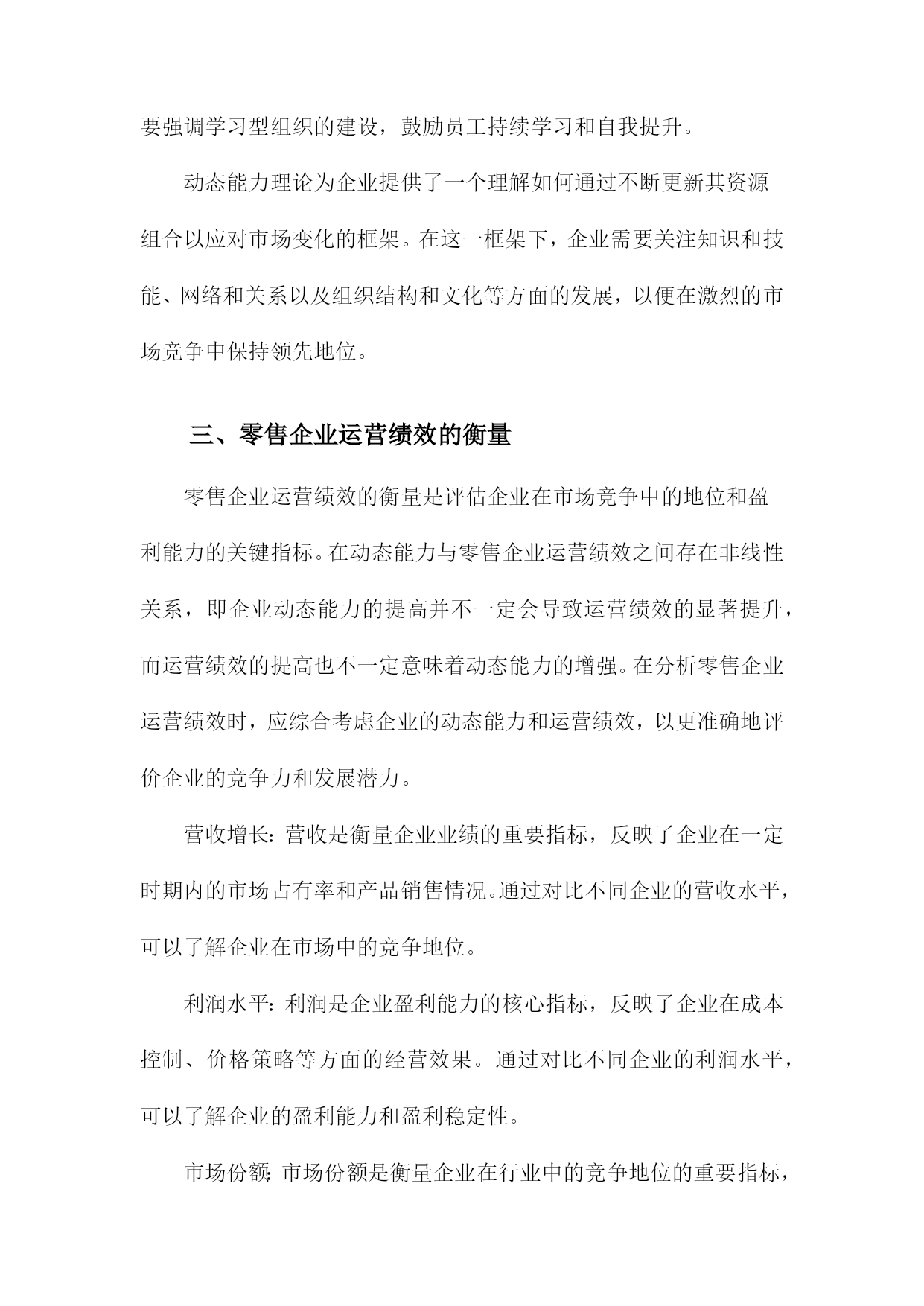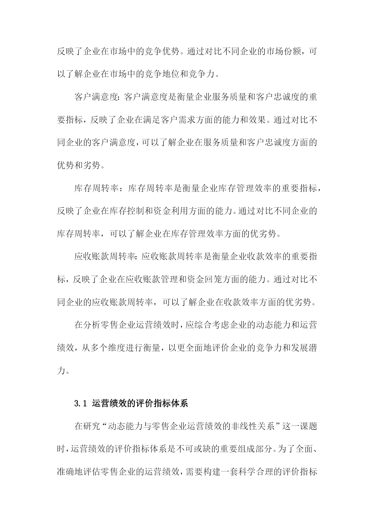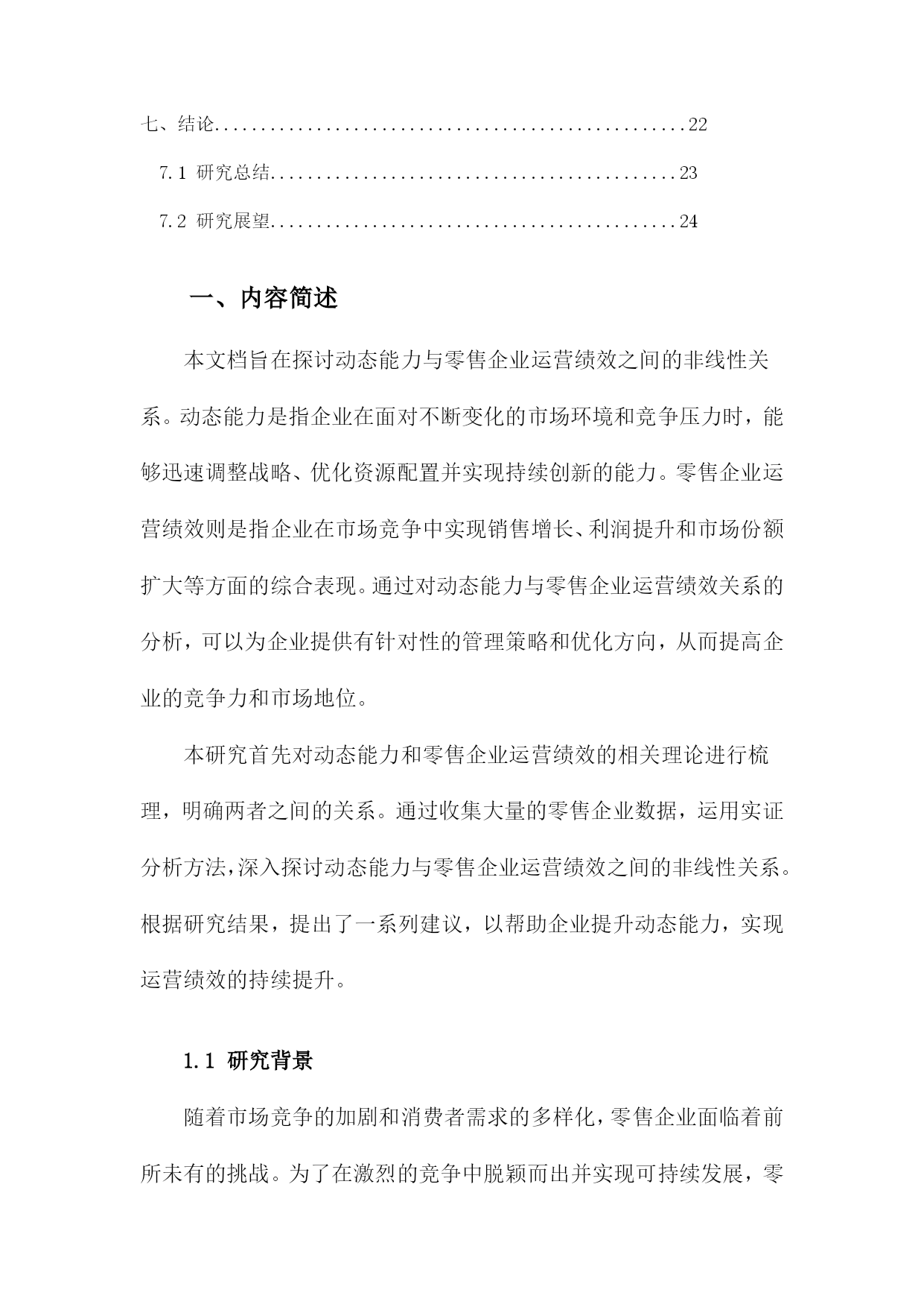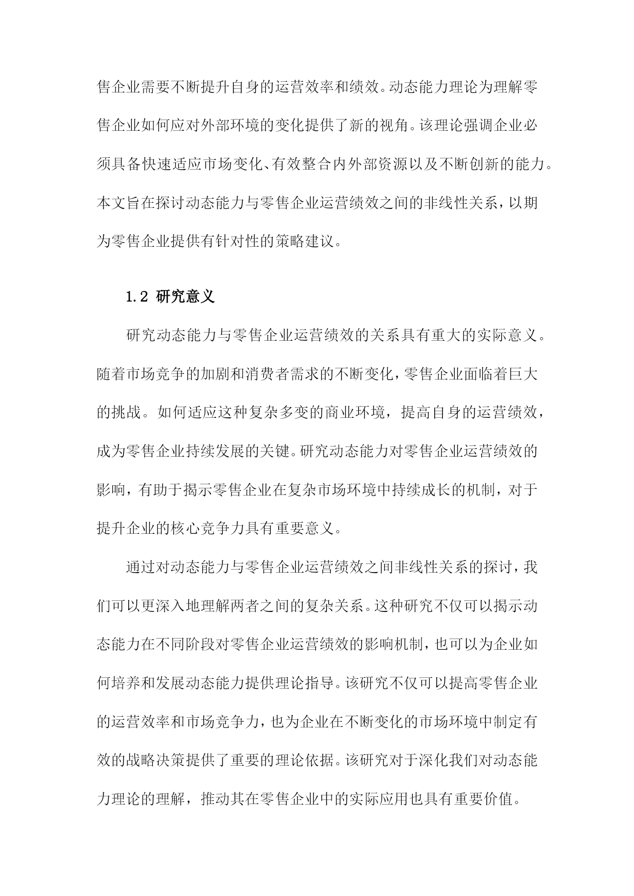 动态能力与零售企业运营绩效的非线性关系目录一、内容简述................................................21.1研究背景.............................................21.2研究意义.............................................3二、动态能力的理论基础......................................42.1动态能力的定义.......................................42.2动态能力的构成要素...................................52.3动态能力的理论框架...................................7三、零售企业运营绩效的衡量..................................83.1运营绩效的评价指标体系..............................103.2运营绩效的影响因素分析..............................11四、动态能力对零售企业运营绩效的影响机制...................124.1动态能力与运营绩效的非线性关系......................144.2非线性关系的实证研究................................15五、案例分析...............................................165.1案例选择............................................175.2案例分析与动态能力的关系............................18六、政策建议...............................................196.1培养动态能力........................................206.2提升运营绩效........................................21七、结论...................................................227.1研究总结............................................237.2研究展望............................................24一、内容简述本文档旨在探讨动态能力与零售企业运营绩效之间的非线性关系。动态能力是指企业在面对不断变化的市场环境和竞争压力时,能够迅速调整战略、优化资源配置并实现持续创新的能力。零售企业运营绩效则是指企业在市场竞争中实现销售增长、利润提升和市场份额扩大等方面的综合表现。通过对动态能力与零售企业运营绩效关系的分析,可以为企业提供有针对性的管理策略和优化方向,从而提高企业的竞争力和市场地位。本研究首先对动态能力和零售企业运营绩效的相关理论进行梳理,明确两者之间的关系。通过收集大量的零售企业数据,运用实证分析方法,深入探讨动态能力与零售企业运营绩效之间的非线性关系。根据研究结果,提出了一系列建议,以帮助企业提升动态能力,实现运营绩效的持续提升。1.1研究背景随着市场竞争的加剧和消费者需求的多样化,零售企业面临着前所未有的挑战。为了在激烈的竞争中脱颖而出并实现可持续发展,零售企业需要不断提升自身的运营效率和绩效。动态能力理论为理解零售企业如何应对外部环境的变化提供了新的视角。该理论强调企业必须具备快速适应市场变化、有效整合内外部资源以及不断创新的能力。本文旨在探讨动态能力与零售企业运营绩效之间的非线性关系,以期为零售企业提供有针对性的策略建议。1.2研究意义研究动态能力与零售企业运营绩效的关系具有重大的实际意义。随着市场竞争的加剧和消费者需求的不断变化,零售企业面临着巨大的挑战。如何适应这种复杂多变的商业环境,提高自身的运营绩效,成为零售企业持续发展的关键。研究动态能力对零售企业运营绩效的影响,有助于揭示零售企业在复杂市场环境中持续成长的机制,对于提升企业的核心竞争力具有重要意义。通过对动态能力与零售企业运营绩效之间非线性关系的探讨,我们可以更深入地理解两者之间的复杂关系。这种研究不仅可以揭示动态能力在不同阶段对零售企业运营绩效的影响机制,也可以为企业如何培养和发展动态能力提供理论指导。该研究不仅可以提高零售企业的运营效率和市场竞争力,也为企业在不断变化的市场环境中制定有效的战