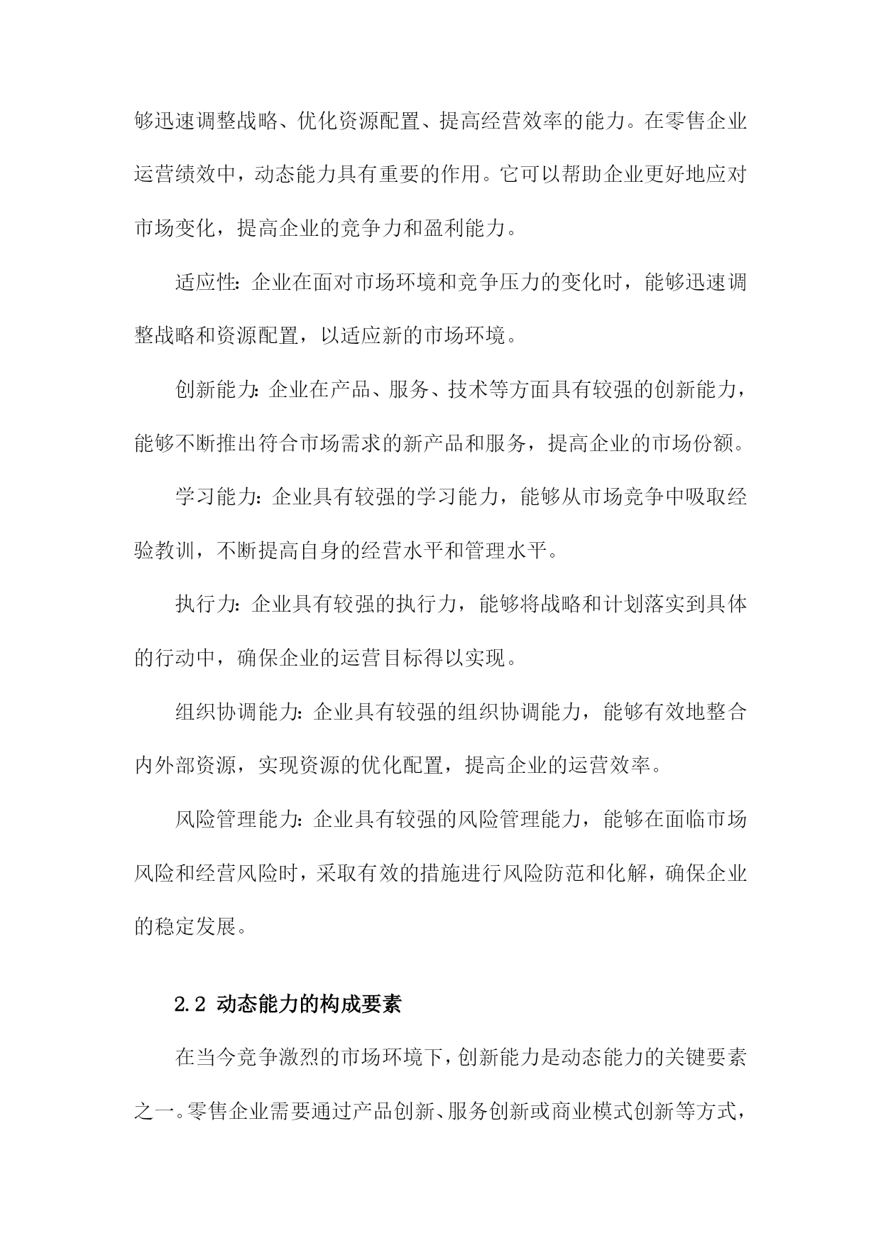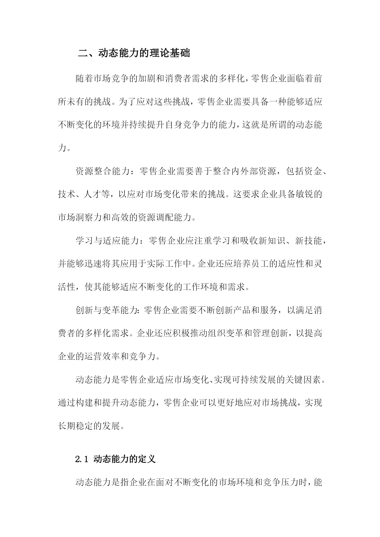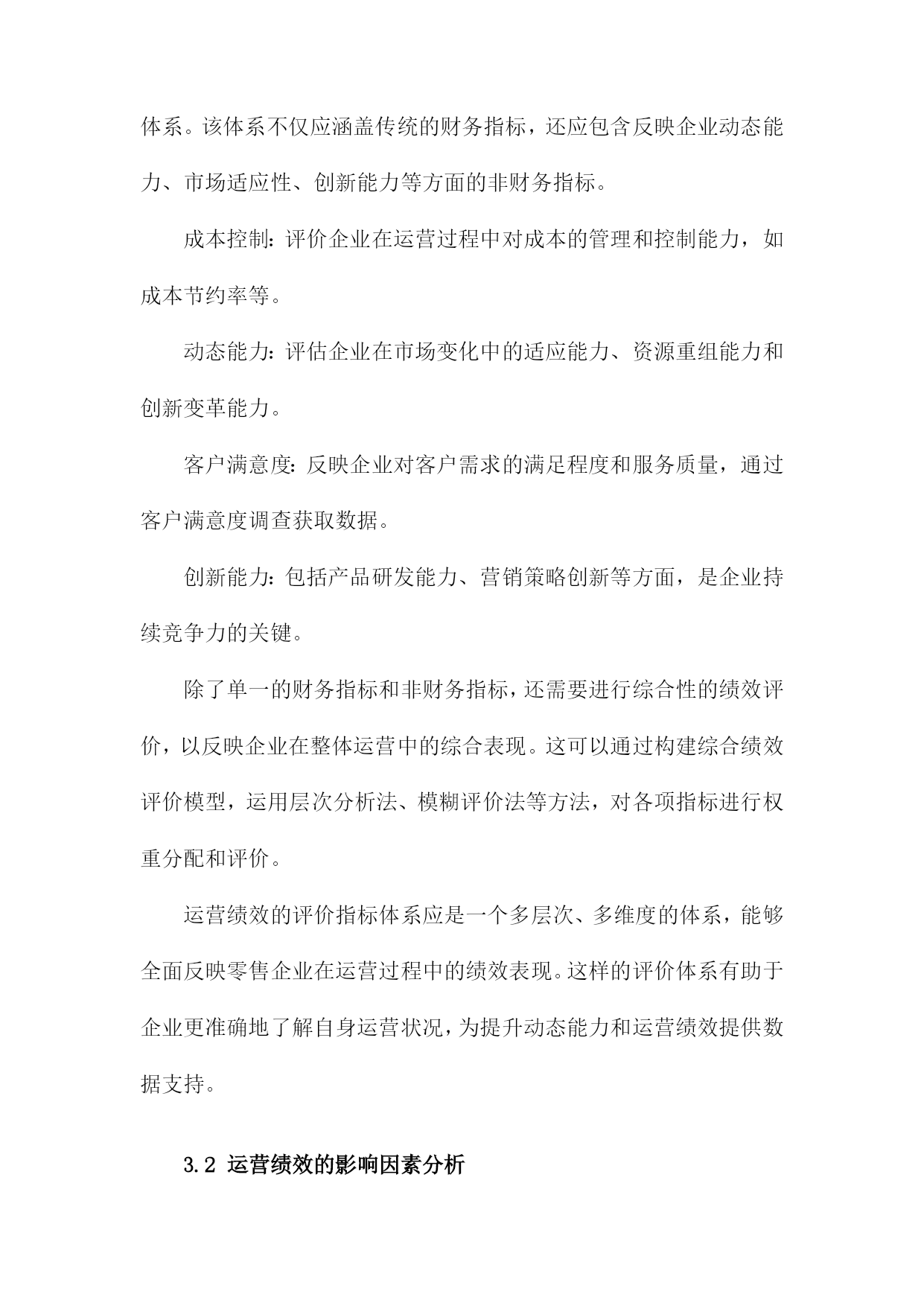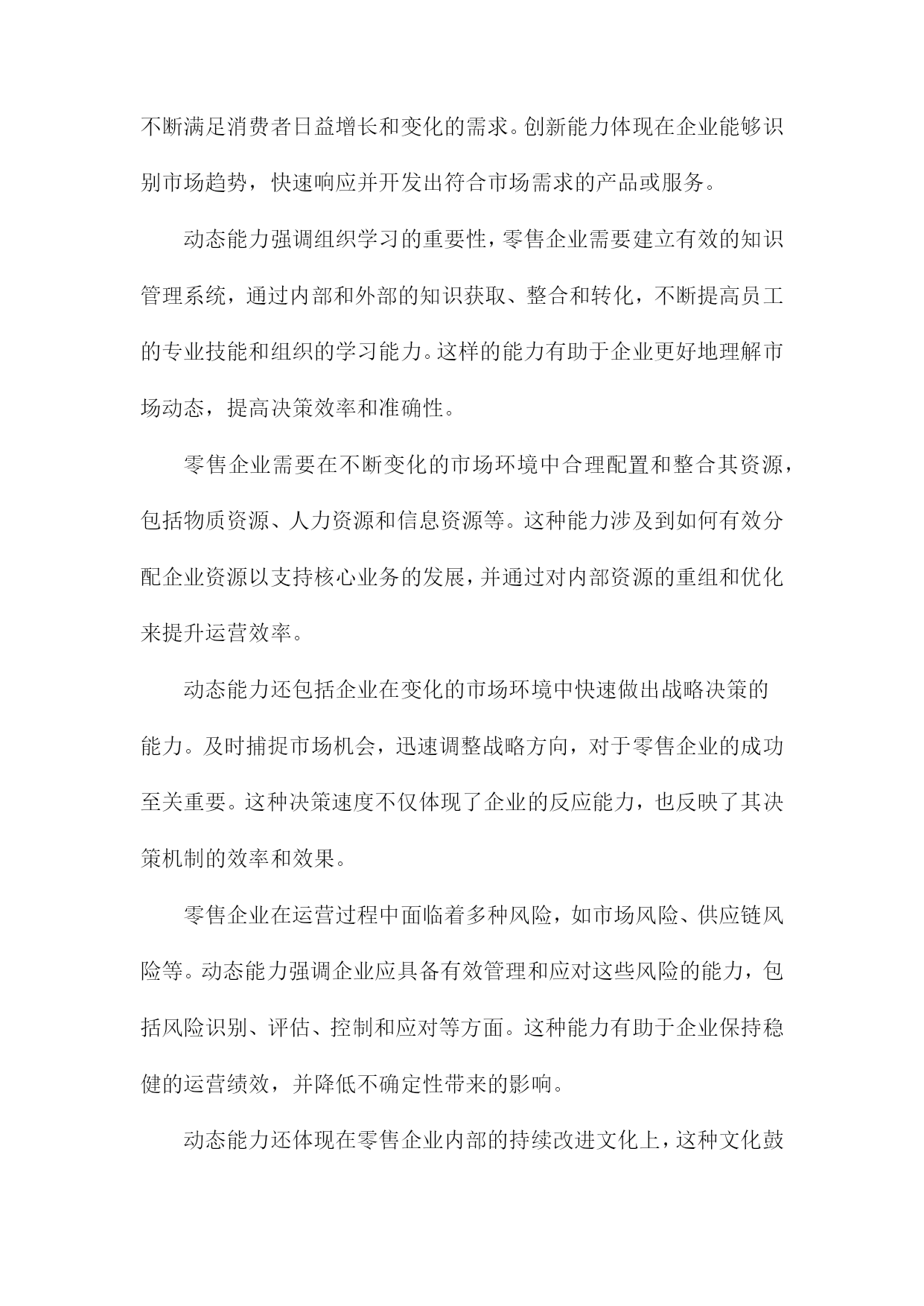动态能力与零售企业运营绩效的非线性关系目录一、内容简述................................................21.1研究背景.............................................21.2研究意义.............................................3二、动态能力的理论基础......................................42.1动态能力的定义.......................................42.2动态能力的构成要素...................................52.3动态能力的理论框架...................................7三、零售企业运营绩效的衡量..................................83.1运营绩效的评价指标体系..............................103.2运营绩效的影响因素分析..............................11四、动态能力对零售企业运营绩效的影响机制...................124.1动态能力与运营绩效的非线性关系......................144.2非线性关系的实证研究................................15五、案例分析...............................................165.1案例选择............................................175.2案例分析与动态能力的关系............................18六、政策建议...............................................196.1培养动态能力........................................206.2提升运营绩效........................................21七、结论...................................................227.1研究总结............................................237.2研究展望............................................24一、内容简述本文档旨在探讨动态能力与零售企业运营绩效之间的非线性关系。动态能力是指企业在面对不断变化的市场环境和竞争压力时,能够迅速调整战略、优化资源配置并实现持续创新的能力。零售企业运营绩效则是指企业在市场竞争中实现销售增长、利润提升和市场份额扩大等方面的综合表现。通过对动态能力与零售企业运营绩效关系的分析,可以为企业提供有针对性的管理策略和优化方向,从而提高企业的竞争力和市场地位。本研究首先对动态能力和零售企业运营绩效的相关理论进行梳理,明确两者之间的关系。通过收集大量的零售企业数据,运用实证分析方法,深入探讨动态能力与零售企业运营绩效之间的非线性关系。根据研究结果,提出了一系列建议,以帮助企业提升动态能力,实现运营绩效的持续提升。1.1研究背景随着市场竞争的加剧和消费者需求的多样化,零售企业面临着前所未有的挑战。为了在激烈的竞争中脱颖而出并实现可持续发展,零售企业需要不断提升自身的运营效率和绩效。动态能力理论为理解零售企业如何应对外部环境的变化提供了新的视角。该理论强调企业必须具备快速适应市场变化、有效整合内外部资源以及不断创新的能力。本文旨在探讨动态能力与零售企业运营绩效之间的非线性关系,以期为零售企业提供有针对性的策略建议。1.2研究意义研究动态能力与零售企业运营绩效的关系具有重大的实际意义。随着市场竞争的加剧和消费者需求的不断变化,零售企业面临着巨大的挑战。如何适应这种复杂多变的商业环境,提高自身的运营绩效,成为零售企业持续发展的关键。研究动态能力对零售企业运营绩效的影响,有助于揭示零售企业在复杂市场环境中持续成长的机制,对于提升企业的核心竞争力具有重要意义。通过对动态能力与零售企业运营绩效之间非线性关系的探讨,我们可以更深入地理解两者之间的复杂关系。这种研究不仅可以揭示动态能力在不同阶段对零售企业运营绩效的影响机制,也可以为企业如何培养和发展动态能力提供理论指导。该研究不仅可以提高零售企业的运营效率和市场竞争力,也为企业在不断变化的市场环境中制定有效的战