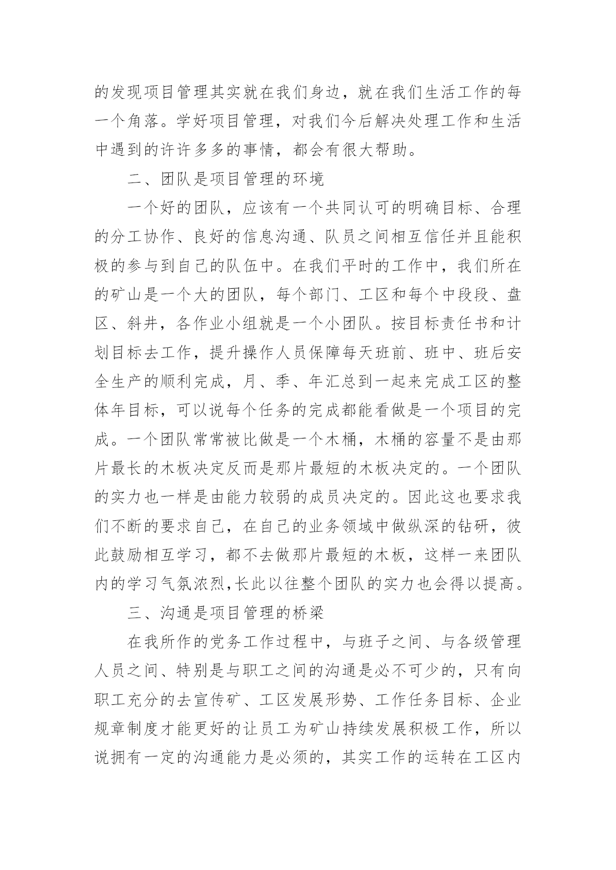 项目管理培训心得我们在一些事情上受到启发后,应该马上记录下来,写一篇心得体会,这么做可以让我们不断思考不断进步。应该怎么写才合适呢?下面是小编整理的项目管理培训心得,欢迎阅读与收藏。在人力资源部的精心组织安排下,我参加了“项目管理培训”,培训是由有着多年的咨询培训经验的高级讲师赵云龙教授主讲,培训内容通俗易懂、丰富多彩,让人能较快的吸收和理解。经过一天的培训,使我学到了很多知识,感觉受益匪浅。通过对项目管理相关课程的培训,使我对项目管理在工作中作用重新有了认识。这对于一个走上管理岗位时间不长,缺少管理理论和实践的我来说,这1天的培训中收获了很多,对我今后的工作有很大的帮助。下面是看看我参加项目管理培训的心得体会:一、项目管理就在我们的身边刚刚开始的时候,觉得项目管理是苦涩难懂的,而且项目这个词也应该离我们的矿山井下开采、提升系统管理相隔甚远。其实就对项目管理的概念:“项目管理是以项目为对象的系统管理方法。通过一个临时性的、专门的柔性组织,对项目进行高效率的计划、组织、指导和控制,以实现项目全过程的动态管理和项目目标的综合协调与优化。”随着培训的深入和赵老师深入浅出的培训内容和互动案例,我渐渐的发现项目管理其实就在我们身边,就在我们生活工作的每一个角落。学好项目管理,对我们今后解决处理工作和生活中遇到的许许多多的事情,都会有很大帮助。二、团队是项目管理的环境一个好的团队,应该有一个共同认可的明确目标、合理的分工协作、良好的信息沟通、队员之间相互信任并且能积极的参与到自己的队伍中。在我们平时的工作中,我们所在的矿山是一个大的团队,每个部门、工区和每个中段段、盘区、斜井,各作业小组就是一个小团队。按目标责任书和计划目标去工作,提升操作人员保障每天班前、班中、班后安全生产的顺利完成,月、季、年汇总到一起来完成工区的整体年目标,可以说每个任务的完成都能看做是一个项目的完成。一个团队常常被比做是一个木桶,木桶的容量不是由那片最长的木板决定反而是那片最短的木板决定的。一个团队的实力也一样是由能力较弱的成员决定的。因此这也要求我们不断的要求自己,在自己的业务领域中做纵深的钻研,彼此鼓励相互学习,都不去做那片最短的木板,这样一来团队内的学习气氛浓烈,长此以往整个团队的实力也会得以提高。三、沟通是项目管理的桥梁在我所作的党务工作过程中,与班子之间、与各级管理人员之间、特别是与职工之间的沟通是必不可少的,只有向职工充分的去宣传矿、工区发展形势、工作任务目标、企业规章制度才能更好的让员工为矿山持续发展积极工作,所以说拥有一定的沟通能力是必须的,其实工作的运转在工区内部与各队组的沟通也是十分关键必要的。我作为工区一名班子成员,更加深知沟通的重要性。每天的工作基本上是与职工在打交道,工区共有170人,沟通无时不在。不同的职工有着不同的思想问题,从职工的工作、生活、个人行为到家庭矛盾等,并不是每一职工都能按照你的思路走,沟通是解决这些问题的基础,是建立和改善人际关系必不可少的条件。在沟通过程中,我们要善用询问的语气不要让听者感觉是在命令,学会倾听;学会自信与诚恳,只有这样才能使我们更好地完成工作。总之,项目管理涉及生活方方面面,积极的思考,优秀的习惯,从容的生活节奏是共同追求的方向。这就是我在这次项目管理培训当中的心得体会,希望在接下来的生活、工作和学习中能更好的运用领会培训所得。