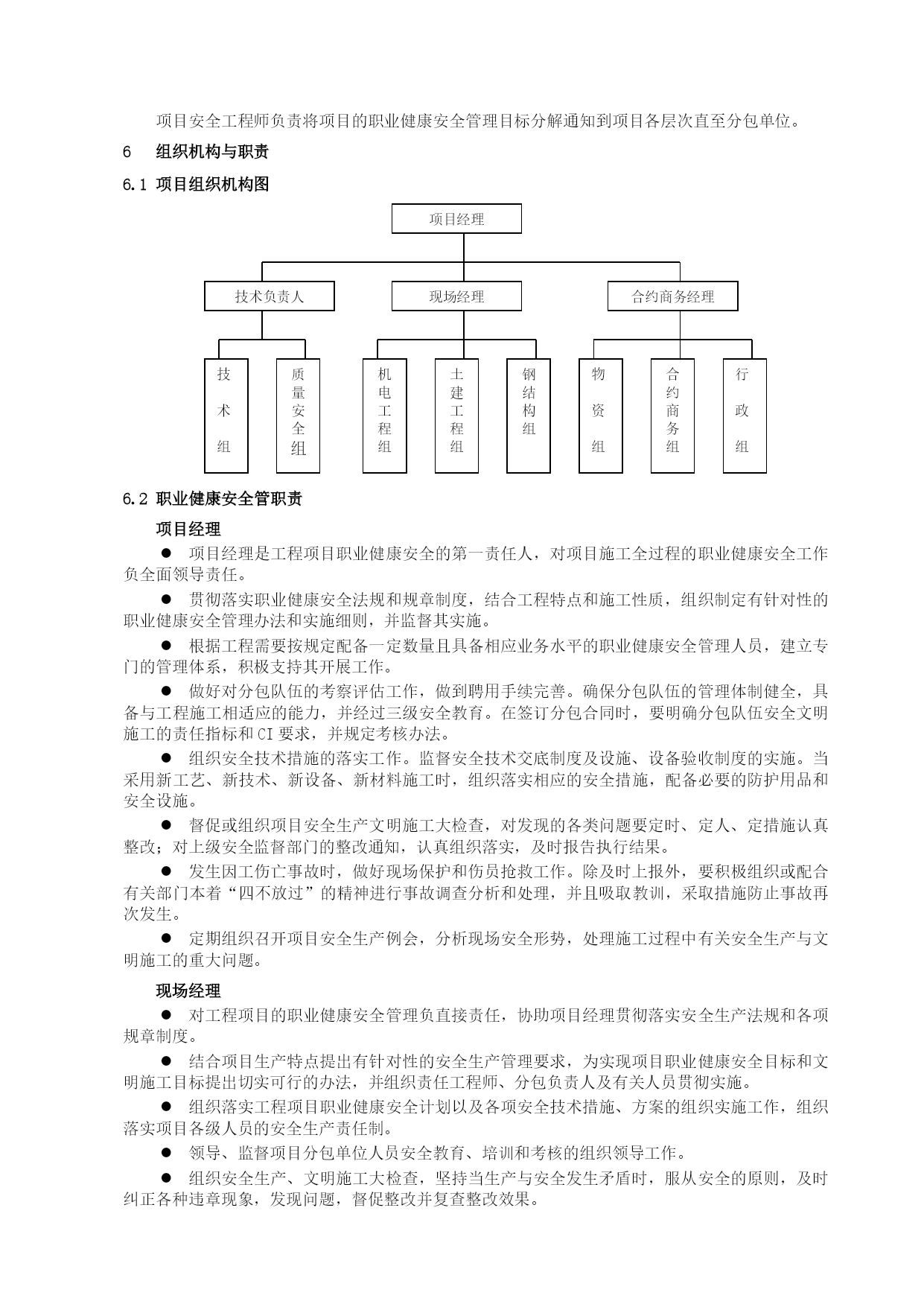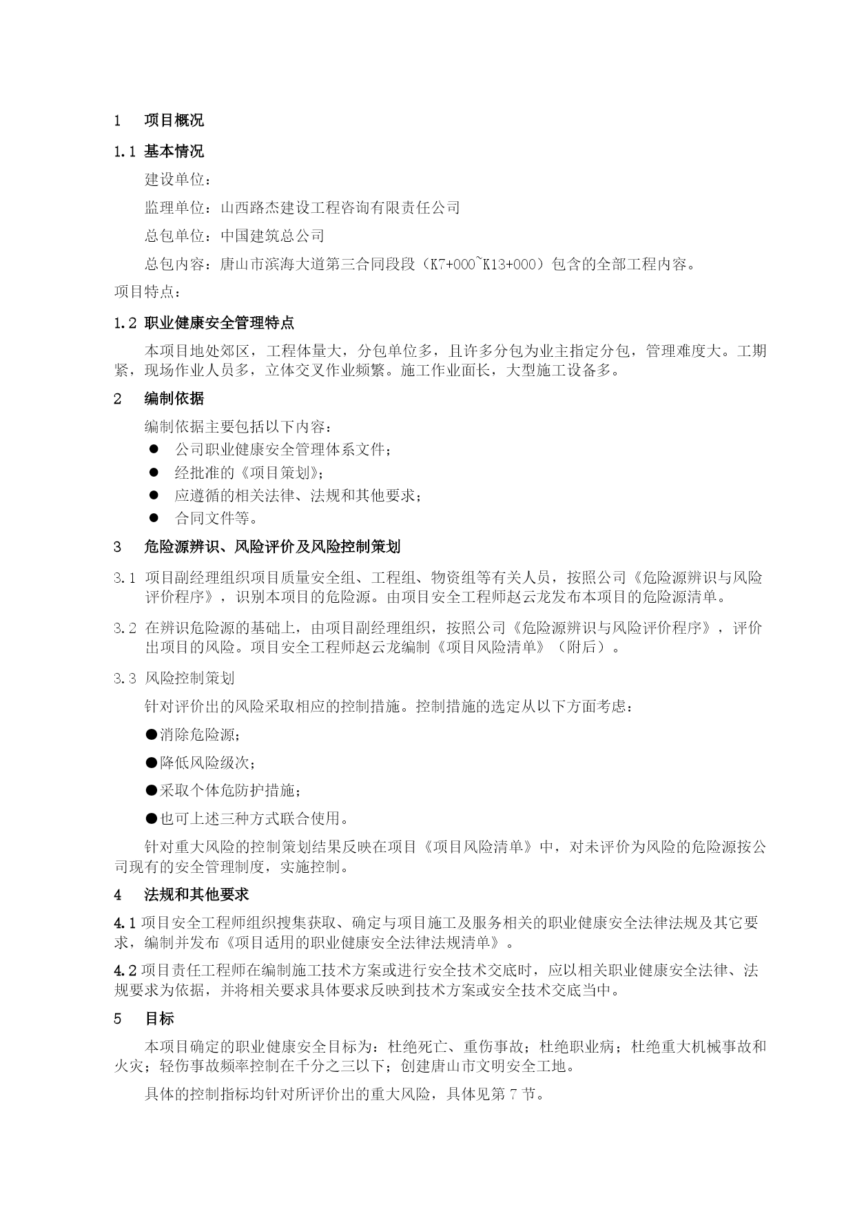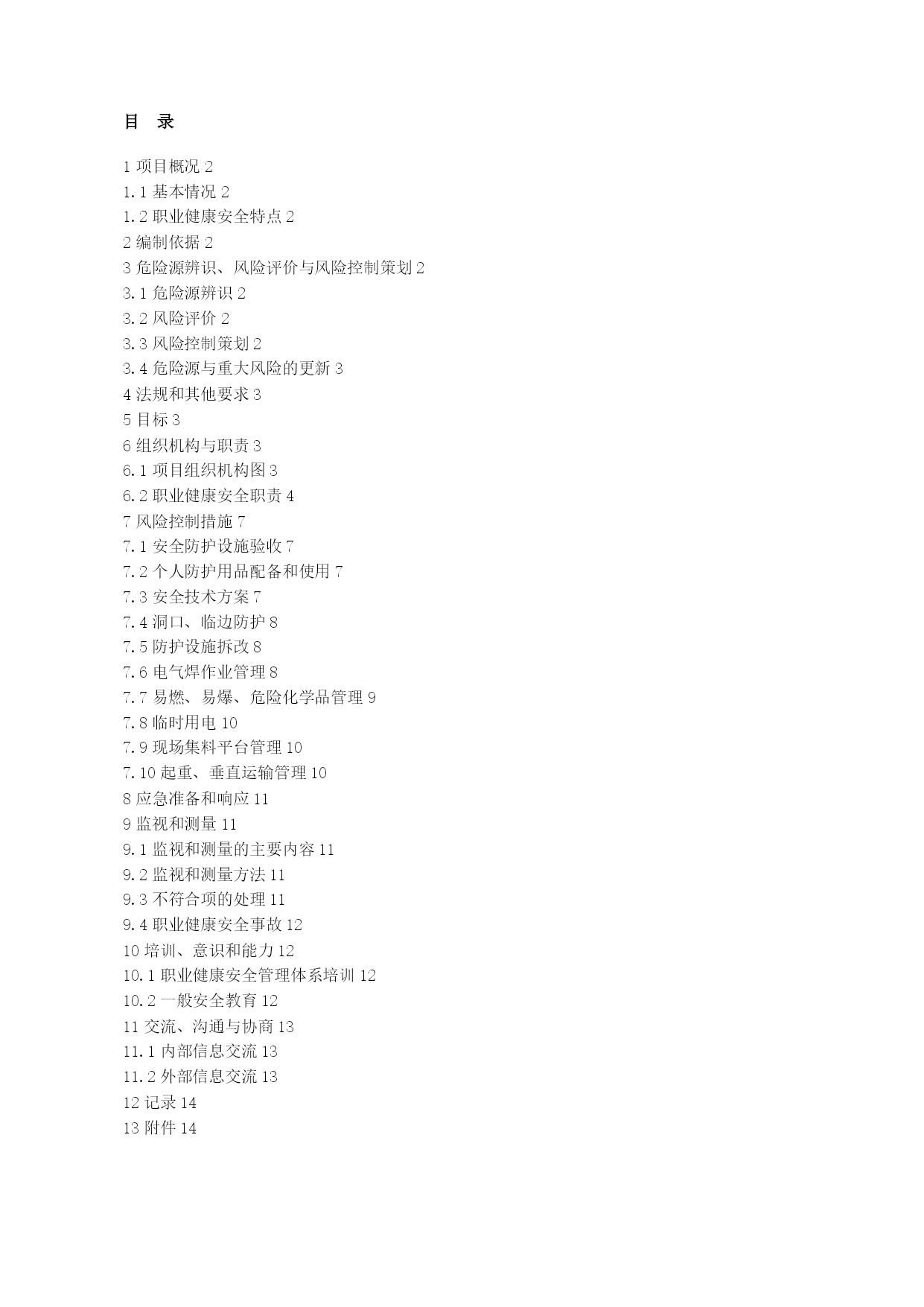 项目职业健康安全计划优质资料(可以直接使用,可编辑优质资料,欢迎下载)目录TOC\o"1-2"\h\zHYPERLINK\l"_Toc90098902"1项目概况PAGEREF_Toc90098902\h2HYPERLINK\l"_Toc90098903"1.1基本情况PAGEREF_Toc90098903\h2HYPERLINK\l"_Toc90098904"1.2职业健康安全特点PAGEREF_Toc90098904\h2HYPERLINK\l"_Toc90098905"2编制依据PAGEREF_Toc90098905\h2HYPERLINK\l"_Toc90098906"3危险源辨识、风险评价与风险控制策划PAGEREF_Toc90098906\h2HYPERLINK\l"_Toc90098907"3.1危险源辨识PAGEREF_Toc90098907\h2HYPERLINK\l"_Toc90098908"3.2风险评价PAGEREF_Toc90098908\h2HYPERLINK\l"_Toc90098909"3.3风险控制策划PAGEREF_Toc90098909\h2HYPERLINK\l"_Toc90098910"3.4危险源与重大风险的更新PAGEREF_Toc90098910\h3HYPERLINK\l"_Toc90098911"4法规和其他要求PAGEREF_Toc90098911\h3HYPERLINK\l"_Toc90098912"5目标PAGEREF_Toc90098912\h3HYPERLINK\l"_Toc90098913"6组织机构与职责PAGEREF_Toc90098913\h3HYPERLINK\l"_Toc90098914"6.1项目组织机构图PAGEREF_Toc90098914\h3HYPERLINK\l"_Toc90098915"6.2职业健康安全职责PAGEREF_Toc90098915\h4HYPERLINK\l"_Toc90098916"7风险控制措施PAGEREF_Toc90098916\h7HYPERLINK\l"_Toc90098917"7.1安全防护设施验收PAGEREF_Toc90098917\h7HYPERLINK\l"_Toc90098918"7.2个人防护用品配备和使用PAGEREF_Toc90098918\h7HYPERLINK\l"_Toc90098919"7.3安全技术方案PAGEREF_Toc90098919\h7HYPERLINK\l"_Toc90098920"7.4洞口、临边防护PAGEREF_Toc90098920\h8HYPERLINK\l"_Toc90098921"7.5防护设施拆改PAGEREF_Toc90098921\h8HYPERLINK\l"_Toc90098922"7.6电气焊作业管理PAGEREF_Toc90098922\h8HYPERLINK\l"_Toc90098923"7.7易燃、易爆、危险化学品管理PAGEREF_Toc90098923\h9HYPERLINK\l"_Toc90098924"7.8临时用电PAGEREF_Toc90098924\h10HYPERLINK\l"_Toc90098925"7.9现场集料平台管理PAGEREF_Toc90098925\h10HYPERLINK\l"_Toc90098926"7.10起重、垂直运输管理PAGEREF_Toc90098926\h10HYPERLINK\l"_Toc90098927"8应急准备和响应PAGEREF_Toc90098927\h11HYPERLINK\l"_Toc90098928"9监视和测量PAGEREF_Toc90098928\h11HYPERLINK\l"_Toc90098929"9.1监视和测量的主要内容PAGEREF_Toc90098929\h11HYPERLINK\l"_Toc90098930"9.2监视和测量方法PAGEREF_Toc90098930\h11HYPERLINK\l"_Toc90098931"9.3不符合项的处理PAGEREF_Toc90098931\h11HYPERLINK\l"_Toc90098932"