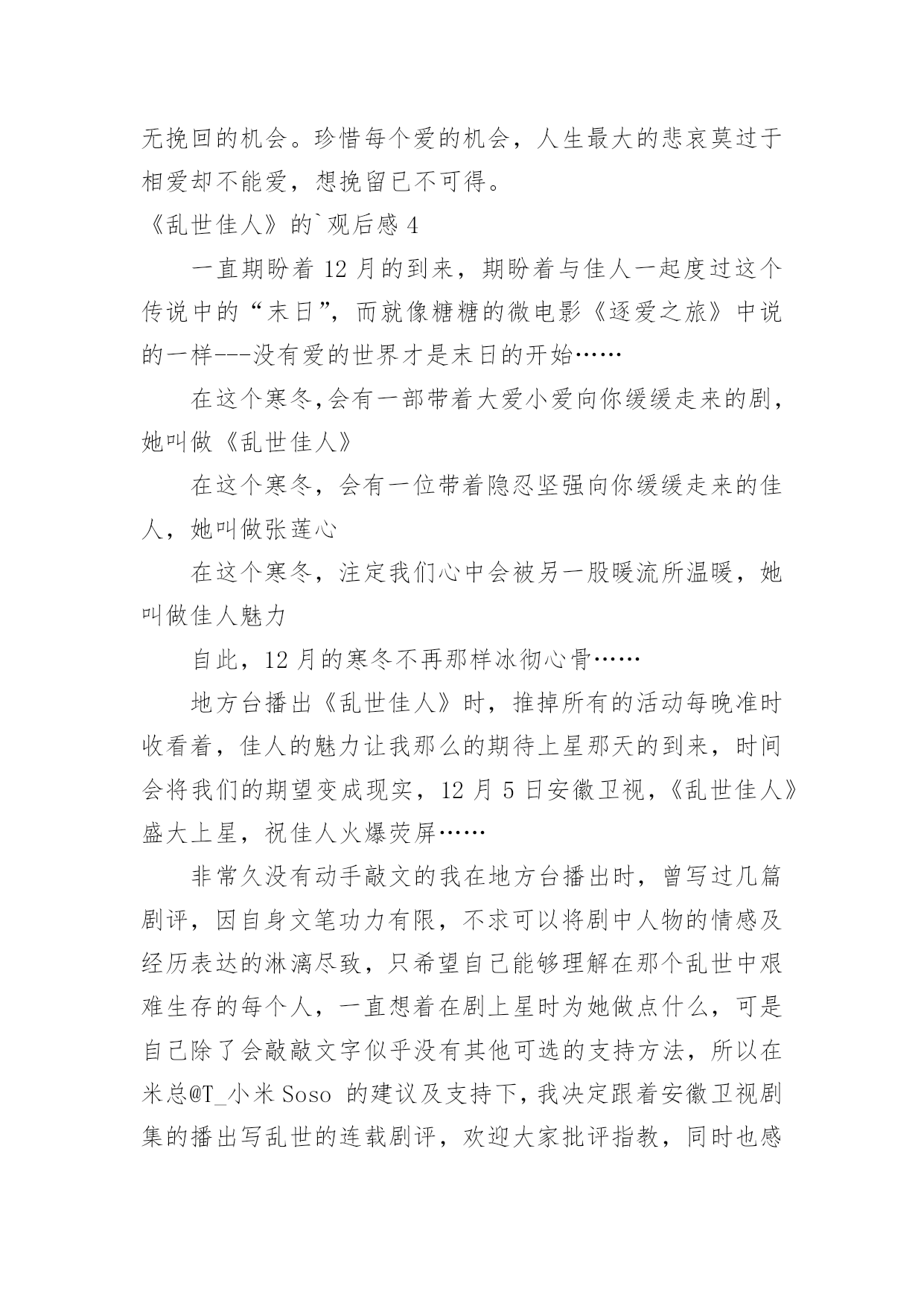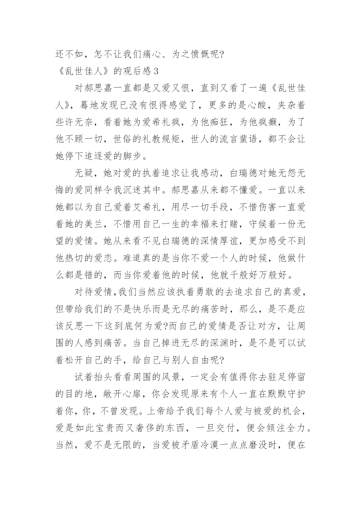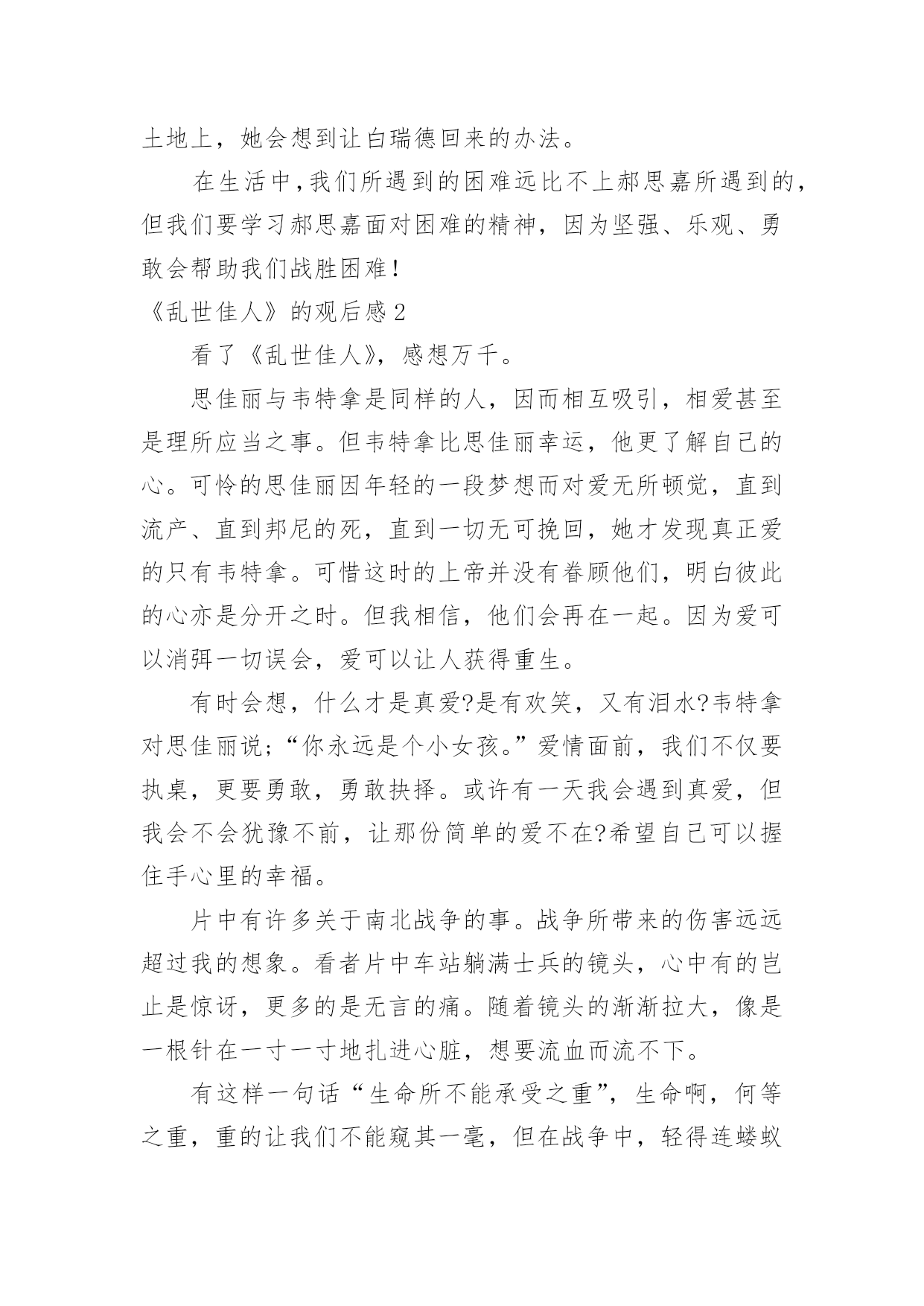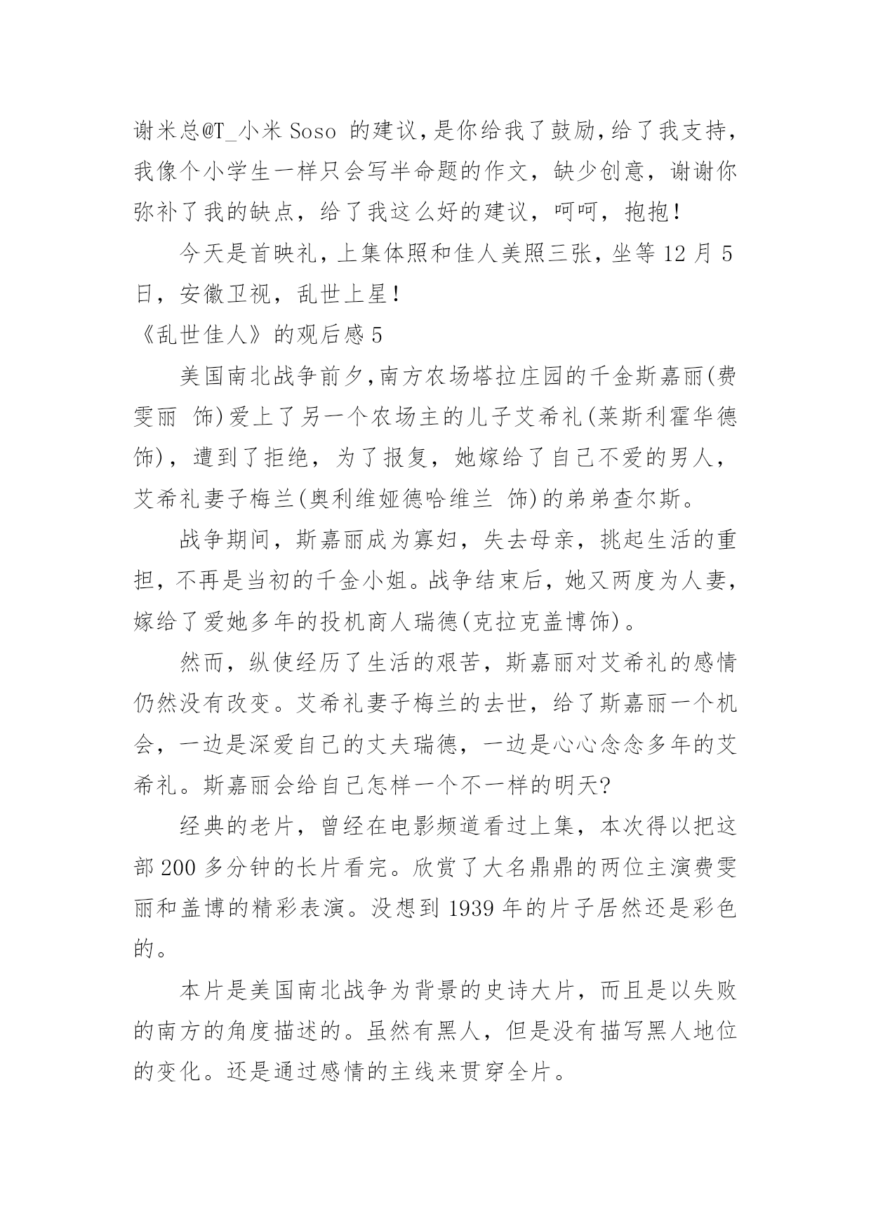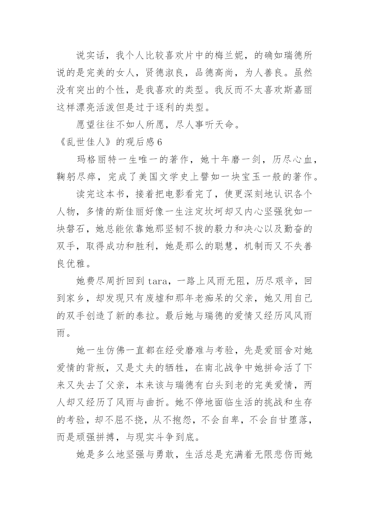 《乱世佳人》的观后感《乱世佳人》的观后感认真看完一部作品以后,一定有不少感悟吧,让我们好好写份观后感,把你的收获感想写下来吧。在写观后感之前,可以先参考范文,以下是小编帮大家整理的《乱世佳人》的观后感,欢迎大家借鉴与参考,希望对大家有所帮助。《乱世佳人》的观后感1趁着暑假这段闲暇的时光,我看了许多电影,其中《乱世佳人》给我的感触最深。《乱世佳人》又名《飘》,是美国女作者米切尔的成名作。这部电影以美国南北战争为社会背景,其中穿插着郝思嘉(女主)与白瑞德(男主)的爱情故事。在战争来临之前,郝思嘉是一个幸福的公主,心想着要与阿希礼结婚,但阿希礼却拒绝了,因为他知道自己需要什么,虽然他也爱郝思嘉,但他需要的是一个可以与他平静快乐生活的人,这个人就是米兰妮。当战争来临后,阿希礼去当兵了,郝思嘉又不在父母身旁,只有善良的米兰妮去安抚郝思嘉那颗因战争而焦躁的心,使郝思嘉对生活充满希望,充满温暖,充满爱。在经历许许多多的困难后,米兰妮的死终于让郝思嘉明白了,他爱的是白瑞德,可是白瑞德却退出了这场爱情,离开了郝思嘉。郝思嘉回到了塔拉庄园,她相信在那片神圣的土地上,她会想到让白瑞德回来的办法。在生活中,我们所遇到的困难远比不上郝思嘉所遇到的,但我们要学习郝思嘉面对困难的精神,因为坚强、乐观、勇敢会帮助我们战胜困难!《乱世佳人》的观后感2看了《乱世佳人》,感想万千。思佳丽与韦特拿是同样的人,因而相互吸引,相爱甚至是理所应当之事。但韦特拿比思佳丽幸运,他更了解自己的心。可怜的思佳丽因年轻的一段梦想而对爱无所顿觉,直到流产、直到邦尼的死,直到一切无可挽回,她才发现真正爱的只有韦特拿。可惜这时的上帝并没有眷顾他们,明白彼此的心亦是分开之时。但我相信,他们会再在一起。因为爱可以消弭一切误会,爱可以让人获得重生。有时会想,什么才是真爱?是有欢笑,又有泪水?韦特拿对思佳丽说;“你永远是个小女孩。”爱情面前,我们不仅要执桌,更要勇敢,勇敢抉择。或许有一天我会遇到真爱,但我会不会犹豫不前,让那份简单的爱不在?希望自己可以握住手心里的幸福。片中有许多关于南北战争的事。战争所带来的伤害远远超过我的想象。看者片中车站躺满士兵的镜头,心中有的岂止是惊讶,更多的是无言的痛。随着镜头的渐渐拉大,像是一根针在一寸一寸地扎进心脏,想要流血而流不下。有这样一句话“生命所不能承受之重”,生命啊,何等之重,重的让我们不能窥其一毫,但在战争中,轻得连蝼蚁还不如,怎不让我们痛心、为之愤慨呢?《乱世佳人》的观后感3对郝思嘉一直都是又爱又恨,直到又看了一遍《乱世佳人》,蓦地发现已没有恨得感觉了,更多的是心酸,夹杂着些许无奈,看着她为爱希礼疯,为他痴狂,为他疯癫,为了他不顾一切,世俗的礼教规矩,世人的流言蜚语,都不会让她停下追逐爱的脚步。无疑,她对爱的执着追求让我感动,白瑞德对她无怨无悔的爱同样令我沉迷其中。郝思嘉从来都不懂爱。一直以来她都以为自己爱着艾希礼,用尽一切手段,不惜伤害一直爱着她的美兰,不惜用自己一生的幸福来打赌,守候着一份无望的爱情。她从来看不见白瑞德的深情厚谊,更加感受不到他热切的爱恋。难道真的是当你不爱一个人的时候,他做什么都是错的,而当你爱着他的时候,他就千般好万般好。对待爱情,我们当然应该执着勇敢的去追求自己的真爱,但带给我们的不是快乐而是无尽的痛苦时,那么,是不是应该反思一下这到底何为爱?而自己的爱情是否让对方,让周围的人感到痛苦。当自己掉进无尽的深渊时,是不是可以试着松开自己的手,给自己与别人自由呢?试着抬头看看周围的风景,一定会有值得你去驻足停留的目的地,敞开心扉,你会发现原来有个人一直在默默守护着你,你,不曾发现。上帝给予我们每个人爱与被爱的机会,爱是如此宝贵而又奢侈的东西,一旦交付,便会倾注全力。当然,爱不是无限的,当爱被矛盾冷漠一点点磨没时,便在无挽回的机会。珍惜每个爱的机会,人生最大的悲哀莫过于相爱却不能爱,想挽留已不可得。《乱世佳人》的`观后感4一直期盼着12月的到来,期盼着与佳人一起度过这个传说中的“末日”,而就像糖糖的微电影《逐爱之旅》中说的一样---没有爱的世界才是末日的开始……在这个寒冬,会有一部带着大爱小爱向你缓缓走来的剧,她叫做《乱世佳人》在这个寒冬,会有一位带着隐忍坚强向你缓缓走来的佳人,她叫做张莲心在这个寒冬,注定我们心中会被另一股暖流所温暖,她叫做佳人魅力自此,12月的寒冬不再那样冰彻心骨……地方台播出《乱世佳人》时,推掉所有的活动每晚准时收看着,佳人的魅力让我那么的期待上星那天的到来,时间会将我们的期望变成现实,12月5日安徽卫视,《乱世佳人》盛大上星,祝佳人火爆荧屏……非常久没有动手敲文的我在地方台播出时,曾写过几篇剧评,因自身文笔功力有限,不求可以将剧中人物的情感及经历表达的淋漓尽致,只希望自己能够理解在那个乱世中艰难生存的每个人
