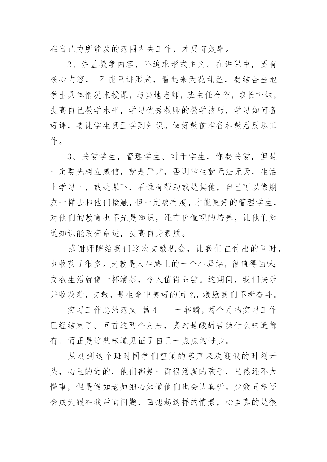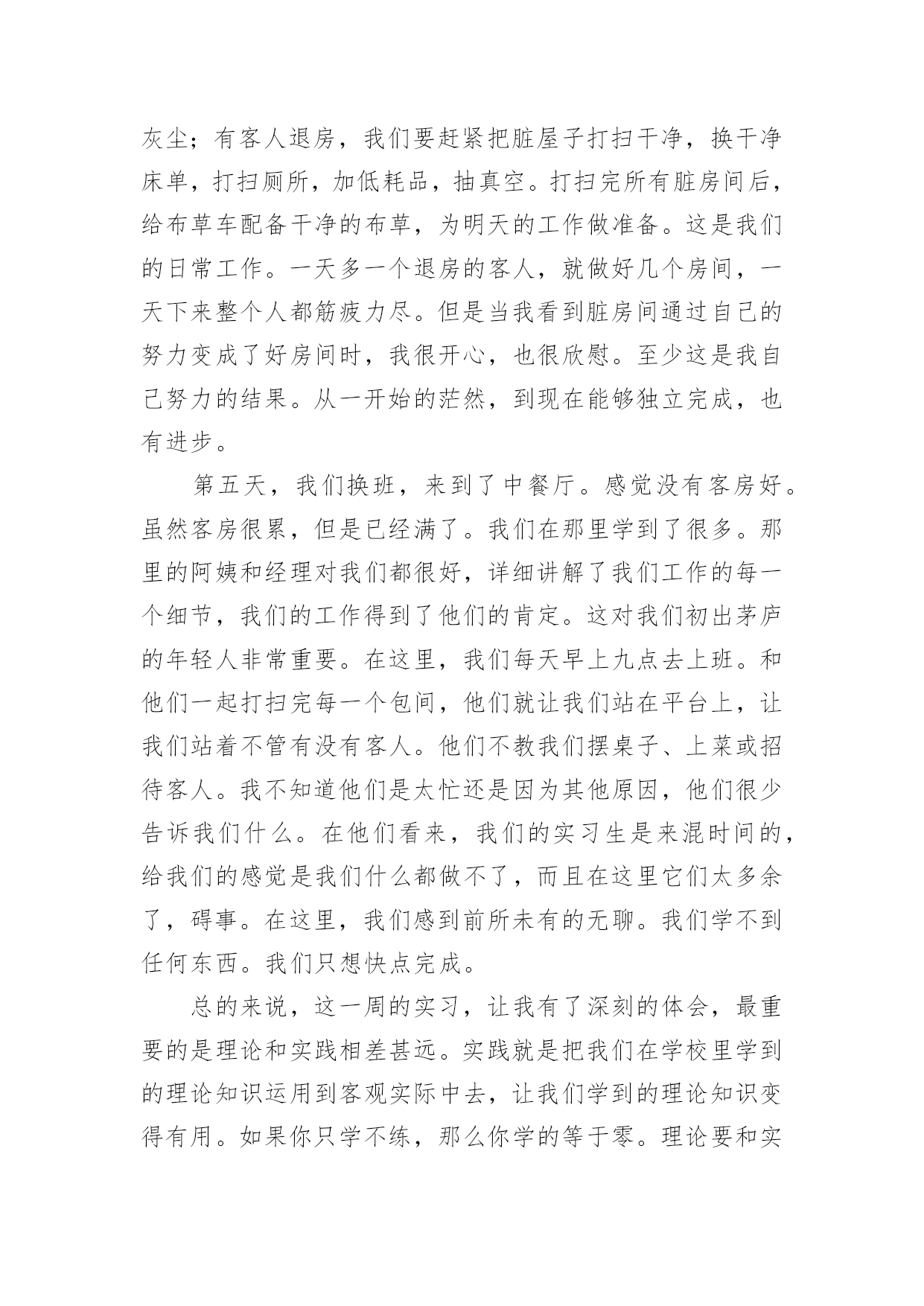 实习工作总结【热】实习工作总结范文总结是事后对某一时期、某一项目或某些工作进行回顾和分析,从而做出带有规律性的结论,通过它可以全面地、系统地了解以往的学习和工作情况,快快来写一份总结吧。总结怎么写才能发挥它的作用呢?下面是小编为大家收集的实习工作总结范文,欢迎阅读与收藏。实习工作总结范文篇1在汉马酒店实习一周结束。虽然实习时间很短,只有七天,但是通过这次实习,我学到了很多学校学不到的东西。去酒店的第一天,我和其他17个同学被分配到客房部,安排在不同的楼层。我和另一个学生在11楼。一开始,客房部的陈经理让我们自己打扫一个脏房间,然后地板带着我们的主人去检查,指出我们做的不足之处。然而我们一进房间就傻眼了。当时我们不知所措,不知道从何下手。一张空白的脸也许是当时唯一的表情。正因为如此,陈经理改变了原来的计划,所以我们不得不先向楼层师傅学习。在熟悉了一系列流程之后,接下来的三天,我们都分别打扫了脏兮兮的房间。我们每天早上八点去上班。给我们开完班前会,王副经理一到自己楼层就开始了一天的工作,一直到下午四点半才下班。中午,他有一个多小时的时间吃饭。没有客人结账的.时候,还是很轻松的,只需拿两块干湿的抹布擦拭空房里的灰尘;有客人退房,我们要赶紧把脏屋子打扫干净,换干净床单,打扫厕所,加低耗品,抽真空。打扫完所有脏房间后,给布草车配备干净的布草,为明天的工作做准备。这是我们的日常工作。一天多一个退房的客人,就做好几个房间,一天下来整个人都筋疲力尽。但是当我看到脏房间通过自己的努力变成了好房间时,我很开心,也很欣慰。至少这是我自己努力的结果。从一开始的茫然,到现在能够独立完成,也有进步。第五天,我们换班,来到了中餐厅。感觉没有客房好。虽然客房很累,但是已经满了。我们在那里学到了很多。那里的阿姨和经理对我们都很好,详细讲解了我们工作的每一个细节,我们的工作得到了他们的肯定。这对我们初出茅庐的年轻人非常重要。在这里,我们每天早上九点去上班。和他们一起打扫完每一个包间,他们就让我们站在平台上,让我们站着不管有没有客人。他们不教我们摆桌子、上菜或招待客人。我不知道他们是太忙还是因为其他原因,他们很少告诉我们什么。在他们看来,我们的实习生是来混时间的,给我们的感觉是我们什么都做不了,而且在这里它们太多余了,碍事。在这里,我们感到前所未有的无聊。我们学不到任何东西。我们只想快点完成。总的来说,这一周的实习,让我有了深刻的体会,最重要的是理论和实践相差甚远。实践就是把我们在学校里学到的理论知识运用到客观实际中去,让我们学到的理论知识变得有用。如果你只学不练,那么你学的等于零。理论要和实践相结合。另一方面,实践可以为以后找工作打下基础,因为你遇到的人和事在不同的环境下是不一样的,你从他们身上学到的东西自然也是不一样的。我们应该学会从实践中学习,从学习中实践。实习工作总结范文篇2这次的实习,让我从实践中去思考自己在课堂上学到的知识,也对于理论知识有了更深刻的认识。一个优秀的老师需要具备很多方面的素质:扎实的专业知识,娴熟的教学技能,正确的教学理念这次实习,对我来讲是上了一堂重要的社会课,只有坚持自我,不断努力,才会不断的完善自己,取得成功。教育实习使我增强了教学实践能力,认识到教育是一个互动的过程,老师只要认真投入教学,孩子就会积极配合。这种过程是很开心的`!感受到学生们有说不完的心理话抒不完的心中情。作为学生这更需要老师们去开导他们,让他们树立正确的人生目标,努力进取!在这两个月中与学生一起生活、学习,我也尝到了当老师的酸甜苦辣,体会到了作为人民教师的乐趣和光荣,这更激励着我坚定了作一名光荣的人民教师的信念。最后,我要感谢xx中学的各位领导,各位老师的照顾和教诲,感谢xx中学的领导们给予我一个这么好实习的平台,让我有机会体验在学校里无法体验的实习生活,在学校领导的精心安排下,我们受到了无微不至的关怀和照顾。虽然我们对学校实习开始信心不足,但是我的指导老师和班主任都很认真责任,把他们丰富的教学经验传授给我;我所带的班级也积极配合我的实习工作,表现了良好的精神面貌;让我对实习信心十足。感谢xx中学给我们提供了锻炼自我的平台和展现自我的机会,我在这里再一次感谢贵校的校领导和老师们为我提供的一切。最后祝xx中学全体领导老师们身体健康、家庭幸福,我们衷心祝愿xx中学的教育事业百尺竿头,更进一步。实习工作总结范文篇3带着师院的期望、怀着一颗炙热的心、承载着一份责任,来到xx中心校开始我的实习支教生涯。转眼间,半年的支教生活即将结束,在短短的这一学期里我们工作学习授课,有收获也有感动,时间虽短,却是生命里精彩的一笔,现将支教工作总结如下:一、遵守纪律。严格遵守学校纪律和支教队各项规章制度,认真完成学校安排的教学任务和支教队的各项工作。二、备好课,做好充分准备教学中,备