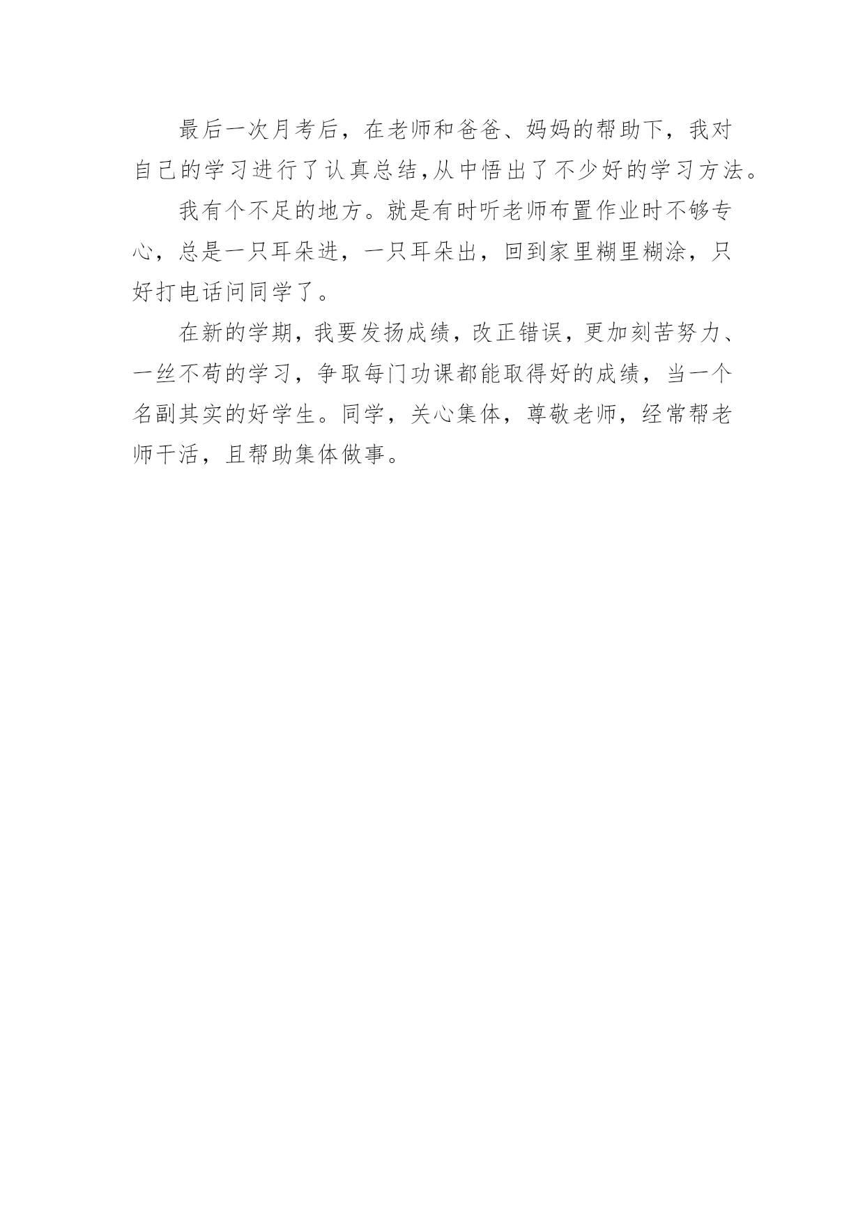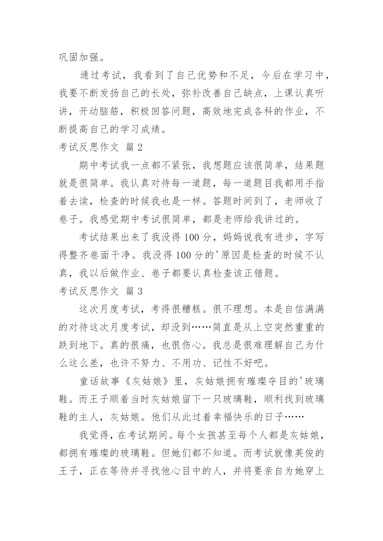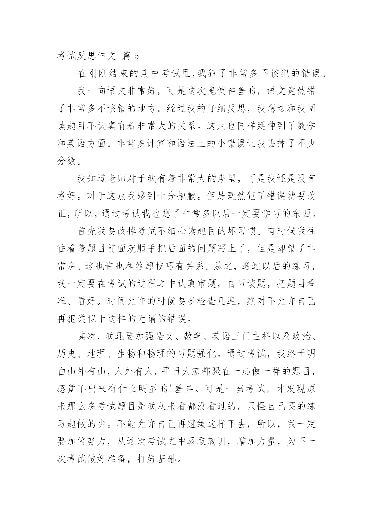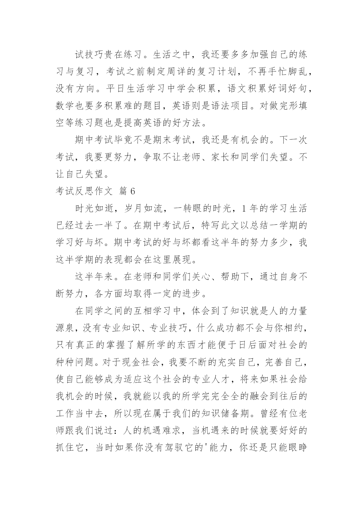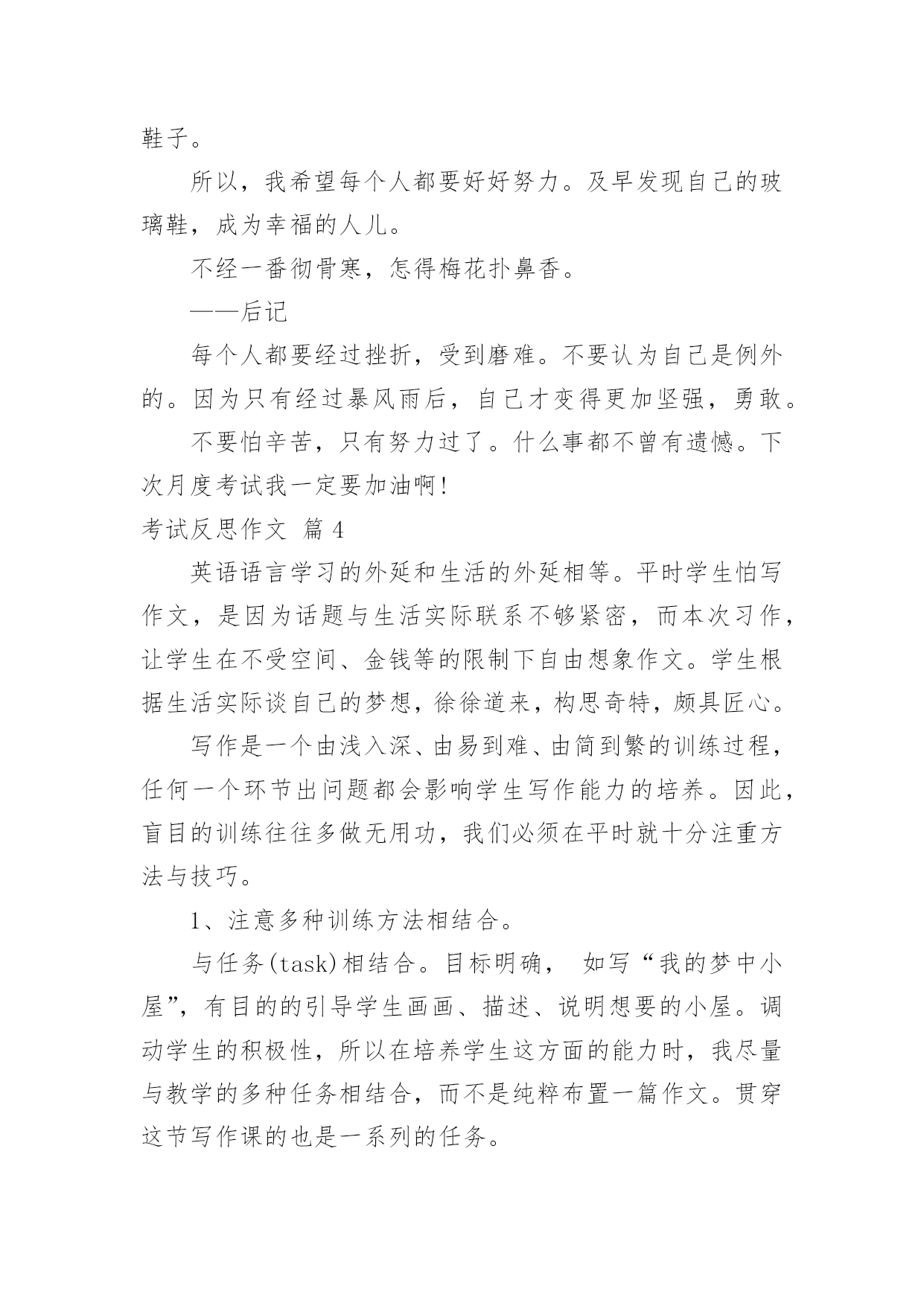 考试反思作文考试反思作文6篇【必备】在日复一日的学习、工作或生活中,许多人都有过写作文的经历,对作文都不陌生吧,作文一定要做到主题集中,围绕同一主题作深入阐述,切忌东拉西扯,主题涣散甚至无主题。相信许多人会觉得作文很难写吧,以下是小编整理的考试反思作文6篇,欢迎阅读,希望大家能够喜欢。考试反思作文篇1我对这次期中考试的自我评价不太满意,我首先反思一下我的数学吧,这次期中考试上午先考数学,再考语文,下午考英语。我考的数学首先先要从这几方面说起,我平时上课认真听讲,但是回答问题的积极性不太强,因为我对自己的学习不够自信,我害怕回答问题出错,受到同学们笑话。妈妈告诉我说:“孩子,学习难免会有出错的时候,出一个错也是很正常的,但是有一句名言是失败是成功之母。通过出错,然后改正,让自己记得更好更牢固,这也是件好事啊!出错的'人不是没本事的人,最没本事的人当然就是笑话别人的人了。”我错的题是一个0.67平方米与76平方分米比较大小。我一时恍惚,把67看成了76,就出错了。以后我要更加认真细心地去读题做题。还有一道题是用量角器测量平行四边形的角的度数,这方面的内容,我们基本没有接触过,出错后,妈妈在家里给我出了好几道这样的题目,让我巩固加强。通过考试,我看到了自己优势和不足,今后在学习中,我要不断发扬自己的长处,弥补改善自己缺点,上课认真听讲,开动脑筋,积极回答问题,高效地完成各科的作业,不断提高自己的学习成绩。考试反思作文篇2期中考试我一点都不紧张,我想题应该很简单,结果题就是很简单。我认真对待每一道题,每一道题目我都用手指着去读,检查的时候我也是一样。答题时间到了,老师收了卷子。我感觉期中考试很简单,都是老师给我讲过的。考试结果出来了我没得100分,妈妈说我有进步,字写得整齐卷面干净。我没得100分的'原因是检查的时候不认真,我以后做作业、卷子都要认真检查该正错题。考试反思作文篇3这次月度考试,考得很糟糕。很不理想。本是自信满满的对待这次月度考试,却没到……简直是从上空突然重重的跌到地下。真的很痛,也很伤心。我总是很难理解自己为什么这么差,也许不努力、不用功、记性不好吧。童话故事《灰姑娘》里,灰姑娘拥有璀璨夺目的'玻璃鞋。而王子顺着当时灰姑娘留下一只玻璃鞋,顺利找到玻璃鞋的主人,灰姑娘。他们从此过着幸福快乐的日子……我觉得,在考试期间。每个女孩甚至每个人都是灰姑娘,都拥有璀璨的玻璃鞋。但她们都不知道。而考试就像英俊的王子,正在等待并寻找他心目中的人,并将要亲自为她穿上鞋子。所以,我希望每个人都要好好努力。及早发现自己的玻璃鞋,成为幸福的人儿。不经一番彻骨寒,怎得梅花扑鼻香。——后记每个人都要经过挫折,受到磨难。不要认为自己是例外的。因为只有经过暴风雨后,自己才变得更加坚强,勇敢。不要怕辛苦,只有努力过了。什么事都不曾有遗憾。下次月度考试我一定要加油啊!考试反思作文篇4英语语言学习的外延和生活的外延相等。平时学生怕写作文,是因为话题与生活实际联系不够紧密,而本次习作,让学生在不受空间、金钱等的限制下自由想象作文。学生根据生活实际谈自己的梦想,徐徐道来,构思奇特,颇具匠心。写作是一个由浅入深、由易到难、由简到繁的训练过程,任何一个环节出问题都会影响学生写作能力的培养。因此,盲目的训练往往多做无用功,我们必须在平时就十分注重方法与技巧。1、注意多种训练方法相结合。与任务(task)相结合。目标明确,如写“我的梦中小屋”,有目的的引导学生画画、描述、说明想要的小屋。调动学生的积极性,所以在培养学生这方面的能力时,我尽量与教学的多种任务相结合,而不是纯粹布置一篇作文。贯穿这节写作课的也是一系列的任务。2、平时注重解题技巧的养成:1).准备工作①.仔细审题,明确要求②.紧扣要点,寻求思路。2).写作之中①.开门见山,紧扣主题。②.语言正确,规范地道。尽量使用学过的、最熟悉也最有把握的.句型、结构,应尽量避免中国式英语。要养成正确运用标点符号的好习惯,切忌一点到底的错误方法。③.重短轻长,就易避难。④.过渡自然,表达流畅。注意前后句、上下文尽量过渡自然,正确使用and,or,but,because,so,then,after等词,保持行文的流畅。不重复使用可置换的词,如描述“我的梦中小屋”时,可以用firstly,secondly,then,afterthat等表示先后的序列词。3).成文之后鼓励学生学会批改自己的习作。①.一般语法项目的检查——英语中的人称、时态、单复数、习惯用法等都是非常重要的,即使在朗读中好像全理解,但在动笔的实践中就往往出错。如我们这篇作文多用一般现在时,第一人称。②.注意语序——英语中的疑问句、感叹句和宾语从句都是通过语序的变化来构成和体现的,不注意会出现错误和意义上混淆。本篇作文要注意感叹句的语序。④.书写规范,卷面整