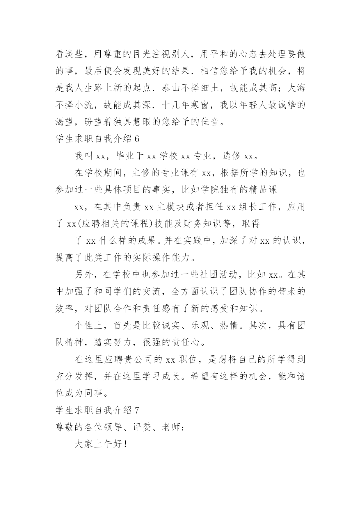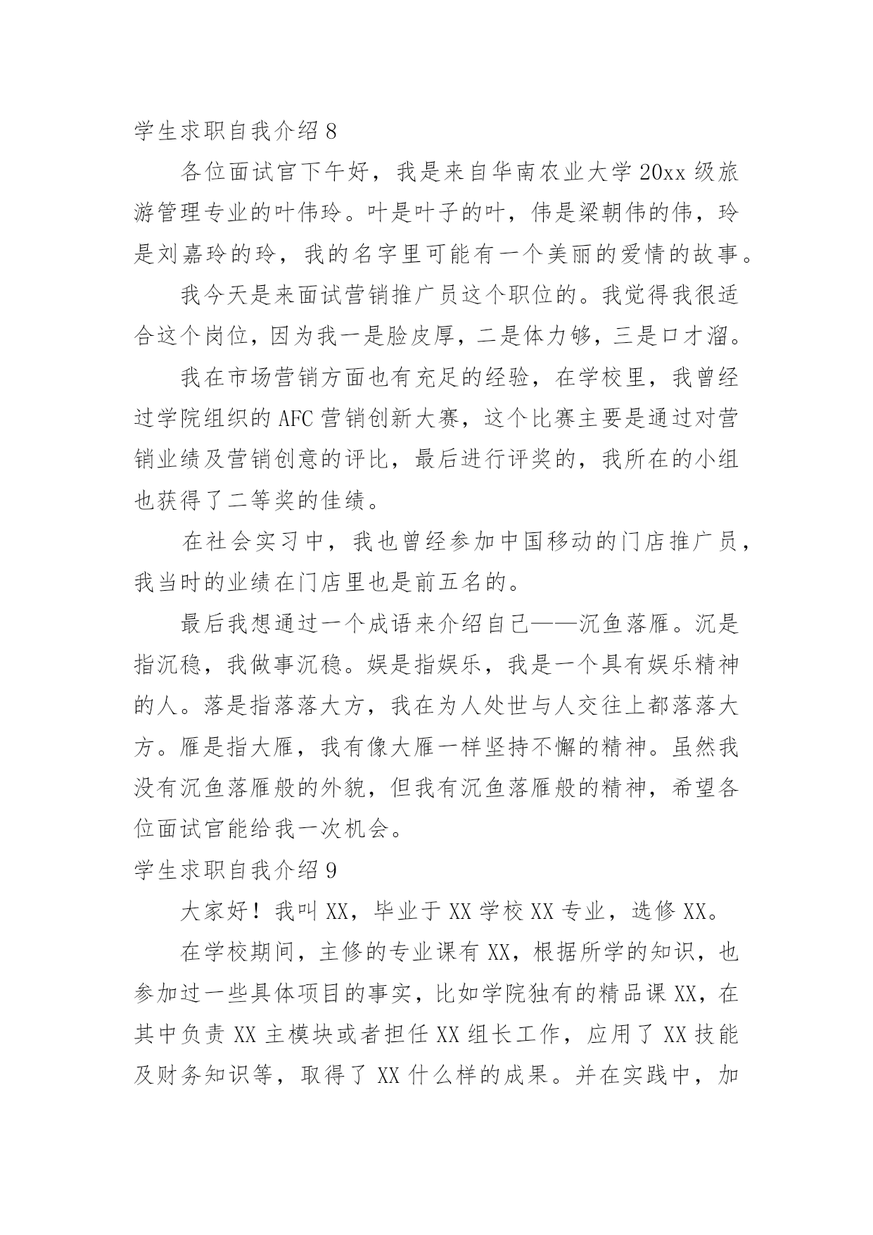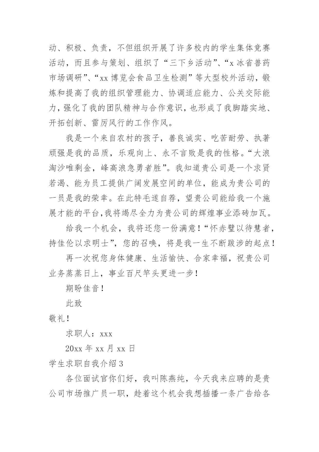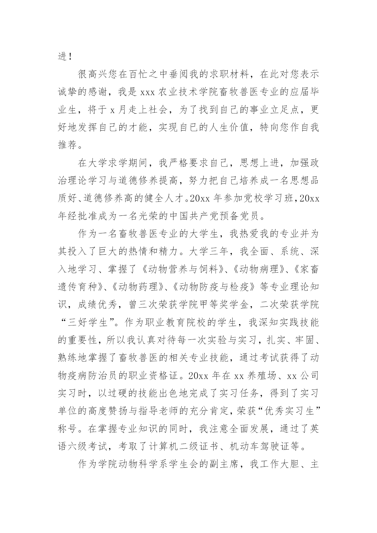 学生求职自我介绍学生求职自我介绍当进入一个新环境,我们有必要进行适当的自我介绍,自我介绍可以给陌生人留下一个好的印象。相信大家又在为写自我介绍犯愁了吧!下面是小编整理的学生求职自我介绍,欢迎阅读与收藏。学生求职自我介绍1尊敬的各位领导:大家好!我叫x,毕业于x师范学院x专业。很高兴今天能到这里向各位考官学习!在思想上,我追求进步,在学习上刻苦努力,勤奋好学,现已通过了x省大学英语三级、全国高等学校非计算机专业计算机水平一级、掌握各种软件操作,能制作教学课件;在工作上,以工作勤恳,认真负责、积极主动且富有灵活性。由于表现突出,各方面都取得了优异的成绩,先后获得了“优秀共青团员”、x学院杯”大学生羽毛球比赛获得本科组男子团体第四名的成绩、“优秀羽毛球裁判员”、“优秀实习生”等。谢谢大家!学生求职自我介绍2尊敬的xx领导:您好!首先祝贵公司“才”源广进,再祝贵公司财源广进!很高兴您在百忙之中垂阅我的求职材料,在此对您表示诚挚的感谢,我是xxx农业技术学院畜牧兽医专业的应届毕业生,将于x月走上社会,为了找到自己的事业立足点,更好地发挥自己的才能,实现自已的人生价值,特向您作自我推荐。在大学求学期间,我严格要求自己,思想上进,加强政治理论学习与道德修养提高,努力把自己培养成一名思想品质好、道德修养高的健全人才。20xx年参加党校学习班,20xx年经批准成为一名光荣的中国共产党预备党员。作为一名畜牧兽医专业的大学生,我热爱我的专业并为其投入了巨大的热情和精力。大学三年,我全面、系统、深入地学习、掌握了《动物营养与饲料》、《动物病理》、《家畜遗传育种》、《动物药理》、《动物防疫与检疫》等专业理论知识,成绩优秀,曾三次荣获学院甲等奖学金,二次荣获学院“三好学生”。作为职业教育院校的学生,我深知实践技能的重要性,所以我认真对待每一次实验与实习,扎实、牢固、熟练地掌握了畜牧兽医的相关专业技能,通过考试获得了动物疫病防治员的职业资格证。20xx年在xx养殖场、xx公司实习时,以过硬的技能出色地完成了实习任务,得到了实习单位的高度赞扬与指导老师的充分肯定,荣获“优秀实习生”称号。在掌握专业知识的同时,我注意全面发展,通过了英语六级考试,考取了计算机二级证书、机动车驾驶证等。作为学院动物科学系学生会的副主席,我工作大胆、主动、积极、负责,不但组织开展了许多校内的学生集体竞赛活动,而且参与策划、组织了“三下乡活动”、“x冰省兽药市场调研”、“xx博览会食品卫生检测”等大型校外活动,锻炼和提高了我的组织管理能力、协调适应能力、公关交际能力,强化了我的团队精神与合作意识,也形成了我脚踏实地、开拓创新、雷厉风行的工作作风。我是一个来自农村的孩子,善良诚实、吃苦耐劳、执著顽强是我的品质,乐观向上、永不言败是我的性格。“大浪淘沙唯剩金,峰高浪急勇者胜”。我知道贵公司是一个求贤若渴、能为员工提供广阔发展空间的单位,能成为贵公司的一员是我的荣幸。在此特毛遂自荐,望贵公司能给我一个施展才能的平台,我将竭尽全力为贵公司的辉煌事业添砖加瓦。给我一个机会,我将还您一份满意!“怀赤璧以待慧者,持佳伦以求明士”,您的召唤,将是我一生不断跋涉的起点!再一次祝您身体健康、生活愉快、合家幸福,祝贵公司业务蒸蒸日上,事业百尺竿头更进一步!期盼佳音!此致敬礼!求职人:xxx20xx年xx月xx日学生求职自我介绍3各位面试官你们好,我叫陈燕纯,今天我来应聘的是贵公司市场推广员一职,趁着这个机会我想插播一条广告给各位推销一款产品,希望大家喜欢:这款产品名陈燕纯,由华南农业大学旅游管理专业人士研发而成,在长达四年的研制时间里,该产品获得了各大机构的功能鉴定:首先,该产品曾担任第一辩手获得辩论赛冠军,具备流利的语言表达技能;其次,它曾参与AFC市场营销大赛,撰写策划推广商品,在48支队伍中脱颖而出成为亚军,具备良好的市场营销意识;最后,该产品不仅在华农本土担任社团主席,带领35人团队筹备大型招聘会,还冲出华农活跃于大小企业实习,拥有一般产品不具备的团队合作和抗压能力。哇!如此兼备表达、营销、协作、抗压性能的产品,现今上市,全国流通,但仅此一件!在场的各位如若心动请立即行动,来个hr,把她带回家。谢谢,我的自我介绍完毕!学生求职自我介绍4尊敬的领导:您好!我叫xxx,毕业于xx校园,xx专业。我在校园期间,主修的专业课有x(此处添加应聘职位相关专业课或说成选修课为应聘职位所需课程,尤其重要),根据所学的知识,也参加过一些具体项目的事实,比如校园独有的精品课x,在其中负责x主模块或者担任x组长工作)技能及财务知识等,取得了xx什么样的成果。并在实践中,加深了对xx的认识,提高了此类工作的实际操作潜力。另外,在校园中也参加过一些社团活动,比如xx此处最好说xx样如校园xx周年校庆活动或院运会),在其