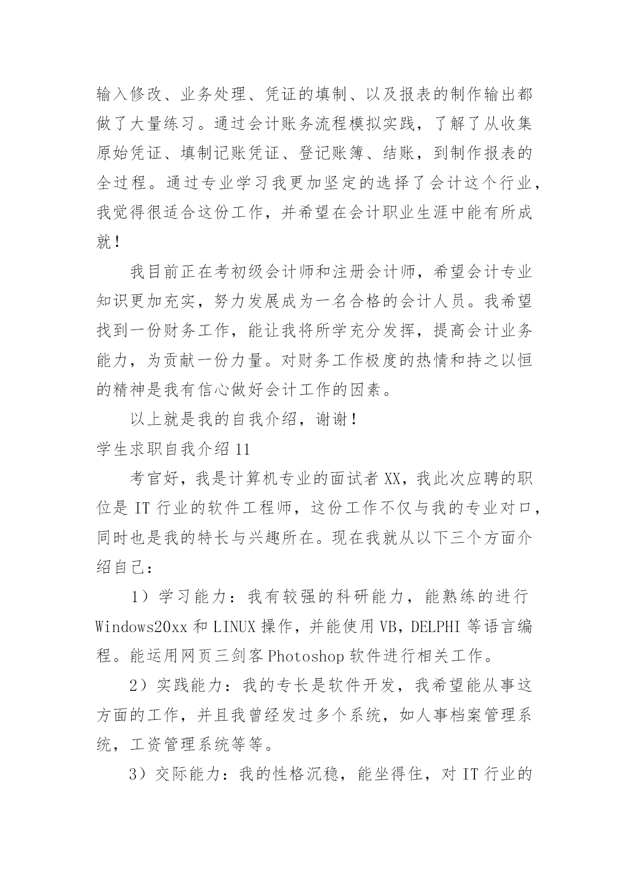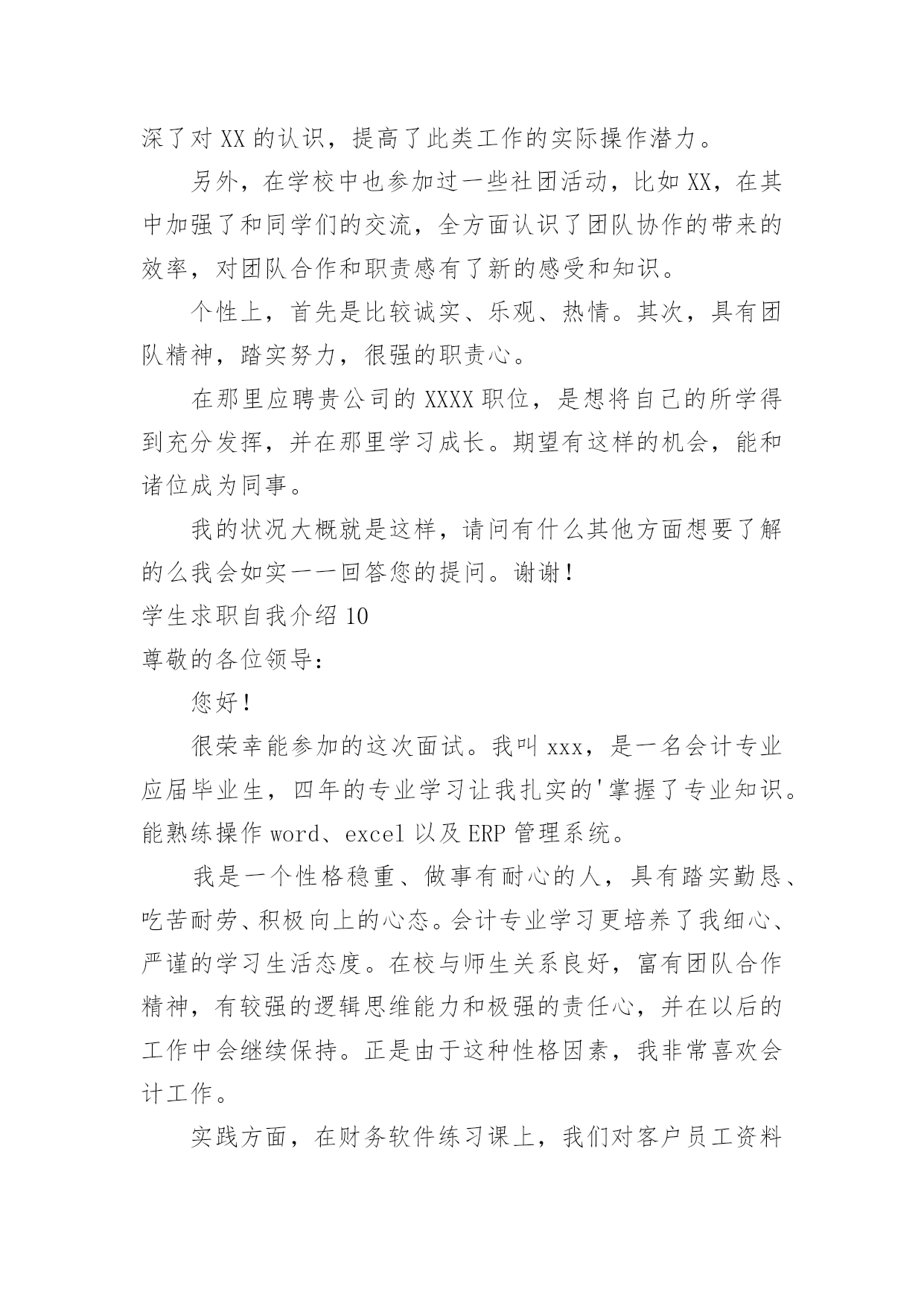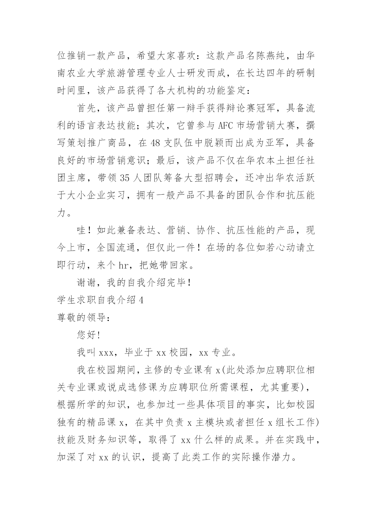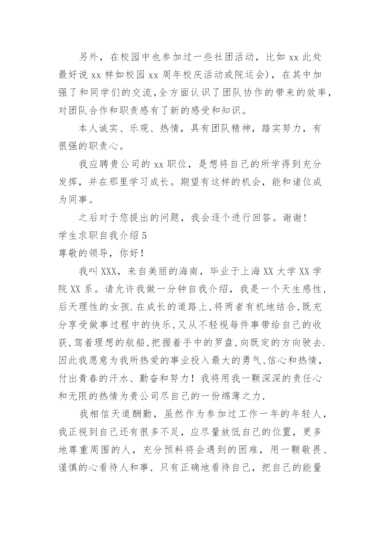 学生求职自我介绍学生求职自我介绍当进入一个新环境,我们有必要进行适当的自我介绍,自我介绍可以给陌生人留下一个好的印象。相信大家又在为写自我介绍犯愁了吧!下面是小编整理的学生求职自我介绍,欢迎阅读与收藏。学生求职自我介绍1尊敬的各位领导:大家好!我叫x,毕业于x师范学院x专业。很高兴今天能到这里向各位考官学习!在思想上,我追求进步,在学习上刻苦努力,勤奋好学,现已通过了x省大学英语三级、全国高等学校非计算机专业计算机水平一级、掌握各种软件操作,能制作教学课件;在工作上,以工作勤恳,认真负责、积极主动且富有灵活性。由于表现突出,各方面都取得了优异的成绩,先后获得了“优秀共青团员”、x学院杯”大学生羽毛球比赛获得本科组男子团体第四名的成绩、“优秀羽毛球裁判员”、“优秀实习生”等。谢谢大家!学生求职自我介绍2尊敬的xx领导:您好!首先祝贵公司“才”源广进,再祝贵公司财源广进!很高兴您在百忙之中垂阅我的求职材料,在此对您表示诚挚的感谢,我是xxx农业技术学院畜牧兽医专业的应届毕业生,将于x月走上社会,为了找到自己的事业立足点,更好地发挥自己的才能,实现自已的人生价值,特向您作自我推荐。在大学求学期间,我严格要求自己,思想上进,加强政治理论学习与道德修养提高,努力把自己培养成一名思想品质好、道德修养高的健全人才。20xx年参加党校学习班,20xx年经批准成为一名光荣的中国共产党预备党员。作为一名畜牧兽医专业的大学生,我热爱我的专业并为其投入了巨大的热情和精力。大学三年,我全面、系统、深入地学习、掌握了《动物营养与饲料》、《动物病理》、《家畜遗传育种》、《动物药理》、《动物防疫与检疫》等专业理论知识,成绩优秀,曾三次荣获学院甲等奖学金,二次荣获学院“三好学生”。作为职业教育院校的学生,我深知实践技能的重要性,所以我认真对待每一次实验与实习,扎实、牢固、熟练地掌握了畜牧兽医的相关专业技能,通过考试获得了动物疫病防治员的职业资格证。20xx年在xx养殖场、xx公司实习时,以过硬的技能出色地完成了实习任务,得到了实习单位的高度赞扬与指导老师的充分肯定,荣获“优秀实习生”称号。在掌握专业知识的同时,我注意全面发展,通过了英语六级考试,考取了计算机二级证书、机动车驾驶证等。作为学院动物科学系学生会的副主席,我工作大胆、主动、积极、负责,不但组织开展了许多校内的学生集体竞赛活动,而且参与策划、组织了“三下乡活动”、“x冰省兽药市场调研”、“xx博览会食品卫生检测”等大型校外活动,锻炼和提高了我的组织管理能力、协调适应能力、公关交际能力,强化了我的团队精神与合作意识,也形成了我脚踏实地、开拓创新、雷厉风行的工作作风。我是一个来自农村的孩子,善良诚实、吃苦耐劳、执著顽强是我的品质,乐观向上、永不言败是我的性格。“大浪淘沙唯剩金,峰高浪急勇者胜”。我知道贵公司是一个求贤若渴、能为员工提供广阔发展空间的单位,能成为贵公司的一员是我的荣幸。在此特毛遂自荐,望贵公司能给我一个施展才能的平台,我将竭尽全力为贵公司的辉煌事业添砖加瓦。给我一个机会,我将还您一份满意!“怀赤璧以待慧者,持佳伦以求明士”,您的召唤,将是我一生不断跋涉的起点!再一次祝您身体健康、生活愉快、合家幸福,祝贵公司业务蒸蒸日上,事业百尺竿头更进一步!期盼佳音!此致敬礼!求职人:xxx20xx年xx月xx日学生求职自我介绍3各位面试官你们好,我叫陈燕纯,今天我来应聘的是贵公司市场推广员一职,趁着这个机会我想插播一条广告给各位推销一款产品,希望大家喜欢:这款产品名陈燕纯,由华南农业大学旅游管理专业人士研发而成,在长达四年的研制时间里,该产品获得了各大机构的功能鉴定:首先,该产品曾担任第一辩手获得辩论赛冠军,具备流利的语言表达技能;其次,它曾参与AFC市场营销大赛,撰写策划推广商品,在48支队伍中脱颖而出成为亚军,具备良好的市场营销意识;最后,该产品不仅在华农本土担任社团主席,带领35人团队筹备大型招聘会,还冲出华农活跃于大小企业实习,拥有一般产品不具备的团队合作和抗压能力。哇!如此兼备表达、营销、协作、抗压性能的产品,现今上市,全国流通,但仅此一件!在场的各位如若心动请立即行动,来个hr,把她带回家。谢谢,我的自我介绍完毕!学生求职自我介绍4尊敬的领导:您好!我叫xxx,毕业于xx校园,xx专业。我在校园期间,主修的专业课有x(此处添加应聘职位相关专业课或说成选修课为应聘职位所需课程,尤其重要),根据所学的知识,也参加过一些具体项目的事实,比如校园独有的精品课x,在其中负责x主模块或者担任x组长工作)技能及财务知识等,取得了xx什么样的成果。并在实践中,加深了对xx的认识,提高了此类工作的实际操作潜力。另外,在校园中也参加过一些社团活动,比如xx此处最好说xx样如校园xx周年校庆活动或院运会),在其