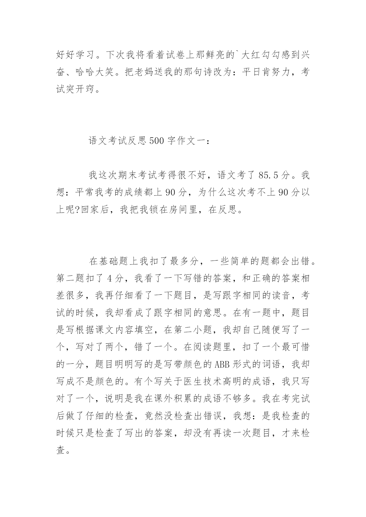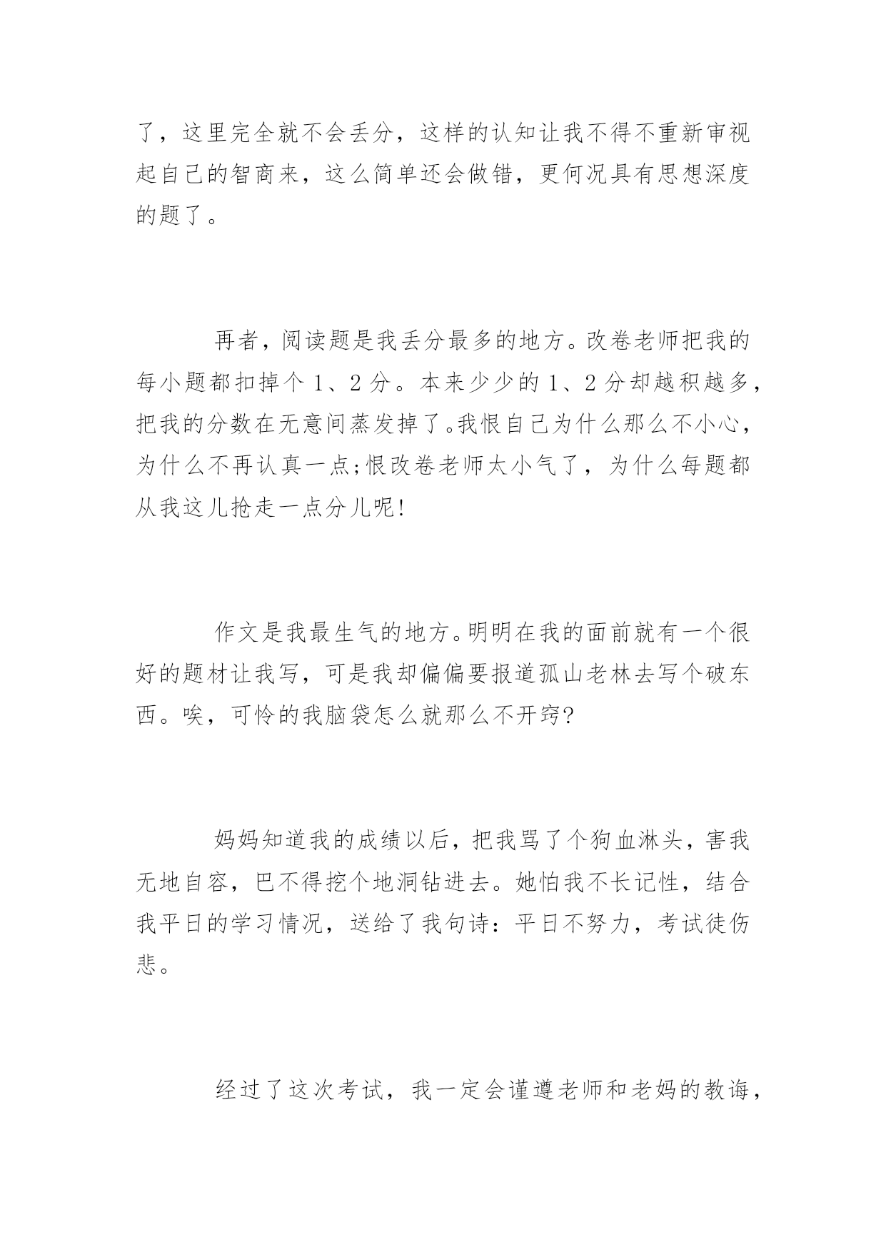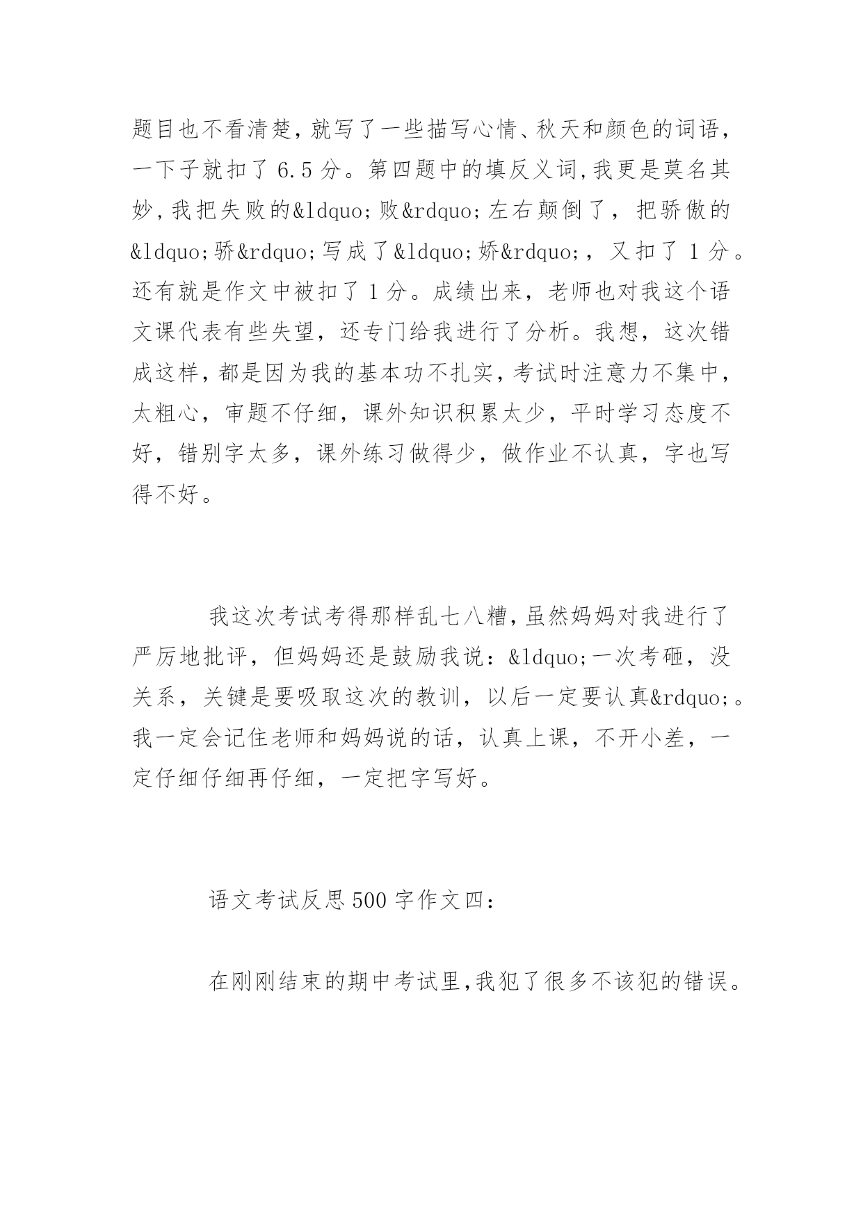 语文考试反思2017年语文考试反思大全语文独特的视角期待着您;走进语文,丝丝书卷气,俗话说:“虚心使人进步,骄傲使人落后。”在这次考试中,我也犯了这个毛病。要吸取教训,要从摔倒的地方爬起来,下次考试中不能再犯同样的错误,这样才能考得更好。下面是小编整理的语文考试反思,供参考,更多内容请继续浏览本站!语文考试反思500字作文一:时间总是过的很快,一转眼之间就从我们指缝间溜走,抓也抓不住,一下子期中考试就过去了,接下来就是紧张的成绩揭晓日,拿到试卷的那一刻,说不清什么心情的我只能呆呆的看着占满试卷的叉叉。检查完试卷后,我发现积累和运用是我最不应该出错的地方,这两个部分本来是我最应该拿到分数的部分,但是没想到粗心大意的我竟然把分数生生弄丢了。看着那几道简单的题目都是课本上的题目,如果平时的时候我把课本背熟了,这里完全就不会丢分,这样的认知让我不得不重新审视起自己的智商来,这么简单还会做错,更何况具有思想深度的题了。再者,阅读题是我丢分最多的地方。改卷老师把我的每小题都扣掉个1、2分。本来少少的1、2分却越积越多,把我的分数在无意间蒸发掉了。我恨自己为什么那么不小心,为什么不再认真一点;恨改卷老师太小气了,为什么每题都从我这儿抢走一点分儿呢!作文是我最生气的地方。明明在我的面前就有一个很好的题材让我写,可是我却偏偏要报道孤山老林去写个破东西。唉,可怜的我脑袋怎么就那么不开窍?妈妈知道我的成绩以后,把我骂了个狗血淋头,害我无地自容,巴不得挖个地洞钻进去。她怕我不长记性,结合我平日的学习情况,送给了我句诗:平日不努力,考试徒伤悲。经过了这次考试,我一定会谨遵老师和老妈的教诲,好好学习。下次我将看着试卷上那鲜亮的`大红勾勾感到兴奋、哈哈大笑。把老妈送我的那句诗改为:平日肯努力,考试突开窍。语文考试反思500字作文一:我这次期末考试考得很不好,语文考了85.5分。我想:平常我考的成绩都上90分,为什么这次考不上90分以上呢?回家后,我把我锁在房间里,在反思。在基础题上我扣了最多分,一些简单的题都会出错。第二题扣了4分,我看了一下写错的答案,和正确的答案相差很多,我再仔细看了一下题目,是写跟字相同的读音,考试的时候,我却看成了跟字相同的意思。在有一题中,题目是写根据课文内容填空,在第二小题,我却自己随便写了一个,写对了两个,错了一个。在阅读题里,扣了一个最可惜的一分,题目明明写的是写带颜色的ABB形式的词语,我却写成不是颜色的。有个写关于医生技术高明的成语,我只写对了一个,说明是我在课外积累的成语不够多。我在考完试后做了仔细的检查,竟然没检查出错误,我想:是我检查的时候只是检查了写出的答案,却没有再读一次题目,才来检查。从这次考试中,我知道了我考试时候的薄弱之处:①在做题的时候没有认真读题,只是一目十行。②在读题的时候并没有真正读懂题目的意思,就开始写题。③成语方面的知识不够丰富,在课外得多多积累。④阅读题的题目没有完全读透,不懂意思,要多读几遍。⑤作文的题目要划关键词,要多读关键词,就能写好作文。⑥做完题检查的时候要再读一遍题目,才来检查答案,这样才有效果。俗话说:“虚心使人进步,骄傲使人落后。”在这次考试中,我也犯了这个毛病。要吸取教训,要从摔倒的地方爬起来,下次考试中不能再犯同样的错误,这样才能考得更好。希望下学期我能够考到很好的成绩,越来越进步。语文考试反思500字作文三:今天,语文第三单元的试卷发下来了。我考砸了!我只考了91.5分。试卷的第一页我就被扣了7.5分,看着考卷上鲜红的“╳”,我特别伤心。想到第三题中要求我们写出描写心情、秋天和颜色的成语或短语,我居然连题目也不看清楚,就写了一些描写心情、秋天和颜色的词语,一下子就扣了6.5分。第四题中的填反义词,我更是莫名其妙,我把失败的“败”左右颠倒了,把骄傲的“骄”写成了“娇”,又扣了1分。还有就是作文中被扣了1分。成绩出来,老师也对我这个语文课代表有些失望,还专门给我进行了分析。我想,这次错成这样,都是因为我的基本功不扎实,考试时注意力不集中,太粗心,审题不仔细,课外知识积累太少,平时学习态度不好,错别字太多,课外练习做得少,做作业不认真,字也写得不好。我这次考试考得那样乱七八糟,虽然妈妈对我进行了严厉地批评,但妈妈还是鼓励我说:“一次考砸,没关系,关键是要吸取这次的教训,以后一定要认真”。我一定会记住老师和妈妈说的话,认真上课,不开小差,一定仔细仔细再仔细,一定把字写好。语文考试反思500字作文四:在刚刚结束的期中考试里,我犯了很多不该犯的错误。我一向语文很好,可是这次鬼使