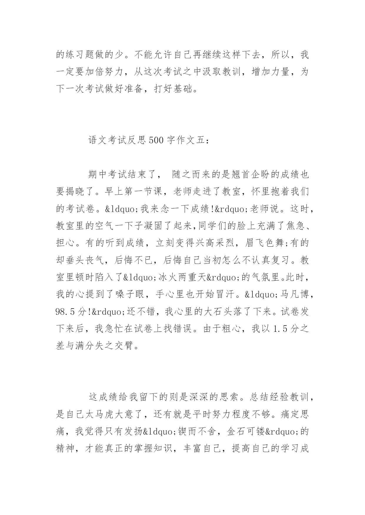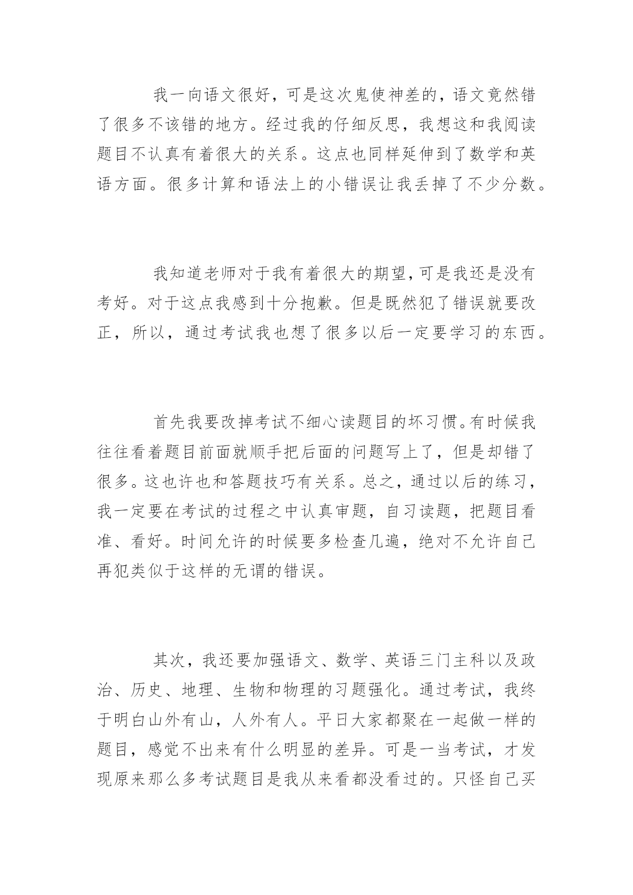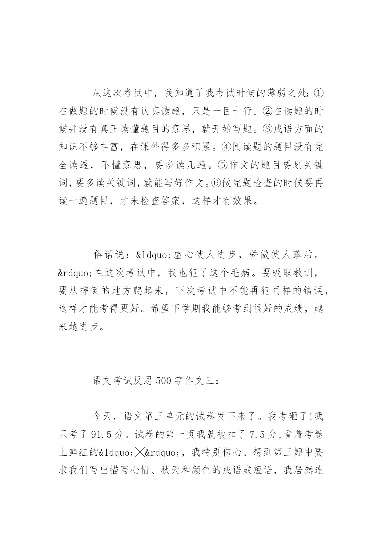 语文考试反思2017年语文考试反思大全语文独特的视角期待着您;走进语文,丝丝书卷气,俗话说:“虚心使人进步,骄傲使人落后。”在这次考试中,我也犯了这个毛病。要吸取教训,要从摔倒的地方爬起来,下次考试中不能再犯同样的错误,这样才能考得更好。下面是小编整理的语文考试反思,供参考,更多内容请继续浏览本站!语文考试反思500字作文一:时间总是过的很快,一转眼之间就从我们指缝间溜走,抓也抓不住,一下子期中考试就过去了,接下来就是紧张的成绩揭晓日,拿到试卷的那一刻,说不清什么心情的我只能呆呆的看着占满试卷的叉叉。检查完试卷后,我发现积累和运用是我最不应该出错的地方,这两个部分本来是我最应该拿到分数的部分,但是没想到粗心大意的我竟然把分数生生弄丢了。看着那几道简单的题目都是课本上的题目,如果平时的时候我把课本背熟了,这里完全就不会丢分,这样的认知让我不得不重新审视起自己的智商来,这么简单还会做错,更何况具有思想深度的题了。再者,阅读题是我丢分最多的地方。改卷老师把我的每小题都扣掉个1、2分。本来少少的1、2分却越积越多,把我的分数在无意间蒸发掉了。我恨自己为什么那么不小心,为什么不再认真一点;恨改卷老师太小气了,为什么每题都从我这儿抢走一点分儿呢!作文是我最生气的地方。明明在我的面前就有一个很好的题材让我写,可是我却偏偏要报道孤山老林去写个破东西。唉,可怜的我脑袋怎么就那么不开窍?妈妈知道我的成绩以后,把我骂了个狗血淋头,害我无地自容,巴不得挖个地洞钻进去。她怕我不长记性,结合我平日的学习情况,送给了我句诗:平日不努力,考试徒伤悲。经过了这次考试,我一定会谨遵老师和老妈的教诲,好好学习。下次我将看着试卷上那鲜亮的`大红勾勾感到兴奋、哈哈大笑。把老妈送我的那句诗改为:平日肯努力,考试突开窍。语文考试反思500字作文一:我这次期末考试考得很不好,语文考了85.5分。我想:平常我考的成绩都上90分,为什么这次考不上90分以上呢?回家后,我把我锁在房间里,在反思。在基础题上我扣了最多分,一些简单的题都会出错。第二题扣了4分,我看了一下写错的答案,和正确的答案相差很多,我再仔细看了一下题目,是写跟字相同的读音,考试的时候,我却看成了跟字相同的意思。在有一题中,题目是写根据课文内容填空,在第二小题,我却自己随便写了一个,写对了两个,错了一个。在阅读题里,扣了一个最可惜的一分,题目明明写的是写带颜色的ABB形式的词语,我却写成不是颜色的。有个写关于医生技术高明的成语,我只写对了一个,说明是我在课外积累的成语不够多。我在考完试后做了仔细的检查,竟然没检查出错误,我想:是我检查的时候只是检查了写出的答案,却没有再读一次题目,才来检查。从这次考试中,我知道了我考试时候的薄弱之处:①在做题的时候没有认真读题,只是一目十行。②在读题的时候并没有真正读懂题目的意思,就开始写题。③成语方面的知识不够丰富,在课外得多多积累。④阅读题的题目没有完全读透,不懂意思,要多读几遍。⑤作文的题目要划关键词,要多读关键词,就能写好作文。⑥做完题检查的时候要再读一遍题目,才来检查答案,这样才有效果。俗话说:“虚心使人进步,骄傲使人落后。”在这次考试中,我也犯了这个毛病。要吸取教训,要从摔倒的地方爬起来,下次考试中不能再犯同样的错误,这样才能考得更好。希望下学期我能够考到很好的成绩,越来越进步。语文考试反思500字作文三:今天,语文第三单元的试卷发下来了。我考砸了!我只考了91.5分。试卷的第一页我就被扣了7.5分,看着考卷上鲜红的“╳”,我特别伤心。想到第三题中要求我们写出描写心情、秋天和颜色的成语或短语,我居然连题目也不看清楚,就写了一些描写心情、秋天和颜色的词语,一下子就扣了6.5分。第四题中的填反义词,我更是莫名其妙,我把失败的“败”左右颠倒了,把骄傲的“骄”写成了“娇”,又扣了1分。还有就是作文中被扣了1分。成绩出来,老师也对我这个语文课代表有些失望,还专门给我进行了分析。我想,这次错成这样,都是因为我的基本功不扎实,考试时注意力不集中,太粗心,审题不仔细,课外知识积累太少,平时学习态度不好,错别字太多,课外练习做得少,做作业不认真,字也写得不好。我这次考试考得那样乱七八糟,虽然妈妈对我进行了严厉地批评,但妈妈还是鼓励我说:“一次考砸,没关系,关键是要吸取这次的教训,以后一定要认真”。我一定会记住老师和妈妈说的话,认真上课,不开小差,一定仔细仔细再仔细,一定把字写好。语文考试反思500字作文四:在刚刚结束的期中考试里,我犯了很多不该犯的错误。我一向语文很好,可是这次鬼使