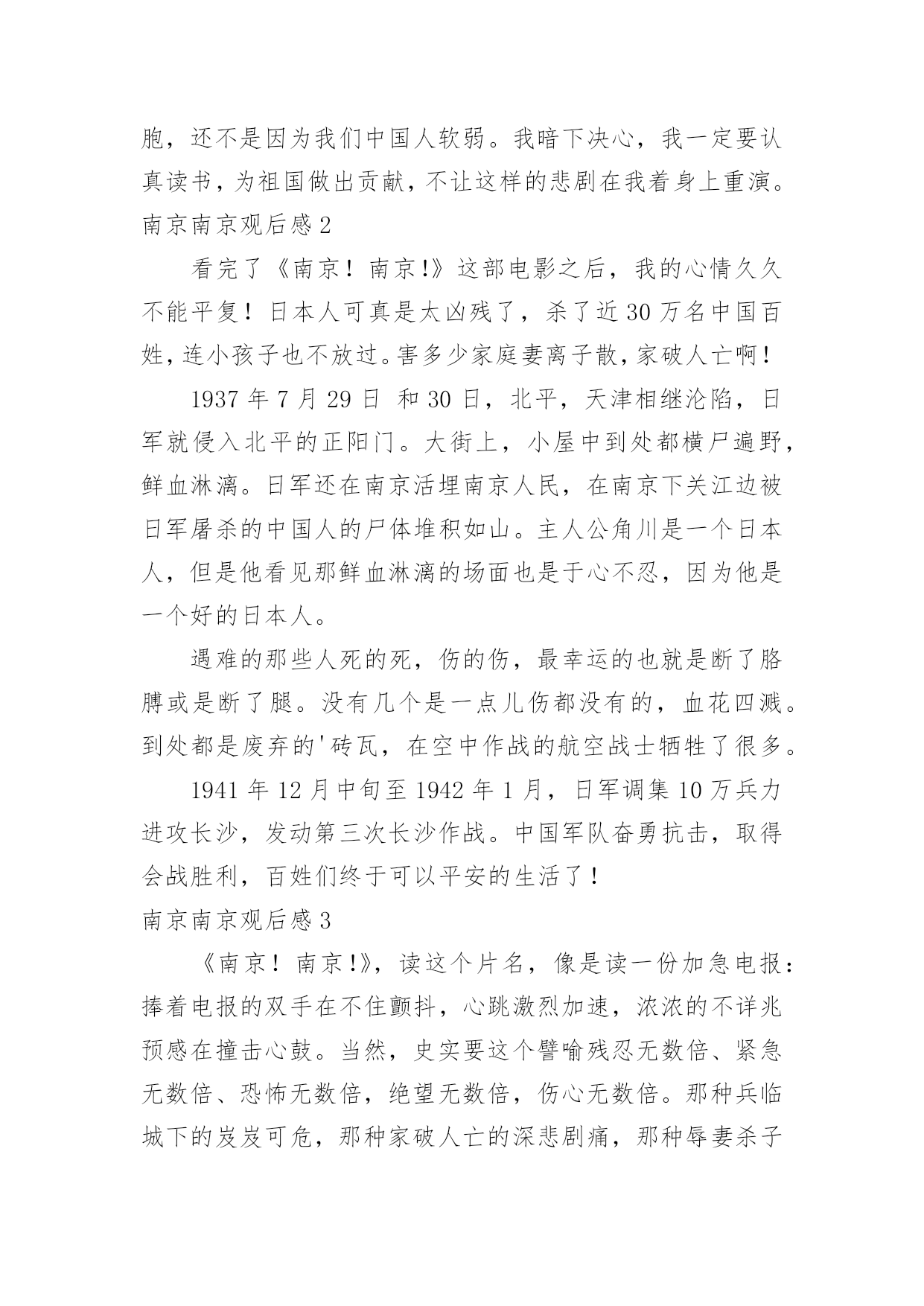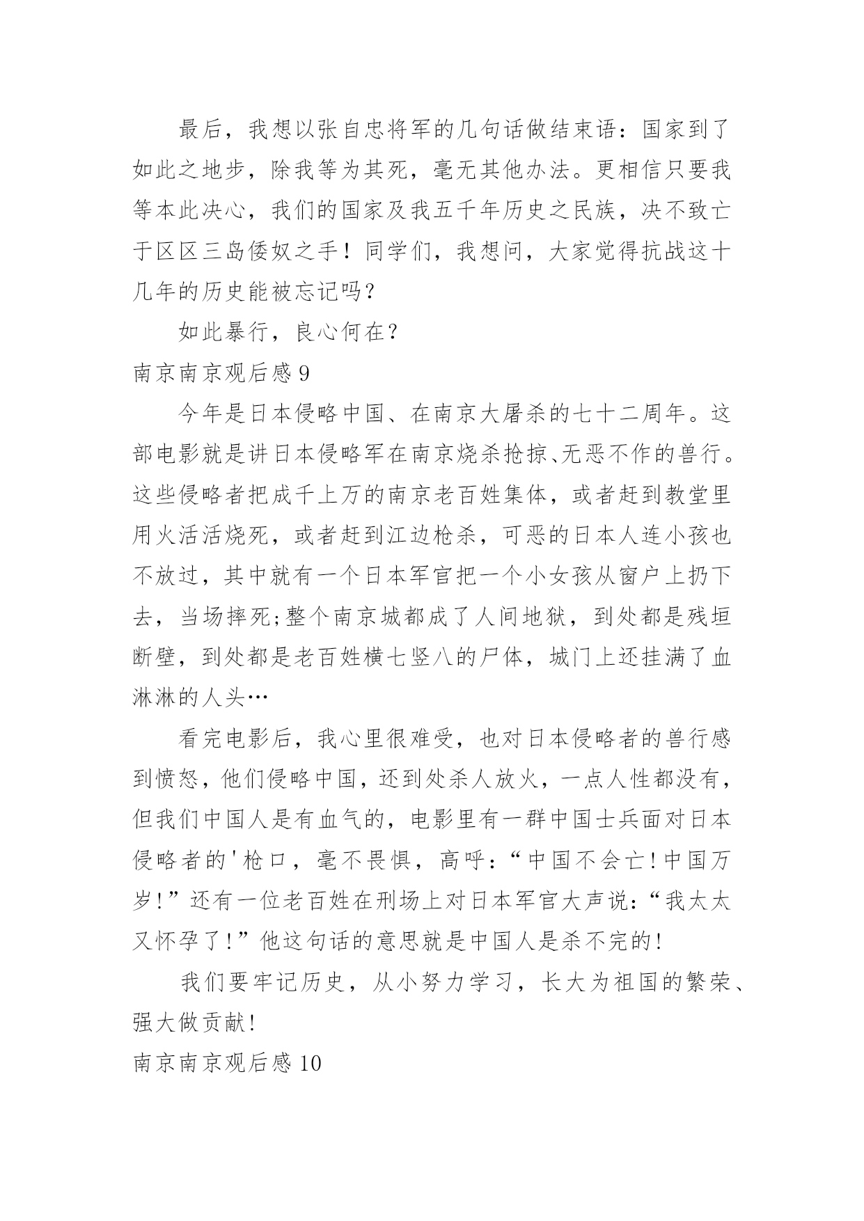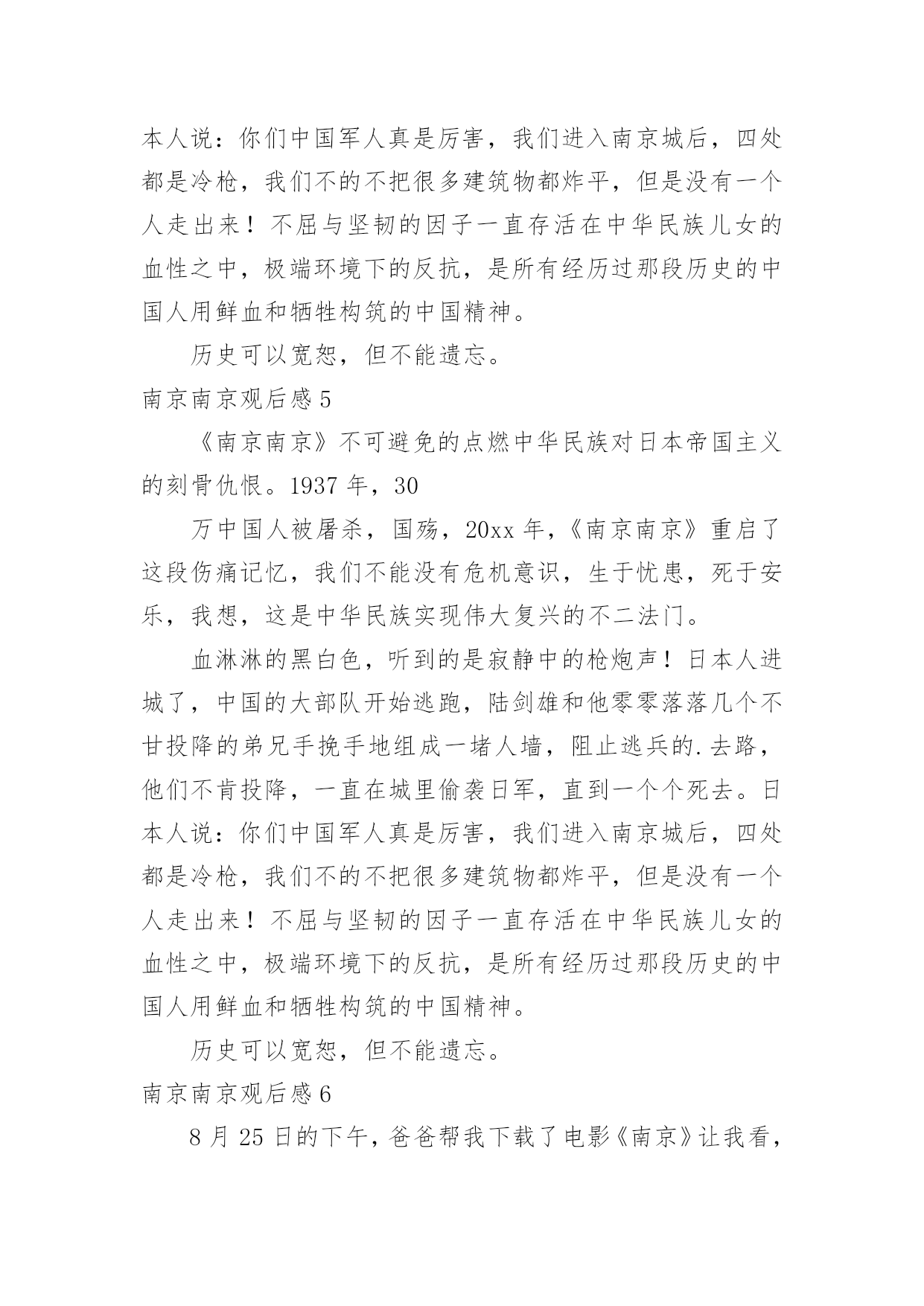 南京南京观后感南京南京观后感品味完一部作品后,相信大家的收获肯定不少吧,此时需要认真地做好记录,写写观后感了。到底应如何写观后感呢?下面是小编精心整理的南京南京观后感,仅供参考,希望能够帮助到大家。南京南京观后感1今天,我们整个四年级去四楼多功能厅观看了《南京》这部电影,看完这部电影,我的心久久不能平静,愤怒的火在胸中燃烧。电影主要讲日本人企图吞并中国的领土,弄的中国人不得安宁,日本人还在那里犯下了滔天大罪。他们不但杀了大人,就连刚刚来到世界的小生命都不放过。他们见人就杀,杀人不眨眼。他们为了自己开心杀人,不开心也杀人,把杀人当作一种游戏来娱乐。我对日本法西斯的兽行真是恨之入骨。我们要严厉批评日本人那些残酷的行为呀!一下子就牺牲了中国几十万同胞,其实,我们不但要斥责日本人,还要斥责那些残酷的.行为。想到那位记者那么勇敢,而我们连上学都要父母送,睡觉都要父母陪,我们简直太幸福了。老师告诉我们,我们是祖国的花朵,祖国新的希望,老师让我们好好读书,日本人为什么能杀害我们那么多中国同胞,还不是因为我们中国人软弱。我暗下决心,我一定要认真读书,为祖国做出贡献,不让这样的悲剧在我着身上重演。南京南京观后感2看完了《南京!南京!》这部电影之后,我的心情久久不能平复!日本人可真是太凶残了,杀了近30万名中国百姓,连小孩子也不放过。害多少家庭妻离子散,家破人亡啊!1937年7月29日和30日,北平,天津相继沦陷,日军就侵入北平的正阳门。大街上,小屋中到处都横尸遍野,鲜血淋漓。日军还在南京活埋南京人民,在南京下关江边被日军屠杀的中国人的尸体堆积如山。主人公角川是一个日本人,但是他看见那鲜血淋漓的场面也是于心不忍,因为他是一个好的日本人。遇难的那些人死的死,伤的伤,最幸运的也就是断了胳膊或是断了腿。没有几个是一点儿伤都没有的,血花四溅。到处都是废弃的'砖瓦,在空中作战的航空战士牺牲了很多。1941年12月中旬至1942年1月,日军调集10万兵力进攻长沙,发动第三次长沙作战。中国军队奋勇抗击,取得会战胜利,百姓们终于可以平安的生活了!南京南京观后感3《南京!南京!》,读这个片名,像是读一份加急电报:捧着电报的双手在不住颤抖,心跳激烈加速,浓浓的不详兆预感在撞击心鼓。当然,史实要这个譬喻残忍无数倍、紧急无数倍、恐怖无数倍,绝望无数倍,伤心无数倍。那种兵临城下的岌岌可危,那种家破人亡的深悲剧痛,那种辱妻杀子的`莫大污耻,那种朝不保夕的极度忧惴,那种茫无涯际的杳渺切盼……是今人尽最大所能仍无法完全感受的。今人能做的是,静静坐在影院里重温记忆,劳劳记住曾经的腥风血雨,时时鞭策己身以国难家仇……果真,这是一部叫人倍感沉重的影片。黑白的胶片、剧烈抖动的镜头,增强了影片的真实感。你安静地坐在放映室的角落里,阴郁的氛围立刻席卷全身,将你拉回七十二年前那惨绝人寰的争战里头,然后你开始了观影之旅,因为身临其境的错觉,你随着片中的人物(中国百姓们)一起紧促呼吸、心惊胆战、悲痛哀凄。日军面对古城墙惊呼时,尚有一丝民族自豪感,但是眨眼间,随着震天动地的炮响,美好的感觉飞灰湮灭,转而为死亡逼近的惊恐不安占据。这是影片带给观众的,其实更是惨痛的历史留下的不灭印记。南京南京观后感4《南京南京》不可避免的点燃中华民族对日本帝国主义的刻骨仇恨。1937年,30万中国人被屠杀,国殇,20xx年,《南京南京》重启了这段伤痛记忆,我们不能没有危机意识,生于忧患,死于安乐,我想,这是中华民族实现伟大复兴的不二法门。血淋淋的黑白色,听到的是寂静中的枪炮声!日本人进城了,中国的`大部队开始逃跑,陆剑雄和他零零落落几个不甘投降的弟兄手挽手地组成一堵人墙,阻止逃兵的去路,他们不肯投降,一直在城里偷袭日军,直到一个个死去。日本人说:你们中国军人真是厉害,我们进入南京城后,四处都是冷枪,我们不的不把很多建筑物都炸平,但是没有一个人走出来!不屈与坚韧的因子一直存活在中华民族儿女的血性之中,极端环境下的反抗,是所有经历过那段历史的中国人用鲜血和牺牲构筑的中国精神。历史可以宽恕,但不能遗忘。南京南京观后感5《南京南京》不可避免的点燃中华民族对日本帝国主义的刻骨仇恨。1937年,30万中国人被屠杀,国殇,20xx年,《南京南京》重启了这段伤痛记忆,我们不能没有危机意识,生于忧患,死于安乐,我想,这是中华民族实现伟大复兴的不二法门。血淋淋的黑白色,听到的是寂静中的枪炮声!日本人进城了,中国的大部队开始逃跑,陆剑雄和他零零落落几个不甘投降的弟兄手挽手地组成一堵人墙,阻止逃兵的.去路,他们不肯投降,一直在城里偷袭日军,直到一个个死去。日本人说:你们中国军人真是厉害,我们进入南京城后,四处都是冷枪,我们不的不把很多建筑物都炸平,但是没有一个人走出来!不屈与坚韧的因子一直存活在中华民族儿女的血性之中,极端环境下的反抗,