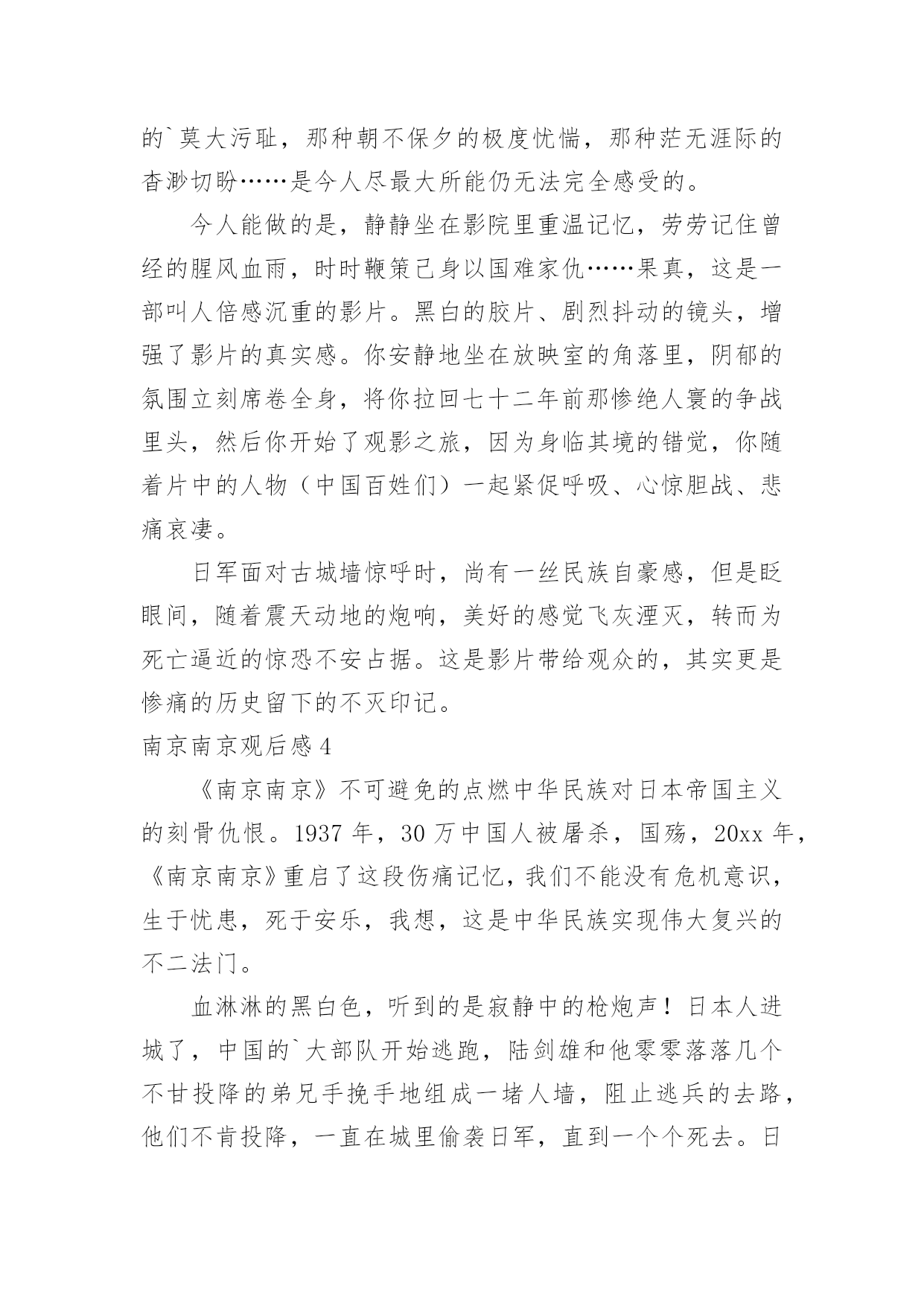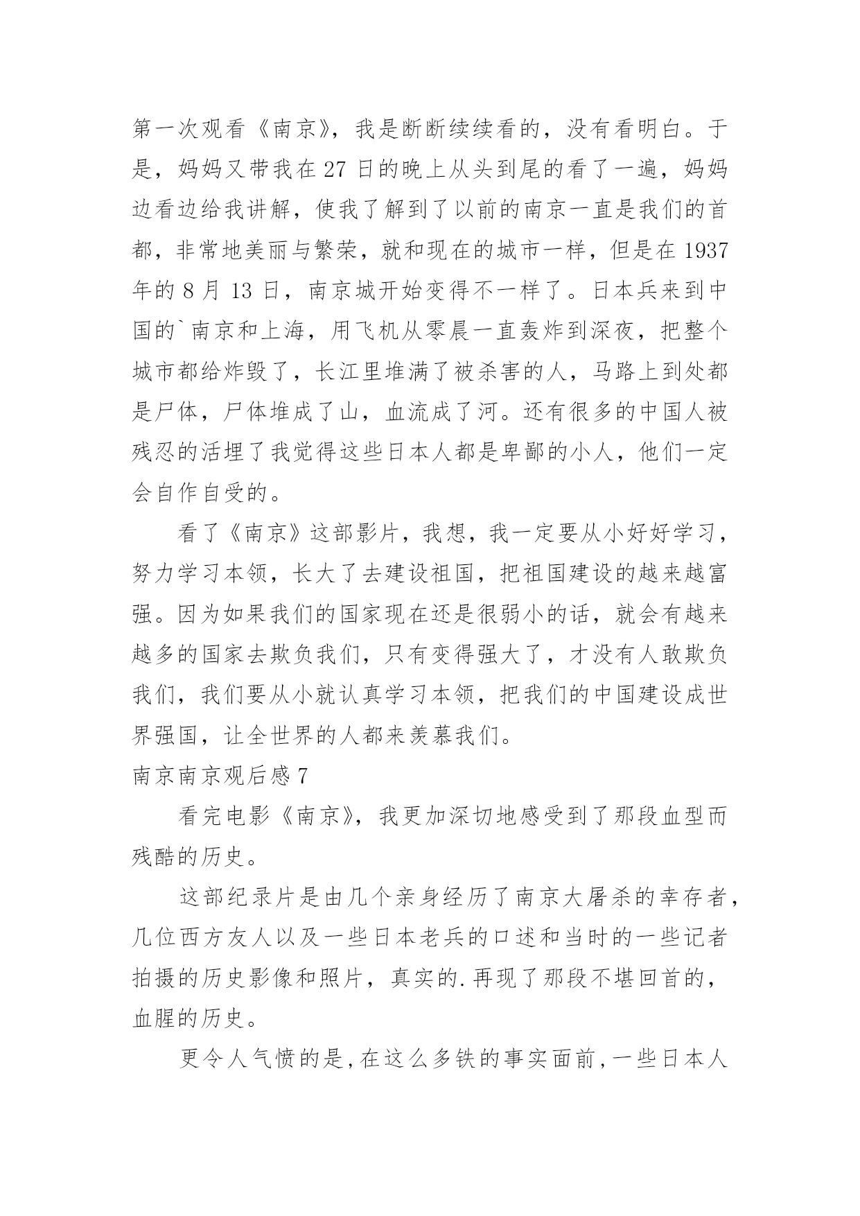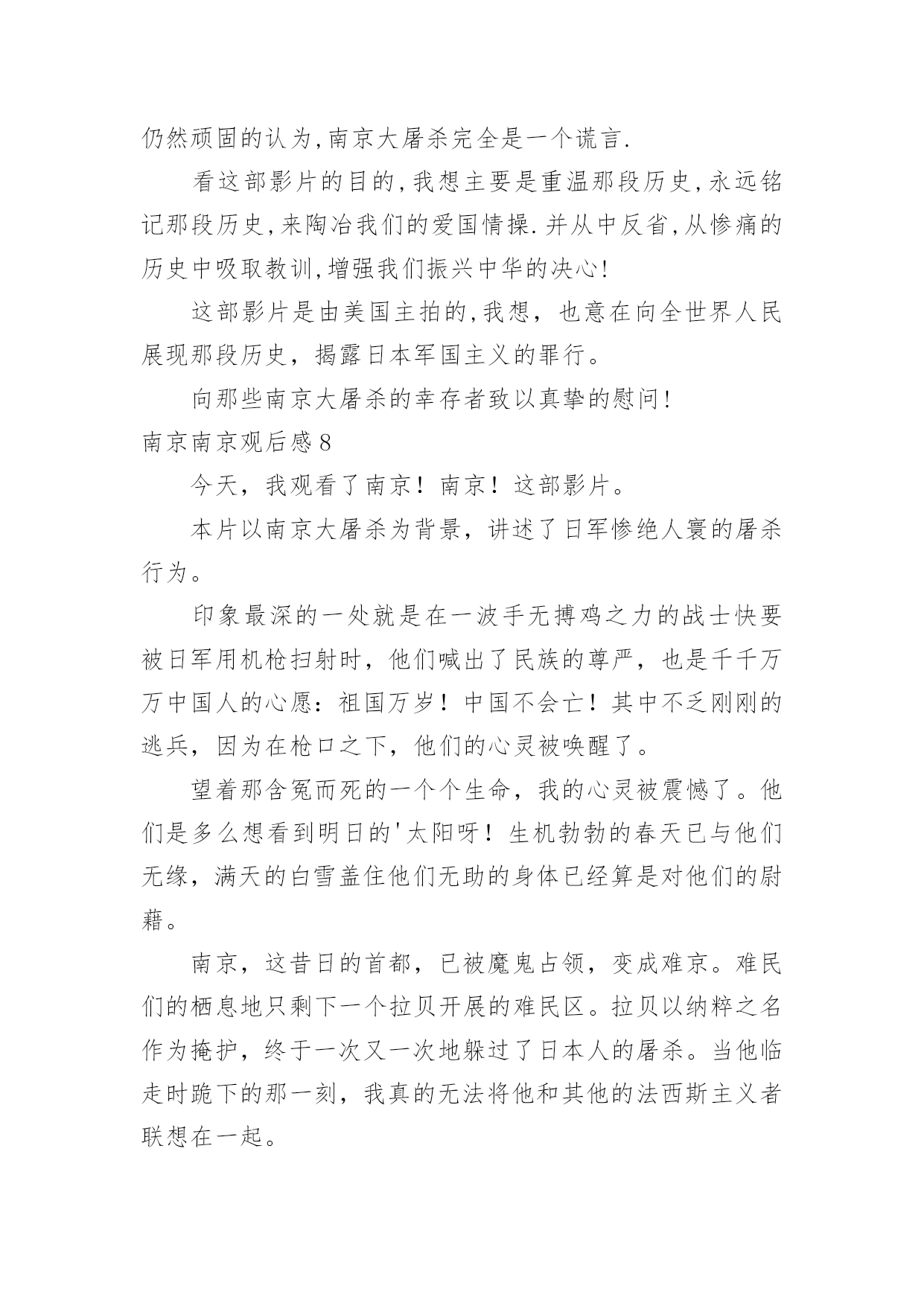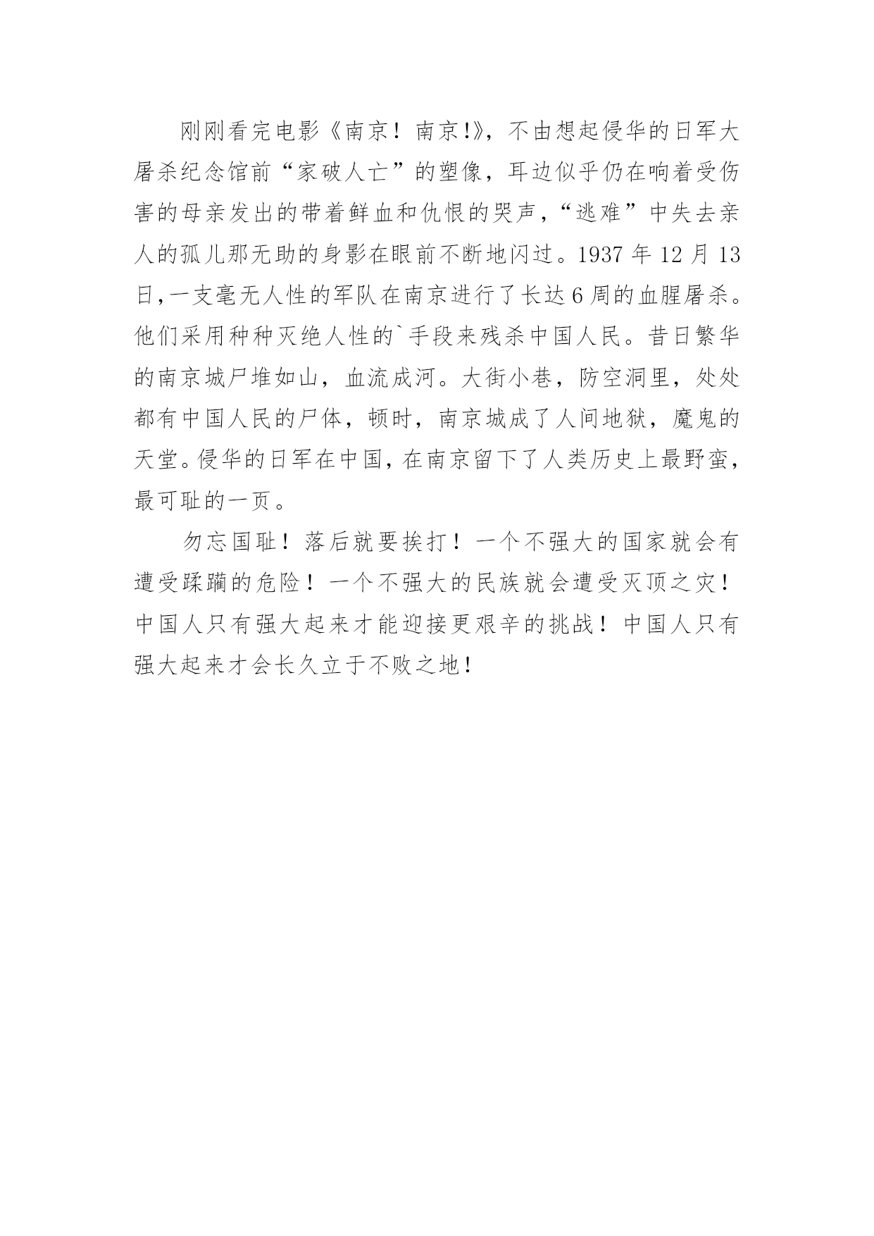 南京南京观后感南京南京观后感品味完一部作品后,相信大家的收获肯定不少吧,此时需要认真地做好记录,写写观后感了。到底应如何写观后感呢?下面是小编精心整理的南京南京观后感,仅供参考,希望能够帮助到大家。南京南京观后感1今天,我们整个四年级去四楼多功能厅观看了《南京》这部电影,看完这部电影,我的心久久不能平静,愤怒的火在胸中燃烧。电影主要讲日本人企图吞并中国的领土,弄的中国人不得安宁,日本人还在那里犯下了滔天大罪。他们不但杀了大人,就连刚刚来到世界的小生命都不放过。他们见人就杀,杀人不眨眼。他们为了自己开心杀人,不开心也杀人,把杀人当作一种游戏来娱乐。我对日本法西斯的兽行真是恨之入骨。我们要严厉批评日本人那些残酷的行为呀!一下子就牺牲了中国几十万同胞,其实,我们不但要斥责日本人,还要斥责那些残酷的.行为。想到那位记者那么勇敢,而我们连上学都要父母送,睡觉都要父母陪,我们简直太幸福了。老师告诉我们,我们是祖国的花朵,祖国新的希望,老师让我们好好读书,日本人为什么能杀害我们那么多中国同胞,还不是因为我们中国人软弱。我暗下决心,我一定要认真读书,为祖国做出贡献,不让这样的悲剧在我着身上重演。南京南京观后感2看完了《南京!南京!》这部电影之后,我的心情久久不能平复!日本人可真是太凶残了,杀了近30万名中国百姓,连小孩子也不放过。害多少家庭妻离子散,家破人亡啊!1937年7月29日和30日,北平,天津相继沦陷,日军就侵入北平的正阳门。大街上,小屋中到处都横尸遍野,鲜血淋漓。日军还在南京活埋南京人民,在南京下关江边被日军屠杀的中国人的尸体堆积如山。主人公角川是一个日本人,但是他看见那鲜血淋漓的场面也是于心不忍,因为他是一个好的日本人。遇难的那些人死的死,伤的伤,最幸运的也就是断了胳膊或是断了腿。没有几个是一点儿伤都没有的,血花四溅。到处都是废弃的'砖瓦,在空中作战的航空战士牺牲了很多。1941年12月中旬至1942年1月,日军调集10万兵力进攻长沙,发动第三次长沙作战。中国军队奋勇抗击,取得会战胜利,百姓们终于可以平安的生活了!南京南京观后感3《南京!南京!》,读这个片名,像是读一份加急电报:捧着电报的双手在不住颤抖,心跳激烈加速,浓浓的不详兆预感在撞击心鼓。当然,史实要这个譬喻残忍无数倍、紧急无数倍、恐怖无数倍,绝望无数倍,伤心无数倍。那种兵临城下的岌岌可危,那种家破人亡的深悲剧痛,那种辱妻杀子的`莫大污耻,那种朝不保夕的极度忧惴,那种茫无涯际的杳渺切盼……是今人尽最大所能仍无法完全感受的。今人能做的是,静静坐在影院里重温记忆,劳劳记住曾经的腥风血雨,时时鞭策己身以国难家仇……果真,这是一部叫人倍感沉重的影片。黑白的胶片、剧烈抖动的镜头,增强了影片的真实感。你安静地坐在放映室的角落里,阴郁的氛围立刻席卷全身,将你拉回七十二年前那惨绝人寰的争战里头,然后你开始了观影之旅,因为身临其境的错觉,你随着片中的人物(中国百姓们)一起紧促呼吸、心惊胆战、悲痛哀凄。日军面对古城墙惊呼时,尚有一丝民族自豪感,但是眨眼间,随着震天动地的炮响,美好的感觉飞灰湮灭,转而为死亡逼近的惊恐不安占据。这是影片带给观众的,其实更是惨痛的历史留下的不灭印记。南京南京观后感4《南京南京》不可避免的点燃中华民族对日本帝国主义的刻骨仇恨。1937年,30万中国人被屠杀,国殇,20xx年,《南京南京》重启了这段伤痛记忆,我们不能没有危机意识,生于忧患,死于安乐,我想,这是中华民族实现伟大复兴的不二法门。血淋淋的黑白色,听到的是寂静中的枪炮声!日本人进城了,中国的`大部队开始逃跑,陆剑雄和他零零落落几个不甘投降的弟兄手挽手地组成一堵人墙,阻止逃兵的去路,他们不肯投降,一直在城里偷袭日军,直到一个个死去。日本人说:你们中国军人真是厉害,我们进入南京城后,四处都是冷枪,我们不的不把很多建筑物都炸平,但是没有一个人走出来!不屈与坚韧的因子一直存活在中华民族儿女的血性之中,极端环境下的反抗,是所有经历过那段历史的中国人用鲜血和牺牲构筑的中国精神。历史可以宽恕,但不能遗忘。南京南京观后感5《南京南京》不可避免的点燃中华民族对日本帝国主义的刻骨仇恨。1937年,30万中国人被屠杀,国殇,20xx年,《南京南京》重启了这段伤痛记忆,我们不能没有危机意识,生于忧患,死于安乐,我想,这是中华民族实现伟大复兴的不二法门。血淋淋的黑白色,听到的是寂静中的枪炮声!日本人进城了,中国的大部队开始逃跑,陆剑雄和他零零落落几个不甘投降的弟兄手挽手地组成一堵人墙,阻止逃兵的.去路,他们不肯投降,一直在城里偷袭日军,直到一个个死去。日本人说:你们中国军人真是厉害,我们进入南京城后,四处都是冷枪,我们不的不把很多建筑物都炸平,但是没有一个人走出来!不屈与坚韧的因子一直存活在中华民族儿女的血性之中,极端环境下的反抗,