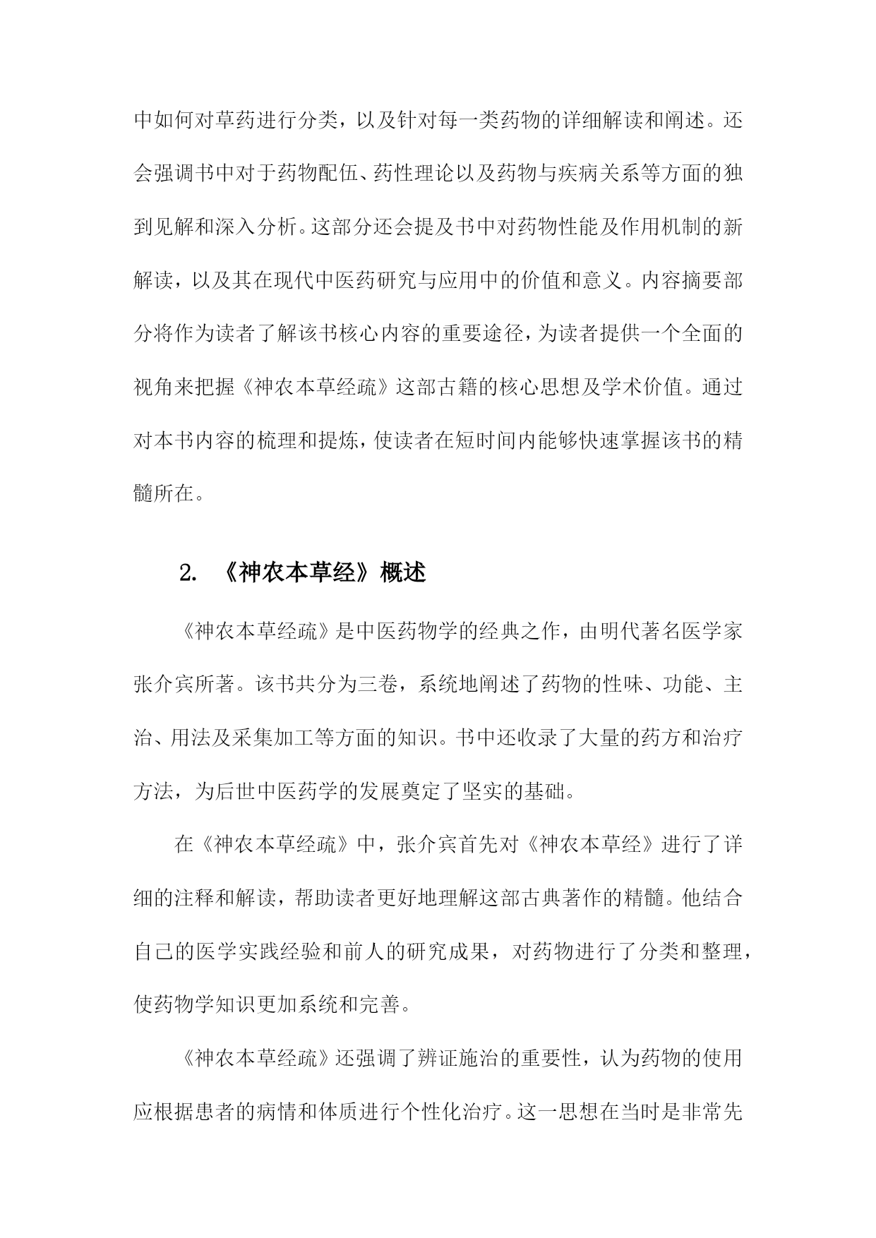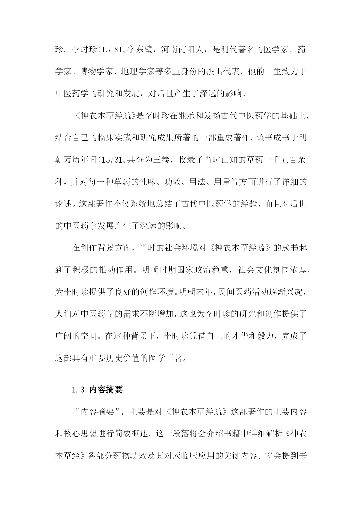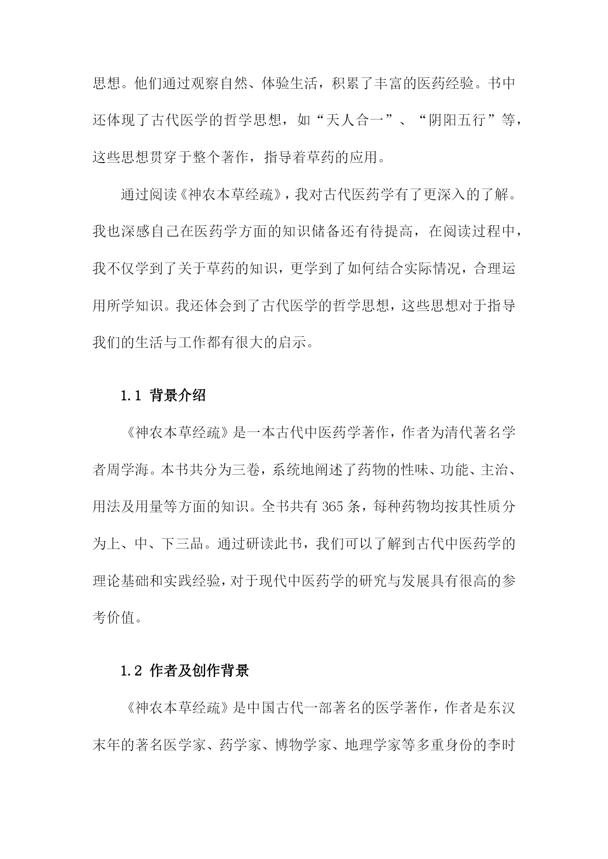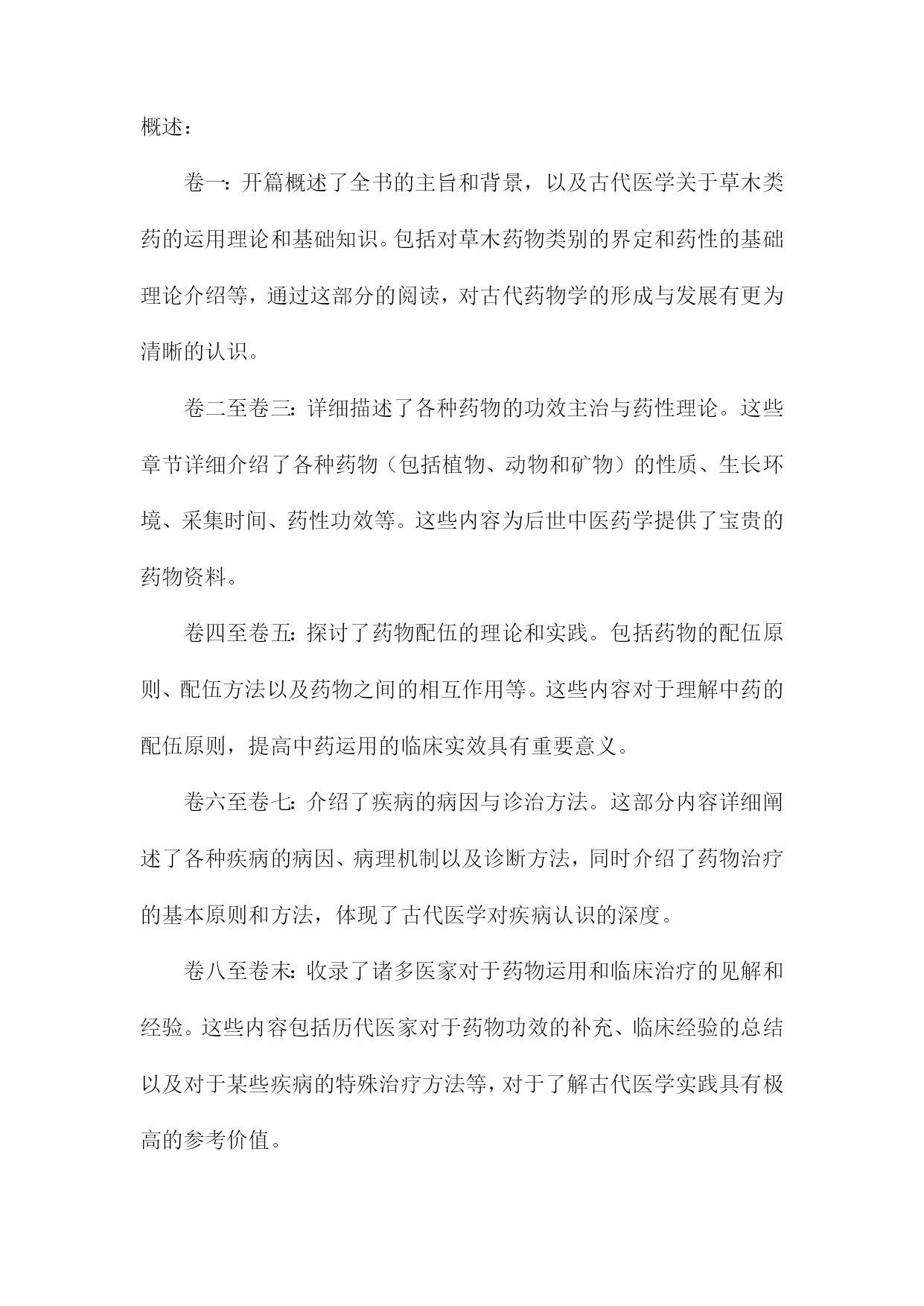 《神农本草经疏》读书笔记1.内容描述在开始阅读《神农本草经疏》这部经典著作之前,我对其背景、作者及其历史地位有了一定的了解。作为中国古代医学的经典之作,它集结了古代医药学家的智慧与经验,为我们揭示了古代对于草药及药物应用的独特见解。在阅读过程中,我深感这部著作不仅仅是对草药的分类与描述,更是对古代医学哲学思想的体现。《神农本草经疏》的内容极为丰富,涉及大量的草药及其疗效的描述。我对每一章节进行了细致的阅读与理解,全书按照草药的性质、功效及应用进行分类,详细介绍了各种草药的生长环境、采集时节、药性、功效及主治病症。书中还对一些草药的配伍、炮制及使用方法进行了阐述。在阅读过程中,我特别关注了书中强调的草药的药性及其临床应用。对于某些常见草药如人参、黄芪、当归等,书中不仅有详细的描述,还有其独特的见解与应用方法。通过对这些内容的解读,我逐渐认识到,草药的应用不仅仅是对其药性的理解,更重要的是结合患者的实际情况,进行合理的配伍与应用。在阅读《神农本草经疏》我深深体会到了古代医药学家的智慧与思想。他们通过观察自然、体验生活,积累了丰富的医药经验。书中还体现了古代医学的哲学思想,如“天人合一”、“阴阳五行”等,这些思想贯穿于整个著作,指导着草药的应用。通过阅读《神农本草经疏》,我对古代医药学有了更深入的了解。我也深感自己在医药学方面的知识储备还有待提高,在阅读过程中,我不仅学到了关于草药的知识,更学到了如何结合实际情况,合理运用所学知识。我还体会到了古代医学的哲学思想,这些思想对于指导我们的生活与工作都有很大的启示。1.1背景介绍《神农本草经疏》是一本古代中医药学著作,作者为清代著名学者周学海。本书共分为三卷,系统地阐述了药物的性味、功能、主治、用法及用量等方面的知识。全书共有365条,每种药物均按其性质分为上、中、下三品。通过研读此书,我们可以了解到古代中医药学的理论基础和实践经验,对于现代中医药学的研究与发展具有很高的参考价值。1.2作者及创作背景《神农本草经疏》是中国古代一部著名的医学著作,作者是东汉末年的著名医学家、药学家、博物学家、地理学家等多重身份的李时珍。李时珍(15181,字东璧,河南南阳人,是明代著名的医学家、药学家、博物学家、地理学家等多重身份的杰出代表。他的一生致力于中医药学的研究和发展,对后世产生了深远的影响。《神农本草经疏》是李时珍在继承和发扬古代中医药学的基础上,结合自己的临床实践和研究成果所著的一部重要著作。该书成书于明朝万历年间(15731,共分为三卷,收录了当时已知的草药一千五百余种,并对每一种草药的性味、功效、用法、用量等方面进行了详细的论述。这部著作不仅系统地总结了古代中医药学的经验,而且对后世的中医药学发展产生了深远的影响。在创作背景方面,当时的社会环境对《神农本草经疏》的成书起到了积极的推动作用。明朝时期国家政治稳重,社会文化氛围浓厚,为李时珍提供了良好的创作环境。明朝末年,民间医药活动逐渐兴起,人们对中医药学的需求不断增加,这也为李时珍的研究和创作提供了广阔的空间。在这种背景下,李时珍凭借自己的才华和毅力,完成了这部具有重要历史价值的医学巨著。1.3内容摘要“内容摘要”,主要是对《神农本草经疏》这部著作的主要内容和核心思想进行简要概述。这一段落将会介绍书籍中详细解析《神农本草经》各部分药物功效及其对应临床应用的关键内容。将会提到书中如何对草药进行分类,以及针对每一类药物的详细解读和阐述。还会强调书中对于药物配伍、药性理论以及药物与疾病关系等方面的独到见解和深入分析。这部分还会提及书中对药物性能及作用机制的新解读,以及其在现代中医药研究与应用中的价值和意义。内容摘要部分将作为读者了解该书核心内容的重要途径,为读者提供一个全面的视角来把握《神农本草经疏》这部古籍的核心思想及学术价值。通过对本书内容的梳理和提炼,使读者在短时间内能够快速掌握该书的精髓所在。2.《神农本草经》概述《神农本草经疏》是中医药物学的经典之作,由明代著名医学家张介宾所著。该书共分为三卷,系统地阐述了药物的性味、功能、主治、用法及采集加工等方面的知识。书中还收录了大量的药方和治疗方法,为后世中医药学的发展奠定了坚实的基础。在《神农本草经疏》中,张介宾首先对《神农本草经》进行了详细的注释和解读,帮助读者更好地理解这部古典著作的精髓。他结合自己的医学实践经验和前人的研究成果,对药物进行了分类和整理,使药物学知识更加系统和完善。《神农本草经疏》还强调了辨证施治的重要性,认为药物的使用应根据患者的病情和体质进行个性化治疗。这一思想在当时是非常先进的,对后世的中医临床实践产生了深远的影响。《神农本草经疏》是一部具有很高学术价值的中药学著作,对于学习中医药物学、了解中医临床实践以及研究中医药学史都具有重要