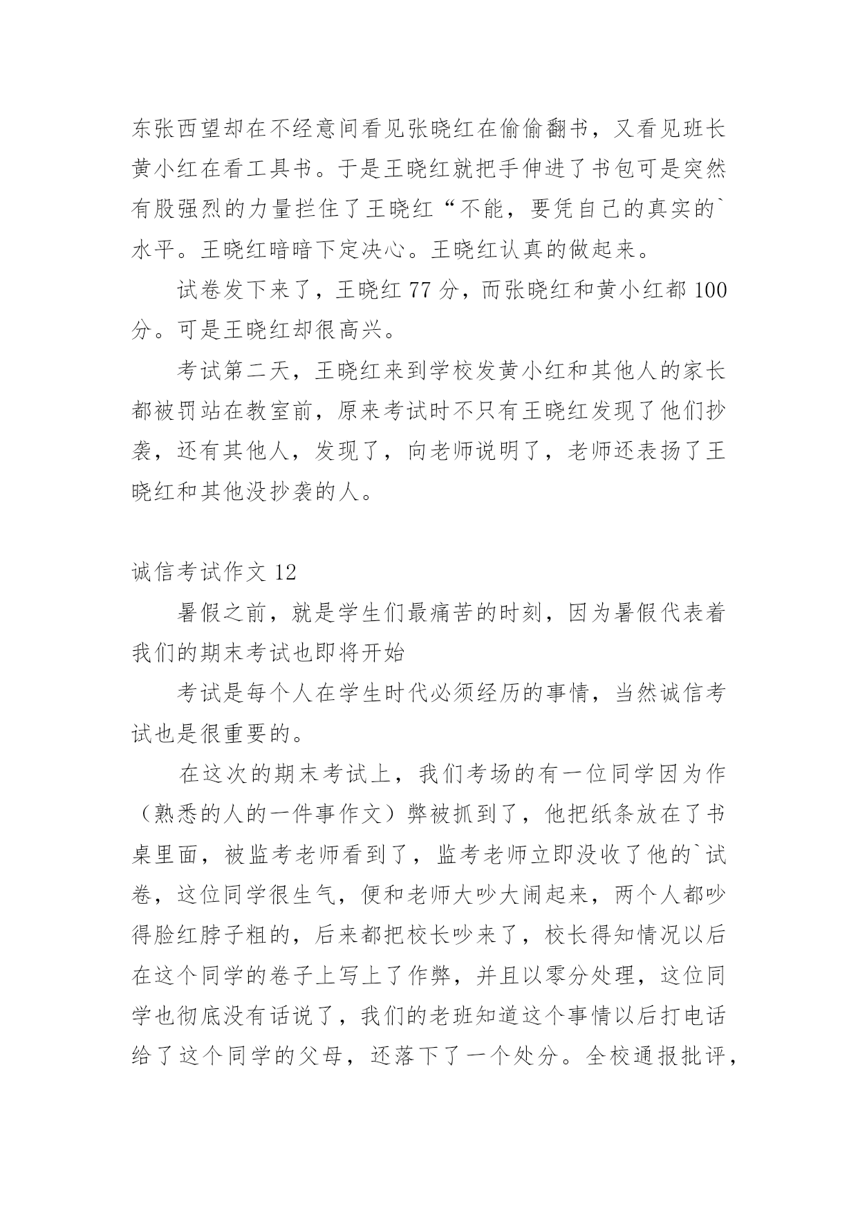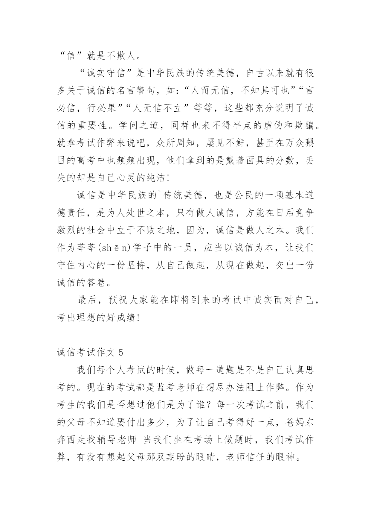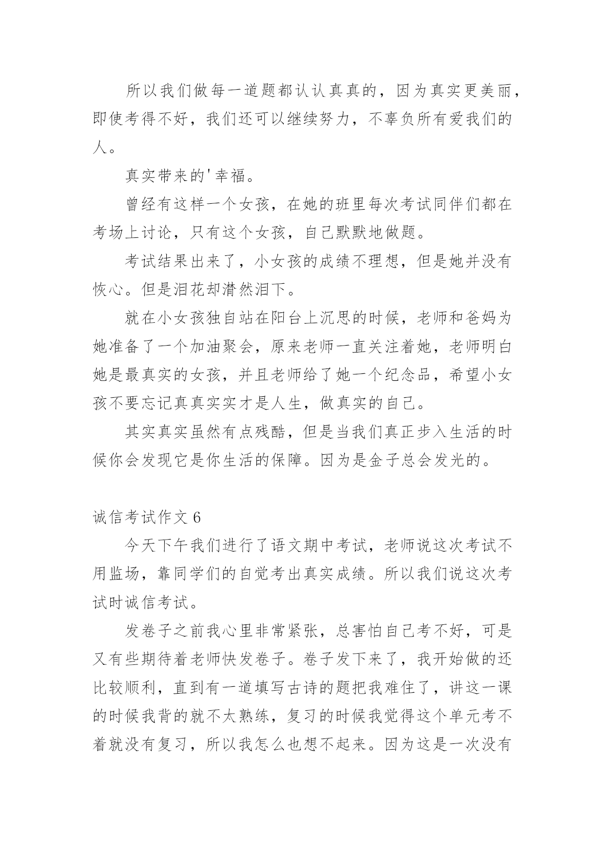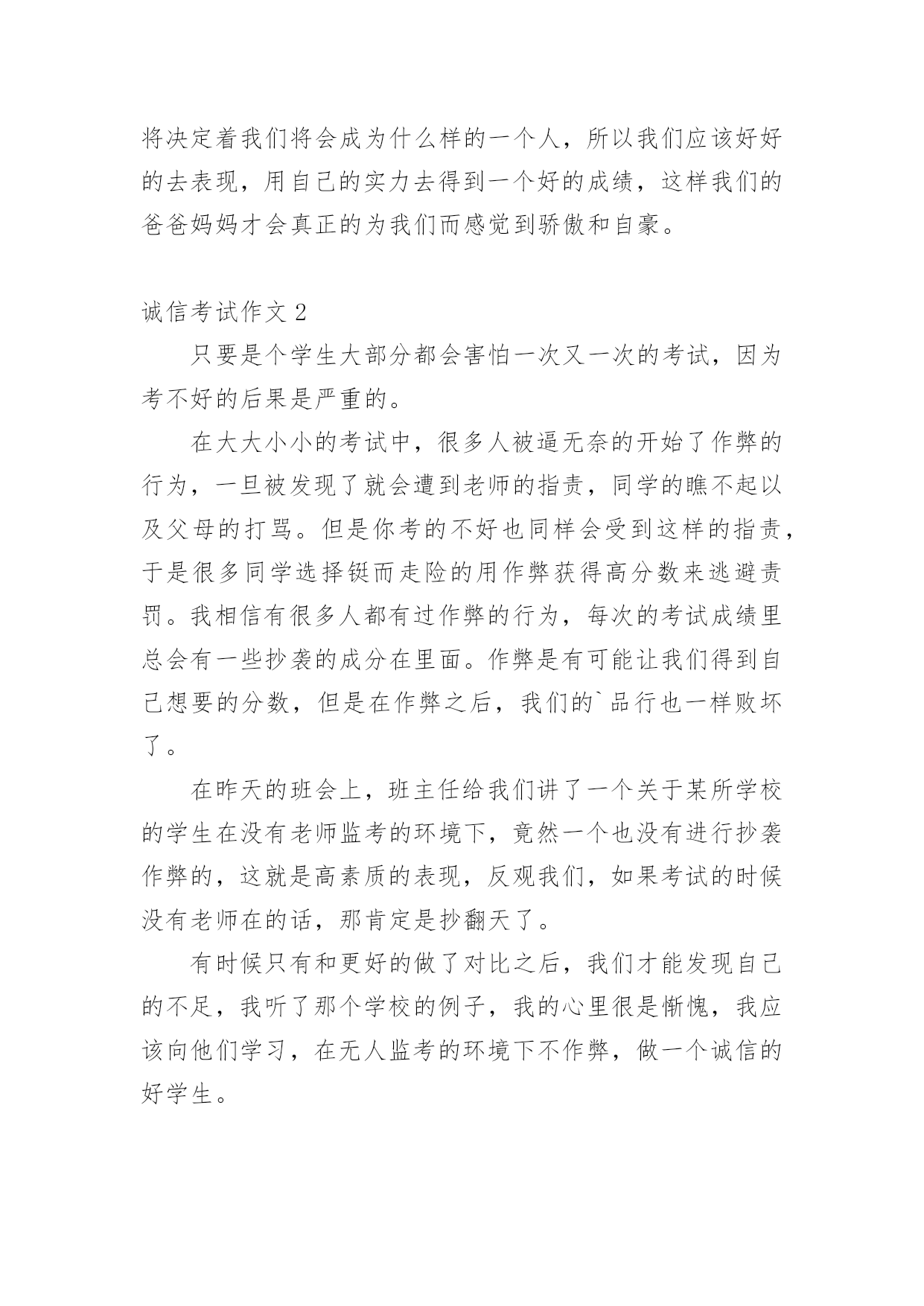 诚信考试作文在学习、工作或生活中,大家都不可避免地会接触到作文吧,借助作文人们可以实现文化交流的目的。还是对作文一筹莫展吗?以下是小编收集整理的诚信考试作文,仅供参考,希望能够帮助到大家。诚信考试作文1过几天就是一个学期一次的期中考试了,大家都摩拳擦掌为这次考试做足了准备,所有的人都非常的重视着这一次的考试,因为在这次考试以后,我们的班级要召开一次家长会。大家都很害怕老师们会向我们的家长告状,所以我们大家都表现得非常的用功和努力。但是我的有一些同学却不喜欢脚踏实地的去好好的复习,而是想要通过一些小手段小伎俩来获得一个好的成绩,这是一件非常的不诚信的事情,我们绝对要去杜绝这样的事情在我们的校园里面发生。往小的说这是一种不诚信的行为,它反映着一个人的品格,往大了说这是一种违纪的行为,刘备说过“勿以恶小而为之,勿以善小而不为”可见这样的小事情将有可能演变成大的事件。还有一句俗话也说得好,小时候偷针大时偷金,虽然在学校里作弊只是一种不怎么严重的行为但是我们也应该要去引起我们的重视。诚信对于我们每一个来说都是非常的.重要的,因为它将决定着我们将会成为什么样的一个人,所以我们应该好好的去表现,用自己的实力去得到一个好的成绩,这样我们的爸爸妈妈才会真正的为我们而感觉到骄傲和自豪。诚信考试作文2只要是个学生大部分都会害怕一次又一次的考试,因为考不好的后果是严重的。在大大小小的考试中,很多人被逼无奈的开始了作弊的行为,一旦被发现了就会遭到老师的指责,同学的瞧不起以及父母的打骂。但是你考的不好也同样会受到这样的指责,于是很多同学选择铤而走险的用作弊获得高分数来逃避责罚。我相信有很多人都有过作弊的行为,每次的考试成绩里总会有一些抄袭的成分在里面。作弊是有可能让我们得到自己想要的分数,但是在作弊之后,我们的`品行也一样败坏了。在昨天的班会上,班主任给我们讲了一个关于某所学校的学生在没有老师监考的环境下,竟然一个也没有进行抄袭作弊的,这就是高素质的表现,反观我们,如果考试的时候没有老师在的话,那肯定是抄翻天了。有时候只有和更好的做了对比之后,我们才能发现自己的不足,我听了那个学校的例子,我的心里很是惭愧,我应该向他们学习,在无人监考的环境下不作弊,做一个诚信的好学生。诚信考试作文3今天下午,语文期中考试,也是诚信考试,无人监厂。老师说:“期中考试的时间是100分钟,谁要是管不住抄别人的就和我去办公室吧,那里有老师看,谁要是想去,就别签自己的名子。”最后,每位同学都写上了名字。诚信考试开始了,我们细细地做着卷子。过了一会儿,主任来到我们班进行了拍照,我们头也不抬的'写着作业。突然,有一道题难到了我,我左顾右想怎么也想不起来,过了一会儿我想起来老师说的,考试的时候一定要冷静。我更认真的想那一道题,这时候我想起了答案,我就马上写了起来。不知不觉卷子写完了,我就想把卷子往抽屉里放,想去读书。可是,我想起老师说的一句话,做完卷子一定要认真检查,我就开始检查起来。突然,我发现一个音调写错了,别看它小,也会扣分的,我就马上改正了过来。通过这次无人监考,可以放松,也可以让我们做到诚实守信。诚信考试作文4尊敬的老师,亲爱的同学们:大家好!今天我国旗下演讲的题目是“诚信做人,诚信考试”。时光飞逝,不经意间,本学期的学习已被时间消逝了一半,我们迎来了期中考试。自古以来,考场上少不了的二字,便是诚信。读书人都是以节操为本,以诚信为基。通俗的讲,“诚”就是不自欺,“信”就是不欺人。“诚实守信”是中华民族的传统美德,自古以来就有很多关于诚信的名言警句,如:“人而无信,不知其可也”“言必信,行必果”“人无信不立”等等,这些都充分说明了诚信的重要性。学问之道,同样也来不得半点的虚伪和欺骗。就拿考试作弊来说吧,众所周知,屡见不鲜,甚至在万众瞩目的高考中也频频出现,他们拿到的是戴着面具的分数,丢失的却是自己心灵的纯洁!诚信是中华民族的`传统美德,也是公民的一项基本道德责任,是为人处世之本,只有做人诚信,方能在日后竞争激烈的社会中立于不败之地,因为,诚信是做人之本。我们作为莘莘(shēn)学子中的一员,应当以诚信为本,让我们守住内心的一份坚持,从自己做起,从现在做起,交出一份诚信的答卷。最后,预祝大家能在即将到来的考试中诚实面对自己,考出理想的好成绩!诚信考试作文5我们每个人考试的时候,做每一道题是不是自己认真思考的。现在的考试都是监考老师在想尽办法阻止作弊。作为考生的我们是否想过他们是为了谁?每一次考试之前,我们的父母不知道要付出多少,为了让自己考得好一点,爸妈东奔西走找辅导老师当我们坐在考场上做题时,我们考试作弊,有没有想起父母那双期盼的眼睛,老师信任的眼神。所以我们做每一道题都认认真真的,因为真实更美丽,即使考得不好,我们还可以继续努力,不辜负所有爱我们的人。真实带来的'幸福。曾