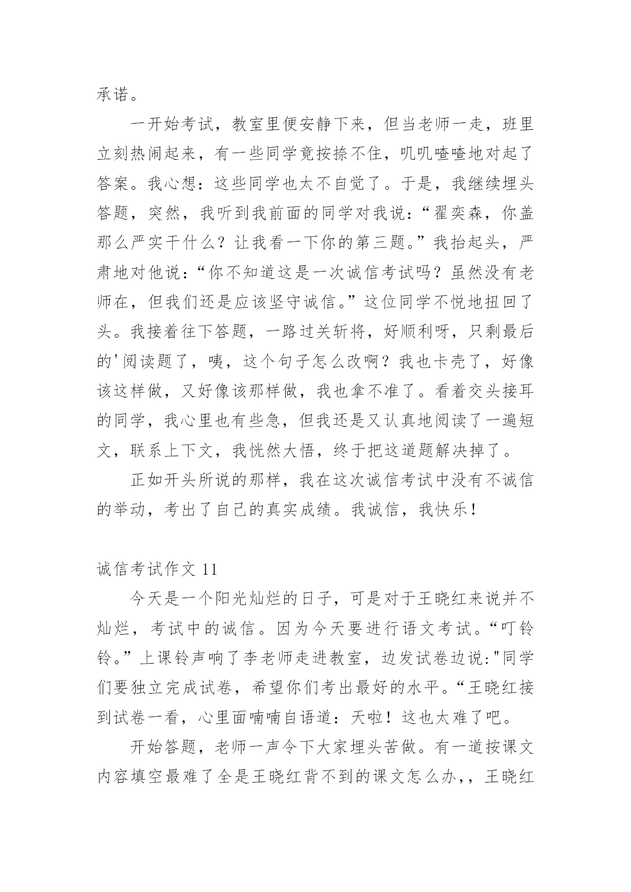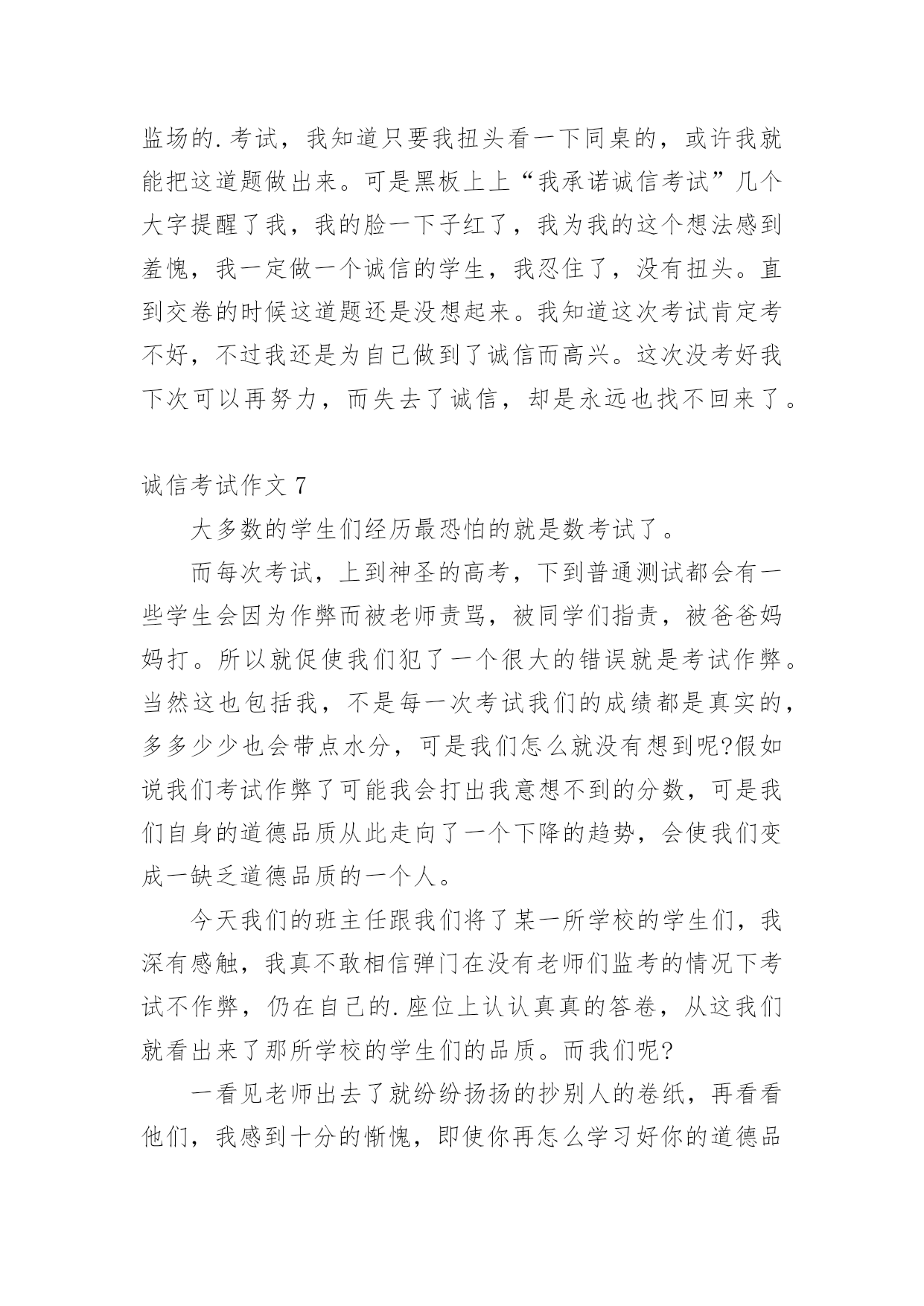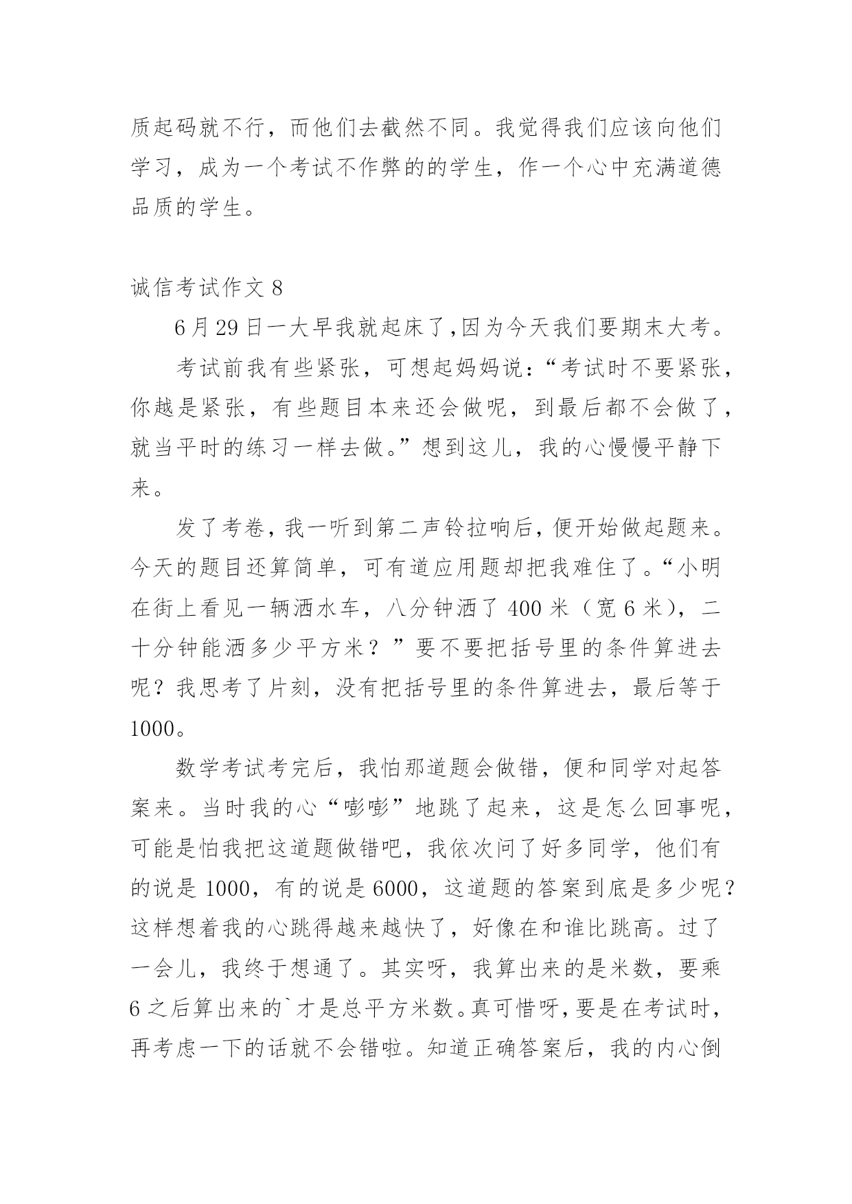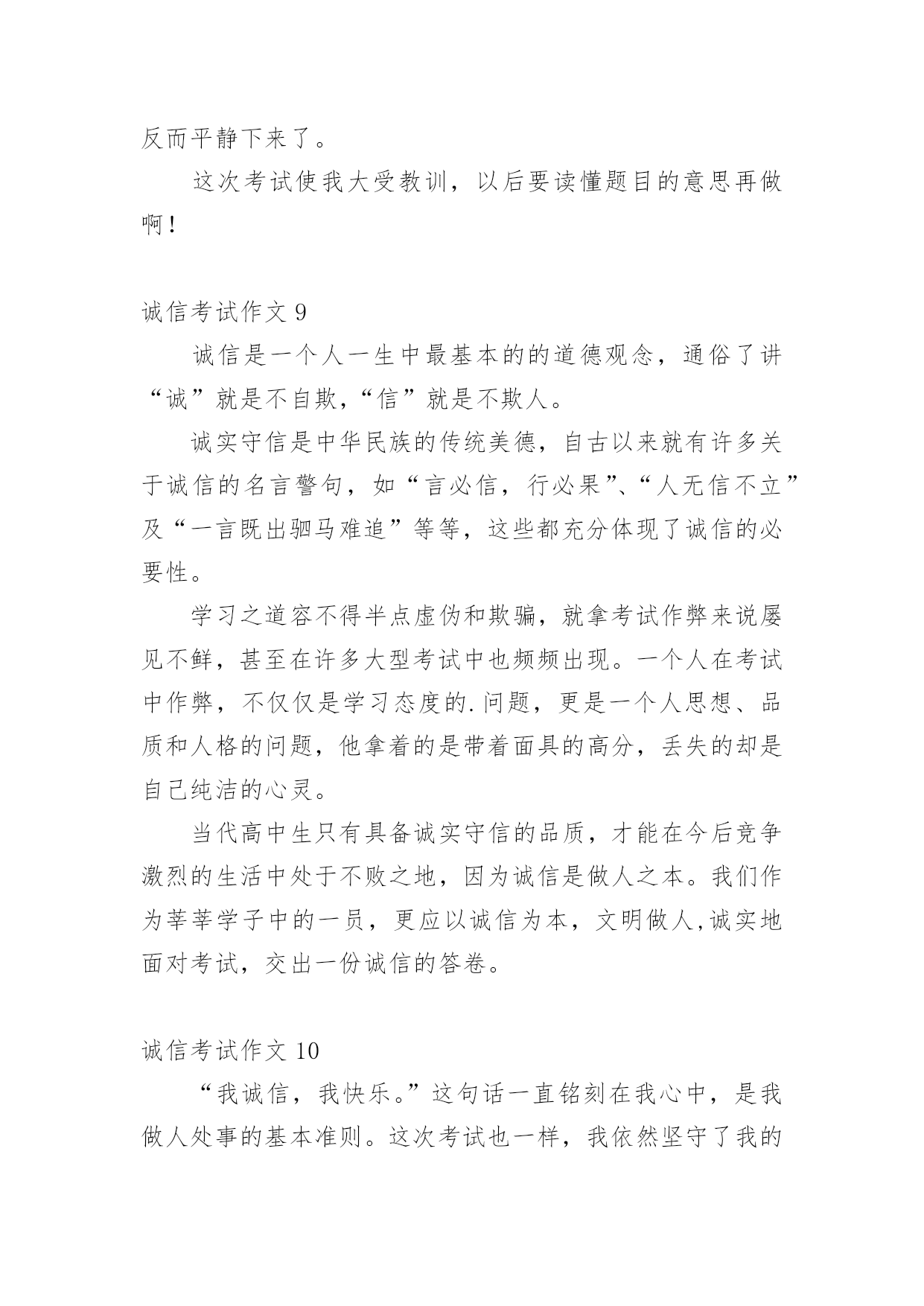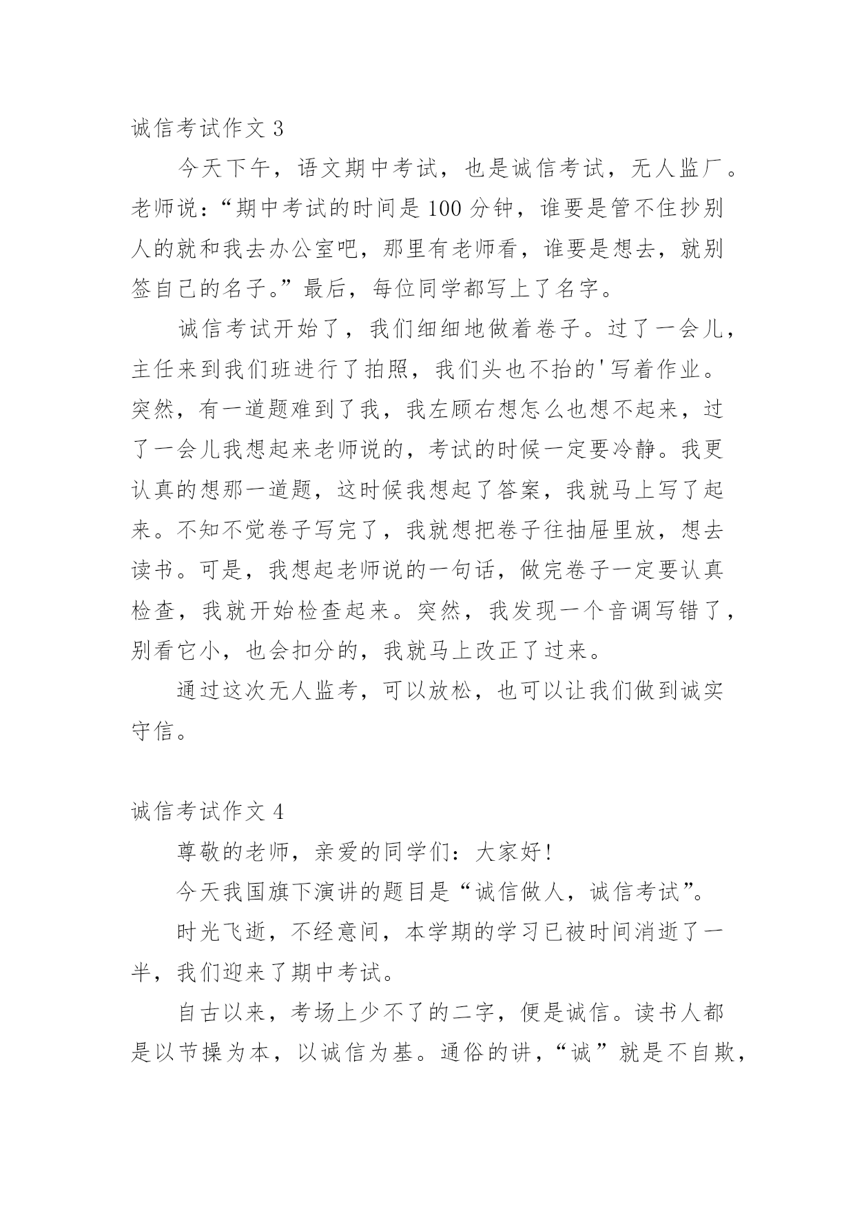 诚信考试作文在学习、工作或生活中,大家都不可避免地会接触到作文吧,借助作文人们可以实现文化交流的目的。还是对作文一筹莫展吗?以下是小编收集整理的诚信考试作文,仅供参考,希望能够帮助到大家。诚信考试作文1过几天就是一个学期一次的期中考试了,大家都摩拳擦掌为这次考试做足了准备,所有的人都非常的重视着这一次的考试,因为在这次考试以后,我们的班级要召开一次家长会。大家都很害怕老师们会向我们的家长告状,所以我们大家都表现得非常的用功和努力。但是我的有一些同学却不喜欢脚踏实地的去好好的复习,而是想要通过一些小手段小伎俩来获得一个好的成绩,这是一件非常的不诚信的事情,我们绝对要去杜绝这样的事情在我们的校园里面发生。往小的说这是一种不诚信的行为,它反映着一个人的品格,往大了说这是一种违纪的行为,刘备说过“勿以恶小而为之,勿以善小而不为”可见这样的小事情将有可能演变成大的事件。还有一句俗话也说得好,小时候偷针大时偷金,虽然在学校里作弊只是一种不怎么严重的行为但是我们也应该要去引起我们的重视。诚信对于我们每一个来说都是非常的.重要的,因为它将决定着我们将会成为什么样的一个人,所以我们应该好好的去表现,用自己的实力去得到一个好的成绩,这样我们的爸爸妈妈才会真正的为我们而感觉到骄傲和自豪。诚信考试作文2只要是个学生大部分都会害怕一次又一次的考试,因为考不好的后果是严重的。在大大小小的考试中,很多人被逼无奈的开始了作弊的行为,一旦被发现了就会遭到老师的指责,同学的瞧不起以及父母的打骂。但是你考的不好也同样会受到这样的指责,于是很多同学选择铤而走险的用作弊获得高分数来逃避责罚。我相信有很多人都有过作弊的行为,每次的考试成绩里总会有一些抄袭的成分在里面。作弊是有可能让我们得到自己想要的分数,但是在作弊之后,我们的`品行也一样败坏了。在昨天的班会上,班主任给我们讲了一个关于某所学校的学生在没有老师监考的环境下,竟然一个也没有进行抄袭作弊的,这就是高素质的表现,反观我们,如果考试的时候没有老师在的话,那肯定是抄翻天了。有时候只有和更好的做了对比之后,我们才能发现自己的不足,我听了那个学校的例子,我的心里很是惭愧,我应该向他们学习,在无人监考的环境下不作弊,做一个诚信的好学生。诚信考试作文3今天下午,语文期中考试,也是诚信考试,无人监厂。老师说:“期中考试的时间是100分钟,谁要是管不住抄别人的就和我去办公室吧,那里有老师看,谁要是想去,就别签自己的名子。”最后,每位同学都写上了名字。诚信考试开始了,我们细细地做着卷子。过了一会儿,主任来到我们班进行了拍照,我们头也不抬的'写着作业。突然,有一道题难到了我,我左顾右想怎么也想不起来,过了一会儿我想起来老师说的,考试的时候一定要冷静。我更认真的想那一道题,这时候我想起了答案,我就马上写了起来。不知不觉卷子写完了,我就想把卷子往抽屉里放,想去读书。可是,我想起老师说的一句话,做完卷子一定要认真检查,我就开始检查起来。突然,我发现一个音调写错了,别看它小,也会扣分的,我就马上改正了过来。通过这次无人监考,可以放松,也可以让我们做到诚实守信。诚信考试作文4尊敬的老师,亲爱的同学们:大家好!今天我国旗下演讲的题目是“诚信做人,诚信考试”。时光飞逝,不经意间,本学期的学习已被时间消逝了一半,我们迎来了期中考试。自古以来,考场上少不了的二字,便是诚信。读书人都是以节操为本,以诚信为基。通俗的讲,“诚”就是不自欺,“信”就是不欺人。“诚实守信”是中华民族的传统美德,自古以来就有很多关于诚信的名言警句,如:“人而无信,不知其可也”“言必信,行必果”“人无信不立”等等,这些都充分说明了诚信的重要性。学问之道,同样也来不得半点的虚伪和欺骗。就拿考试作弊来说吧,众所周知,屡见不鲜,甚至在万众瞩目的高考中也频频出现,他们拿到的是戴着面具的分数,丢失的却是自己心灵的纯洁!诚信是中华民族的`传统美德,也是公民的一项基本道德责任,是为人处世之本,只有做人诚信,方能在日后竞争激烈的社会中立于不败之地,因为,诚信是做人之本。我们作为莘莘(shēn)学子中的一员,应当以诚信为本,让我们守住内心的一份坚持,从自己做起,从现在做起,交出一份诚信的答卷。最后,预祝大家能在即将到来的考试中诚实面对自己,考出理想的好成绩!诚信考试作文5我们每个人考试的时候,做每一道题是不是自己认真思考的。现在的考试都是监考老师在想尽办法阻止作弊。作为考生的我们是否想过他们是为了谁?每一次考试之前,我们的父母不知道要付出多少,为了让自己考得好一点,爸妈东奔西走找辅导老师当我们坐在考场上做题时,我们考试作弊,有没有想起父母那双期盼的眼睛,老师信任的眼神。所以我们做每一道题都认认真真的,因为真实更美丽,即使考得不好,我们还可以继续努力,不辜负所有爱我们的人。真实带来的'幸福。曾