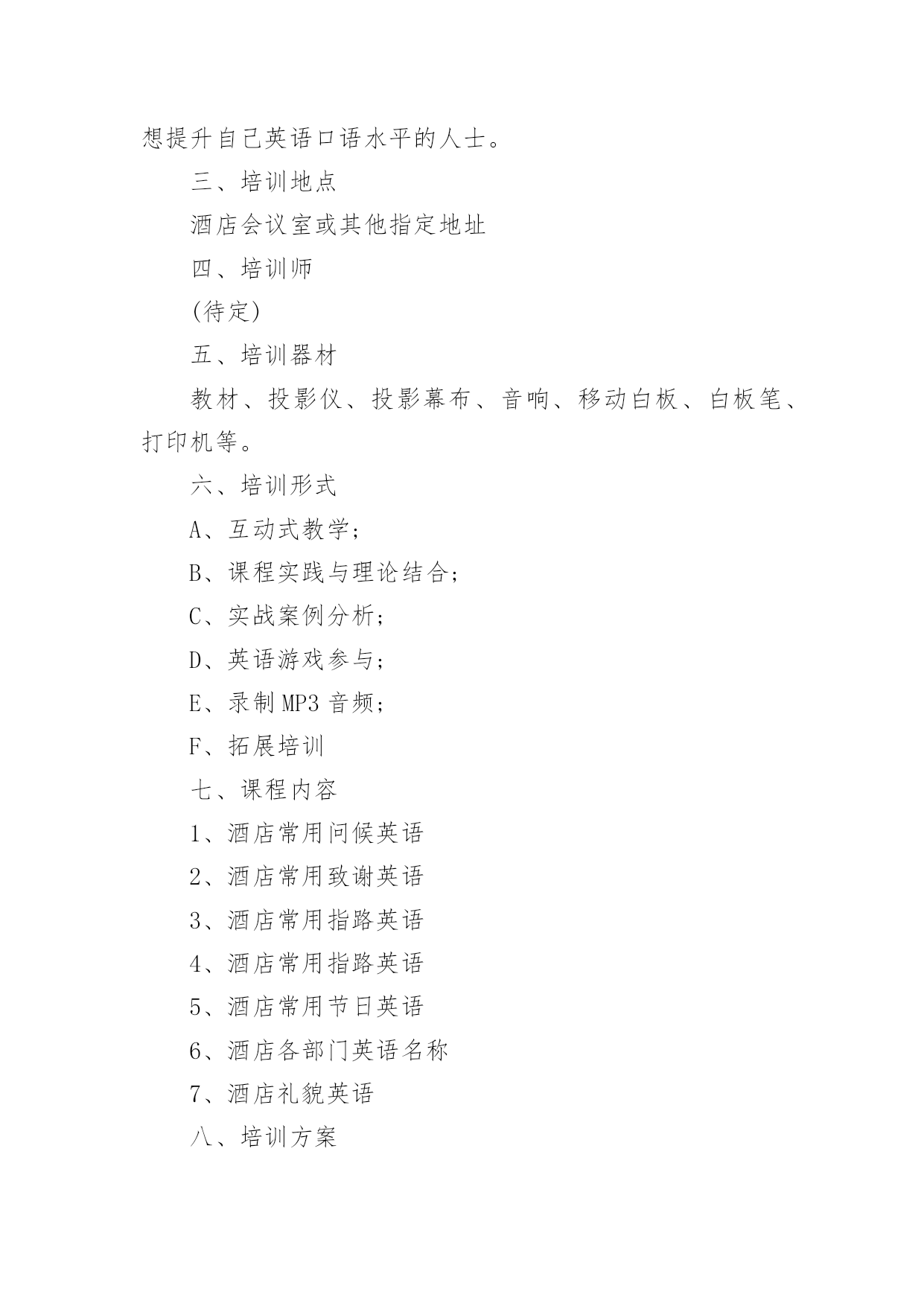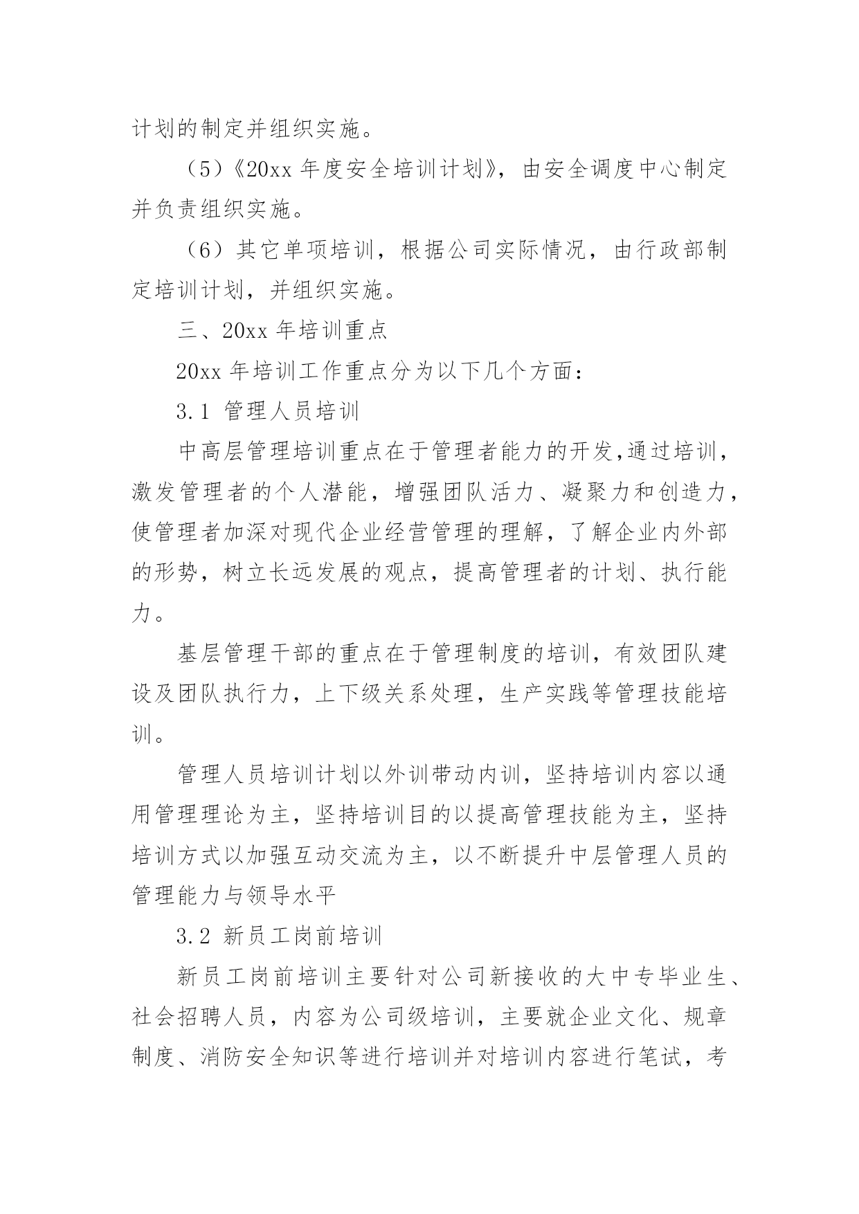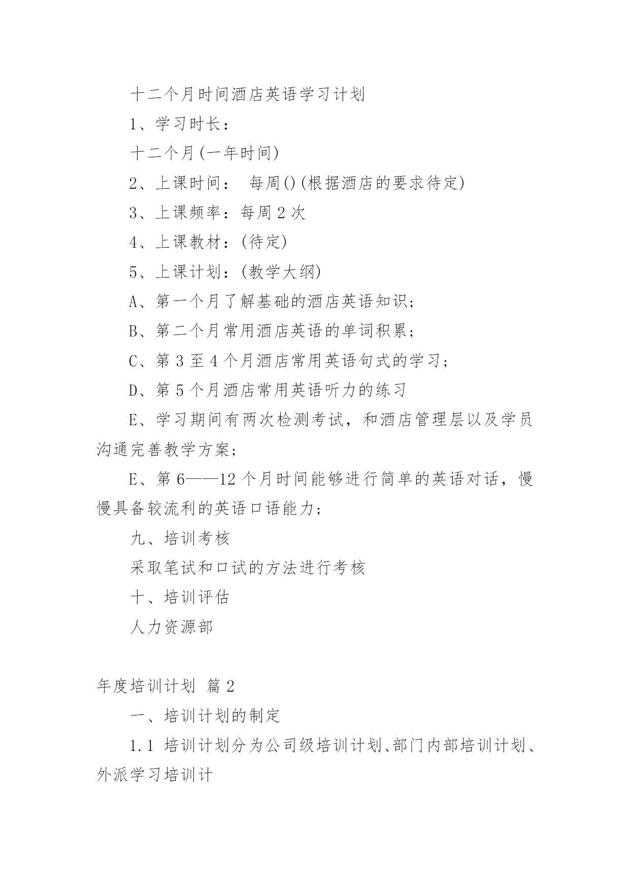 年度培训计划年度培训计划10篇【精】时间过得真快,总在不经意间流逝,我们又将迎来新的喜悦、新的收获,请一起努力,写一份计划吧。拟起计划来就毫无头绪?下面是小编为大家收集的年度培训计划10篇,仅供参考,希望能够帮助到大家。年度培训计划篇1XX酒店作为一个正飞速发展的准四(?)星级酒店,对酒店员工的素质及技能提出了更高的要求,尤其是员工的英语服务技能提出了更高的要求。因此,酒店在进行员工培训需求分析的基础上,结合公司的经营战略和实际工作情况,特拟定20xx年XX酒店酒店英语年度培训计划如下:一、培训目的为提高酒店员工队伍的'素质及服务技能,树立良好的酒店形象,增强企业在市场中的竞争力。二、培训对象各部门人员,包括前厅部、销售部、房务部、安保部、工程部、财务部、办公室、人力资源部,重点放在前厅部。此次培训适合零起点且对酒店英语感兴趣或是在酒店工作的人士。在多听多说的环境中从发音、词汇、对话、句型等方面进行专业的酒店英语培训。对酒店英语有兴趣,准备在涉外酒店工作或者已经酒店工作,想提高酒店英语水平和想提升自己英语口语水平的人士。三、培训地点酒店会议室或其他指定地址四、培训师(待定)五、培训器材教材、投影仪、投影幕布、音响、移动白板、白板笔、打印机等。六、培训形式A、互动式教学;B、课程实践与理论结合;C、实战案例分析;D、英语游戏参与;E、录制MP3音频;F、拓展培训七、课程内容1、酒店常用问候英语2、酒店常用致谢英语3、酒店常用指路英语4、酒店常用指路英语5、酒店常用节日英语6、酒店各部门英语名称7、酒店礼貌英语八、培训方案十二个月时间酒店英语学习计划1、学习时长:十二个月(一年时间)2、上课时间:每周()(根据酒店的要求待定)3、上课频率:每周2次4、上课教材:(待定)5、上课计划:(教学大纲)A、第一个月了解基础的酒店英语知识;B、第二个月常用酒店英语的单词积累;C、第3至4个月酒店常用英语句式的学习;D、第5个月酒店常用英语听力的练习E、学习期间有两次检测考试,和酒店管理层以及学员沟通完善教学方案;E、第6——12个月时间能够进行简单的英语对话,慢慢具备较流利的英语口语能力;九、培训考核采取笔试和口试的方法进行考核十、培训评估人力资源部年度培训计划篇2一、培训计划的制定1.1培训计划分为公司级培训计划、部门内部培训计划、外派学习培训计划及各单项专业性计划培训。1.2公司级培训计划由行政部统一制定,由相关责任部门落实;部门内部培训计划由部门自行制定学习培训计划,自行组织培训实施;外派学习计划由各部门根据工作需要,制定学习计划和培训申请,由行政部组织实施。1.3公司统一制定的学习计划,根据工作情况实行全员培训,让全体员工能充分了解公司各项工作流程、制度和相关知识。行政部并定期制定计划,聘请相关专业老师组织专业知识培训或组织相关人员参加相关课程培训。1.4根据公司总的学习培训计划,行政部每月排定培训计划,按照年度学习计划推进各项学习培训工作。1.5部门内部培训方面,部门内部根据各自工作情况,制定部门内部培训计划,并组织实施。行政部根据各部门的培训计划进行各部门培训学习的跟踪和监督,确保部门内部培训的落实。二、培训的组织实施2.1公司级内部培训的实施由行政部根据公司年度培训计划负责具体组织实施,每月排定培训计划,培训的责任部门制定培训教程及方案,具体实施。2.2部门内部培训的实施由各部门制定月度培训计划并组织实施。具体培训内容及形式、考核等由部门自行组织,行政部负责监督实施。2.3外派培训的实施外派培训审批程序:拟外派培训者提出申请→部门审核→行政部审核→分管副总审核→总经理批准。拟外派培训者应填写《员工外派培训申请表》。培训结束后,须将培训申请表交行政部存档。参加外派培训前已确认必须取得相关证书(毕业证、资格证、结业证等)者,如未获得证书且无正当理由,有关费用由受训者本人负担。2.4单项专业培训的实施由行政部及相关责任部门负责制定培训计划,并组织实施;相关责任部门具体负责组织实施。(1)《20xx新员工入职培训计划》,由行政部具体负责计划的制定并组织实施。所有培训档案由行政部统一装订存档。(2)《20xx年度管理人员培训计划》,由行政部具体负责计划的制定并组织实施。(3)《20xx年度岗位培训计划》特种作业人员培训由各相关特种作业部门拟定培训计划,并组织实施。必须做到所有特种作业人员持证上岗,完成年度培训。所有培训档案及证书由行政部统一存档保管。具体特种作业岗位及需持证上岗要求,由安全调度中心确定,具体培训由特种作业部门组织并完成培训。对公司一线岗位的专业技能培训,由行政部负责组织实施,具体岗位的培训形式,根据实际工作岗位需要进行安排。(4)《20xx年普通员工培训计划》,由行政部具体负责计划的制定并组织实施。(5)《20xx年