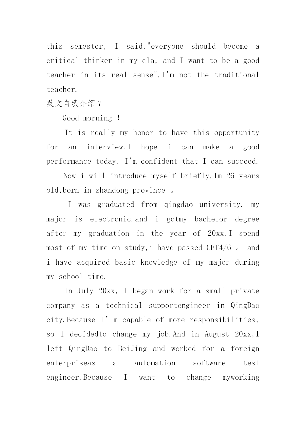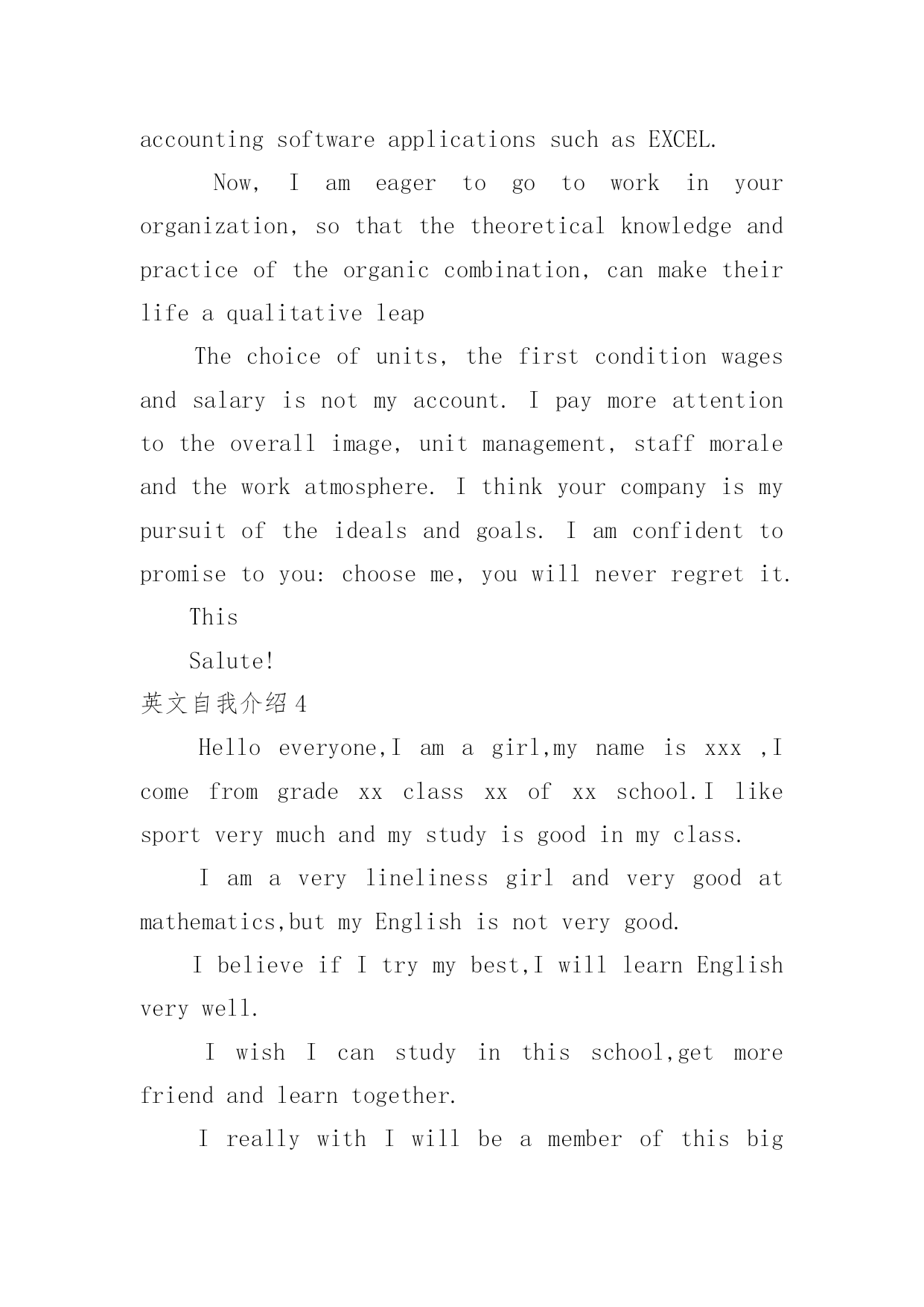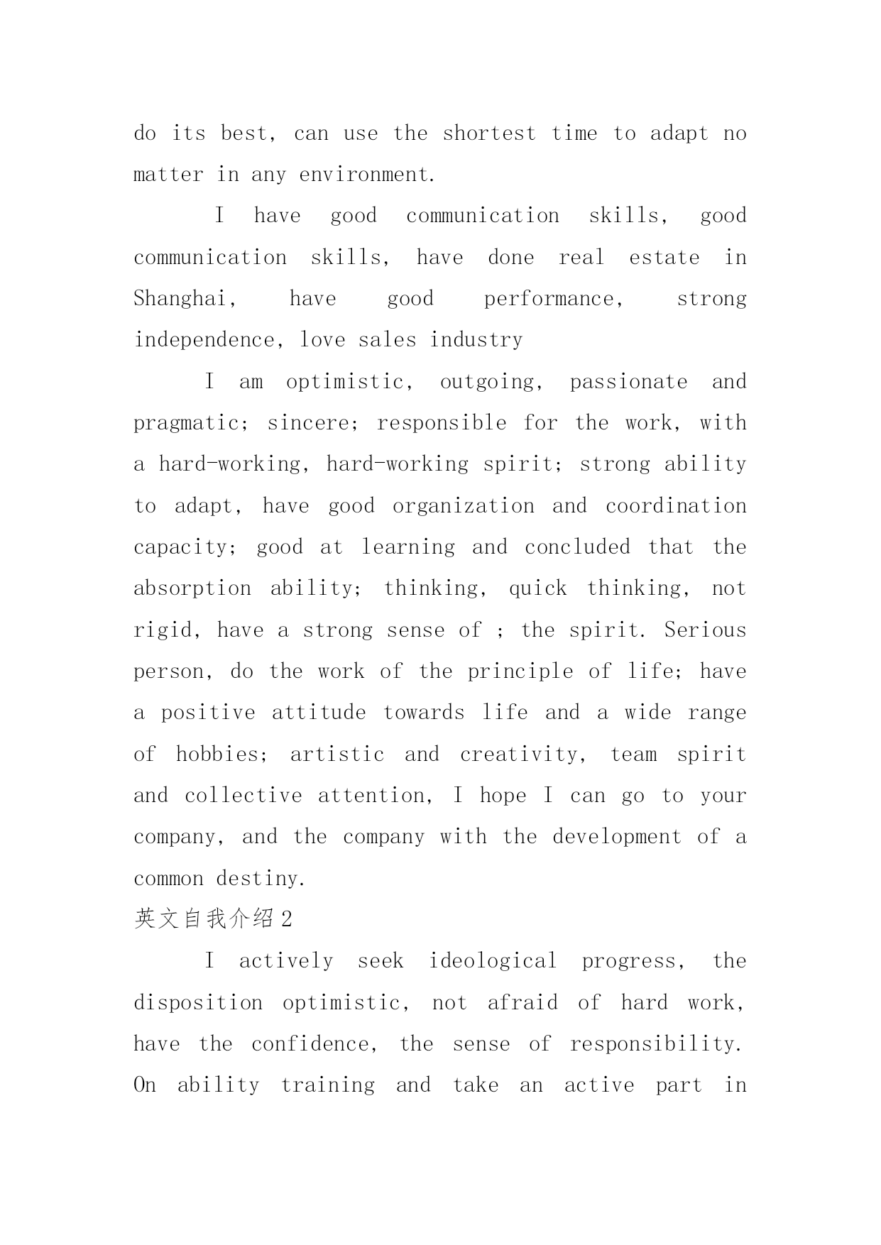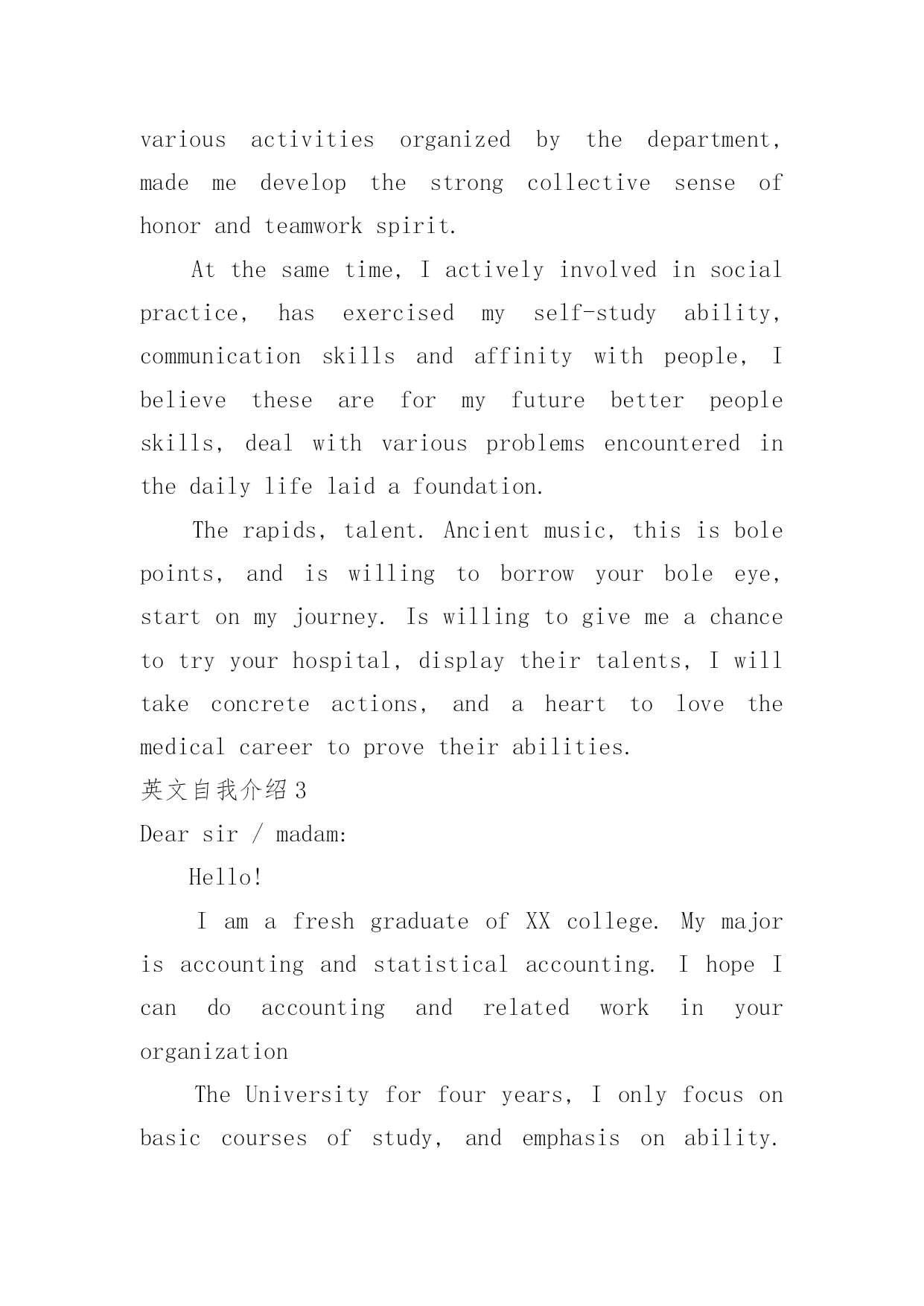 英文自我介绍【推荐】英文自我介绍当来到的一个陌生的地方时,进行自我介绍是必不可少的,通过自我介绍可以让别人认识自己。那么自我介绍要注意有什么内容呢?下面是小编整理的英文自我介绍,仅供参考,欢迎大家阅读。英文自我介绍1Mynameisxx-x.Igraduatedfromxx-xuniversityadministrativeprofessional,throughtwoyearsofadministrativework,Idevelopedacomprehensiveandstrongcompetence.Wellbehavedgoodshape,integrityandpragmatic,responsibleforwork,teamspirit,strongcommunication,organization,productioncooperationability,self-motivated;adheretotheprincipleof,strictworkstyle,strongsenseofresponsibility.Mypersonalityisstraightforward,optimistic,confidentforme,frankly,workconscientiously,acceptanceandunderstanding,likesinging,listeningtomusic,reading,hiking,diaryetc.formyselftodowillbededicatedduediligencewilldoitsbest,canusetheshortesttimetoadaptnomatterinanyenvironment.Ihavegoodcommunicationskills,goodcommunicationskills,havedonerealestateinShanghai,havegoodperformance,strongindependence,lovesalesindustryIamoptimistic,outgoing,passionateandpragmatic;sincere;responsibleforthework,withahard-working,hard-workingspirit;strongabilitytoadapt,havegoodorganizationandcoordinationcapacity;goodatlearningandconcludedthattheabsorptionability;thinking,quickthinking,notrigid,haveastrongsenseof;thespirit.Seriousperson,dotheworkoftheprincipleoflife;haveapositiveattitudetowardslifeandawiderangeofhobbies;artisticandcreativity,teamspiritandcollectiveattention,IhopeIcangotoyourcompany,andthecompanywiththedevelopmentofacommondestiny.英文自我介绍2Iactivelyseekideologicalprogress,thedispositionoptimistic,notafraidofhardwork,havetheconfidence,thesenseofresponsibility.Onabilitytrainingandtakeanactivepartinvariousactivitiesorganizedbythedepartment,mademedevelopthestrongcollectivesenseofhonorandteamworkspirit.Atthesametime,Iactivelyinvolvedinsocialpractice,hasexercisedmyself-studyability,communicationskillsandaffinitywithpeople,Ibelievetheseareformyfuturebetterpeopleskills,dealwithvariousproblemsencounteredinthedailylifelaidafoundation.Therapids,talent.Ancientmusic,thisisbolepoints,andiswillingtoborrowyourboleeye,startonmyjourney.I