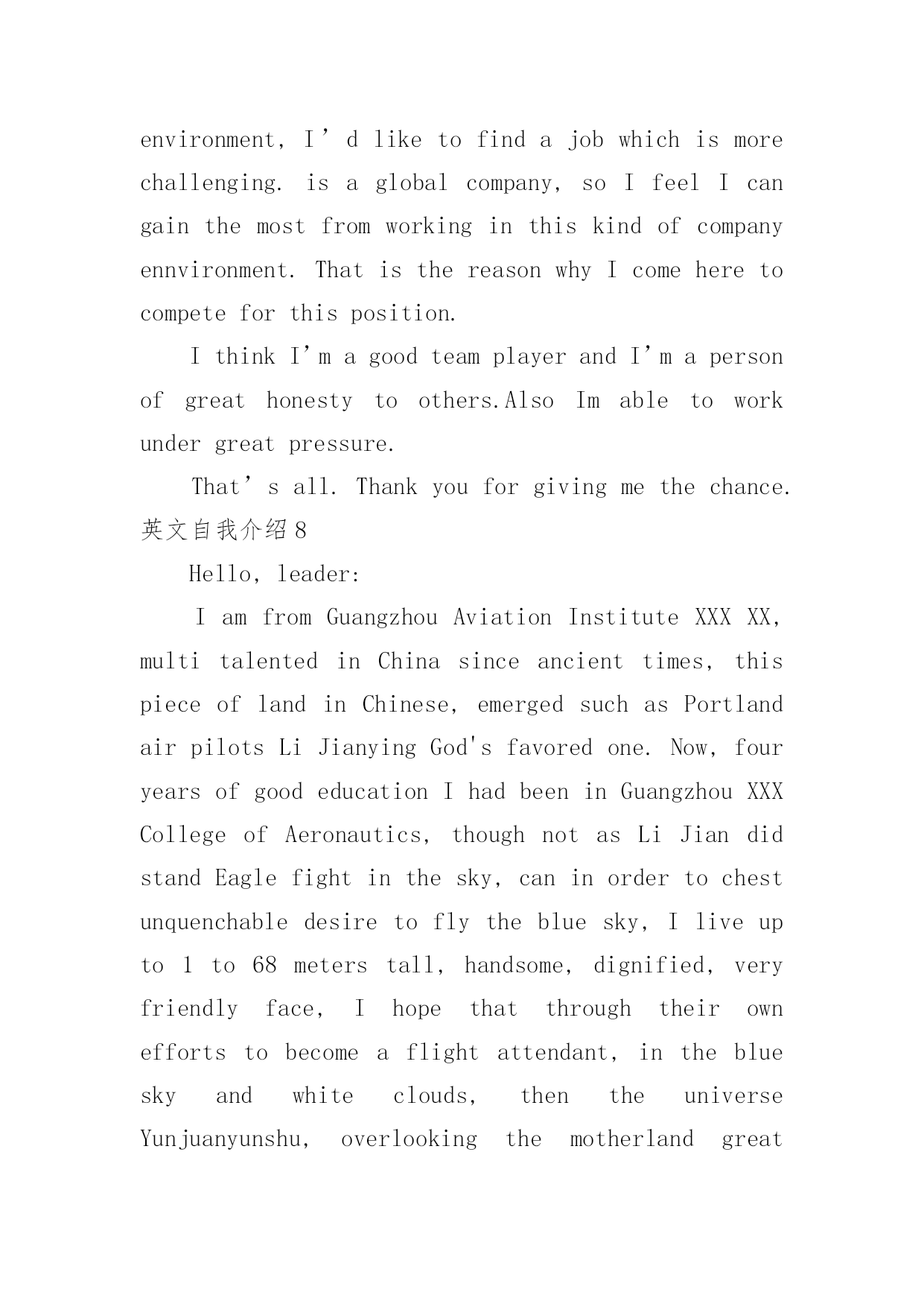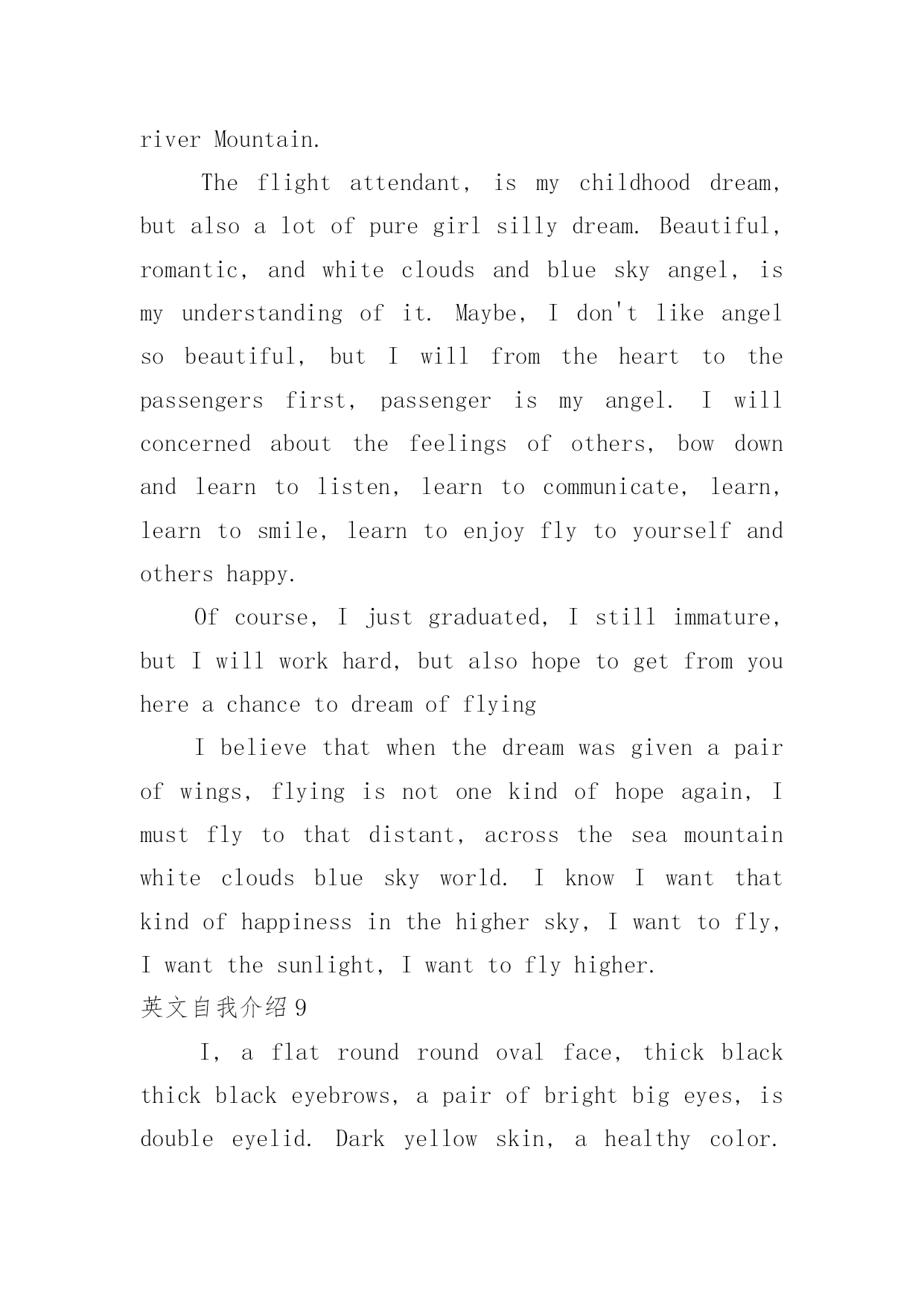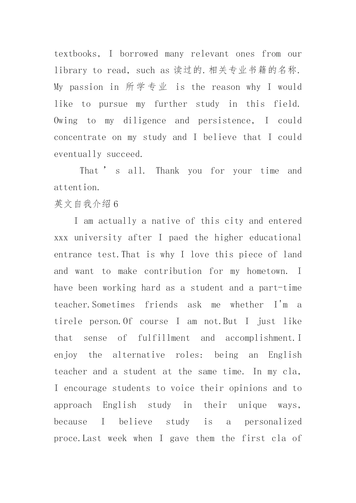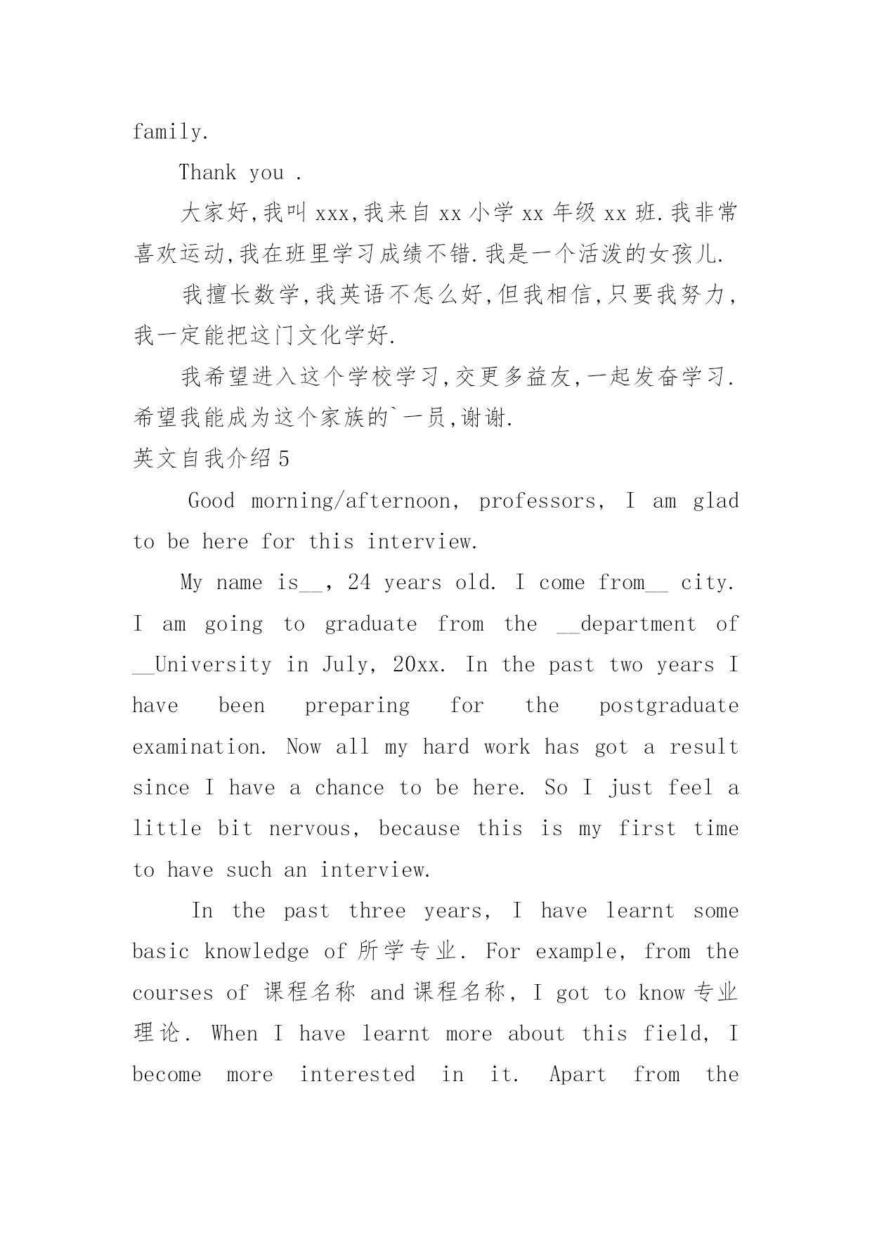 英文自我介绍【推荐】英文自我介绍当来到的一个陌生的地方时,进行自我介绍是必不可少的,通过自我介绍可以让别人认识自己。那么自我介绍要注意有什么内容呢?下面是小编整理的英文自我介绍,仅供参考,欢迎大家阅读。英文自我介绍1Mynameisxx-x.Igraduatedfromxx-xuniversityadministrativeprofessional,throughtwoyearsofadministrativework,Idevelopedacomprehensiveandstrongcompetence.Wellbehavedgoodshape,integrityandpragmatic,responsibleforwork,teamspirit,strongcommunication,organization,productioncooperationability,self-motivated;adheretotheprincipleof,strictworkstyle,strongsenseofresponsibility.Mypersonalityisstraightforward,optimistic,confidentforme,frankly,workconscientiously,acceptanceandunderstanding,likesinging,listeningtomusic,reading,hiking,diaryetc.formyselftodowillbededicatedduediligencewilldoitsbest,canusetheshortesttimetoadaptnomatterinanyenvironment.Ihavegoodcommunicationskills,goodcommunicationskills,havedonerealestateinShanghai,havegoodperformance,strongindependence,lovesalesindustryIamoptimistic,outgoing,passionateandpragmatic;sincere;responsibleforthework,withahard-working,hard-workingspirit;strongabilitytoadapt,havegoodorganizationandcoordinationcapacity;goodatlearningandconcludedthattheabsorptionability;thinking,quickthinking,notrigid,haveastrongsenseof;thespirit.Seriousperson,dotheworkoftheprincipleoflife;haveapositiveattitudetowardslifeandawiderangeofhobbies;artisticandcreativity,teamspiritandcollectiveattention,IhopeIcangotoyourcompany,andthecompanywiththedevelopmentofacommondestiny.英文自我介绍2Iactivelyseekideologicalprogress,thedispositionoptimistic,notafraidofhardwork,havetheconfidence,thesenseofresponsibility.Onabilitytrainingandtakeanactivepartinvariousactivitiesorganizedbythedepartment,mademedevelopthestrongcollectivesenseofhonorandteamworkspirit.Atthesametime,Iactivelyinvolvedinsocialpractice,hasexercisedmyself-studyability,communicationskillsandaffinitywithpeople,Ibelievetheseareformyfuturebetterpeopleskills,dealwithvariousproblemsencounteredinthedailylifelaidafoundation.Therapids,talent.Ancientmusic,thisisbolepoints,andiswillingtoborrowyourboleeye,startonmyjourney.I