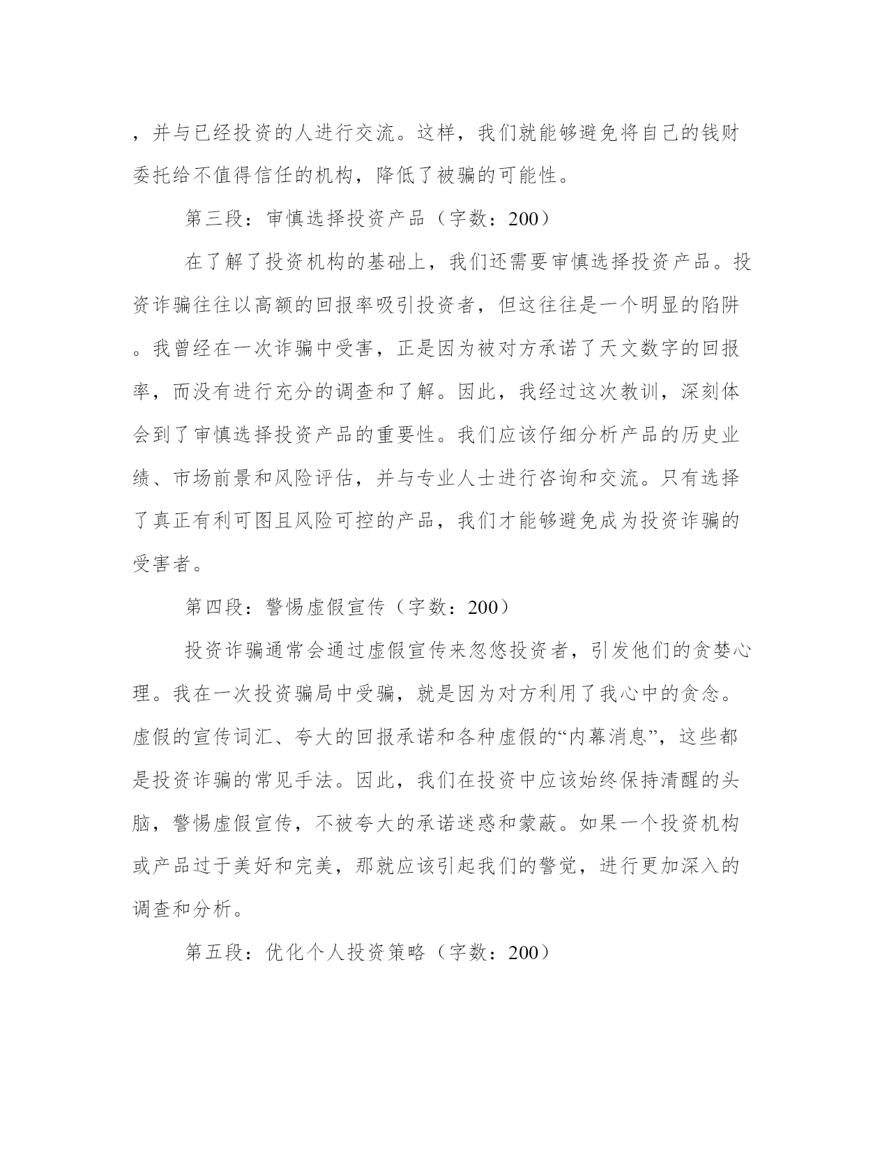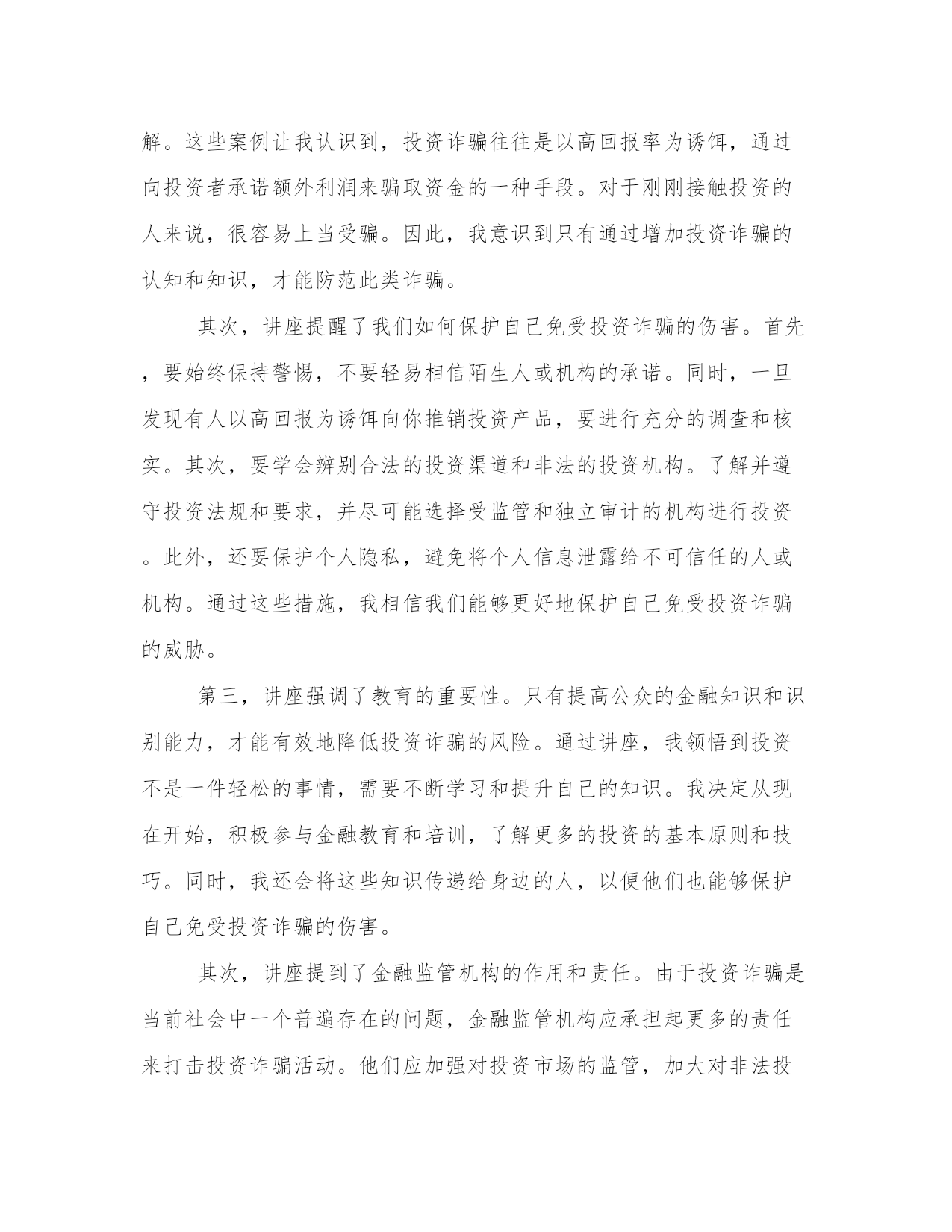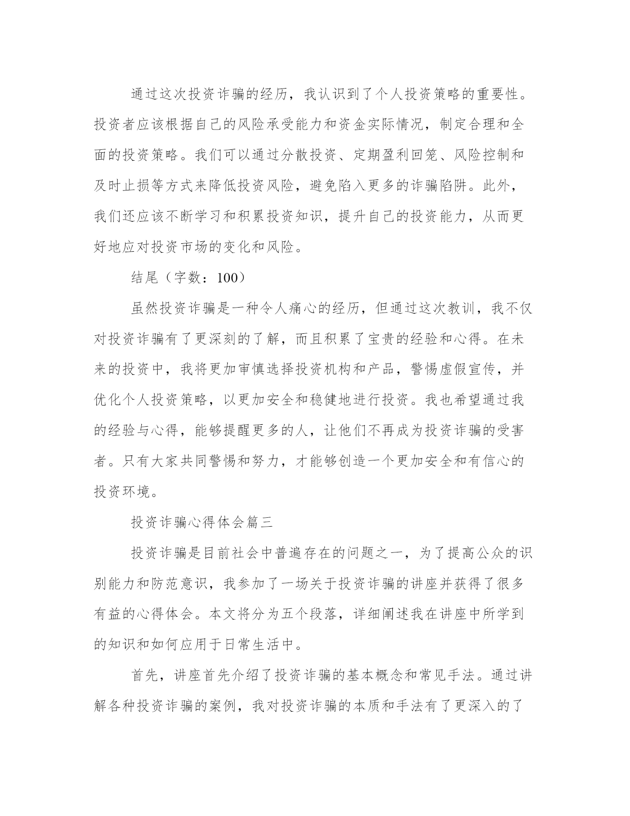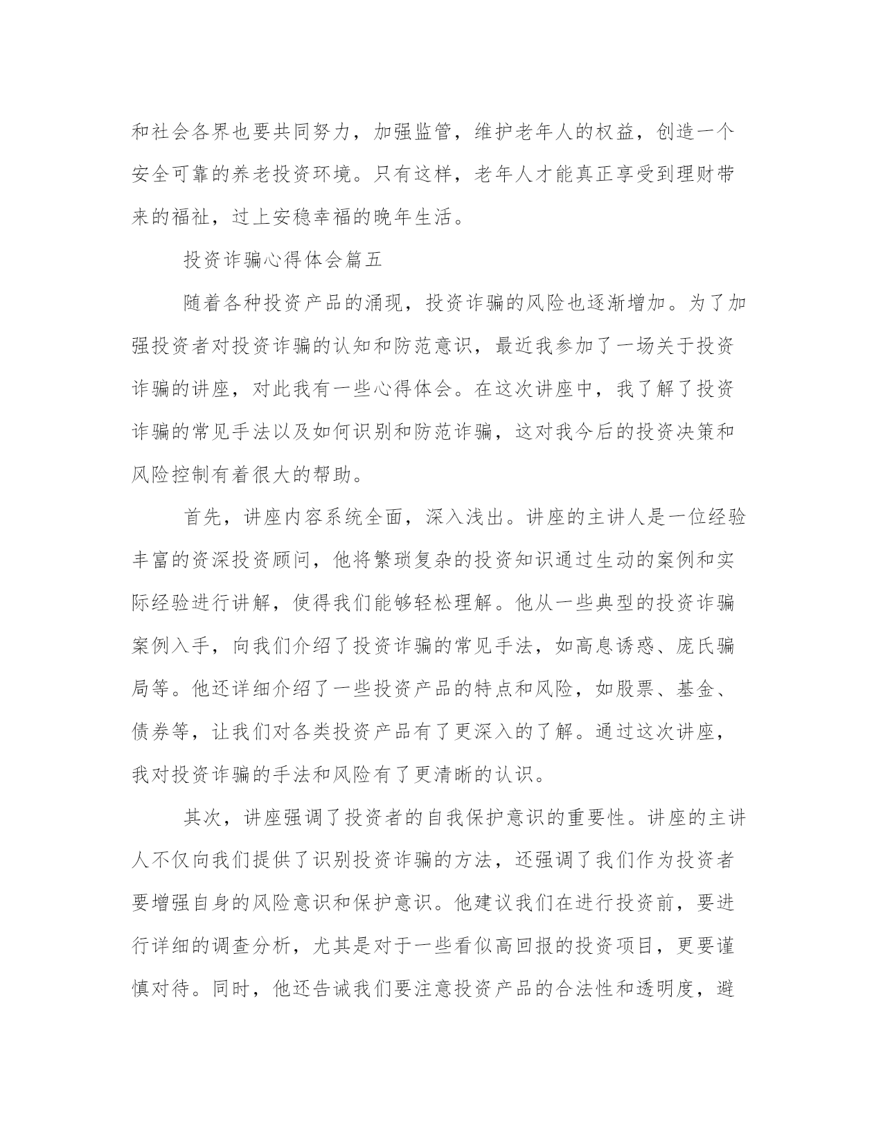 最新投资诈骗心得体会(案例13篇)心得体会是对一段时间内的经验和感悟进行总结和归纳的一种方式,它能够帮助我们反思和总结过去的经历,促使我们更好地成长和进步。每当我们经历了一段特殊的时期,无论是学习、工作还是生活,写下心得体会都是非常有必要的。通过写心得体会,我们可以回顾自己的成长过程,发现自己的不足之处,同时也能够总结出一些宝贵的经验和教训,以便在将来的发展中更好地应用。写心得体会时,我们要用简洁明了的语言表达自己的观点和感受。以下是为了丰富大家的写作素材而收集的一些心得体会范文,供大家参考。投资诈骗心得体会篇一第一段:介绍养老投资诈骗的背景和现状(200字)近年来,随着我国人口老龄化问题的加剧,养老投资成为了许多老年人关注的热点。然而,这也给了一些不法分子可乘之机,利用老年人养老投资不懂、信任度高的特点,进行各种诈骗活动。养老投资诈骗涉及范围广泛,包括假借资金账户、虚假理财产品等多种手段。这些欺骗手段各有巧妙,让许多老年人上当受骗,造成了巨大的经济损失和生活困扰。第二段:养老投资诈骗给老年人带来的伤害和教训(300字)养老投资诈骗的后果不仅仅是经济损失,更重要的是对老年人身心的伤害。被诈骗后,老年人不仅失去了原本的积蓄,还会承受心理上的压力和失望感,甚至导致身体健康问题的发生。同时,失去信任也会让老年人对社会产生不信任感,导致人际关系的恶化。因此,养老投资诈骗必须引起我们的高度警惕,同时提醒老年人保持谨慎的态度,积极学习有关金融知识,增强识别和防范诈骗的能力。第三段:分析养老投资诈骗的特点和常见手段(300字)养老投资诈骗之所以能够成功,主要是因为老年人往往缺乏金融知识和对投资的正确认识,容易被不法分子利用。常见的养老投资诈骗手段包括虚假理财产品、假借资金账户、高回报承诺等。这些手段都以追求高收益和低风险为诱饵,吸引老年人投资。然而,这些投资项目往往是虚假的,背后的组织者往往在利用老年人的钱财进行其他非法活动。老年人要警惕这些手段,保持理性投资,切忌贪图一夜暴富的幻想。第四段:加强养老投资诈骗防范的措施和建议(300字)为了避免老年人成为养老投资诈骗的牺牲品,政府和社会应加强相关措施。首先,加大对养老投资诈骗犯罪的打击力度,加大法律制裁力度,让不法分子付出应有的代价。其次,提高老年人金融知识水平,开展普及金融知识的宣传教育活动,让老年人了解投资风险,增强自我防范能力。第三,建立起完善的投诉机制和举报渠道,老年人在遭遇投资诈骗时能够及时寻求帮助,及时报案追赃。最后,加强对金融市场监管,提高金融机构的服务品质,减少老年人被骗的机会。第五段:总结并号召全社会共同防范养老投资诈骗(200字)养老投资诈骗是当前社会的一大严重问题,需要全社会共同防范。政府、社会组织、金融机构和老年人自身都需要为防范养老投资诈骗做出努力。只有加强宣传教育,提高老年人金融知识水平,完善法律制度和监管机制,才能减少老年人被骗的次数,保障老年人的合法权益。同时,我们每个人也应该密切关注身边的老年人,帮助他们建立正确的投资观念,共同为创造一个安全、健康和尊严的晚年生活而努力。投资诈骗心得体会篇二第一段:引言(字数:200)现代社会,投资诈骗案件屡见不鲜,给广大投资者造成了严重的经济损失和心理伤害。作为一名曾经受骗的投资者,我深刻体会到了投资诈骗的残酷和无情。经过这次教训,我对投资诈骗有了更深刻的认识,也积累了一些宝贵的经验和心得。在接下来的文章中,我将与大家分享我所体会到的投资诈骗的心得体会,以便更多的人能够警醒,并避免落入陷阱。第二段:了解投资机构(字数:200)投资诈骗的第一步,往往是通过美好的承诺来吸引潜在的投资者。因此,了解投资机构成为了防范投资诈骗的重要一步。我在经历了一次投资骗局后,深刻认识到选择可靠的投资机构的重要性。投资者应该对机构的背景和信誉进行深入调查,查看相关的资质和许可证书,并与已经投资的人进行交流。这样,我们就能够避免将自己的钱财委托给不值得信任的机构,降低了被骗的可能性。第三段:审慎选择投资产品(字数:200)在了解了投资机构的基础上,我们还需要审慎选择投资产品。投资诈骗往往以高额的回报率吸引投资者,但这往往是一个明显的陷阱。我曾经在一次诈骗中受害,正是因为被对方承诺了天文数字的回报率,而没有进行充分的调查和了解。因此,我经过这次教训,深刻体会到了审慎选择投资产品的重要性。我们应该仔细分析产品的历史业绩、市场前景和风险评估,并与专业人士进行咨询和交流。只有选择了真正有利可图且风险可控的产品,我们才能够避免成为投资诈骗的受害者。第四段:警惕虚假宣传(字数:200)投资诈骗通常会通过虚假宣传来忽悠投资者,引发他们的贪婪心理。我在一次投资骗局中受骗,就是因为对方利用了我心中的贪念。虚假的宣传词汇、