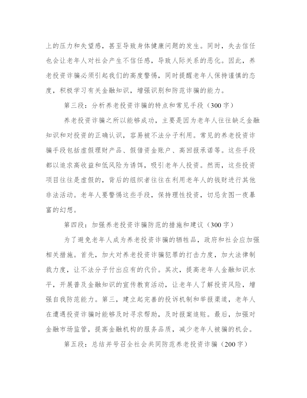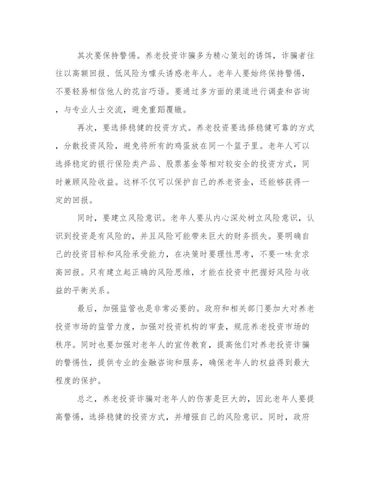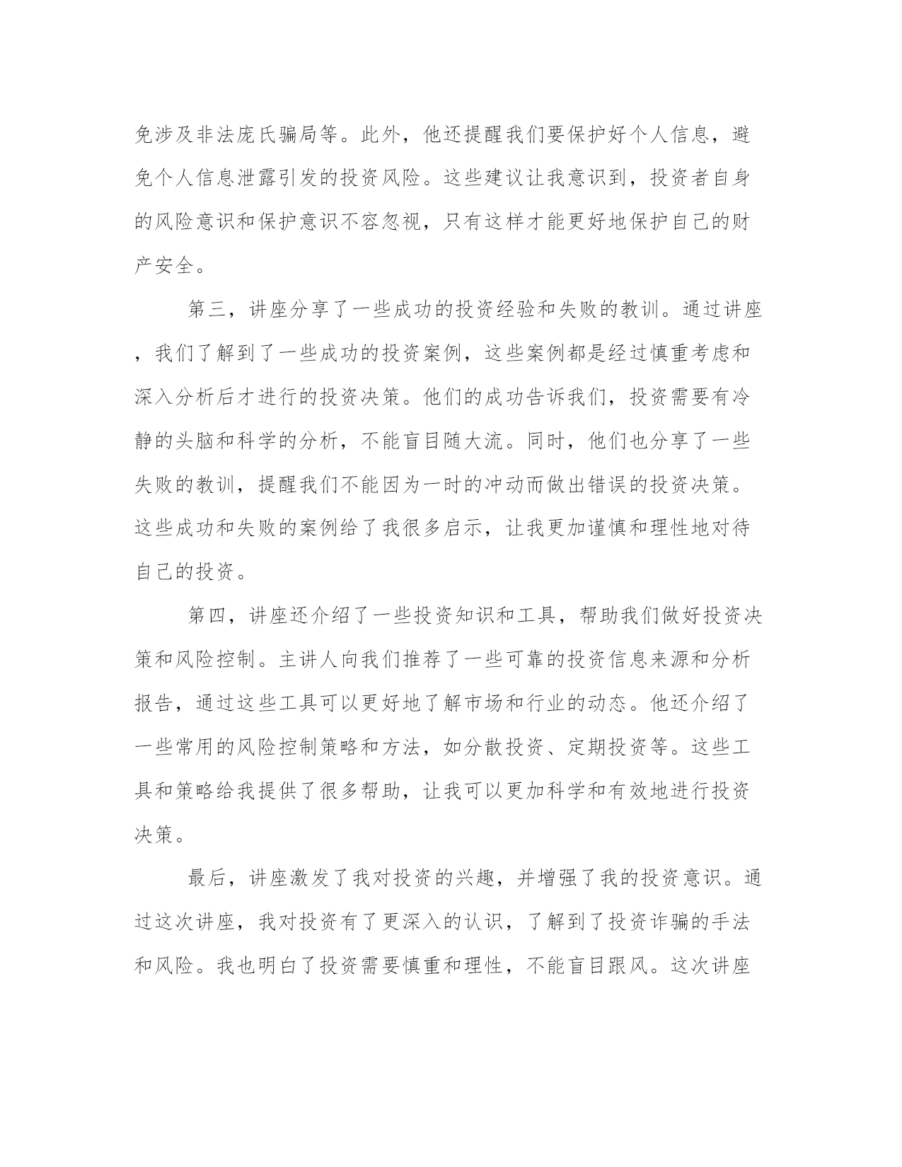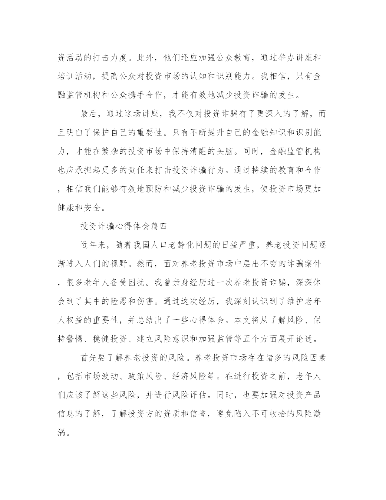 最新投资诈骗心得体会(案例13篇)心得体会是对一段时间内的经验和感悟进行总结和归纳的一种方式,它能够帮助我们反思和总结过去的经历,促使我们更好地成长和进步。每当我们经历了一段特殊的时期,无论是学习、工作还是生活,写下心得体会都是非常有必要的。通过写心得体会,我们可以回顾自己的成长过程,发现自己的不足之处,同时也能够总结出一些宝贵的经验和教训,以便在将来的发展中更好地应用。写心得体会时,我们要用简洁明了的语言表达自己的观点和感受。以下是为了丰富大家的写作素材而收集的一些心得体会范文,供大家参考。投资诈骗心得体会篇一第一段:介绍养老投资诈骗的背景和现状(200字)近年来,随着我国人口老龄化问题的加剧,养老投资成为了许多老年人关注的热点。然而,这也给了一些不法分子可乘之机,利用老年人养老投资不懂、信任度高的特点,进行各种诈骗活动。养老投资诈骗涉及范围广泛,包括假借资金账户、虚假理财产品等多种手段。这些欺骗手段各有巧妙,让许多老年人上当受骗,造成了巨大的经济损失和生活困扰。第二段:养老投资诈骗给老年人带来的伤害和教训(300字)养老投资诈骗的后果不仅仅是经济损失,更重要的是对老年人身心的伤害。被诈骗后,老年人不仅失去了原本的积蓄,还会承受心理上的压力和失望感,甚至导致身体健康问题的发生。同时,失去信任也会让老年人对社会产生不信任感,导致人际关系的恶化。因此,养老投资诈骗必须引起我们的高度警惕,同时提醒老年人保持谨慎的态度,积极学习有关金融知识,增强识别和防范诈骗的能力。第三段:分析养老投资诈骗的特点和常见手段(300字)养老投资诈骗之所以能够成功,主要是因为老年人往往缺乏金融知识和对投资的正确认识,容易被不法分子利用。常见的养老投资诈骗手段包括虚假理财产品、假借资金账户、高回报承诺等。这些手段都以追求高收益和低风险为诱饵,吸引老年人投资。然而,这些投资项目往往是虚假的,背后的组织者往往在利用老年人的钱财进行其他非法活动。老年人要警惕这些手段,保持理性投资,切忌贪图一夜暴富的幻想。第四段:加强养老投资诈骗防范的措施和建议(300字)为了避免老年人成为养老投资诈骗的牺牲品,政府和社会应加强相关措施。首先,加大对养老投资诈骗犯罪的打击力度,加大法律制裁力度,让不法分子付出应有的代价。其次,提高老年人金融知识水平,开展普及金融知识的宣传教育活动,让老年人了解投资风险,增强自我防范能力。第三,建立起完善的投诉机制和举报渠道,老年人在遭遇投资诈骗时能够及时寻求帮助,及时报案追赃。最后,加强对金融市场监管,提高金融机构的服务品质,减少老年人被骗的机会。第五段:总结并号召全社会共同防范养老投资诈骗(200字)养老投资诈骗是当前社会的一大严重问题,需要全社会共同防范。政府、社会组织、金融机构和老年人自身都需要为防范养老投资诈骗做出努力。只有加强宣传教育,提高老年人金融知识水平,完善法律制度和监管机制,才能减少老年人被骗的次数,保障老年人的合法权益。同时,我们每个人也应该密切关注身边的老年人,帮助他们建立正确的投资观念,共同为创造一个安全、健康和尊严的晚年生活而努力。投资诈骗心得体会篇二第一段:引言(字数:200)现代社会,投资诈骗案件屡见不鲜,给广大投资者造成了严重的经济损失和心理伤害。作为一名曾经受骗的投资者,我深刻体会到了投资诈骗的残酷和无情。经过这次教训,我对投资诈骗有了更深刻的认识,也积累了一些宝贵的经验和心得。在接下来的文章中,我将与大家分享我所体会到的投资诈骗的心得体会,以便更多的人能够警醒,并避免落入陷阱。第二段:了解投资机构(字数:200)投资诈骗的第一步,往往是通过美好的承诺来吸引潜在的投资者。因此,了解投资机构成为了防范投资诈骗的重要一步。我在经历了一次投资骗局后,深刻认识到选择可靠的投资机构的重要性。投资者应该对机构的背景和信誉进行深入调查,查看相关的资质和许可证书,并与已经投资的人进行交流。这样,我们就能够避免将自己的钱财委托给不值得信任的机构,降低了被骗的可能性。第三段:审慎选择投资产品(字数:200)在了解了投资机构的基础上,我们还需要审慎选择投资产品。投资诈骗往往以高额的回报率吸引投资者,但这往往是一个明显的陷阱。我曾经在一次诈骗中受害,正是因为被对方承诺了天文数字的回报率,而没有进行充分的调查和了解。因此,我经过这次教训,深刻体会到了审慎选择投资产品的重要性。我们应该仔细分析产品的历史业绩、市场前景和风险评估,并与专业人士进行咨询和交流。只有选择了真正有利可图且风险可控的产品,我们才能够避免成为投资诈骗的受害者。第四段:警惕虚假宣传(字数:200)投资诈骗通常会通过虚假宣传来忽悠投资者,引发他们的贪婪心理。我在一次投资骗局中受骗,就是因为对方利用了我心中的贪念。虚假的宣传词汇、