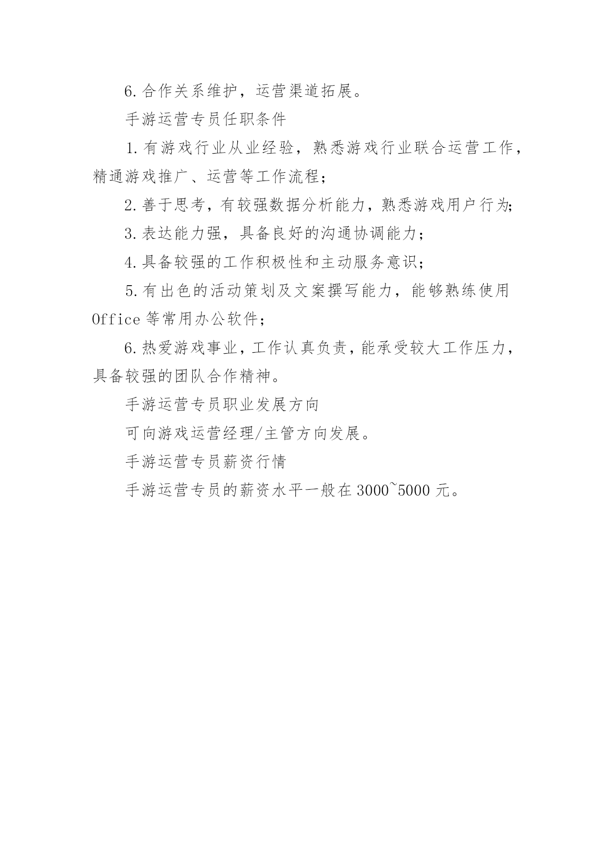 最新手游运营专员岗位职责和任职条件最新手游运营专员岗位职责和任职条件在发展不断提速的社会中,我们可以接触到岗位职责的地方越来越多,制定岗位职责能够有效的'地防止因为职位分配不合理而导致部门之间或是员工之间出现工作推脱、责任推卸等现象发生。那么岗位职责的格式,你掌握了吗?下面是小编为大家收集的最新手游运营专员岗位职责和任职条件,欢迎阅读与收藏。职位概述手游运营专员主要负责一系列手游产品的运营工作,能准确识别并深刻理解用户需求,并时刻保持敏锐的用户感觉;能对产品和市场数据进行分析,并以此为依据推进产品改进。手游运营专员岗位责任1.负责手机游戏的日常运营工作,保证游戏在多平台的稳定运行,如期完成公司运营目标;2.负责手机游戏产品运营对接、活动策划、玩家服务;3.负责游戏的市场宣传及合作推广,跟踪手机网游运营数据,并根据数据分析、总结和改进运营策略;4.关注行业市场,做好竞争对手分析,包括产品分析、渠道分析和运营策略分析,定期出具运营优化方案;5.负责各类手游产品体验及评测;6.合作关系维护,运营渠道拓展。手游运营专员任职条件1.有游戏行业从业经验,熟悉游戏行业联合运营工作,精通游戏推广、运营等工作流程;2.善于思考,有较强数据分析能力,熟悉游戏用户行为;3.表达能力强,具备良好的沟通协调能力;4.具备较强的工作积极性和主动服务意识;5.有出色的活动策划及文案撰写能力,能够熟练使用Office等常用办公软件;6.热爱游戏事业,工作认真负责,能承受较大工作压力,具备较强的团队合作精神。手游运营专员职业发展方向可向游戏运营经理/主管方向发展。手游运营专员薪资行情手游运营专员的薪资水平一般在3000~5000元。