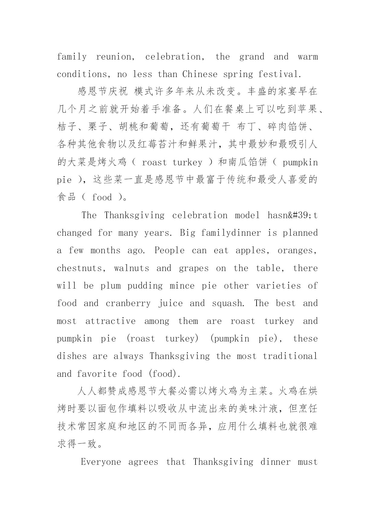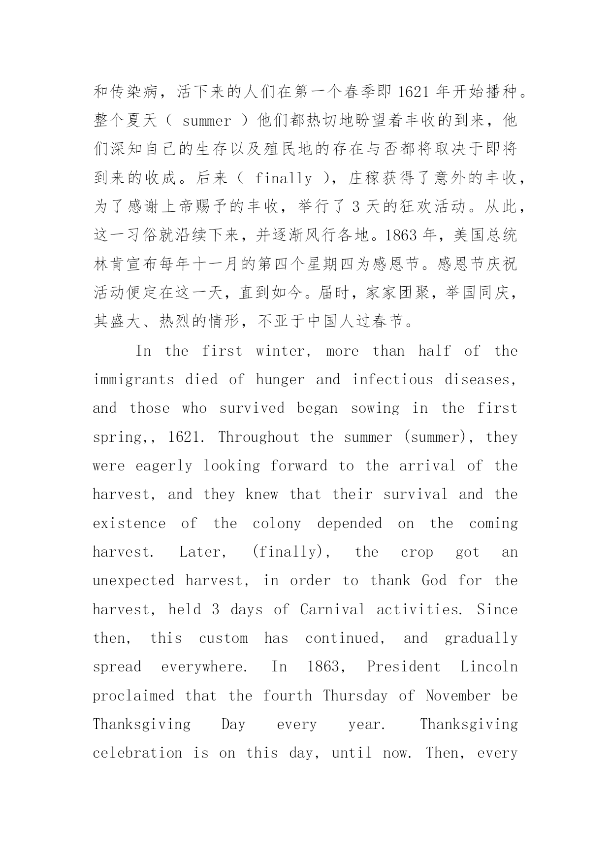 感恩节英语资料感恩节英语资料感恩节起源于美国。最初前往美洲的英国清教徒在来到新土地后受到了当地印第安人的帮助而建立起的友谊,因此为了纪念和感谢他们而创建的感恩节。其实全球还有很多国家也有感恩节,他们的由来也各有不同。下面是小编带来的是感恩节英语资料,希望对您有帮助。感恩节thanksgiving是美国国定假日中最地道、最美国式的节日(holiday),而且它和早期美国历史最为密切相关。ThanksgivingDayThanksgivingisthemostauthenticandholidayofnationalholidaysintheUnitedStates,anditismostcloselyrelatedtoearlyAmericanhistory.1620年,一些朝拜者乘坐“五月花”号船去美国寻求宗教自由。他们在海上颠簸了两个月之后,终于在酷寒的十一月里,在现在的马莎塞州的普里茅斯登陆。In1620,somepilgrimswenttotheUnitedStatestoseekreligiousfreedomontheMayflowership.Aftertheyjoltedtwomonthsatsea,finallyinicyNovember,whatisnowthePlymouthMassachusettslanding.在第一个冬天,半数以上的移民都死于(die)饥饿和传染病,活下来的人们在第一个春季即1621年开始播种。整个夏天(summer)他们都热切地盼望着丰收的到来,他们深知自己的生存以及殖民地的存在与否都将取决于即将到来的收成。后来(finally),庄稼获得了意外的丰收,为了感谢上帝赐予的丰收,举行了3天的狂欢活动。从此,这一习俗就沿续下来,并逐渐风行各地。1863年,美国总统林肯宣布每年十一月的第四个星期四为感恩节。感恩节庆祝活动便定在这一天,直到如今。届时,家家团聚,举国同庆,其盛大、热烈的情形,不亚于中国人过春节。Inthefirstwinter,morethanhalfoftheimmigrantsdiedofhungerandinfectiousdiseases,andthosewhosurvivedbegansowinginthefirstspring,,1621.Throughoutthesummer(summer),theywereeagerlylookingforwardtothearrivaloftheharvest,andtheyknewthattheirsurvivalandtheexistenceofthecolonydependedonthecomingharvest.Later,(finally),thecropgotanunexpectedharvest,inordertothankGodfortheharvest,held3daysofCarnivalactivities.Sincethen,thiscustomhascontinued,andgraduallyspreadeverywhere.In1863,PresidentLincolnproclaimedthatthefourthThursdayofNovemberbeThanksgivingDayeveryyear.Thanksgivingcelebrationisonthisday,untilnow.Then,everyfamilyreunion,celebration,thegrandandwarmconditions,nolessthanChinesespringfestival.感恩节庆祝模式许多年来从未改变。丰盛的家宴早在几个月之前就开始着手准备。人们在餐桌上可以吃到苹果、桔子、栗子、胡桃和葡萄,还有葡萄干布丁、碎肉馅饼、各种其他食物以及红莓苔汁和鲜果汁,其中最妙和最吸引人的大菜是烤火鸡(roastturkey)和南瓜馅饼(pumpkinpie),这些菜一直是感恩节中最富于传统和最受人喜爱的食品(food)。TheThanksgivingcelebrationmodelhasn'tchangedformanyyears.Bigfamilydinnerisplannedafewmonthsago.Peoplecaneatapples,oranges,chestnuts,walnutsandgrapesonthetable,therewillbeplumpuddingmincepieothervarietiesoffoodandcranberryjuiceandsquash.Thebestandmostattractiveamongthemareroastturkeyandpumpkinpi