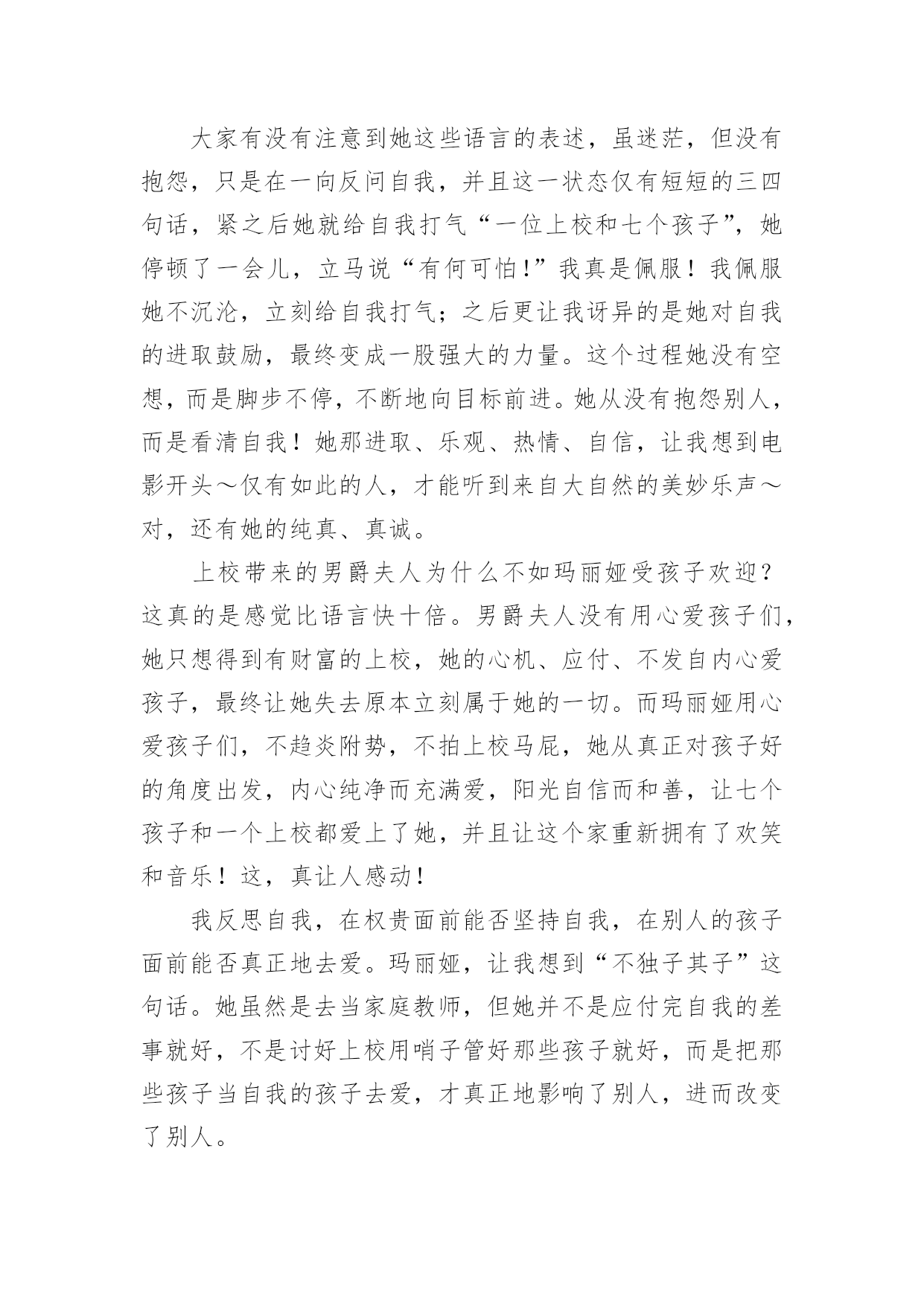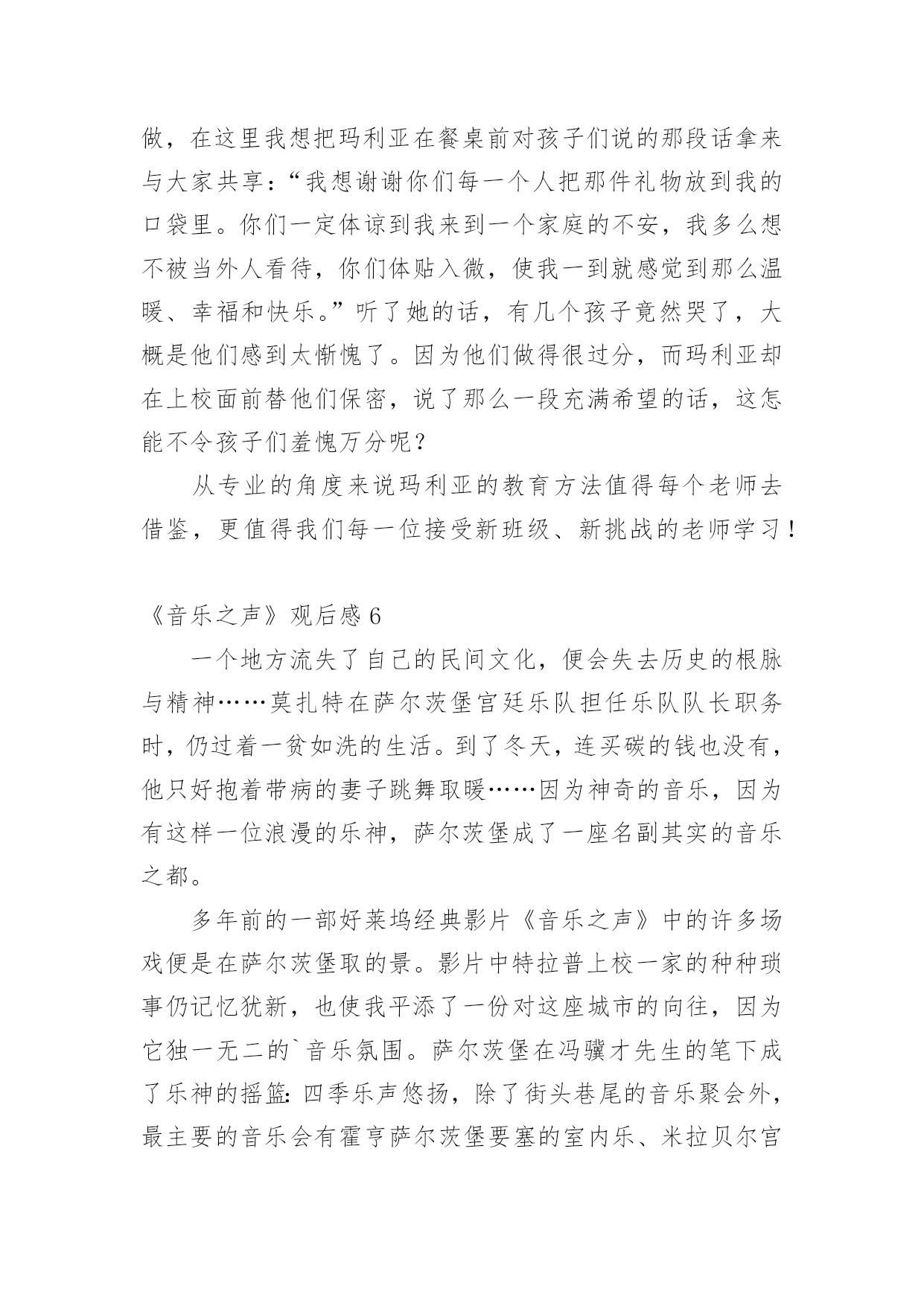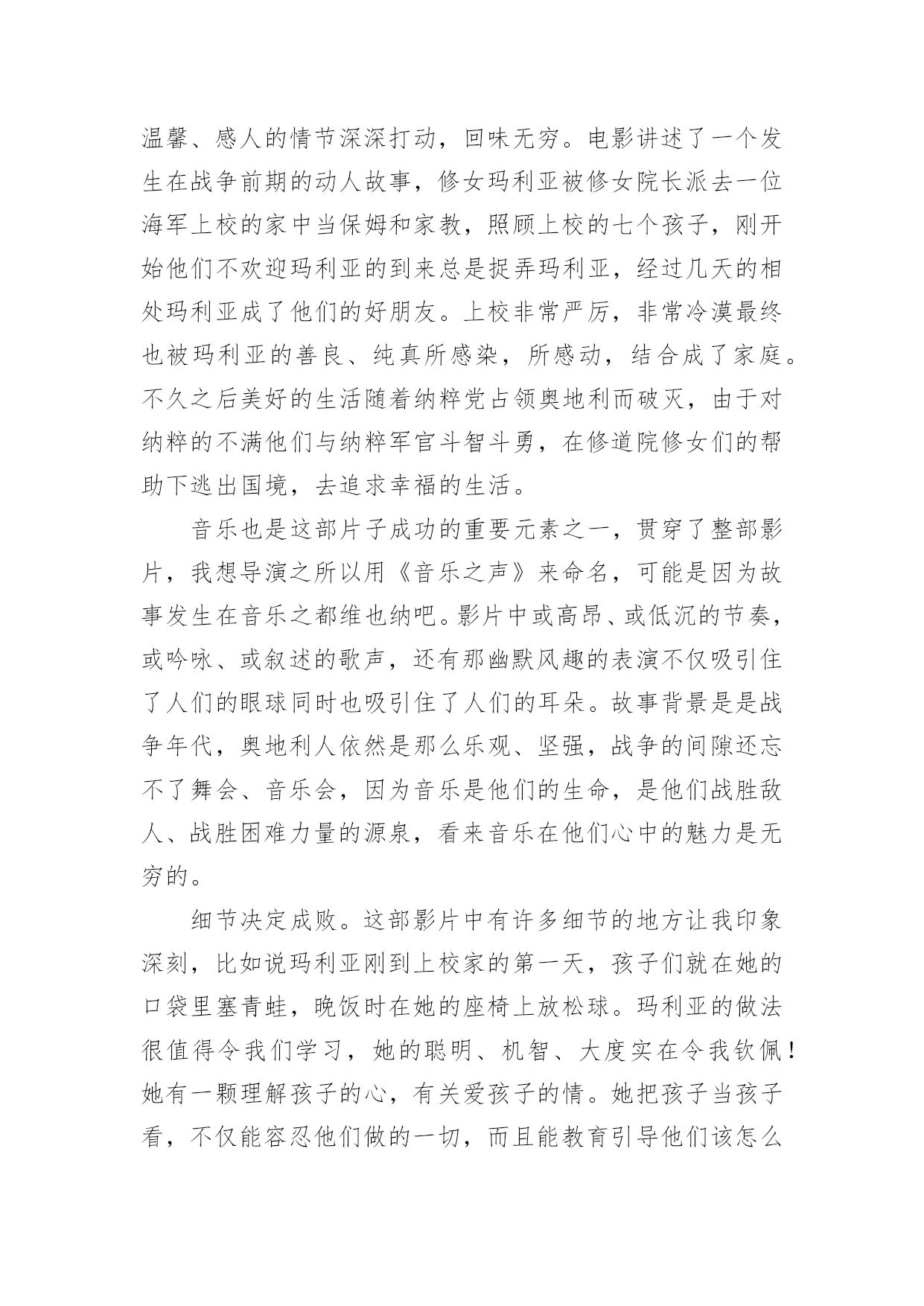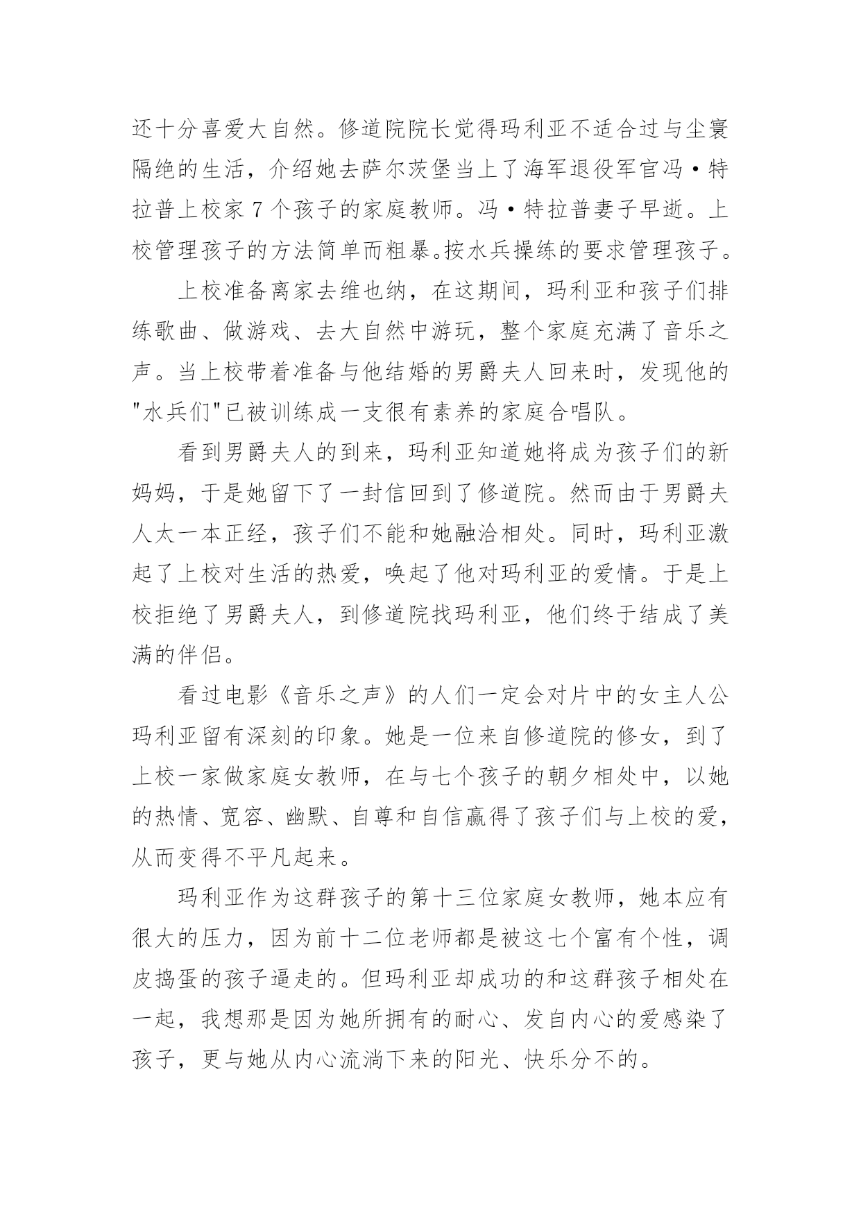 《音乐之声》观后感《音乐之声》观后感合集15篇当认真看完一部作品后,一定对生活有了新的感悟和看法吧,不能光会看哦,写一篇观后感吧。可能你现在毫无头绪吧,以下是小编精心整理的《音乐之声》观后感,欢迎阅读与收藏。《音乐之声》观后感1这部电影,我很早以前看过一遍,只记得电影中的音乐很好听。如今重温,有了不一样的感触。电影开场有将近两分半钟的时间,仅有风吹过雪地、高山、河谷、河流、平原等地的声音,没有人,没有字幕。我疑惑是开错电影了吗?好像是什么风景欣赏的广告!我很烦躁,很想把这一段跳过去看一看是怎样回事。但一点点的好奇心让我忍住了,继续往下看。当主人公一出场,唱出:“群山生机盎然,处处音乐之声,这是它们吟唱了千年的歌。山谷的乐音,充盈我心间。我想唱出,我心灵听到的一切……”我突然觉得我是多么不纯净、多么焦躁、多么世俗!第二处让我感悟很深的是:玛丽娅从修道院走出来,走在去上校家做家庭教师的路上,最终到他家门口的这一部分。一开始她很迷茫:“今日会怎样,未来又会如何”“我到底是怎样回事”“为何我如此害怕”!大家有没有注意到她这些语言的表述,虽迷茫,但没有抱怨,只是在一向反问自我,并且这一状态仅有短短的三四句话,紧之后她就给自我打气“一位上校和七个孩子”,她停顿了一会儿,立马说“有何可怕!”我真是佩服!我佩服她不沉沦,立刻给自我打气;之后更让我讶异的是她对自我的进取鼓励,最终变成一股强大的力量。这个过程她没有空想,而是脚步不停,不断地向目标前进。她从没有抱怨别人,而是看清自我!她那进取、乐观、热情、自信,让我想到电影开头~仅有如此的人,才能听到来自大自然的美妙乐声~对,还有她的纯真、真诚。上校带来的男爵夫人为什么不如玛丽娅受孩子欢迎?这真的是感觉比语言快十倍。男爵夫人没有用心爱孩子们,她只想得到有财富的上校,她的心机、应付、不发自内心爱孩子,最终让她失去原本立刻属于她的一切。而玛丽娅用心爱孩子们,不趋炎附势,不拍上校马屁,她从真正对孩子好的角度出发,内心纯净而充满爱,阳光自信而和善,让七个孩子和一个上校都爱上了她,并且让这个家重新拥有了欢笑和音乐!这,真让人感动!我反思自我,在权贵面前能否坚持自我,在别人的孩子面前能否真正地去爱。玛丽娅,让我想到“不独子其子”这句话。她虽然是去当家庭教师,但她并不是应付完自我的差事就好,不是讨好上校用哨子管好那些孩子就好,而是把那些孩子当自我的孩子去爱,才真正地影响了别人,进而改变了别人。一部值得一看再看的电影!《音乐之声》观后感2生活原本就是平凡又意味深长,成人有成人们自己的思维方式和世界,有如玛丽亚热忱奔放,对音乐和大自然的爱好与执着,有如上校对自己国家的忠诚与信仰,亦然,孩子们也有着自己的思维和所憧憬的世界,不是巧克力玩具,而是自由与抱负,他们需要的是更多的掌声和认可。音乐之声是一部特别著名的电影,欢快的音乐,平凡的生活,在这平凡中又演译着不平凡的执着,玛丽亚对自己生活的执着,对感情的执着。不禁让我想起在现实的生活中,人们遇到很多的困难时总是躲避,而躲避是解决不了问题,我们应当向玛丽亚一样,勇往直前,追寻自己所想要的东西,即使是失败也无怨无悔,由于人生没有永久不败。孩子们的天性便是追求自由,影片里的孩子们各自有自己不同的性格,爱好和抱负。他们不情愿过这种严加管束的生活,总设法戏弄历届的家庭老师,使他们呆不下去。对玛丽亚自然也不例外:一会儿出其不意把蛤蟆放在她的口袋里;一会儿趁她不备将松球放在她的座位上。但玛丽亚自己就具有孩子般的性格,她能理解孩子们在成长过程中的所作所为。她引导他们,关怀他们,关心他们,赢得了他们的信任,很快就成了他们的知心伴侣,建立了深厚的感情,用窗帘布给孩子们做了嬉戏服,带他们去野餐、郊游、爬树和划船;教他们唱歌,从“多,来,米”学起,直到排练歌曲。于是这个家庭平添了笑语、快乐和生气,布满了音乐之声。音乐感动的不仅是孩子,上校,一个对自己和对别人都有着严格要求,又有些沉醉于以往的男人,听到音乐后,激起了内心深处埋藏已久的情感,无法掩饰的忘我,轻轻的哼着。音乐不仅转变了孩子,也转变了上校,从今变得更有人情味。电影的结尾上校决不背叛自己的祖国和人民的上校预备冒险带全家离去。临别之际,他为家乡的父老乡亲献上的还是那首他最宠爱的歌,雪绒花,雪绒花。但一曲未了便已哽咽,玛利亚默契地接唱下去,并带动全场观众加入大合唱。这是全片最令人心潮澎湃的感人.。上校家庭对音乐的喜爱让我感动。里面漂亮悦耳的歌曲使我了解到音乐是人类共同的语言,它没有国界,不分种族。其中我最喜爱的歌曲是雪绒花。它出现在整个影片的最终,在敌人严密的监视下,剧场里的气氛异样残酷,上尉一家人演唱的这首歌曲就像在污泥中干净的花朵,让人看到盼望和春天。《音乐之声》观后感3从来没有一部电影如此深入人心,不但里面的角色、情节、经历家喻户