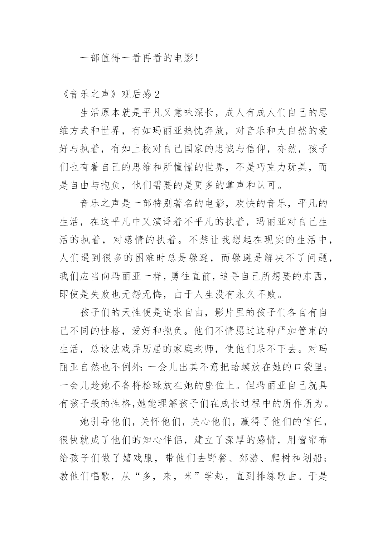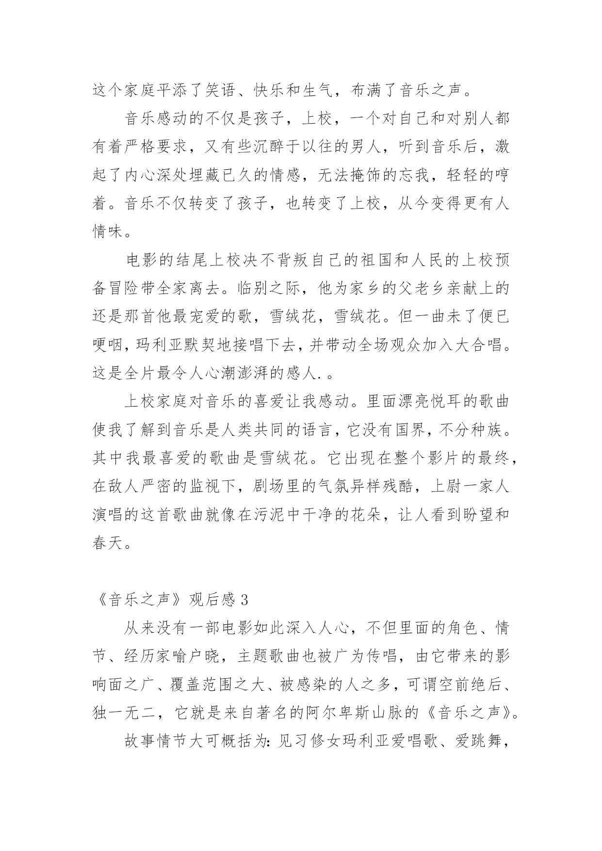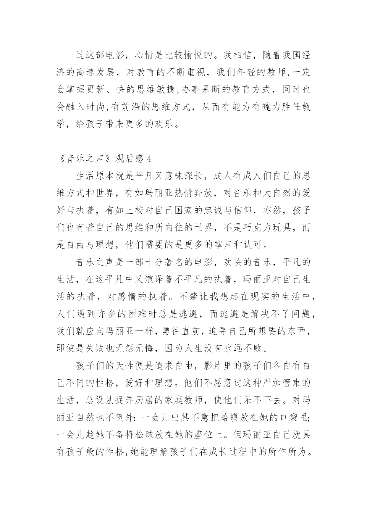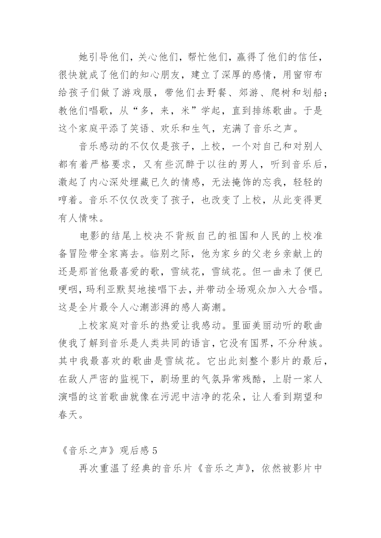 《音乐之声》观后感《音乐之声》观后感合集15篇当认真看完一部作品后,一定对生活有了新的感悟和看法吧,不能光会看哦,写一篇观后感吧。可能你现在毫无头绪吧,以下是小编精心整理的《音乐之声》观后感,欢迎阅读与收藏。《音乐之声》观后感1这部电影,我很早以前看过一遍,只记得电影中的音乐很好听。如今重温,有了不一样的感触。电影开场有将近两分半钟的时间,仅有风吹过雪地、高山、河谷、河流、平原等地的声音,没有人,没有字幕。我疑惑是开错电影了吗?好像是什么风景欣赏的广告!我很烦躁,很想把这一段跳过去看一看是怎样回事。但一点点的好奇心让我忍住了,继续往下看。当主人公一出场,唱出:“群山生机盎然,处处音乐之声,这是它们吟唱了千年的歌。山谷的乐音,充盈我心间。我想唱出,我心灵听到的一切……”我突然觉得我是多么不纯净、多么焦躁、多么世俗!第二处让我感悟很深的是:玛丽娅从修道院走出来,走在去上校家做家庭教师的路上,最终到他家门口的这一部分。一开始她很迷茫:“今日会怎样,未来又会如何”“我到底是怎样回事”“为何我如此害怕”!大家有没有注意到她这些语言的表述,虽迷茫,但没有抱怨,只是在一向反问自我,并且这一状态仅有短短的三四句话,紧之后她就给自我打气“一位上校和七个孩子”,她停顿了一会儿,立马说“有何可怕!”我真是佩服!我佩服她不沉沦,立刻给自我打气;之后更让我讶异的是她对自我的进取鼓励,最终变成一股强大的力量。这个过程她没有空想,而是脚步不停,不断地向目标前进。她从没有抱怨别人,而是看清自我!她那进取、乐观、热情、自信,让我想到电影开头~仅有如此的人,才能听到来自大自然的美妙乐声~对,还有她的纯真、真诚。上校带来的男爵夫人为什么不如玛丽娅受孩子欢迎?这真的是感觉比语言快十倍。男爵夫人没有用心爱孩子们,她只想得到有财富的上校,她的心机、应付、不发自内心爱孩子,最终让她失去原本立刻属于她的一切。而玛丽娅用心爱孩子们,不趋炎附势,不拍上校马屁,她从真正对孩子好的角度出发,内心纯净而充满爱,阳光自信而和善,让七个孩子和一个上校都爱上了她,并且让这个家重新拥有了欢笑和音乐!这,真让人感动!我反思自我,在权贵面前能否坚持自我,在别人的孩子面前能否真正地去爱。玛丽娅,让我想到“不独子其子”这句话。她虽然是去当家庭教师,但她并不是应付完自我的差事就好,不是讨好上校用哨子管好那些孩子就好,而是把那些孩子当自我的孩子去爱,才真正地影响了别人,进而改变了别人。一部值得一看再看的电影!《音乐之声》观后感2生活原本就是平凡又意味深长,成人有成人们自己的思维方式和世界,有如玛丽亚热忱奔放,对音乐和大自然的爱好与执着,有如上校对自己国家的忠诚与信仰,亦然,孩子们也有着自己的思维和所憧憬的世界,不是巧克力玩具,而是自由与抱负,他们需要的是更多的掌声和认可。音乐之声是一部特别著名的电影,欢快的音乐,平凡的生活,在这平凡中又演译着不平凡的执着,玛丽亚对自己生活的执着,对感情的执着。不禁让我想起在现实的生活中,人们遇到很多的困难时总是躲避,而躲避是解决不了问题,我们应当向玛丽亚一样,勇往直前,追寻自己所想要的东西,即使是失败也无怨无悔,由于人生没有永久不败。孩子们的天性便是追求自由,影片里的孩子们各自有自己不同的性格,爱好和抱负。他们不情愿过这种严加管束的生活,总设法戏弄历届的家庭老师,使他们呆不下去。对玛丽亚自然也不例外:一会儿出其不意把蛤蟆放在她的口袋里;一会儿趁她不备将松球放在她的座位上。但玛丽亚自己就具有孩子般的性格,她能理解孩子们在成长过程中的所作所为。她引导他们,关怀他们,关心他们,赢得了他们的信任,很快就成了他们的知心伴侣,建立了深厚的感情,用窗帘布给孩子们做了嬉戏服,带他们去野餐、郊游、爬树和划船;教他们唱歌,从“多,来,米”学起,直到排练歌曲。于是这个家庭平添了笑语、快乐和生气,布满了音乐之声。音乐感动的不仅是孩子,上校,一个对自己和对别人都有着严格要求,又有些沉醉于以往的男人,听到音乐后,激起了内心深处埋藏已久的情感,无法掩饰的忘我,轻轻的哼着。音乐不仅转变了孩子,也转变了上校,从今变得更有人情味。电影的结尾上校决不背叛自己的祖国和人民的上校预备冒险带全家离去。临别之际,他为家乡的父老乡亲献上的还是那首他最宠爱的歌,雪绒花,雪绒花。但一曲未了便已哽咽,玛利亚默契地接唱下去,并带动全场观众加入大合唱。这是全片最令人心潮澎湃的感人.。上校家庭对音乐的喜爱让我感动。里面漂亮悦耳的歌曲使我了解到音乐是人类共同的语言,它没有国界,不分种族。其中我最喜爱的歌曲是雪绒花。它出现在整个影片的最终,在敌人严密的监视下,剧场里的气氛异样残酷,上尉一家人演唱的这首歌曲就像在污泥中干净的花朵,让人看到盼望和春天。《音乐之声》观后感3从来没有一部电影如此深入人心,不但里面的角色、情节、经历家喻户