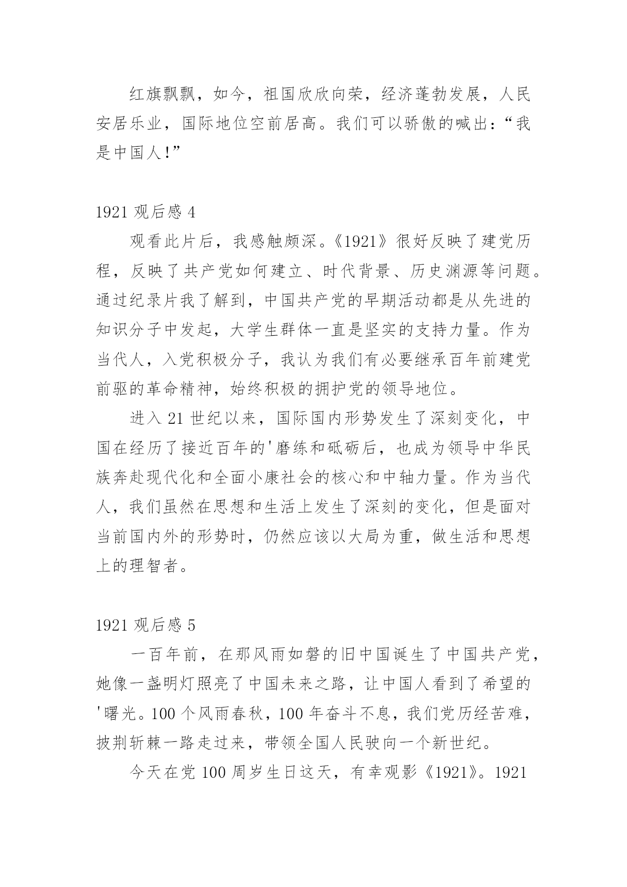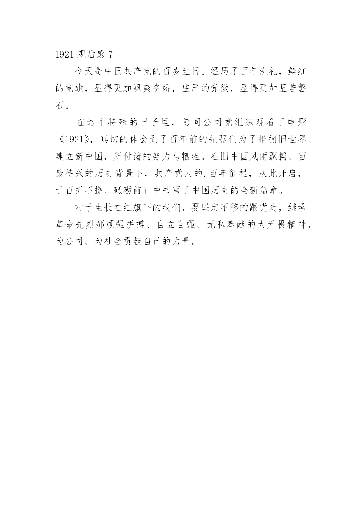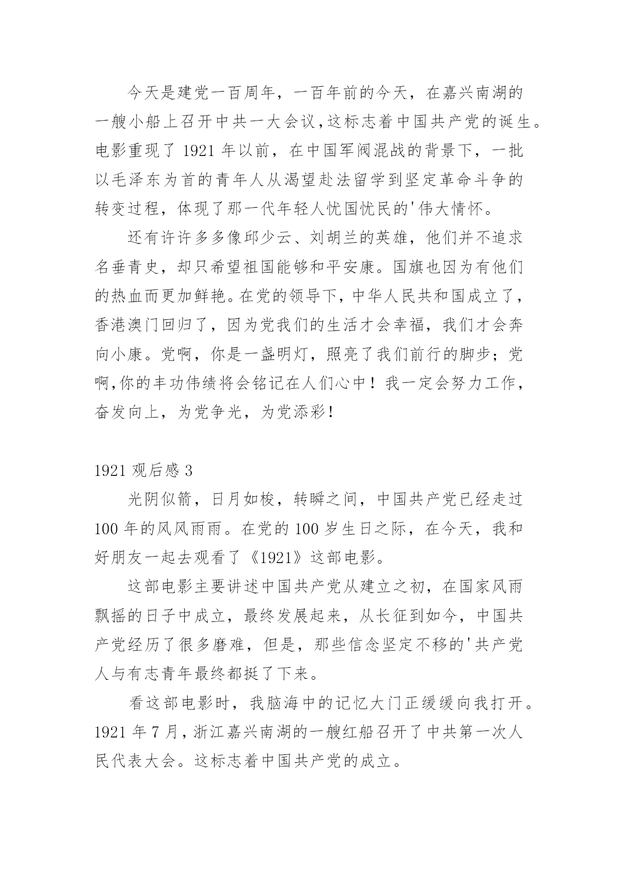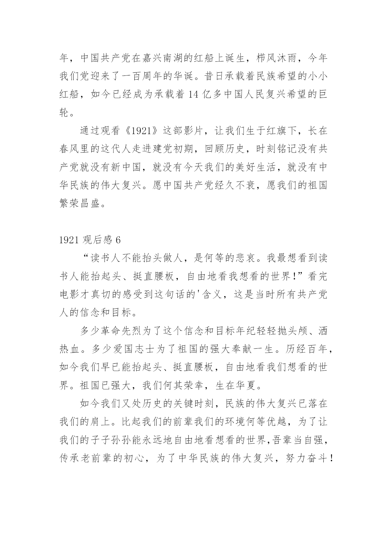 1921观后感看完一部作品以后,相信大家的收获肯定不少吧,何不写一篇观后感记录下呢?那么观后感到底应该怎么写呢?以下是小编精心整理的1921观后感,希望能够帮助到大家。1921观后感1《1921》的观感还挺不错的,在历史时空的特殊节点,凸显出一群飘摇年代仍身怀热血的年轻人。由于摄制班底的高规格,之前更加担心青年演员在表演层面的问题。但看完后,没想到演员的群戏反而是电影很大的亮点——尤其是黄轩的.表演,无疑是群像中最为令人感动的。影片聚焦到1921年中共一大召开前的历史漩涡中,黄轩饰演的李达,在当时负责筹备和组织“一大”的会务事宜。他是典型的知识分子,片中的一言一行,满怀救国理想,同时也能让人看到那份至情至性的文人气质。黄轩的演绎不仅契合李达的身份背景与人物情境,而且还在好几场戏中,展现出了一种令人共情的能量。印象尤其深刻的,是他在天台上划燃火柴后唱国际歌,与妻子的那些日常互动,以及光脚站在屋顶上迎接晨曦的太阳,都是将理想主义与生活的烟火气相连,戏的质感挺高级。1921观后感2今天是建党一百周年,一百年前的今天,在嘉兴南湖的一艘小船上召开中共一大会议,这标志着中国共产党的诞生。电影重现了1921年以前,在中国军阀混战的背景下,一批以毛泽东为首的青年人从渴望赴法留学到坚定革命斗争的转变过程,体现了那一代年轻人忧国忧民的'伟大情怀。还有许许多多像邱少云、刘胡兰的英雄,他们并不追求名垂青史,却只希望祖国能够和平安康。国旗也因为有他们的热血而更加鲜艳。在党的领导下,中华人民共和国成立了,香港澳门回归了,因为党我们的生活才会幸福,我们才会奔向小康。党啊,你是一盏明灯,照亮了我们前行的脚步;党啊,你的丰功伟绩将会铭记在人们心中!我一定会努力工作,奋发向上,为党争光,为党添彩!1921观后感3光阴似箭,日月如梭,转瞬之间,中国共产党已经走过100年的风风雨雨。在党的100岁生日之际,在今天,我和好朋友一起去观看了《1921》这部电影。这部电影主要讲述中国共产党从建立之初,在国家风雨飘摇的日子中成立,最终发展起来,从长征到如今,中国共产党经历了很多磨难,但是,那些信念坚定不移的'共产党人与有志青年最终都挺了下来。看这部电影时,我脑海中的记忆大门正缓缓向我打开。1921年7月,浙江嘉兴南湖的一艘红船召开了中共第一次人民代表大会。这标志着中国共产党的成立。红旗飘飘,如今,祖国欣欣向荣,经济蓬勃发展,人民安居乐业,国际地位空前居高。我们可以骄傲的喊出:“我是中国人!”1921观后感4观看此片后,我感触颇深。《1921》很好反映了建党历程,反映了共产党如何建立、时代背景、历史渊源等问题。通过纪录片我了解到,中国共产党的早期活动都是从先进的知识分子中发起,大学生群体一直是坚实的支持力量。作为当代人,入党积极分子,我认为我们有必要继承百年前建党前驱的革命精神,始终积极的拥护党的领导地位。进入21世纪以来,国际国内形势发生了深刻变化,中国在经历了接近百年的'磨练和砥砺后,也成为领导中华民族奔赴现代化和全面小康社会的核心和中轴力量。作为当代人,我们虽然在思想和生活上发生了深刻的变化,但是面对当前国内外的形势时,仍然应该以大局为重,做生活和思想上的理智者。1921观后感5一百年前,在那风雨如磐的旧中国诞生了中国共产党,她像一盏明灯照亮了中国未来之路,让中国人看到了希望的'曙光。100个风雨春秋,100年奋斗不息,我们党历经苦难,披荆斩棘一路走过来,带领全国人民驶向一个新世纪。今天在党100周岁生日这天,有幸观影《1921》。1921年,中国共产党在嘉兴南湖的红船上诞生,栉风沐雨,今年我们党迎来了一百周年的华诞。昔日承载着民族希望的小小红船,如今已经成为承载着14亿多中国人民复兴希望的巨轮。通过观看《1921》这部影片,让我们生于红旗下,长在春风里的这代人走进建党初期,回顾历史,时刻铭记没有共产党就没有新中国,就没有今天我们的美好生活,就没有中华民族的伟大复兴。愿中国共产党经久不衰,愿我们的祖国繁荣昌盛。1921观后感6“读书人不能抬头做人,是何等的悲哀。我最想看到读书人能抬起头、挺直腰板,自由地看我想看的世界!”看完电影才真切的感受到这句话的'含义,这是当时所有共产党人的信念和目标。多少革命先烈为了这个信念和目标年纪轻轻抛头颅、洒热血。多少爱国志士为了祖国的强大奉献一生。历经百年,如今我们早已能抬起头、挺直腰板,自由地看我们想看的世界。祖国已强大,我们何其荣幸,生在华夏。如今我们又处历史的关键时刻,民族的伟大复兴已落在我们的肩上。比起我们的前辈我们的环境何等优越,为了让我们的子子孙孙能永远地自由地看想看的世界,吾辈当自强,传承老前辈的初心,为了中华民族的伟大复兴,努力奋斗!1921观后感7今天是中国共产党的百岁生日。经历了百年洗礼,鲜红的党旗,显得更加飒爽多