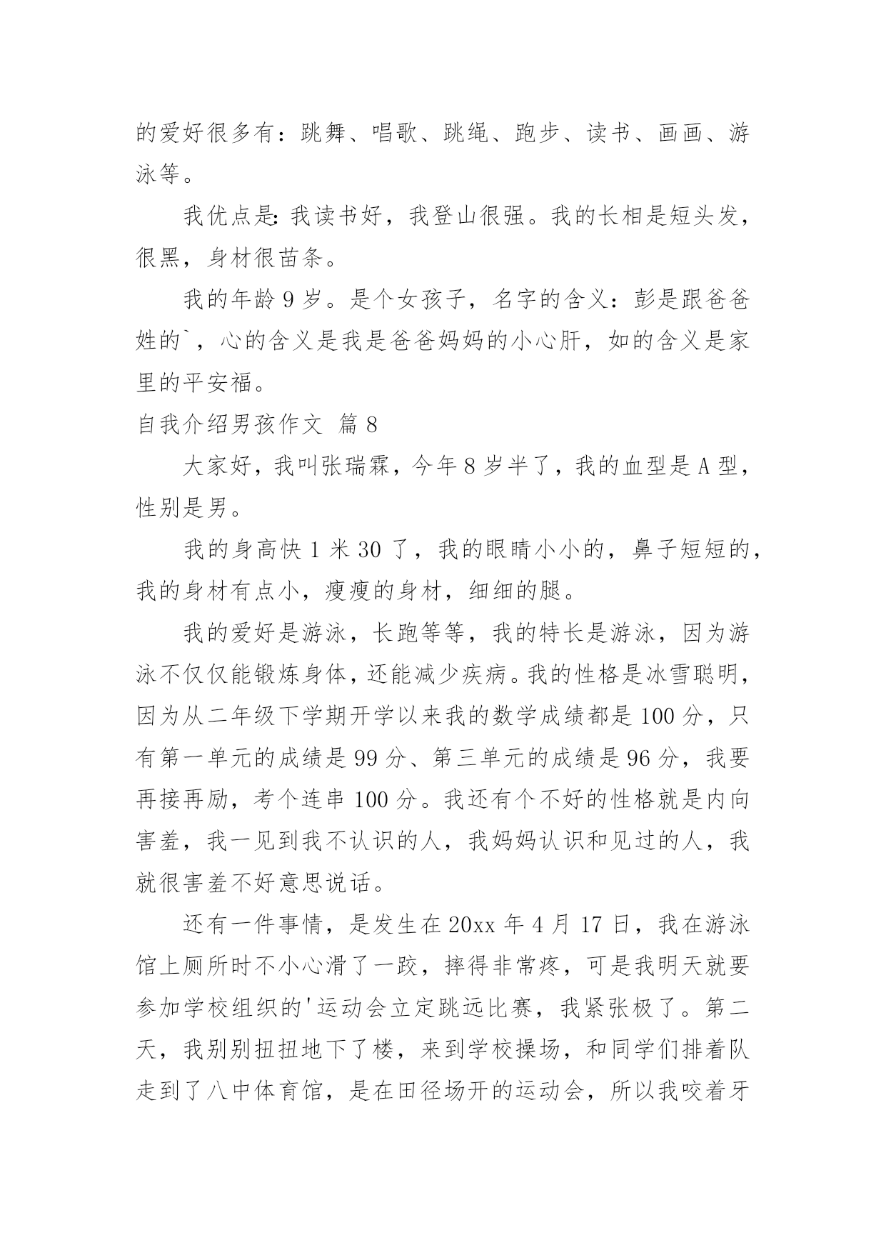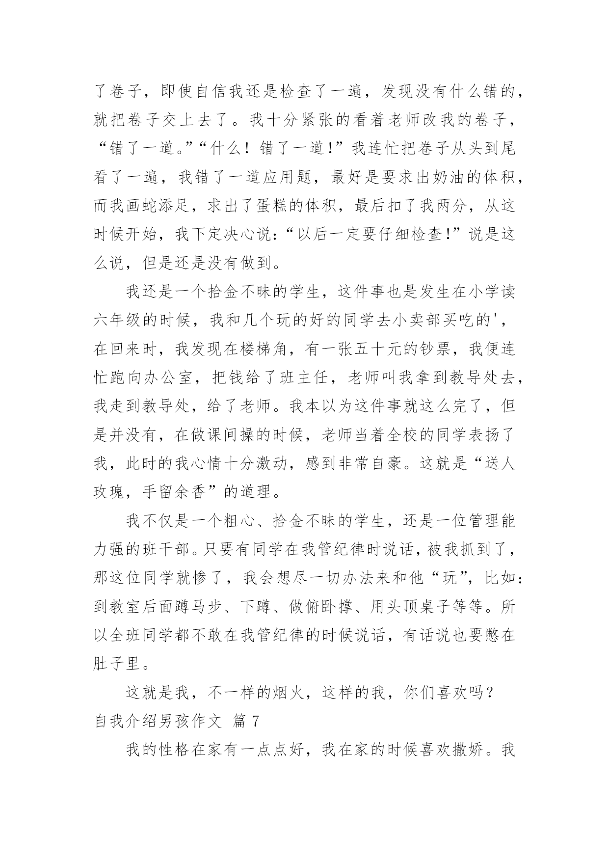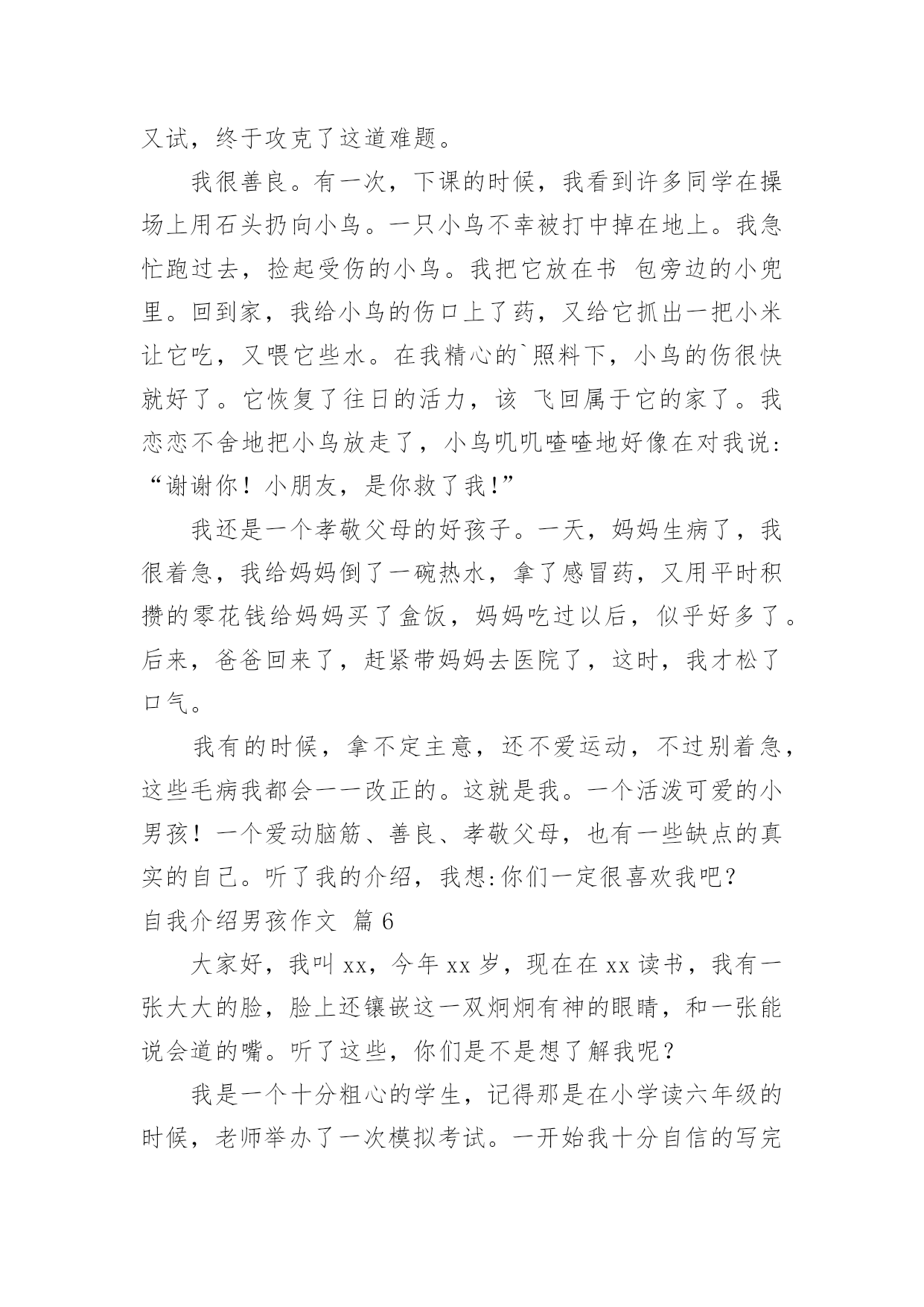 自我介绍男孩作文关于自我介绍男孩作文汇编八篇在日常的学习、工作、生活中,大家都写过作文吧,借助作文人们可以实现文化交流的目的。那么,怎么去写作文呢?下面是小编收集整理的自我介绍男孩作文8篇,欢迎大家分享。自我介绍男孩作文篇1我叫陈凯闻,我今年已经10周岁了,我是一个活泼好动的男孩子。我有一头乌黑的.短发,浓浓的眉毛眉毛下有一双水灵灵的大眼睛,鼻直口方,天生一张薄嘴皮子,能说会道,能不厌其烦地与你滔滔不绝地论上老半天。即使在失利的情况下,我也面无惧色,会寻找一切机会向你发起进攻,挽回失利的局面,且从不是大将风度。我受到了许多人的赞扬。我妈妈姓“马”,她是梨州中学的初一(7)班的语文老师和班主任,他还是初一(8)班的语文老师,她做什么事都一丝不苟,连打扫卫生也不放过,一直到值日生打扫完才离开学校。我爸爸姓陈,他在环保局工作,他平常都很晚会家。自我介绍男孩作文篇2我姓x,名xx,顾名思义我的名字就是渊博广大四通八达之意,是我妈妈给我取的名字,好听吧!我今年9岁,是xx街三年级的学生。大家一定还不熟悉我吧,那我就介绍一个自己吧!我的模样没什么特殊,就是个子不太高。一头乌黑的头发,一张稚气的瓜子脸,有一双明亮的眼睛,秀气的小嘴,穿着细细的裤子,一个十足的小帅哥。在学校里,是个积极发言,学习认真,受老师表扬的好学生;而在家里却像调皮的小猴子。我的爱好是:一是喜欢学习,特别是数学;二是好画画;三是练书法。我最大的优点就是刻苦努力,上学的路上,妈妈总是给我出二十道计算题考我,要算不出来决不罢休,而且我每天都练口算,一定坚持到成功。学习滑冰的'时候,我从不怕摔倒,摔倒了再爬起来,继续练习,靠着这种毅力,最后我成了一个滑冰高手。我的优点虽然很可贵,但是我也有缺点。我的缺点是慢,不改掉这年毛病,永远没有出息。上学走的非常慢,总是让妈妈催,吃饭的时候也让妈妈催……这就是我,你们喜欢我吗?喜欢就说出来。自我介绍男孩作文篇3我的名字叫汤若风。一听这名字,不同的人就有不同的看法:像我爸妈那种酷爱看武侠小说的人,会认为这名字很大侠风范;像我姨妈那种喜欢说成语的.人,认为这名字跟“弱不禁风”有联系。但不管怎么说,听这名字就知道我是个男孩子。我今年九岁,读小学三年级了。我的模样很普通:圆头圆眼圆肚子,脚已大得超过妈妈了,通常的人都会把我看大两岁以上。我的优点是聪明。刚入学时,我就能解答老师出的数学题。每次考试下来,我都能得A。我的缺点大于优点,老师常批评我上课不专心,下课爱打闹,骄傲自满;妈妈总唠叨我学习不自觉,不讲文明。我的爱好众多,男孩子喜欢的玩电脑、踢球、打架??我一个不落下。这就是我,一个独特的男孩子。我有信心早日改正自己的缺点,光大自己的优点,做一个超人!点评:这篇习作的开头从名字写起,点出不同的人对名字的不同看法。小作者没有具体描写自己的外貌,但是抓住了一个“大”字来选择材料,这样也比较生动。紧接着介绍了自己的优点和缺点,一笔勾出了自己的爱好之多,最后来了个画龙点睛式的结尾。自我介绍男孩作文篇4我——郑晓航,一个快乐的男孩儿,一个讨人喜欢的男孩儿,一个调皮的男孩儿。我有一双小眼睛,一张能说会道的.嘴巴,最明显的要数我那双大耳朵,一看见就让人想起肥肥胖胖猪八戒的耳朵。我最喜欢干的事就是看书。有一次,我拿着刚买的书,飞快地向家跑去,一到家,我换完鞋,就直奔书房,拿起爱不释手的书本,坐在书桌前,津津有味地看了起来。看着看着,我好像走进了书里,来到了另一个世界,和主角一起制造“肥帛订书机”……正当我自由自在地遨游在知识的海洋里时,妈妈却来了:“航航,你的同学来找你玩了。”我一口回答说:“现在我没空,你叫他以后再来。”说完,我就又一次钻进了知识的海洋。不知不觉,又过了40分钟,妈妈又来了,说:“航航,出去歇歇再回来。”我只得“遵旨”。在外面,我总是想起那些故事,一想到这里,我就希望时间过快一点儿,让我早点儿回家看书。我就是我,一个最喜欢看书的人。欢迎大家和我交朋友。自我介绍男孩作文篇5大家好!我叫于子博,今年十岁,我是个三年级的小学生。我的兴趣、爱好、缺点……都记录在这篇作文里了,要想了解我,就请你认真地阅读下面的内容吧!我长着一张国字型的脸,乌黑的头发,一双亮晶晶的大眼睛。高高的鼻梁下,有一张能说会道的小嘴巴。我的爱好多多。喜欢学数学,写作文,所以参加了奥数班,作文班,为了更好的提高自己的水平。我的钢琴弹得也不赖,在钢琴班里,还经常受到老师的表扬哩!虽然我是个男孩子,但我很爱哭。走路不小心摔倒了我要哭;爸爸妈妈批评我了,我要哭;有什么事不顺我的心思,我也要哭,不过,我以后一定要克服这个缺点的。我非常善于动脑筋。一次,在奥数课上,老师出了一道附加题。同学们遇到这种情况都慌了,可我却镇定自若。我把这道题仔仔细细地读了几遍,运用老师教过的方法,试了又试,终于攻