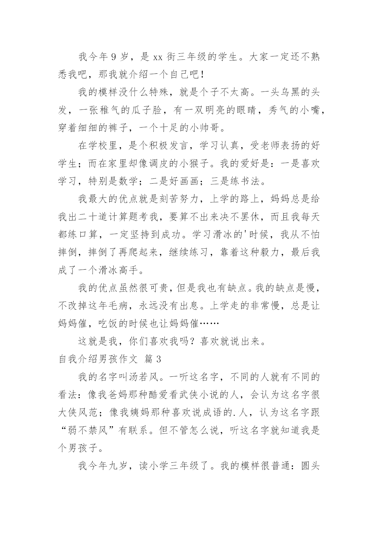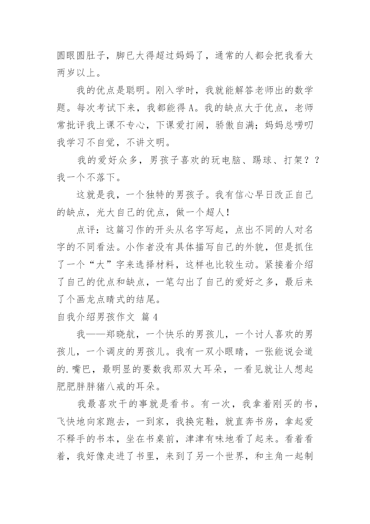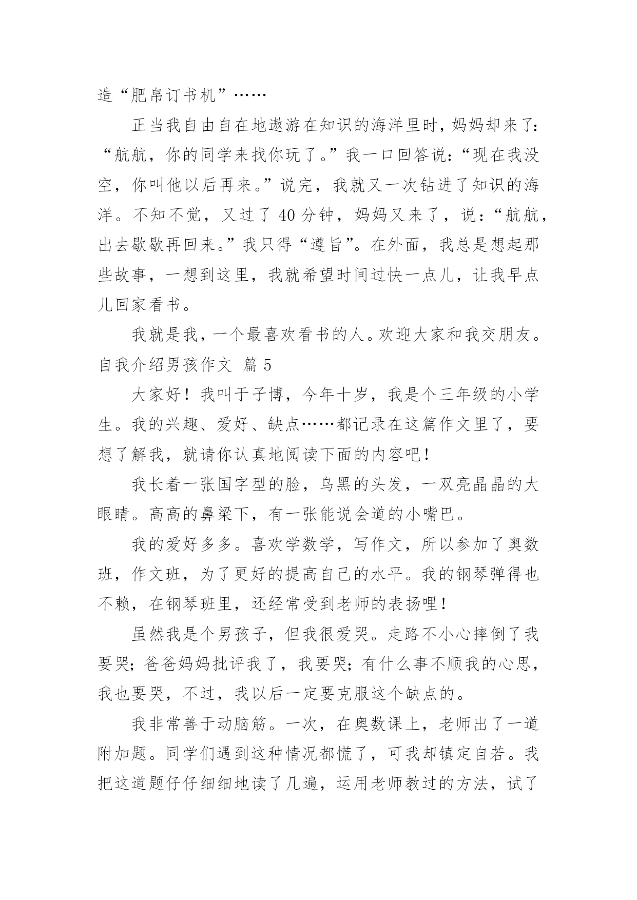 自我介绍男孩作文关于自我介绍男孩作文汇编八篇在日常的学习、工作、生活中,大家都写过作文吧,借助作文人们可以实现文化交流的目的。那么,怎么去写作文呢?下面是小编收集整理的自我介绍男孩作文8篇,欢迎大家分享。自我介绍男孩作文篇1我叫陈凯闻,我今年已经10周岁了,我是一个活泼好动的男孩子。我有一头乌黑的.短发,浓浓的眉毛眉毛下有一双水灵灵的大眼睛,鼻直口方,天生一张薄嘴皮子,能说会道,能不厌其烦地与你滔滔不绝地论上老半天。即使在失利的情况下,我也面无惧色,会寻找一切机会向你发起进攻,挽回失利的局面,且从不是大将风度。我受到了许多人的赞扬。我妈妈姓“马”,她是梨州中学的初一(7)班的语文老师和班主任,他还是初一(8)班的语文老师,她做什么事都一丝不苟,连打扫卫生也不放过,一直到值日生打扫完才离开学校。我爸爸姓陈,他在环保局工作,他平常都很晚会家。自我介绍男孩作文篇2我姓x,名xx,顾名思义我的名字就是渊博广大四通八达之意,是我妈妈给我取的名字,好听吧!我今年9岁,是xx街三年级的学生。大家一定还不熟悉我吧,那我就介绍一个自己吧!我的模样没什么特殊,就是个子不太高。一头乌黑的头发,一张稚气的瓜子脸,有一双明亮的眼睛,秀气的小嘴,穿着细细的裤子,一个十足的小帅哥。在学校里,是个积极发言,学习认真,受老师表扬的好学生;而在家里却像调皮的小猴子。我的爱好是:一是喜欢学习,特别是数学;二是好画画;三是练书法。我最大的优点就是刻苦努力,上学的路上,妈妈总是给我出二十道计算题考我,要算不出来决不罢休,而且我每天都练口算,一定坚持到成功。学习滑冰的'时候,我从不怕摔倒,摔倒了再爬起来,继续练习,靠着这种毅力,最后我成了一个滑冰高手。我的优点虽然很可贵,但是我也有缺点。我的缺点是慢,不改掉这年毛病,永远没有出息。上学走的非常慢,总是让妈妈催,吃饭的时候也让妈妈催……这就是我,你们喜欢我吗?喜欢就说出来。自我介绍男孩作文篇3我的名字叫汤若风。一听这名字,不同的人就有不同的看法:像我爸妈那种酷爱看武侠小说的人,会认为这名字很大侠风范;像我姨妈那种喜欢说成语的.人,认为这名字跟“弱不禁风”有联系。但不管怎么说,听这名字就知道我是个男孩子。我今年九岁,读小学三年级了。我的模样很普通:圆头圆眼圆肚子,脚已大得超过妈妈了,通常的人都会把我看大两岁以上。我的优点是聪明。刚入学时,我就能解答老师出的数学题。每次考试下来,我都能得A。我的缺点大于优点,老师常批评我上课不专心,下课爱打闹,骄傲自满;妈妈总唠叨我学习不自觉,不讲文明。我的爱好众多,男孩子喜欢的玩电脑、踢球、打架??我一个不落下。这就是我,一个独特的男孩子。我有信心早日改正自己的缺点,光大自己的优点,做一个超人!点评:这篇习作的开头从名字写起,点出不同的人对名字的不同看法。小作者没有具体描写自己的外貌,但是抓住了一个“大”字来选择材料,这样也比较生动。紧接着介绍了自己的优点和缺点,一笔勾出了自己的爱好之多,最后来了个画龙点睛式的结尾。自我介绍男孩作文篇4我——郑晓航,一个快乐的男孩儿,一个讨人喜欢的男孩儿,一个调皮的男孩儿。我有一双小眼睛,一张能说会道的.嘴巴,最明显的要数我那双大耳朵,一看见就让人想起肥肥胖胖猪八戒的耳朵。我最喜欢干的事就是看书。有一次,我拿着刚买的书,飞快地向家跑去,一到家,我换完鞋,就直奔书房,拿起爱不释手的书本,坐在书桌前,津津有味地看了起来。看着看着,我好像走进了书里,来到了另一个世界,和主角一起制造“肥帛订书机”……正当我自由自在地遨游在知识的海洋里时,妈妈却来了:“航航,你的同学来找你玩了。”我一口回答说:“现在我没空,你叫他以后再来。”说完,我就又一次钻进了知识的海洋。不知不觉,又过了40分钟,妈妈又来了,说:“航航,出去歇歇再回来。”我只得“遵旨”。在外面,我总是想起那些故事,一想到这里,我就希望时间过快一点儿,让我早点儿回家看书。我就是我,一个最喜欢看书的人。欢迎大家和我交朋友。自我介绍男孩作文篇5大家好!我叫于子博,今年十岁,我是个三年级的小学生。我的兴趣、爱好、缺点……都记录在这篇作文里了,要想了解我,就请你认真地阅读下面的内容吧!我长着一张国字型的脸,乌黑的头发,一双亮晶晶的大眼睛。高高的鼻梁下,有一张能说会道的小嘴巴。我的爱好多多。喜欢学数学,写作文,所以参加了奥数班,作文班,为了更好的提高自己的水平。我的钢琴弹得也不赖,在钢琴班里,还经常受到老师的表扬哩!虽然我是个男孩子,但我很爱哭。走路不小心摔倒了我要哭;爸爸妈妈批评我了,我要哭;有什么事不顺我的心思,我也要哭,不过,我以后一定要克服这个缺点的。我非常善于动脑筋。一次,在奥数课上,老师出了一道附加题。同学们遇到这种情况都慌了,可我却镇定自若。我把这道题仔仔细细地读了几遍,运用老师教过的方法,试了又试,终于攻