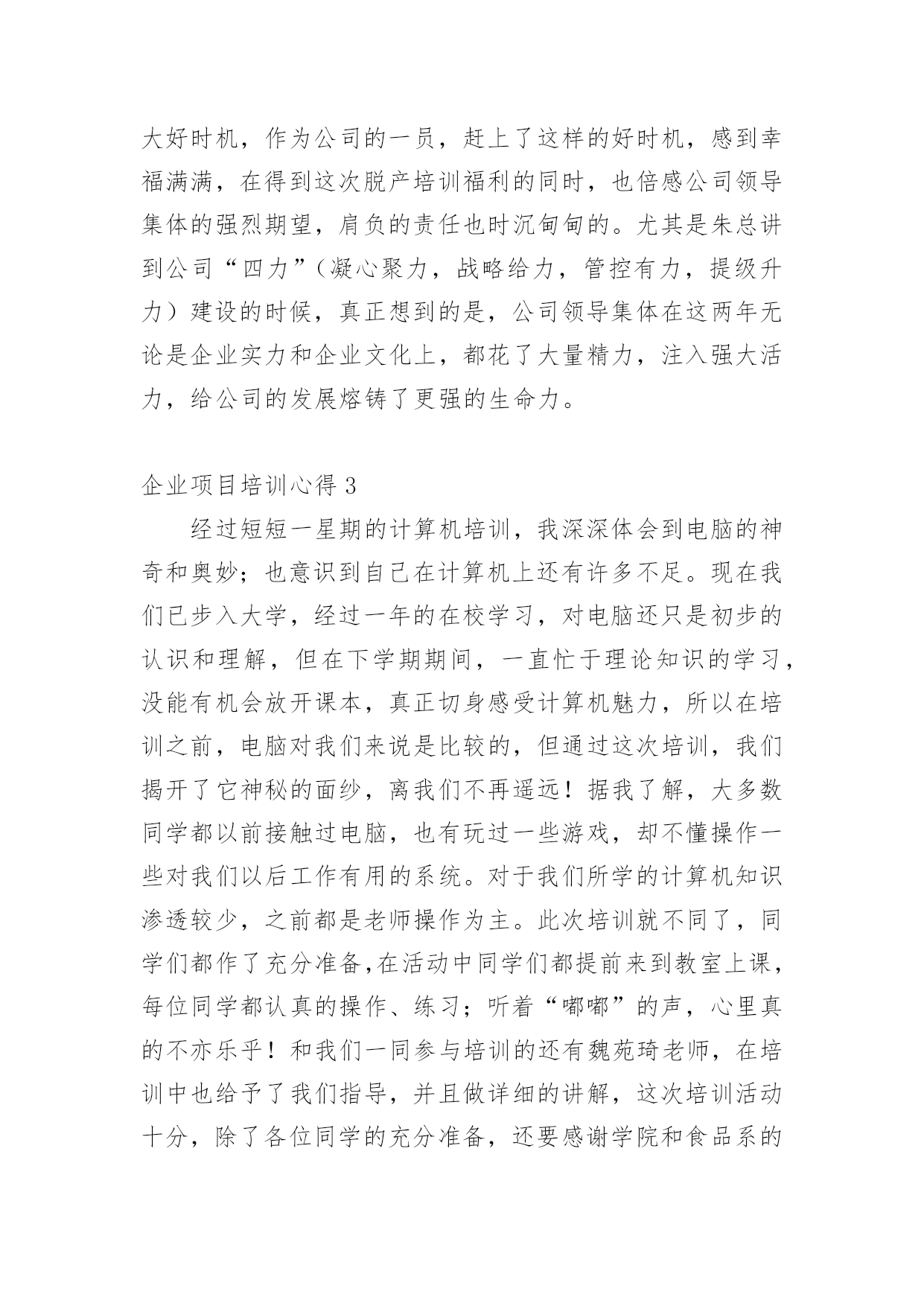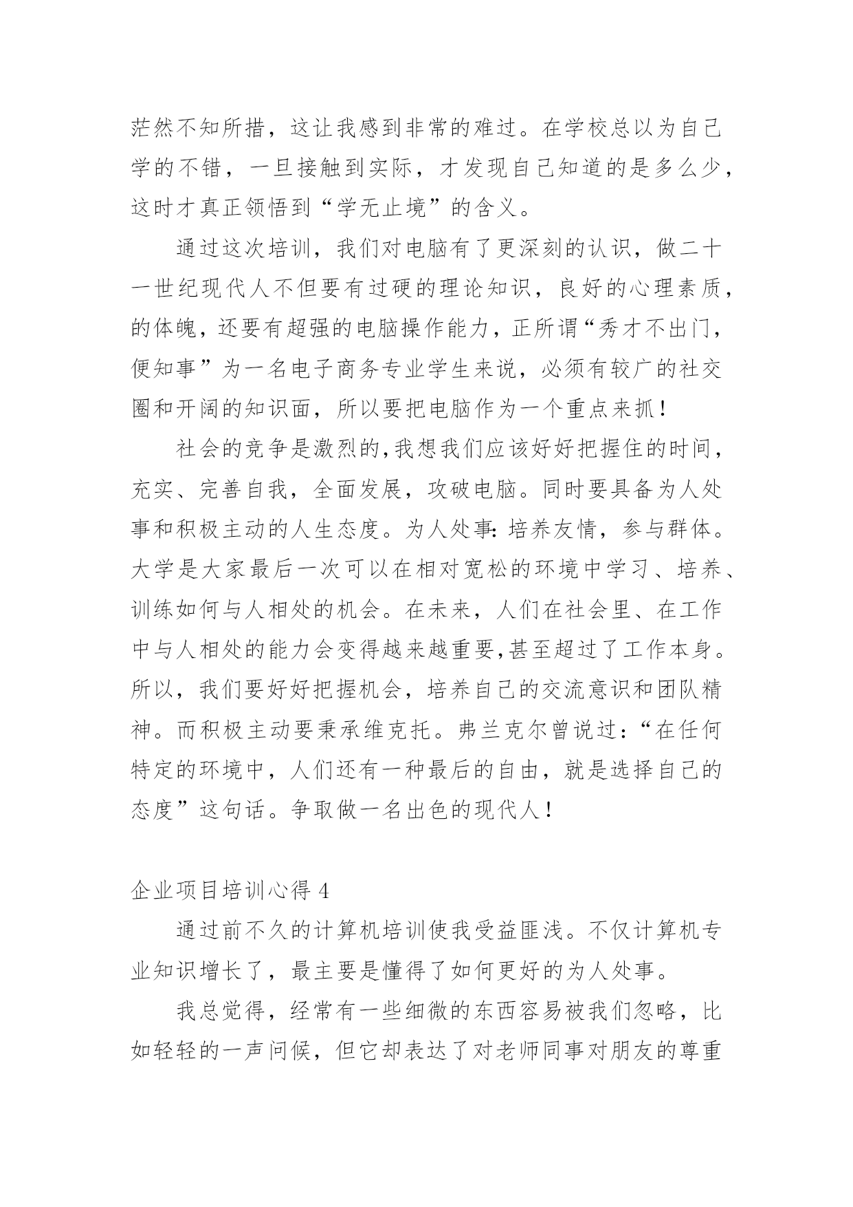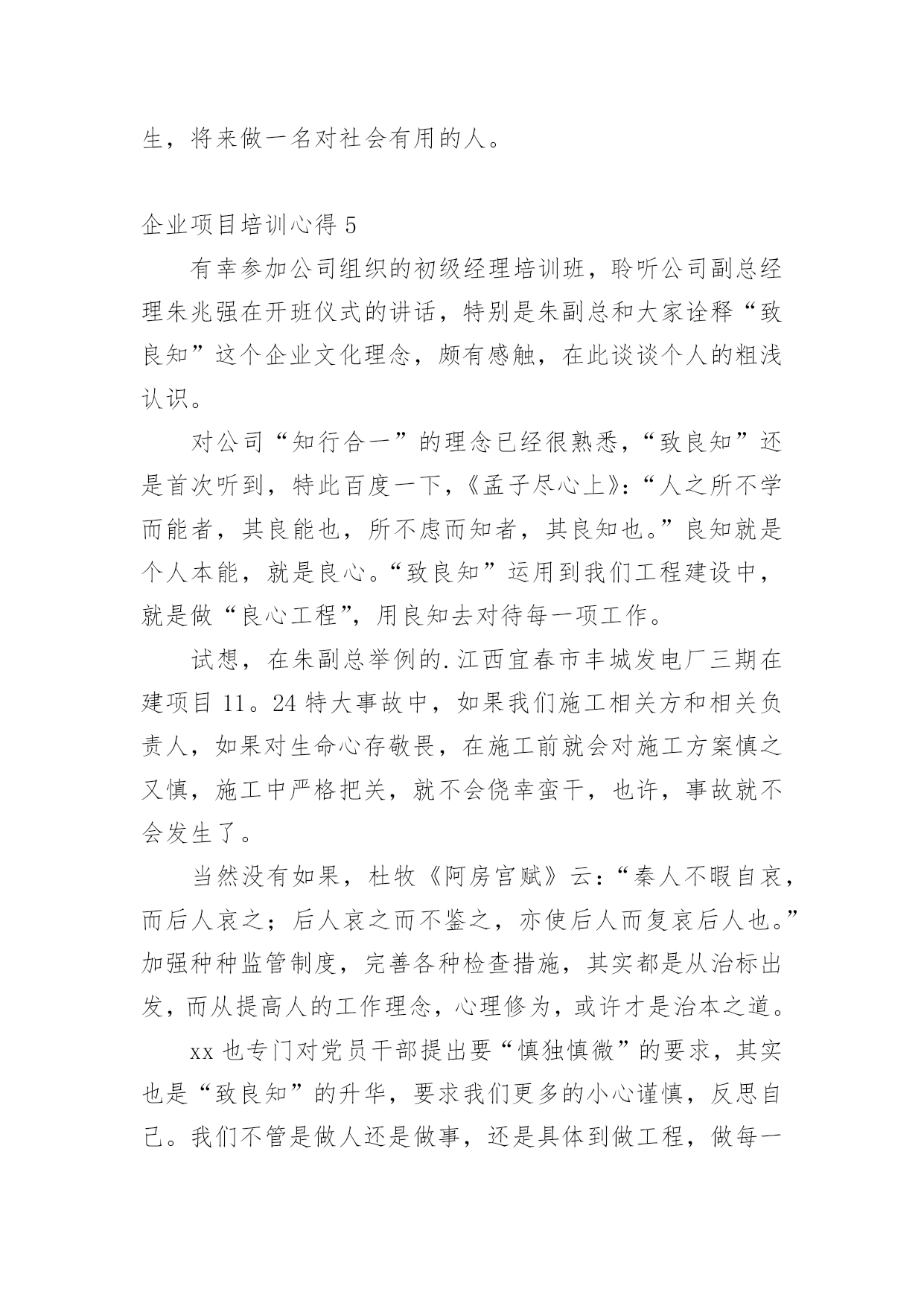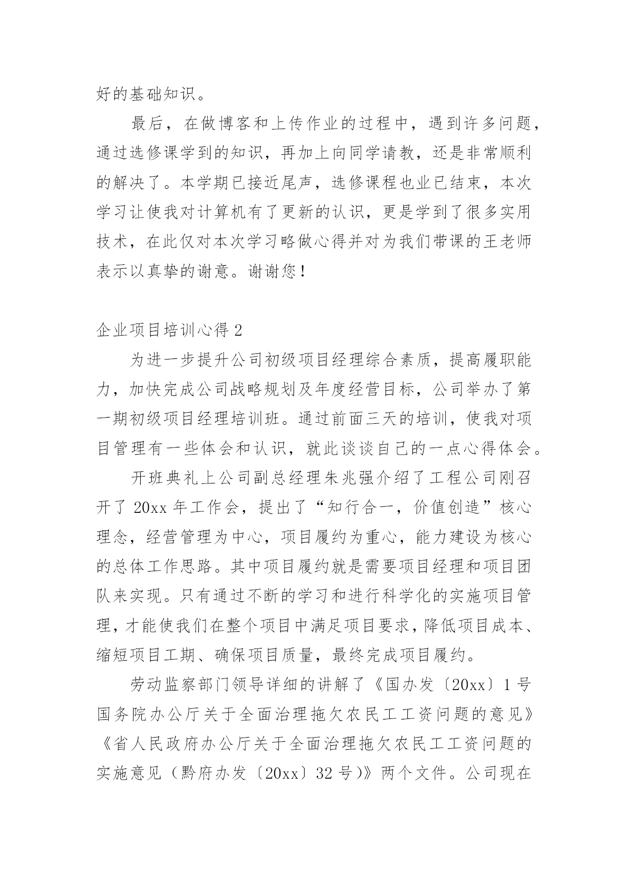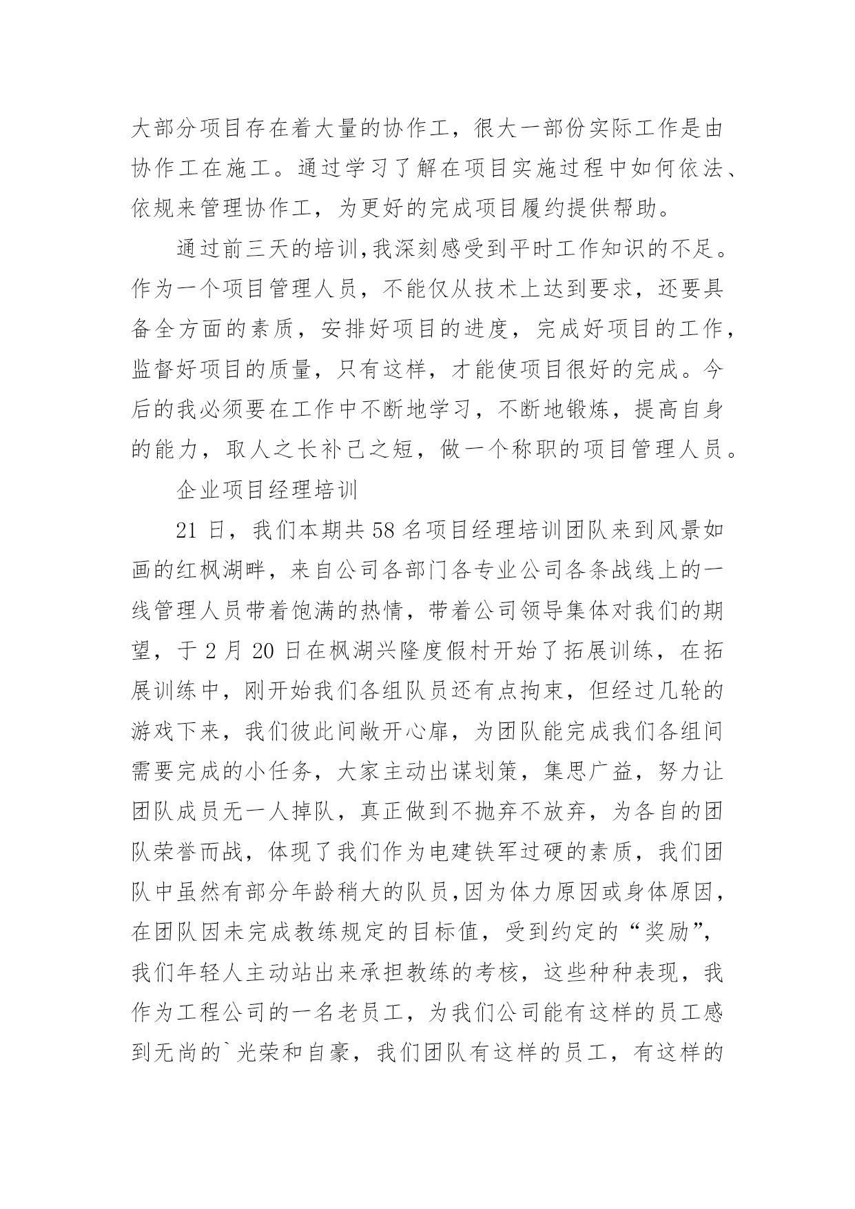 企业项目培训心得我们在一些事情上受到启发后,常常可以将它们写成一篇心得体会,这样能够给人努力向前的动力。相信许多人会觉得心得体会很难写吧,以下是小编收集整理的企业项目培训心得,仅供参考,欢迎大家阅读。企业项目培训心得1通过为期一个学期的选修课程的学习,作为一个涉及不深的我来说收益匪浅。那么以下就是在此次学习过程中我所心得出来的关于计算机网络学习中所体会到的一些值得记录的心得。我在读的时候第一次接触计算机觉得很新鲜。我清晰的记得,当时有一个清晰的想法,那就是学好计算机。随着接触的深入,对计算机的'认识越来越深入,同时也产生许多不明白的地方。在报选修课的时候,看到有《计算机网络》这门课,我就毫不犹豫地选了。这正是我需要掌握的技术啊!掌握《计算机网络》我学到了许多知识,许多以前对计算机迷惑的地方。在王老师的讲解和实际演练下我明白了以前不太懂的地方。比如,,城域网和广域网之间的联系和区别。明白了域名是怎么回事。TCP/IP以前不知道是做什么用的。在选修课里我明白了。还有等等。总之,我以前迷惑的地方明白了。明白的知识更加深入了。选修网络课,让我对有了很大的认识,对我来说,是我进一步掌握计算机网络技术很好的基础知识。最后,在做博客和上传作业的过程中,遇到许多问题,通过选修课学到的知识,再加上向同学请教,还是非常顺利的解决了。本学期已接近尾声,选修课程也业已结束,本次学习让使我对计算机有了更新的认识,更是学到了很多实用技术,在此仅对本次学习略做心得并对为我们带课的王老师表示以真挚的谢意。谢谢您!企业项目培训心得2为进一步提升公司初级项目经理综合素质,提高履职能力,加快完成公司战略规划及年度经营目标,公司举办了第一期初级项目经理培训班。通过前面三天的培训,使我对项目管理有一些体会和认识,就此谈谈自己的一点心得体会。开班典礼上公司副总经理朱兆强介绍了工程公司刚召开了20xx年工作会,提出了“知行合一,价值创造”核心理念,经营管理为中心,项目履约为重心,能力建设为核心的总体工作思路。其中项目履约就是需要项目经理和项目团队来实现。只有通过不断的学习和进行科学化的实施项目管理,才能使我们在整个项目中满足项目要求,降低项目成本、缩短项目工期、确保项目质量,最终完成项目履约。劳动监察部门领导详细的讲解了《国办发〔20xx〕1号国务院办公厅关于全面治理拖欠农民工工资问题的意见》《省人民政府办公厅关于全面治理拖欠农民工工资问题的实施意见(黔府办发〔20xx〕32号)》两个文件。公司现在大部分项目存在着大量的协作工,很大一部份实际工作是由协作工在施工。通过学习了解在项目实施过程中如何依法、依规来管理协作工,为更好的完成项目履约提供帮助。通过前三天的培训,我深刻感受到平时工作知识的不足。作为一个项目管理人员,不能仅从技术上达到要求,还要具备全方面的素质,安排好项目的进度,完成好项目的工作,监督好项目的质量,只有这样,才能使项目很好的完成。今后的我必须要在工作中不断地学习,不断地锻炼,提高自身的能力,取人之长补己之短,做一个称职的项目管理人员。企业项目经理培训21日,我们本期共58名项目经理培训团队来到风景如画的红枫湖畔,来自公司各部门各专业公司各条战线上的一线管理人员带着饱满的热情,带着公司领导集体对我们的期望,于2月20日在枫湖兴隆度假村开始了拓展训练,在拓展训练中,刚开始我们各组队员还有点拘束,但经过几轮的游戏下来,我们彼此间敞开心扉,为团队能完成我们各组间需要完成的小任务,大家主动出谋划策,集思广益,努力让团队成员无一人掉队,真正做到不抛弃不放弃,为各自的团队荣誉而战,体现了我们作为电建铁军过硬的素质,我们团队中虽然有部分年龄稍大的队员,因为体力原因或身体原因,在团队因未完成教练规定的目标值,受到约定的“奖励”,我们年轻人主动站出来承担教练的考核,这些种种表现,我作为工程公司的一名老员工,为我们公司能有这样的员工感到无尚的`光荣和自豪,我们团队有这样的员工,有这样的集体,何愁公司的明天不会更强大。拓展训练完成后,我们来到了我们即将封闭训练的xx电力培训中心,2月20日晚上我们开始了本次培训的破冰之旅,在培训机构优策朱老师的安排下,大家勇跃与老师互动,积极发言,同时无论是课堂教室还是就餐食堂,我们每一位学员都做到井然有序,依然保持了一个有组织有纪律的良好作风。2月21日,公司主管安全和生产的副总经理朱兆强在本期的开班典礼上给我们上了一堂生动的企业文化课,着重讲解公司重拾xx本土文化精髓“阳明心学”公司企业文化渗透协调发展,挖掘阳明文化精华,吸收阳明心学精髓,重塑以“知行合一、价值创造”为核心价值理念的企业文化,倡导“凝心聚力是心即理”、“战略给力是良知”、“管控有力是致良知”、“提级升力是知行合一”。阳明实践心学俨然成为公司发展的加油机、助跑器。仔细回想