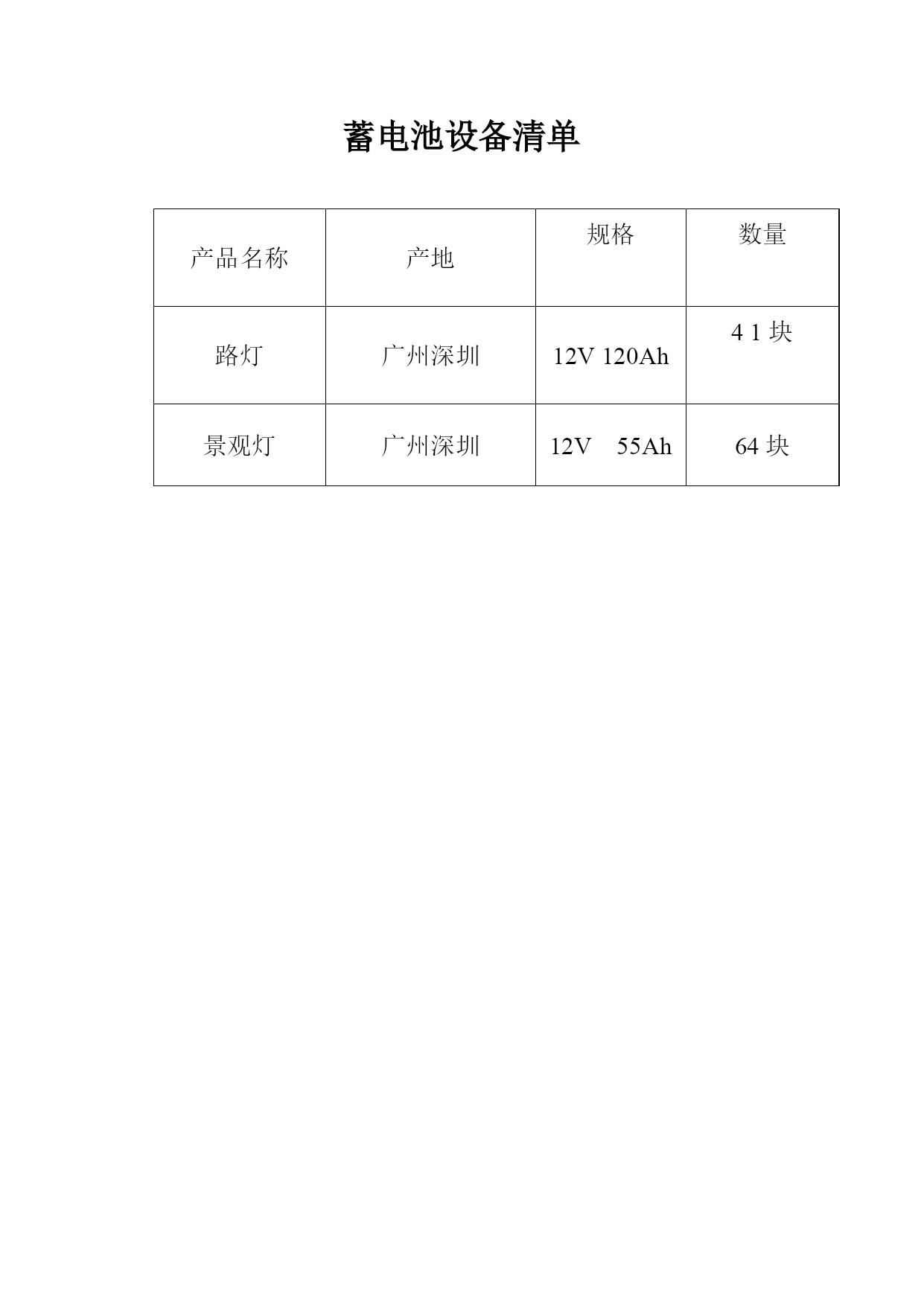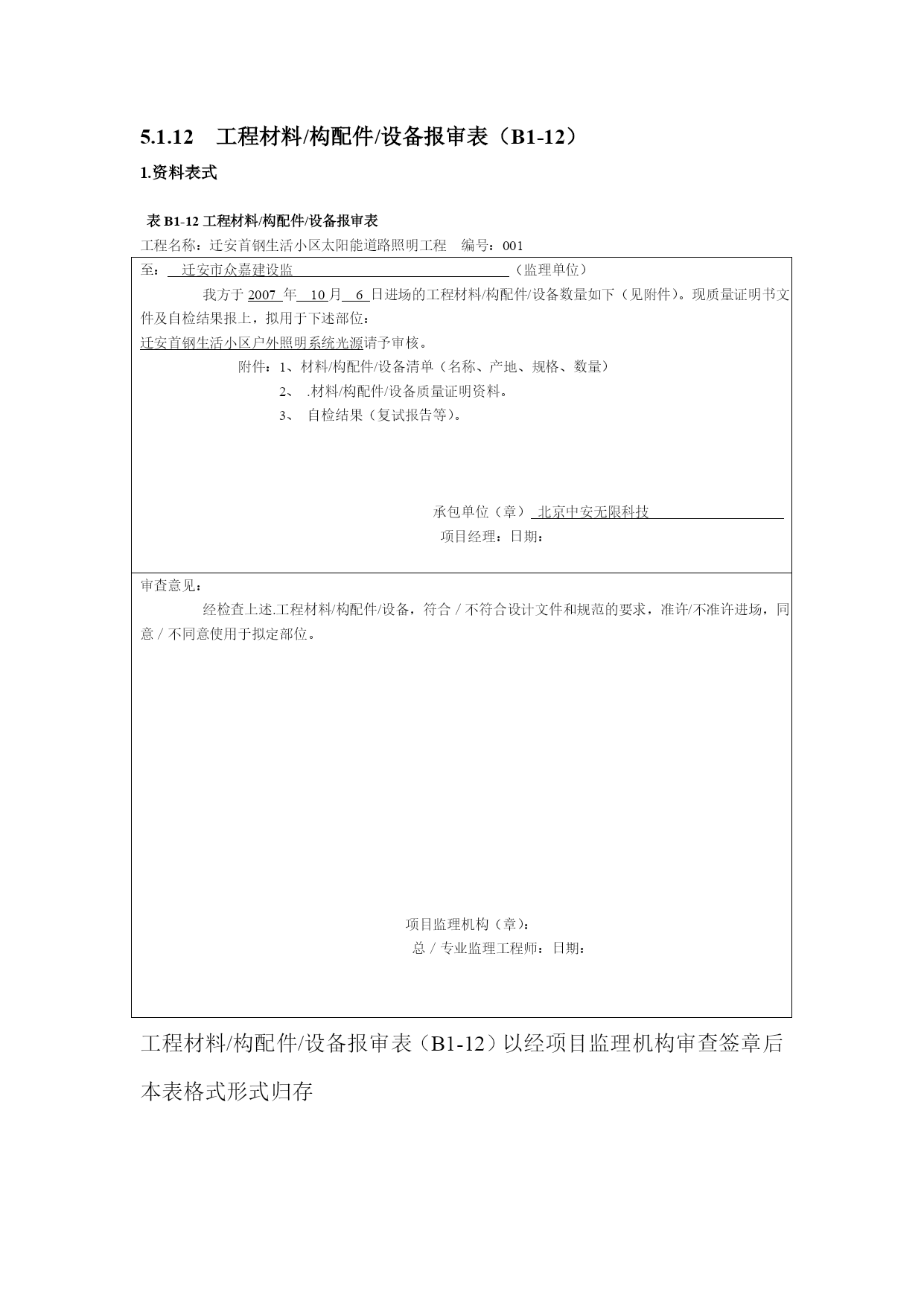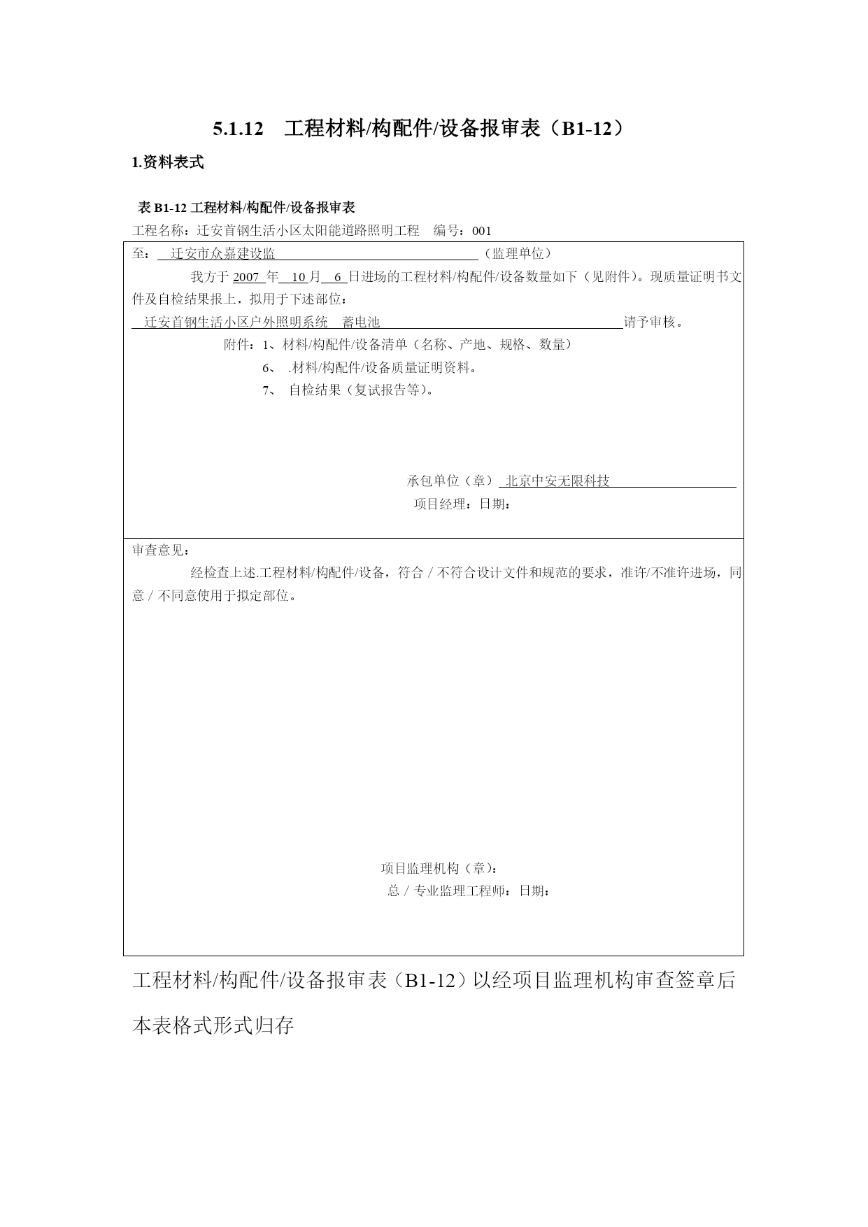 路灯验收资料表格优质资料(可以直接使用,可编辑优质资料,欢迎下载)5.1.12工程材料/构配件/设备报审表(B1-12)1.资料表式表B1-12工程材料/构配件/设备报审表工程名称:迁安首钢生活小区太阳能道路照明工程编号:001至:迁安市众嘉建设监(监理单位)我方于2007年10月6日进场的工程材料/构配件/设备数量如下(见附件)。现质量证明书文件及自检结果报上,拟用于下述部位:迁安首钢生活小区户外照明系统光源请予审核。附件:1、材料/构配件/设备清单(名称、产地、规格、数量).材料/构配件/设备质量证明资料。自检结果(复试报告等)。承包单位(章)北京中安无限科技项目经理:日期:审查意见:经检查上述.工程材料/构配件/设备,符合/不符合设计文件和规范的要求,准许/不准许进场,同意/不同意使用于拟定部位。项目监理机构(章):总/专业监理工程师:日期:工程材料/构配件/设备报审表(B1-12)以经项目监理机构审查签章后本表格式形式归存光源设备清单产品名称产地规格数量路灯北京市12V26W41盏景观灯北京市12V12W64盏合格证5.1.12工程材料/构配件/设备报审表(B1-12)1.资料表式表B1-12工程材料/构配件/设备报审表工程名称:迁安首钢生活小区太阳能道路照明工程编号:001至:迁安市众嘉建设监(监理单位)我方于2007年10月6日进场的工程材料/构配件/设备数量如下(见附件)。现质量证明书文件及自检结果报上,拟用于下述部位:迁安首钢生活小区户外照明系统灯杆请予审核。附件:1、材料/构配件/设备清单(名称、产地、规格、数量).材料/构配件/设备质量证明资料。自检结果(复试报告等)。承包单位(章)北京中安无限科技项目经理:日期:审查意见:经检查上述.工程材料/构配件/设备,符合/不符合设计文件和规范的要求,准许/不准许进场,同意/不同意使用于拟定部位。项目监理机构(章):总/专业监理工程师:日期:工程材料/构配件/设备报审表(B1-12)以经项目监理机构审查签章后本表格式形式归存灯杆设备清单产品名称产地规格数量路灯江苏高邮市6米41根景观灯江苏高邮市4米64根合格证5.1.12工程材料/构配件/设备报审表(B1-12)1.资料表式表B1-12工程材料/构配件/设备报审表工程名称:迁安首钢生活小区太阳能道路照明工程编号:001至:迁安市众嘉建设监(监理单位)我方于2007年10月6日进场的工程材料/构配件/设备数量如下(见附件)。现质量证明书文件及自检结果报上,拟用于下述部位:迁安首钢生活小区户外照明系统蓄电池请予审核。附件:1、材料/构配件/设备清单(名称、产地、规格、数量).材料/构配件/设备质量证明资料。自检结果(复试报告等)。承包单位(章)北京中安无限科技项目经理:日期:审查意见:经检查上述.工程材料/构配件/设备,符合/不符合设计文件和规范的要求,准许/不准许进场,同意/不同意使用于拟定部位。项目监理机构(章):总/专业监理工程师:日期:工程材料/构配件/设备报审表(B1-12)以经项目监理机构审查签章后本表格式形式归存蓄电池设备清单产品名称产地规格数量路灯广州深圳12V120Ah41块景观灯广州深圳12V55Ah64块合格证5.1.12工程材料/构配件/设备报审表(B1-12)1.资料表式表B1-12工程材料/构配件/设备报审表工程名称:迁安首钢生活小区太阳能道路照明工程编号:001至:迁安市众嘉建设监(监理单位)我方于2007年10月6日进场的工程材料/构配件/设备数量如下(见附件)。现质量证明书文件及自检结果报上,拟用于下述部位:迁安首钢生活小区户外照明系统控制器请予审核。附件:1、材料/构配件/设备清单(名称、产地、规格、数量).材料/构配件/设备质量证明资料。自检结果(复试报告等)。承包单位(章)北京中安无限科技项目经理:日期:审查意见:经检查上述.工程材料/构配件/设备,符合/不符合设计文件和规范的要求,准许/不准许进场,同意/不同意使用于拟定部位。项目监理机构(章):总/专业监理工程师:日期:工程材料/构配件/设备报审表(B1-12)以经项目监理机构审查签章后本表格式形式归存控制器设备清单