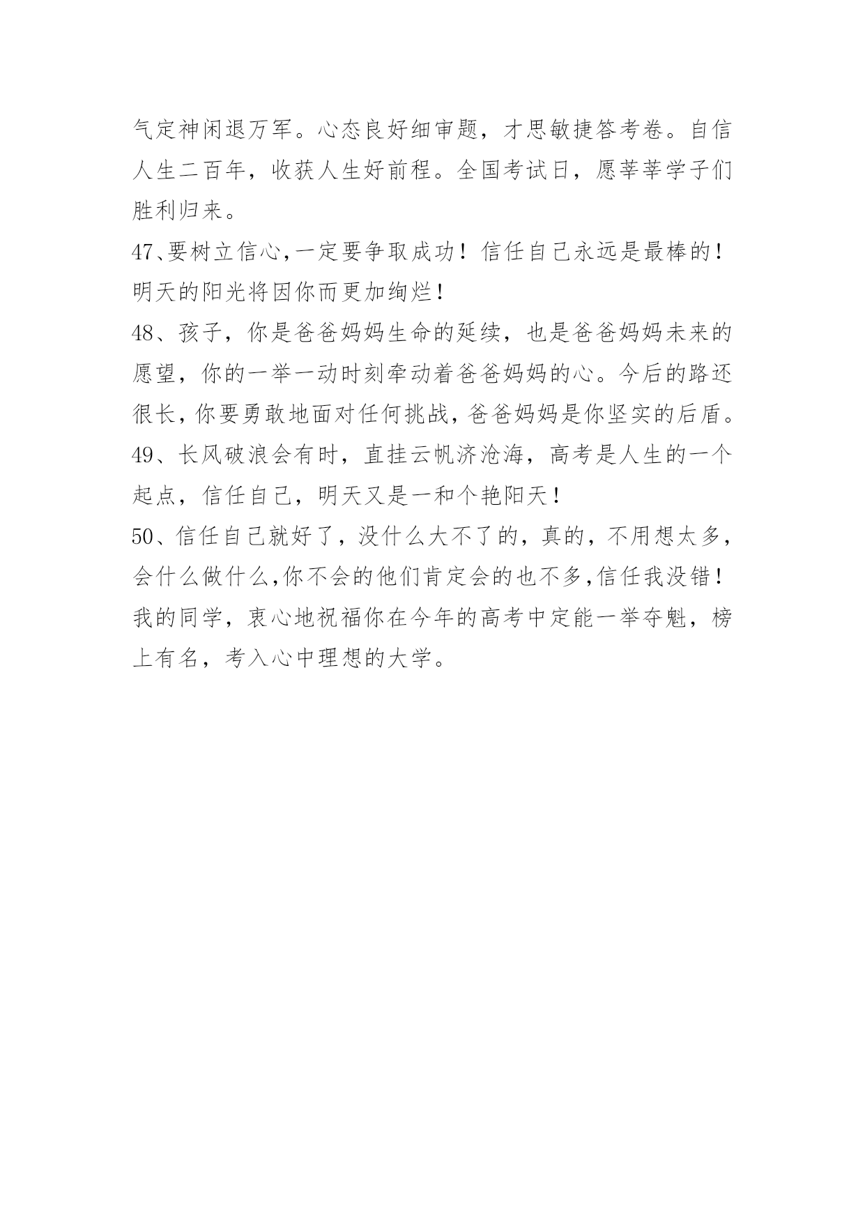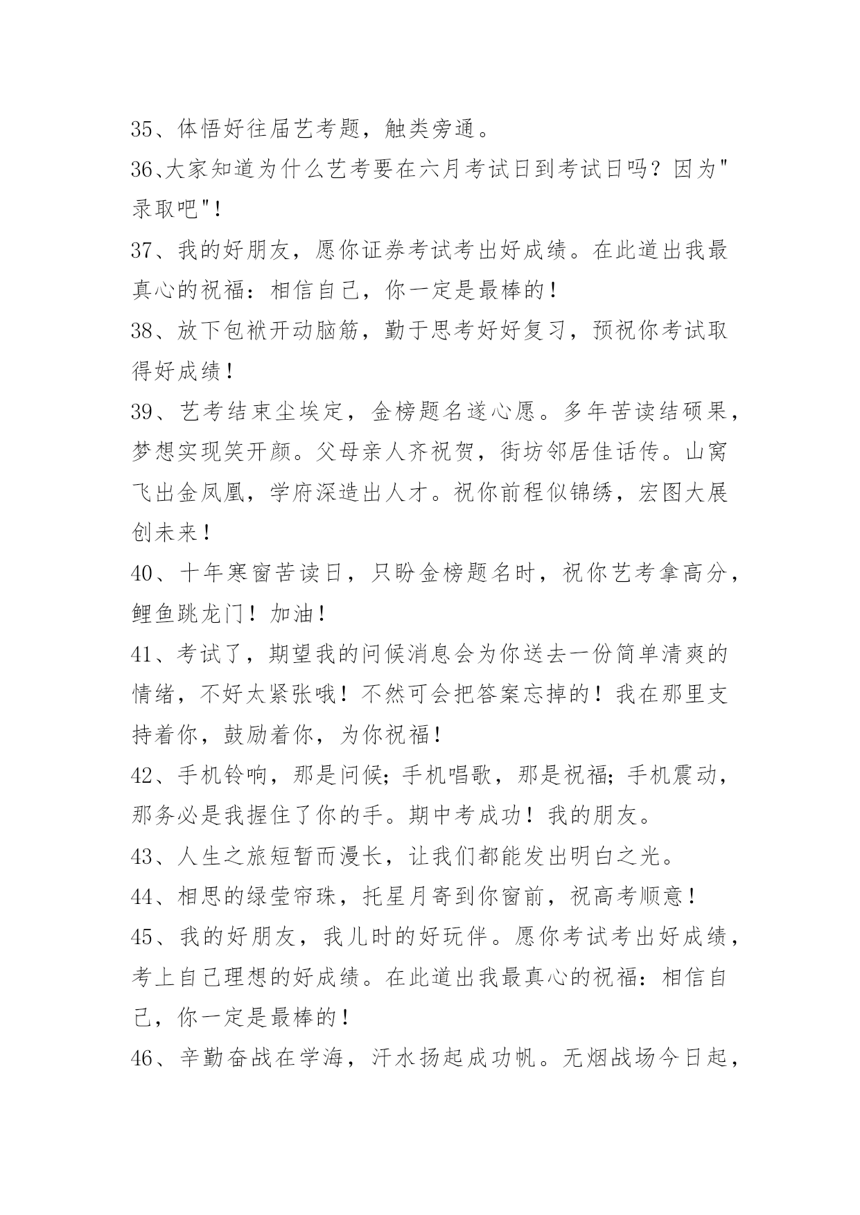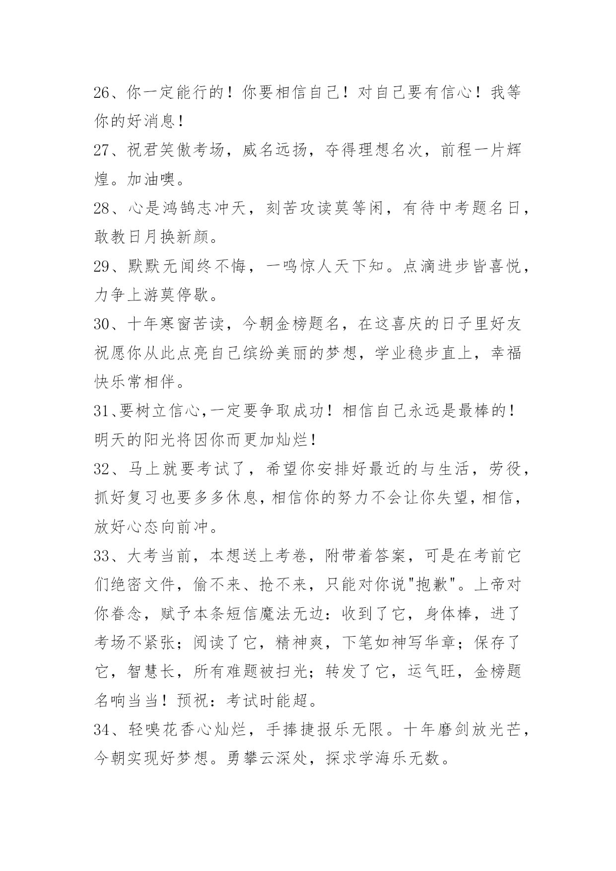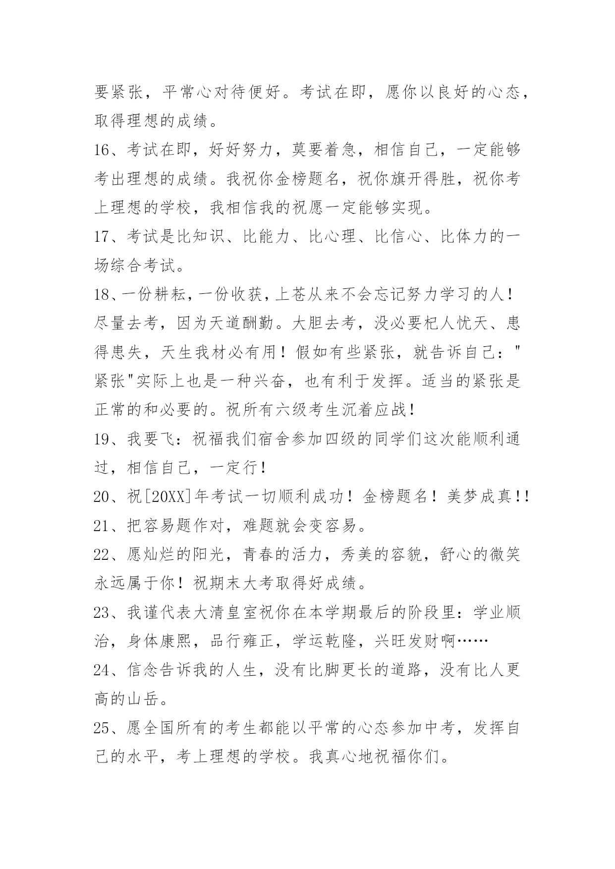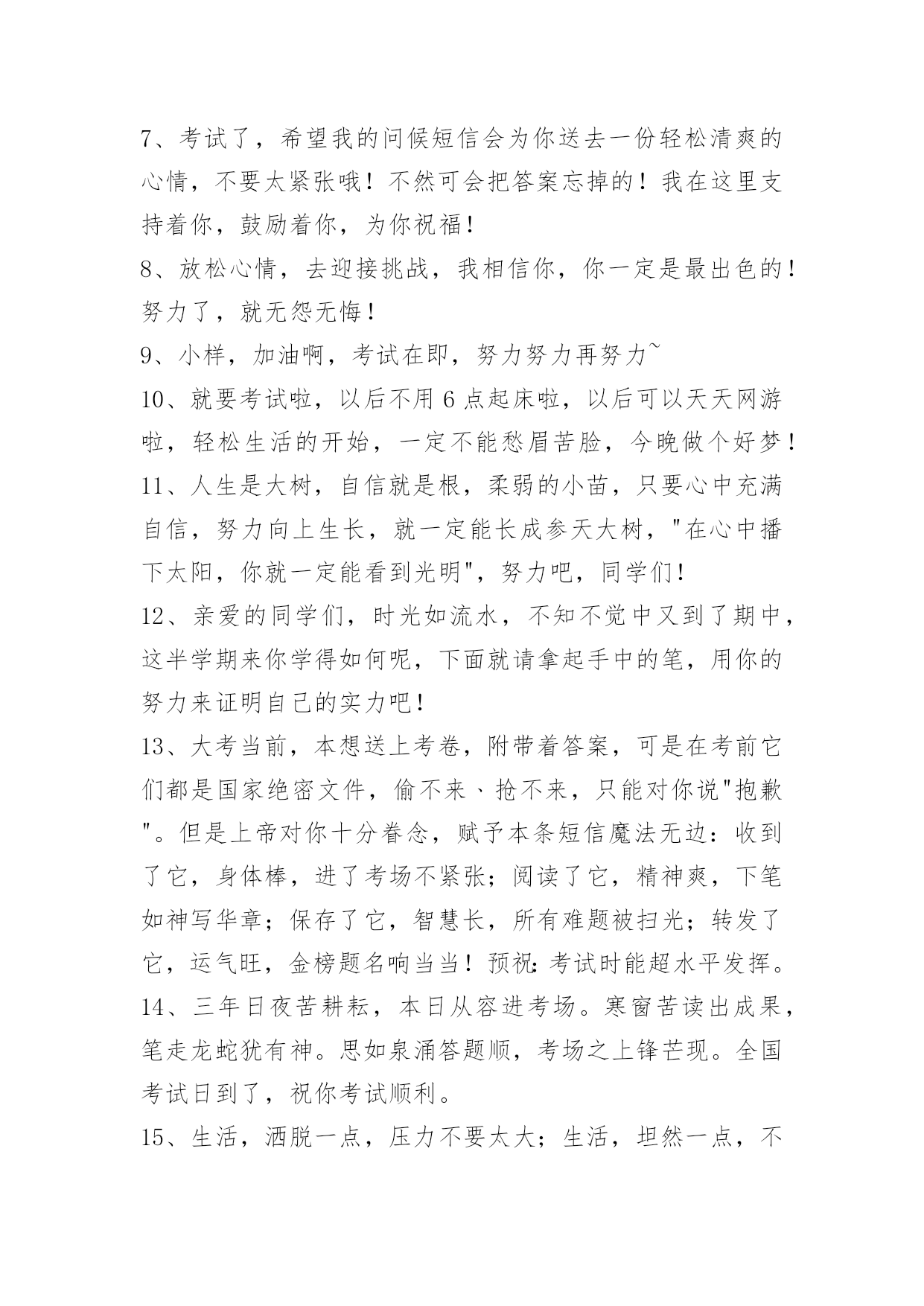 考试祝福短信关于考试祝福短信汇总50句想说爱你,感觉太沉;想说喜欢,感觉太轻;一天天地眷恋,一夜夜的无眠,我只有数着相思的绿莹帘珠,托星月寄到你窗前。祝专八考试顺利!下文是小编为大家准备的考试祝福短信,希望能够对大家有所帮助,一起来看看吧。1、不去想最后得分成绩是怎样,要知道每天的努力也会有回报。我知道你一直有双隐形的翅膀,带你飞给你希望。愿朋友高考顺利,金榜题名!2、量变到质变,努力奠定基础;开花到结果,坚持终能收获;过程到成功,态度决定一切。高考到,饭吃好,觉睡好,才能考的更好3、愿天下考研人:忧愁是可微的,快乐是可积的,在未来趋于正无穷的日子里,幸福是连续的,对你的祝福是可导的且大于零,祝你每天快乐的复合函数总是最大值。4、我只有数着相思的绿莹帘珠,托星月寄到你窗前,祝高考顺意!5、祝愿天下所有考生开心度过四级考试。祝福你们旗开得胜,取得美好佳绩。平心对待四级考试,你们是最棒的!仁慈的上帝会祝福你们的,相信自己,一定能行!6、这么天都坚持下来了,只剩下最后的两个星期了,继续加油,相信你一定会成功的,顺利考入大学,胜利永远属于你!7、考试了,希望我的问候短信会为你送去一份轻松清爽的心情,不要太紧张哦!不然可会把答案忘掉的!我在这里支持着你,鼓励着你,为你祝福!8、放松心情,去迎接挑战,我相信你,你一定是最出色的!努力了,就无怨无悔!9、小样,加油啊,考试在即,努力努力再努力~10、就要考试啦,以后不用6点起床啦,以后可以天天网游啦,轻松生活的开始,一定不能愁眉苦脸,今晚做个好梦!11、人生是大树,自信就是根,柔弱的小苗,只要心中充满自信,努力向上生长,就一定能长成参天大树,"在心中播下太阳,你就一定能看到光明",努力吧,同学们!12、亲爱的同学们,时光如流水,不知不觉中又到了期中,这半学期来你学得如何呢,下面就请拿起手中的笔,用你的努力来证明自己的实力吧!13、大考当前,本想送上考卷,附带着答案,可是在考前它们都是国家绝密文件,偷不来﹑抢不来,只能对你说"抱歉"。但是上帝对你十分眷念,赋予本条短信魔法无边:收到了它,身体棒,进了考场不紧张;阅读了它,精神爽,下笔如神写华章;保存了它,智慧长,所有难题被扫光;转发了它,运气旺,金榜题名响当当!预祝:考试时能超水平发挥。14、三年日夜苦耕耘,本日从容进考场。寒窗苦读出成果,笔走龙蛇犹有神。思如泉涌答题顺,考场之上锋芒现。全国考试日到了,祝你考试顺利。15、生活,洒脱一点,压力不要太大;生活,坦然一点,不要紧张,平常心对待便好。考试在即,愿你以良好的心态,取得理想的成绩。16、考试在即,好好努力,莫要着急,相信自己,一定能够考出理想的成绩。我祝你金榜题名,祝你旗开得胜,祝你考上理想的学校,我相信我的祝愿一定能够实现。17、考试是比知识、比能力、比心理、比信心、比体力的一场综合考试。18、一份耕耘,一份收获,上苍从来不会忘记努力学习的人!尽量去考,因为天道酬勤。大胆去考,没必要杞人忧天、患得患失,天生我材必有用!假如有些紧张,就告诉自己:"紧张"实际上也是一种兴奋,也有利于发挥。适当的紧张是正常的和必要的。祝所有六级考生沉着应战!19、我要飞:祝福我们宿舍参加四级的同学们这次能顺利通过,相信自己,一定行!20、祝[20XX]年考试一切顺利成功!金榜题名!美梦成真!!21、把容易题作对,难题就会变容易。22、愿灿烂的阳光,青春的活力,秀美的容貌,舒心的微笑永远属于你!祝期末大考取得好成绩。23、我谨代表大清皇室祝你在本学期最后的阶段里:学业顺治,身体康熙,品行雍正,学运乾隆,兴旺发财啊……24、信念告诉我的人生,没有比脚更长的道路,没有比人更高的山岳。25、愿全国所有的考生都能以平常的心态参加中考,发挥自己的水平,考上理想的学校。我真心地祝福你们。26、你一定能行的!你要相信自己!对自己要有信心!我等你的好消息!27、祝君笑傲考场,威名远扬,夺得理想名次,前程一片辉煌。加油噢。28、心是鸿鹄志冲天,刻苦攻读莫等闲,有待中考题名日,敢教日月换新颜。29、默默无闻终不悔,一鸣惊人天下知。点滴进步皆喜悦,力争上游莫停歇。30、十年寒窗苦读,今朝金榜题名,在这喜庆的日子里好友祝愿你从此点亮自己缤纷美丽的梦想,学业稳步直上,幸福快乐常相伴。31、要树立信心,一定要争取成功!相信自己永远是最棒的!明天的阳光将因你而更加灿烂!32、马上就要考试了,希望你安排好最近的与生活,劳役,抓好复习也要多多休息,相信你的努力不会让你失望,相信,放好心态向前冲。33、大考当前,本想送上考卷,附带着答案,可是在考前它们绝密文件,偷不来、抢不来,只能对你说"抱歉"。上帝对你眷念,赋予本条短信魔法无边:收到了它,身体棒,进了考场不紧张;阅读了它,精神爽,下笔如神写华章;保存了它,智慧长,所有难题被扫光;转发了它,
