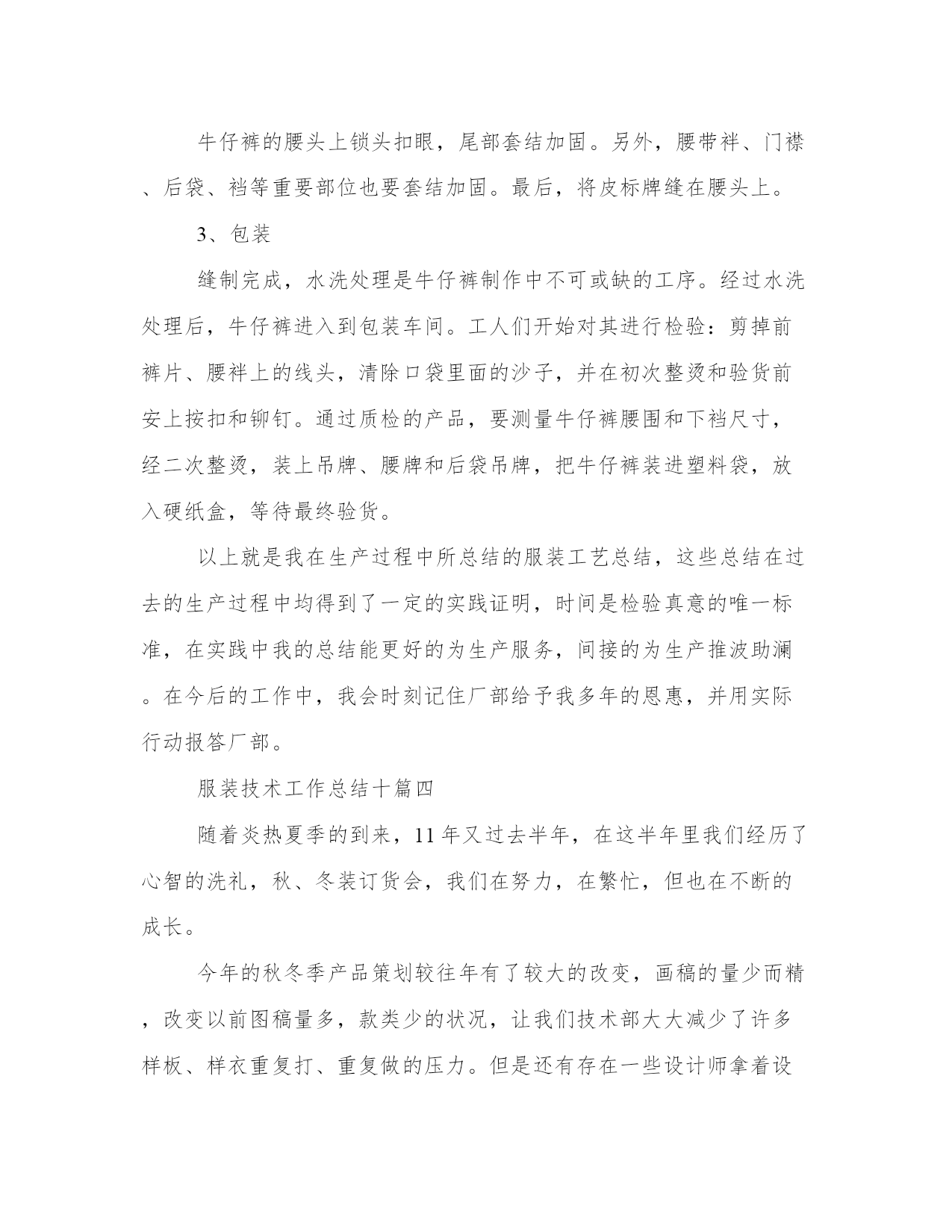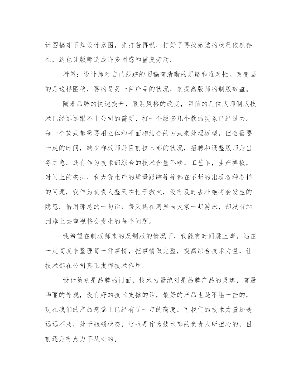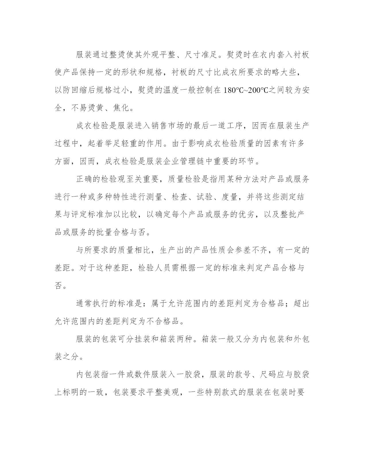 2023年服装技术工作总结十(实用11篇)围绕工作中的某一方面或某一问题进行的专门性总结,总结某一方面的成绩、经验。优秀的总结都具备一些什么特点呢?又该怎么写呢?这里给大家分享一些最新的总结书范文,方便大家学习。服装技术工作总结十篇一我叫xx,1986年参加工作至今,现在厂部担任车间主任一职,在厂部工作的这些年中,面对每天的流水作业,总结了一套服装生产基本工艺流程,下面就对我所总结的工艺流程经验做下详细的汇报总结。服装生产基本工艺流程包括裁剪、缝制、锁眼钉扣、整烫、成衣检验、包装入库等七个工序。裁剪前要先根据样板绘制出排料图,“完整、合理、节约”是排料的基本原则。缝制是服装加工的中心工序,服装的缝制根据款式、工艺风格等可分为机器缝制和手工缝制两种。在缝制加工过程实行流水作业。服装中的锁眼和钉扣通常由机器加工而成,扣眼根据其形状分为平型和眼型孔两种,俗称睡孔和鸽眼孔。睡孔多用于衬衣、裙子、裤等薄型衣料的产品上。鸽眼孔多用于上衣、西装等厚型面料的外衣上。服装通过整烫使其外观平整、尺寸准足。熨烫时在衣内套入衬板使产品保持一定的形状和规格,衬板的尺寸比成衣所要求的略大些,以防回缩后规格过小,熨烫的温度一般控制在180℃~200℃之间较为安全,不易烫黄、焦化。成衣检验是服装进入销售市场的最后一道工序,因而在服装生产过程中,起着举足轻重的作用。由于影响成衣检验质量的因素有许多方面,因而,成衣检验是服装企业管理链中重要的环节。正确的检验观至关重要,质量检验是指用某种方法对产品或服务进行一种或多种特性进行测量、检查、试验、度量,并将这些测定结果与评定标准加以比较,以确定每个产品或服务的优劣,以及整批产品或服务的批量合格与否。与所要求的质量相比,生产出的产品性质会参差不齐,有一定的差距。对于这种差距,检验人员需根据一定的标准来判定产品合格与否。通常执行的标准是:属于允许范围内的差距判定为合格品;超出允许范围内的差距判定为不合格品。服装的包装可分挂装和箱装两种。箱装一般又分为内包装和外包装之分。内包装指一件或数件服装入一胶袋,服装的款号、尺码应与胶袋上标明的一致,包装要求平整美观,一些特别款式的服装在包装时要进行特别处理。例如扭皱类服装要以绞卷形式包装,以保持其造型风格。外包装一般用纸箱包装,根据客户要求或工艺单指令进行尺码颜色搭配。包装形式一般有混色混码、独色独码、独色混码、混色独码四种。装箱时应注意数量完整,颜色尺寸搭配准备无误。外箱上刷上箱唛,标明客户、指运港、箱号、数量、原产地等、内容与实际货物相符。在我总结的服装生产基本工艺流程中虽然只列举了裁剪、缝制、锁眼钉扣、整烫、成衣检验、包装入库,其中七道最基本的工序,但是每一道工序在流水生产中都起到了至关重要的作用,每一道都不可缺少,更不可能颠倒。在服装流水生产中,如果熟练的运行这套基本的生产工艺流程,会在生产中起到地基的作用。在多年的工作中,是厂部培养了我,让我在工作之余学习了更多的服装生产上的工艺技术,让我在工作中不断地总结各种生产经验,运用这些总结来的经验,发挥经验中的价值,是我对厂部多年来悉心培养的汇报。今后我会在工作中更加完善自身修养,不断学习进取,不断在工作中发挥自身的作用,为厂部的基础工作做一份微薄的贡献。服装技术工作总结十篇二服装培训学校年度工作总结服装培训学校年度工作总结学校全体师生在上级领导下,认真贯彻执行国务院社会力量办学条例,以提高教学质量为理念,大力开展教学分析活动。回顾过去一年,我校办学规模不断扩大,教育质量明显提高,具体总结如下:服装培训比上年又有新的发展,共开设5门专业,1、服装设计班(包括设计、打板);2、红帮裁缝班;3、样板设计专业;合计招生人数261名;培训失业、失地人员合计1600余名。由于开设专业比较齐全,适应了各类人员学习服装专业知识的需要。随着全球经济一体化,to的加入与xx市“十五”规划对建设服装大市的要求,本校依托高等服装院校,联合服装企业,使服装教学与生产趋于同步。我们与上海服饰学会进一步挂勾,引进教材,聘请专家,连续三年来我们邀请华东大学(原中纺大)服装学院许树文、王建萍教授等三位专家来校讲课,开设高层次专业。提高教学质量关键在于挑选一批高素质的有一定能力经验的教师,本校教师大学资质,有新思路的年轻教师与实践经验丰富的老教师,也有著名的服装教授,服装设计师,高级技师,虽然教学风格不尽相同,但善于保持轻松的教学气氛,努力调动学生积极性,许多教师都担任过本市著名服装企业设计师与打板师实践经验丰富。本校还定期邀请服装企业技术骨干来校研讨,了解企业需要使教学与企业接轨,立足课堂,走出校外为学生省去许多实习期。校企挂钩一直都比较重视,而我校开展校企挂钩,不是为了分配方便,也不想企业资助什么,而是