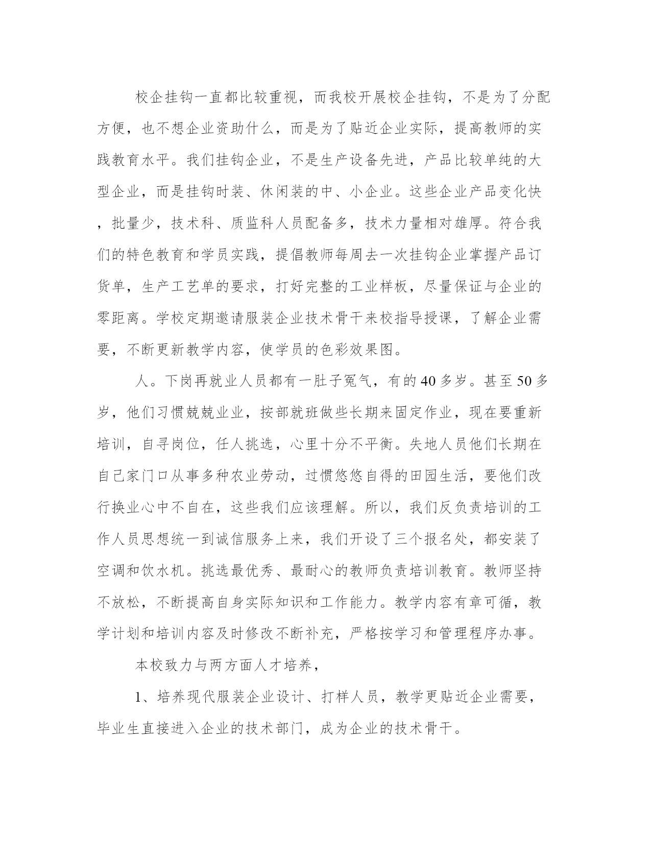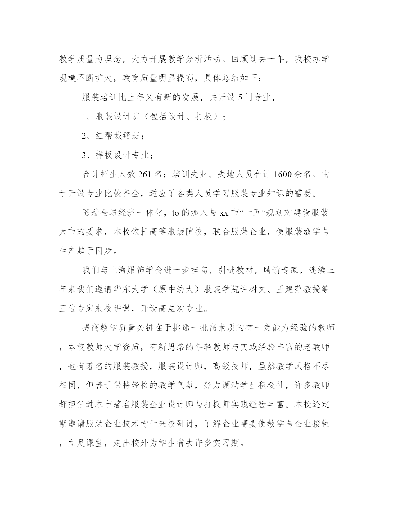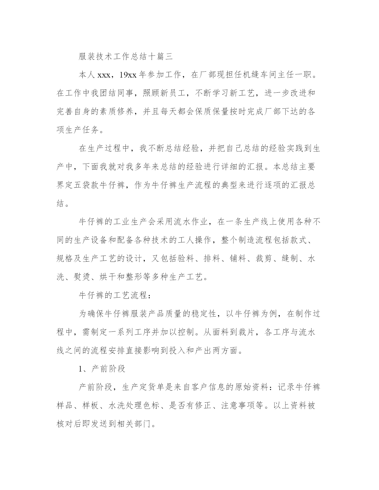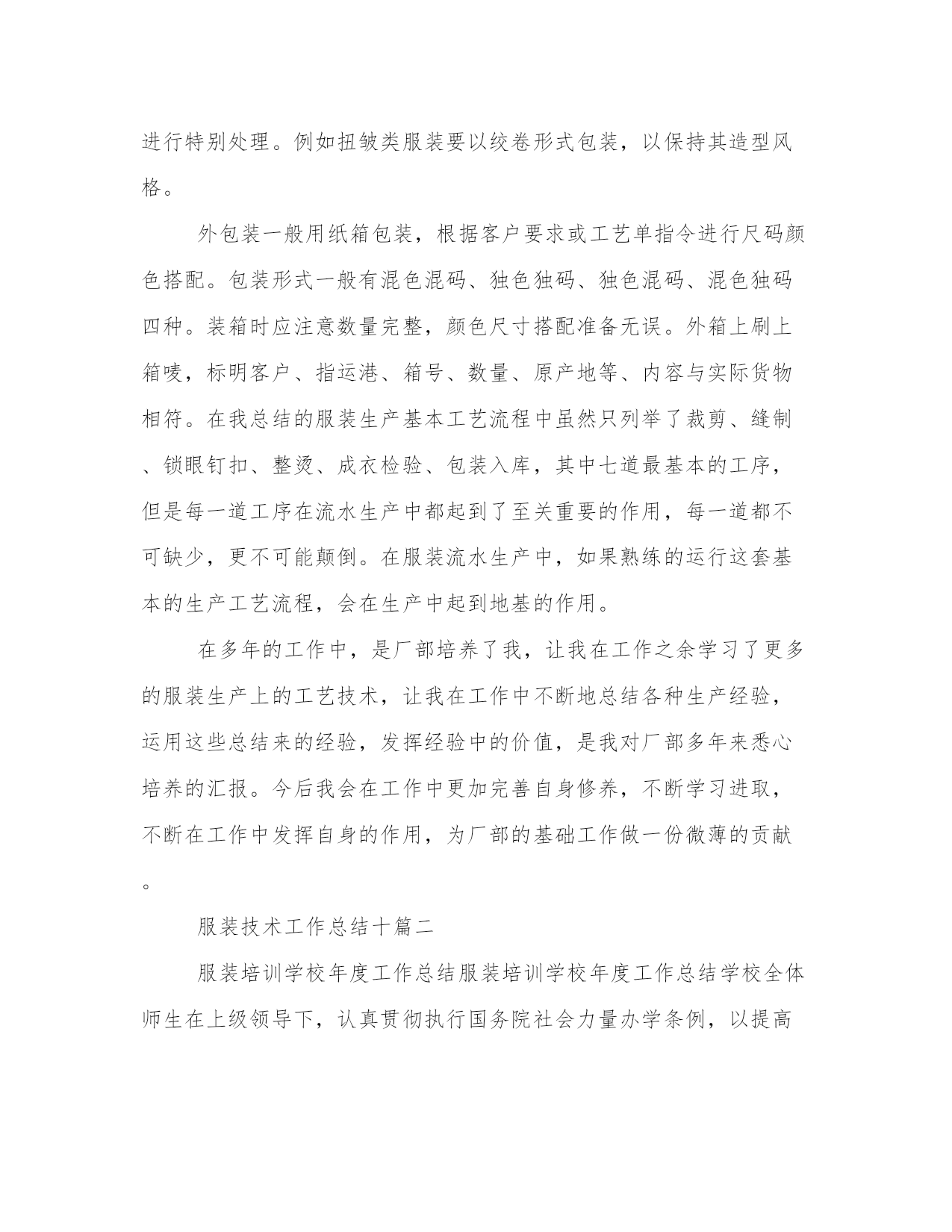 2023年服装技术工作总结十(实用11篇)围绕工作中的某一方面或某一问题进行的专门性总结,总结某一方面的成绩、经验。优秀的总结都具备一些什么特点呢?又该怎么写呢?这里给大家分享一些最新的总结书范文,方便大家学习。服装技术工作总结十篇一我叫xx,1986年参加工作至今,现在厂部担任车间主任一职,在厂部工作的这些年中,面对每天的流水作业,总结了一套服装生产基本工艺流程,下面就对我所总结的工艺流程经验做下详细的汇报总结。服装生产基本工艺流程包括裁剪、缝制、锁眼钉扣、整烫、成衣检验、包装入库等七个工序。裁剪前要先根据样板绘制出排料图,“完整、合理、节约”是排料的基本原则。缝制是服装加工的中心工序,服装的缝制根据款式、工艺风格等可分为机器缝制和手工缝制两种。在缝制加工过程实行流水作业。服装中的锁眼和钉扣通常由机器加工而成,扣眼根据其形状分为平型和眼型孔两种,俗称睡孔和鸽眼孔。睡孔多用于衬衣、裙子、裤等薄型衣料的产品上。鸽眼孔多用于上衣、西装等厚型面料的外衣上。服装通过整烫使其外观平整、尺寸准足。熨烫时在衣内套入衬板使产品保持一定的形状和规格,衬板的尺寸比成衣所要求的略大些,以防回缩后规格过小,熨烫的温度一般控制在180℃~200℃之间较为安全,不易烫黄、焦化。成衣检验是服装进入销售市场的最后一道工序,因而在服装生产过程中,起着举足轻重的作用。由于影响成衣检验质量的因素有许多方面,因而,成衣检验是服装企业管理链中重要的环节。正确的检验观至关重要,质量检验是指用某种方法对产品或服务进行一种或多种特性进行测量、检查、试验、度量,并将这些测定结果与评定标准加以比较,以确定每个产品或服务的优劣,以及整批产品或服务的批量合格与否。与所要求的质量相比,生产出的产品性质会参差不齐,有一定的差距。对于这种差距,检验人员需根据一定的标准来判定产品合格与否。通常执行的标准是:属于允许范围内的差距判定为合格品;超出允许范围内的差距判定为不合格品。服装的包装可分挂装和箱装两种。箱装一般又分为内包装和外包装之分。内包装指一件或数件服装入一胶袋,服装的款号、尺码应与胶袋上标明的一致,包装要求平整美观,一些特别款式的服装在包装时要进行特别处理。例如扭皱类服装要以绞卷形式包装,以保持其造型风格。外包装一般用纸箱包装,根据客户要求或工艺单指令进行尺码颜色搭配。包装形式一般有混色混码、独色独码、独色混码、混色独码四种。装箱时应注意数量完整,颜色尺寸搭配准备无误。外箱上刷上箱唛,标明客户、指运港、箱号、数量、原产地等、内容与实际货物相符。在我总结的服装生产基本工艺流程中虽然只列举了裁剪、缝制、锁眼钉扣、整烫、成衣检验、包装入库,其中七道最基本的工序,但是每一道工序在流水生产中都起到了至关重要的作用,每一道都不可缺少,更不可能颠倒。在服装流水生产中,如果熟练的运行这套基本的生产工艺流程,会在生产中起到地基的作用。在多年的工作中,是厂部培养了我,让我在工作之余学习了更多的服装生产上的工艺技术,让我在工作中不断地总结各种生产经验,运用这些总结来的经验,发挥经验中的价值,是我对厂部多年来悉心培养的汇报。今后我会在工作中更加完善自身修养,不断学习进取,不断在工作中发挥自身的作用,为厂部的基础工作做一份微薄的贡献。服装技术工作总结十篇二服装培训学校年度工作总结服装培训学校年度工作总结学校全体师生在上级领导下,认真贯彻执行国务院社会力量办学条例,以提高教学质量为理念,大力开展教学分析活动。回顾过去一年,我校办学规模不断扩大,教育质量明显提高,具体总结如下:服装培训比上年又有新的发展,共开设5门专业,1、服装设计班(包括设计、打板);2、红帮裁缝班;3、样板设计专业;合计招生人数261名;培训失业、失地人员合计1600余名。由于开设专业比较齐全,适应了各类人员学习服装专业知识的需要。随着全球经济一体化,to的加入与xx市“十五”规划对建设服装大市的要求,本校依托高等服装院校,联合服装企业,使服装教学与生产趋于同步。我们与上海服饰学会进一步挂勾,引进教材,聘请专家,连续三年来我们邀请华东大学(原中纺大)服装学院许树文、王建萍教授等三位专家来校讲课,开设高层次专业。提高教学质量关键在于挑选一批高素质的有一定能力经验的教师,本校教师大学资质,有新思路的年轻教师与实践经验丰富的老教师,也有著名的服装教授,服装设计师,高级技师,虽然教学风格不尽相同,但善于保持轻松的教学气氛,努力调动学生积极性,许多教师都担任过本市著名服装企业设计师与打板师实践经验丰富。本校还定期邀请服装企业技术骨干来校研讨,了解企业需要使教学与企业接轨,立足课堂,走出校外为学生省去许多实习期。校企挂钩一直都比较重视,而我校开展校企挂钩,不是为了分配方便,也不想企业资助什么,而是