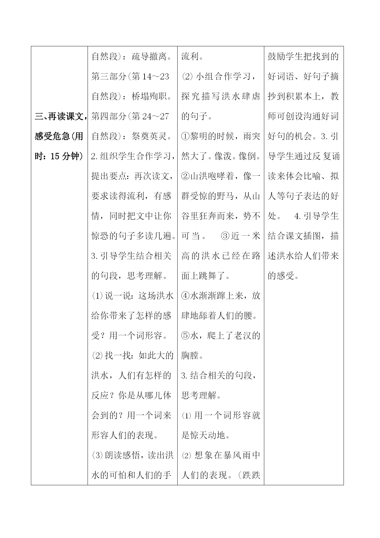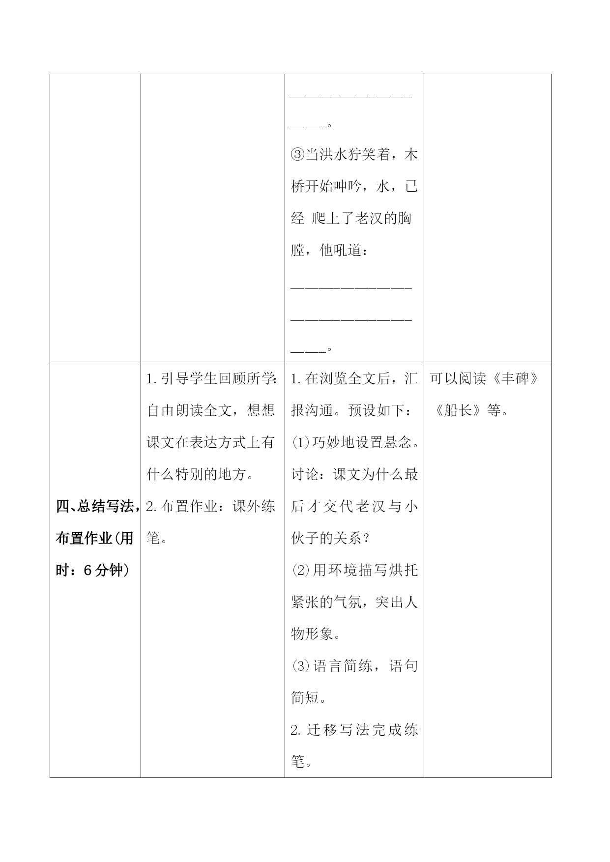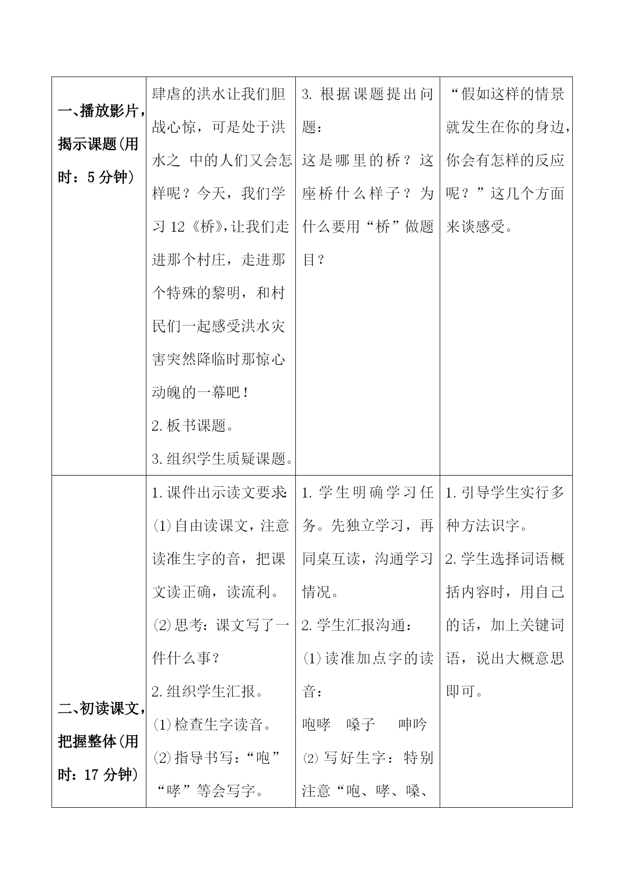13《桥》导学案课题桥课型新授课教学目标1.会写“咆、哮”等8个字,会写“咆哮、惊慌”等12个词语。 2.正确、流利、有感情地朗读课文,注意读好短句。 3.能抓住重点词句透过内容体会文章的思想感情,领悟课文在表达上的特点。4.理解课文内容,重点感悟老支书在危难面前所表现出来的无私无畏、舍己救人的高尚品质和人格魅力。教学重难点能抓住重点词句感悟老支书在危难面前所表现出来的无私无畏、舍己救人的高尚品质和人格魅力。课前准备1.准备有关“山洪暴发、洪水肆虐”的视频。(教师) 2.准备课文配乐朗读。(教师) 3.准