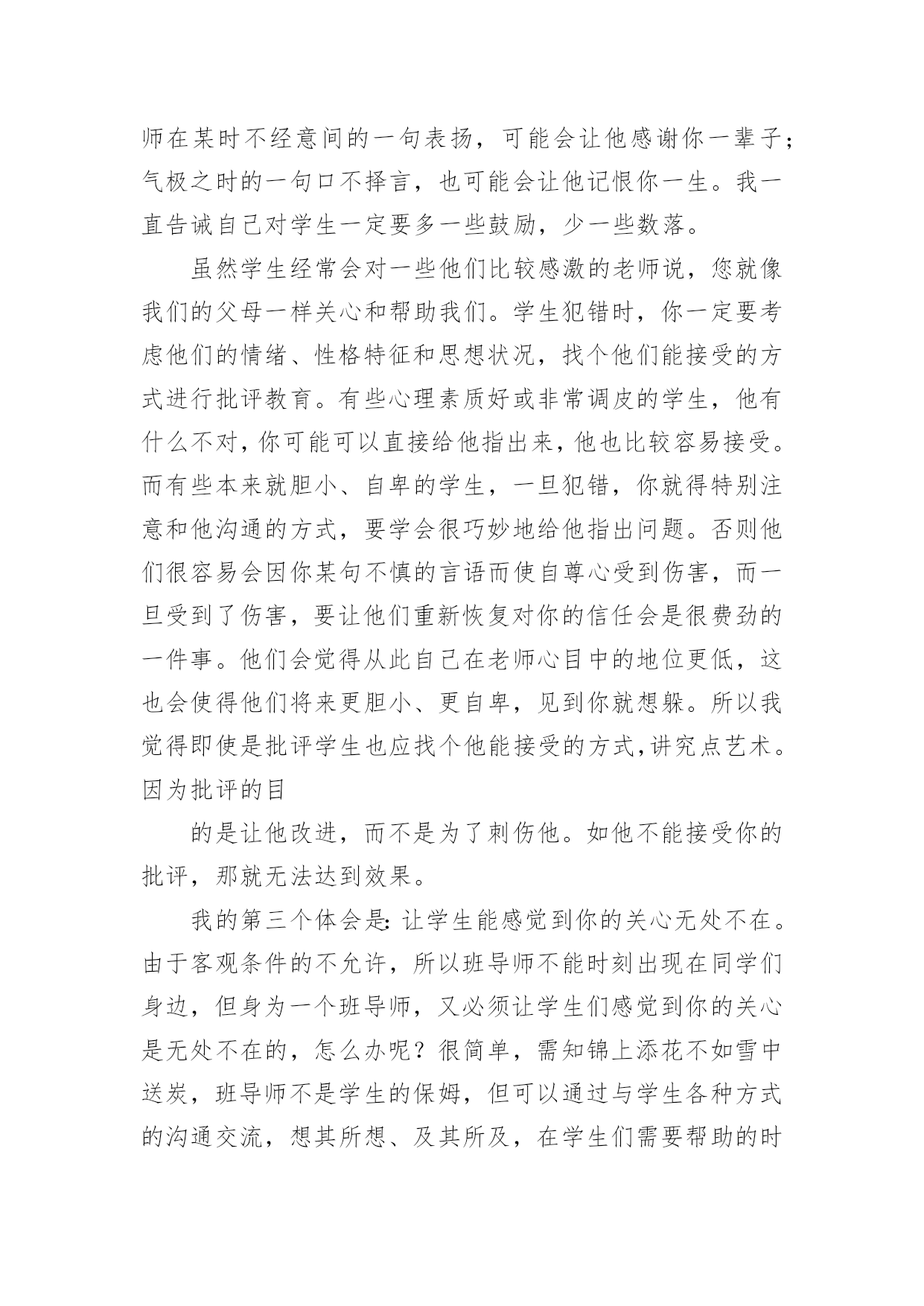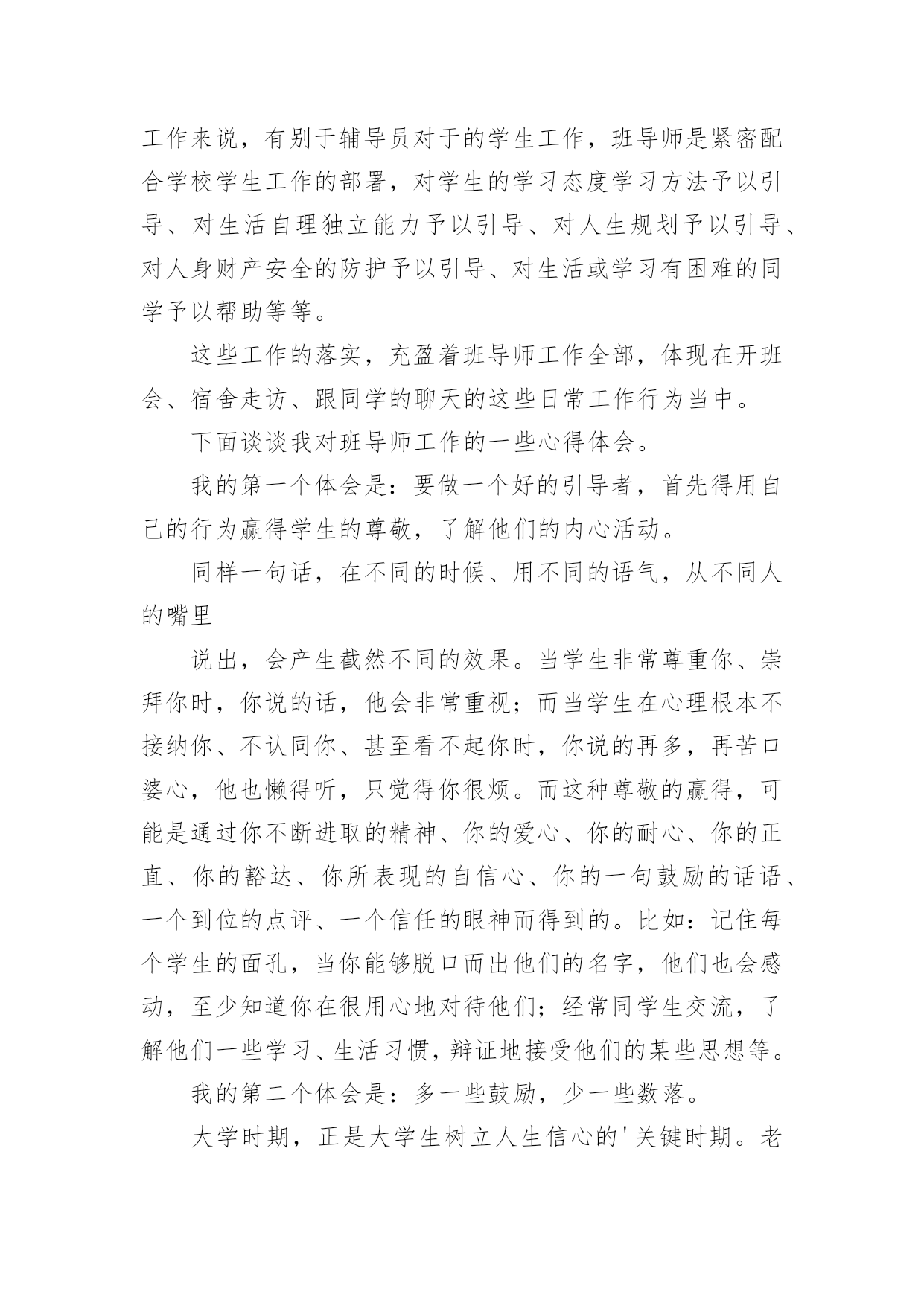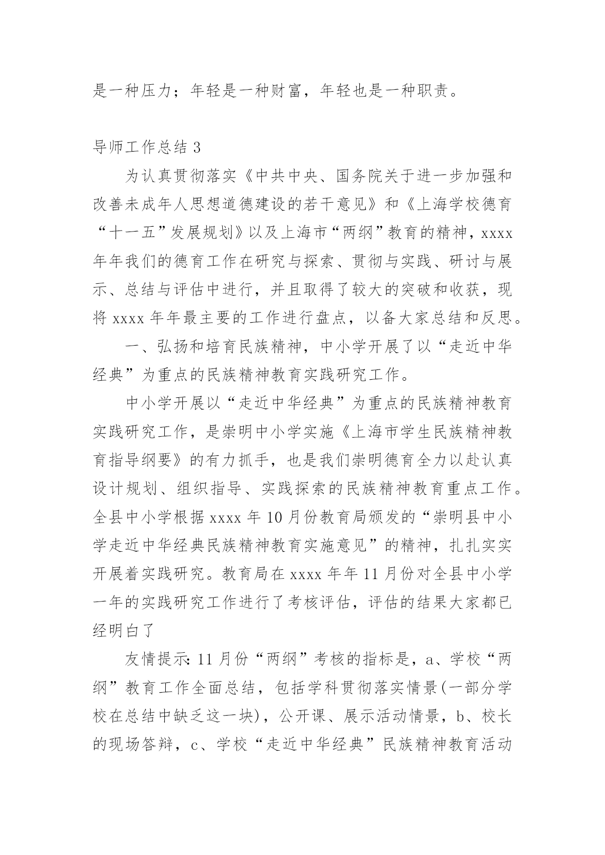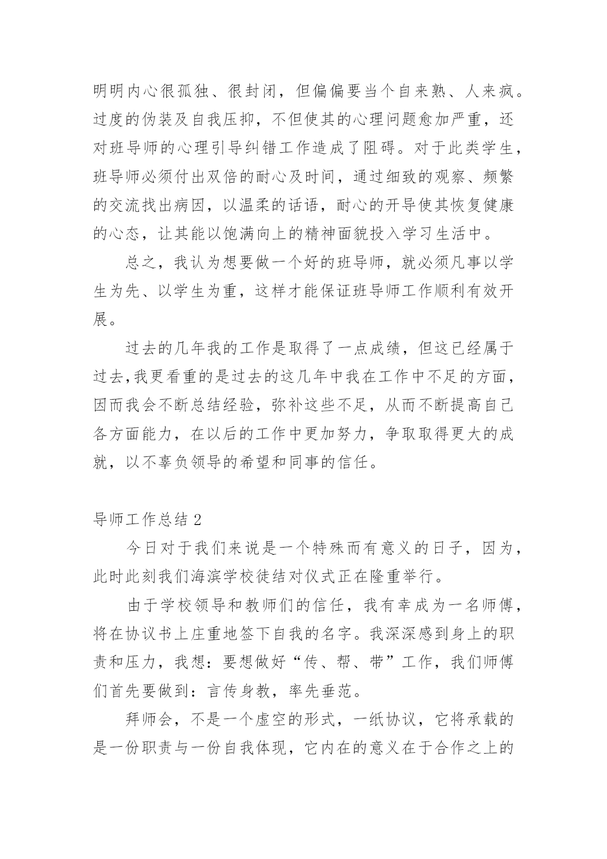 导师工作总结(优)导师工作总结15篇总结是对某一特定时间段内的学习和工作生活等表现情况加以回顾和分析的一种书面材料,它在我们的学习、工作中起到呈上启下的作用,为此我们要做好回顾,写好总结。那么你知道总结如何写吗?下面是小编帮大家整理的导师工作总结,希望能够帮助到大家。导师工作总结1时光飞逝,回顾近几年班导师工作的酸甜苦辣,心中充满感激。我要感谢我的学生,是你们让我进一步感受到这一份工作的快乐,进一步了解班导师所需担负的责任,进一步巩固了担任一个好班导的信心,也是你们让我进一步确认了作为教师进行专业发展的支撑点——基于实践的学习与反思,你们给予了我很多关于教育、关于人生、关于学习、关于生活的思考的火花;我要感谢学校和学院的领导和同事们,是你们兢兢业业的认真负责的态度给了我榜样的力量,是你们每一次班导师会议语重心长的嘱托,让我深深感受到班导师工作的重要与伟大。是工作,是实践,给我提供了进行教育教学研究的生命土壤。我衷心地感谢这一切!班导师常规性的工作是跟学校学生管理结合在一起的,或者说是学校学生管理工作的具体实施,另一方面作为学生工作来说,有别于辅导员对于的学生工作,班导师是紧密配合学校学生工作的部署,对学生的学习态度学习方法予以引导、对生活自理独立能力予以引导、对人生规划予以引导、对人身财产安全的防护予以引导、对生活或学习有困难的同学予以帮助等等。这些工作的落实,充盈着班导师工作全部,体现在开班会、宿舍走访、跟同学的聊天的这些日常工作行为当中。下面谈谈我对班导师工作的一些心得体会。我的第一个体会是:要做一个好的引导者,首先得用自己的行为赢得学生的尊敬,了解他们的内心活动。同样一句话,在不同的时候、用不同的语气,从不同人的嘴里说出,会产生截然不同的效果。当学生非常尊重你、崇拜你时,你说的话,他会非常重视;而当学生在心理根本不接纳你、不认同你、甚至看不起你时,你说的再多,再苦口婆心,他也懒得听,只觉得你很烦。而这种尊敬的赢得,可能是通过你不断进取的精神、你的爱心、你的耐心、你的正直、你的豁达、你所表现的自信心、你的一句鼓励的话语、一个到位的点评、一个信任的眼神而得到的。比如:记住每个学生的面孔,当你能够脱口而出他们的名字,他们也会感动,至少知道你在很用心地对待他们;经常同学生交流,了解他们一些学习、生活习惯,辩证地接受他们的某些思想等。我的第二个体会是:多一些鼓励,少一些数落。大学时期,正是大学生树立人生信心的'关键时期。老师在某时不经意间的一句表扬,可能会让他感谢你一辈子;气极之时的一句口不择言,也可能会让他记恨你一生。我一直告诫自己对学生一定要多一些鼓励,少一些数落。虽然学生经常会对一些他们比较感激的老师说,您就像我们的父母一样关心和帮助我们。学生犯错时,你一定要考虑他们的情绪、性格特征和思想状况,找个他们能接受的方式进行批评教育。有些心理素质好或非常调皮的学生,他有什么不对,你可能可以直接给他指出来,他也比较容易接受。而有些本来就胆小、自卑的学生,一旦犯错,你就得特别注意和他沟通的方式,要学会很巧妙地给他指出问题。否则他们很容易会因你某句不慎的言语而使自尊心受到伤害,而一旦受到了伤害,要让他们重新恢复对你的信任会是很费劲的一件事。他们会觉得从此自己在老师心目中的地位更低,这也会使得他们将来更胆小、更自卑,见到你就想躲。所以我觉得即使是批评学生也应找个他能接受的方式,讲究点艺术。因为批评的目的是让他改进,而不是为了刺伤他。如他不能接受你的批评,那就无法达到效果。我的第三个体会是:让学生能感觉到你的关心无处不在。由于客观条件的不允许,所以班导师不能时刻出现在同学们身边,但身为一个班导师,又必须让学生们感觉到你的关心是无处不在的,怎么办呢?很简单,需知锦上添花不如雪中送炭,班导师不是学生的保姆,但可以通过与学生各种方式的沟通交流,想其所想、及其所及,在学生们需要帮助的时候,及时地出现,以一通电话、一封电邮、一个约谈等方式,成为他们坚强的后盾,成为他们精神家园的引导者、守护者,给予他们力量。我的第四个体会是:在力所能及的范围内,多一些包容、多一些耐心。正如一千个人眼中有一千个哈姆雷特,并不是每个学生都是导师心目中的模范生,那么对于那些个人特质较为明显的学生,班导师首先要做的不是批判及否定,而是拿出自己的包容及耐心,加强与他们的沟通和交流,了解他们的想法,选择正确的方法,培养他们学习的自信心,提高他们学习的自觉性,并发掘他们的特长,引导他们找出自己的闪光点。我的第五个体会是:要主动利用一切机会深入了解学生的思想状况,帮助他们走出困惑。每个大学生,都有其特定的社会文化背景,他们来自不同的地方,有着不同的学习生活习惯,也有着各自独特的心理人格,如何因材施教,这是班导师工作中的一大难点。我认为,因材施教必须要建立在是班导师对自己的学生们有
