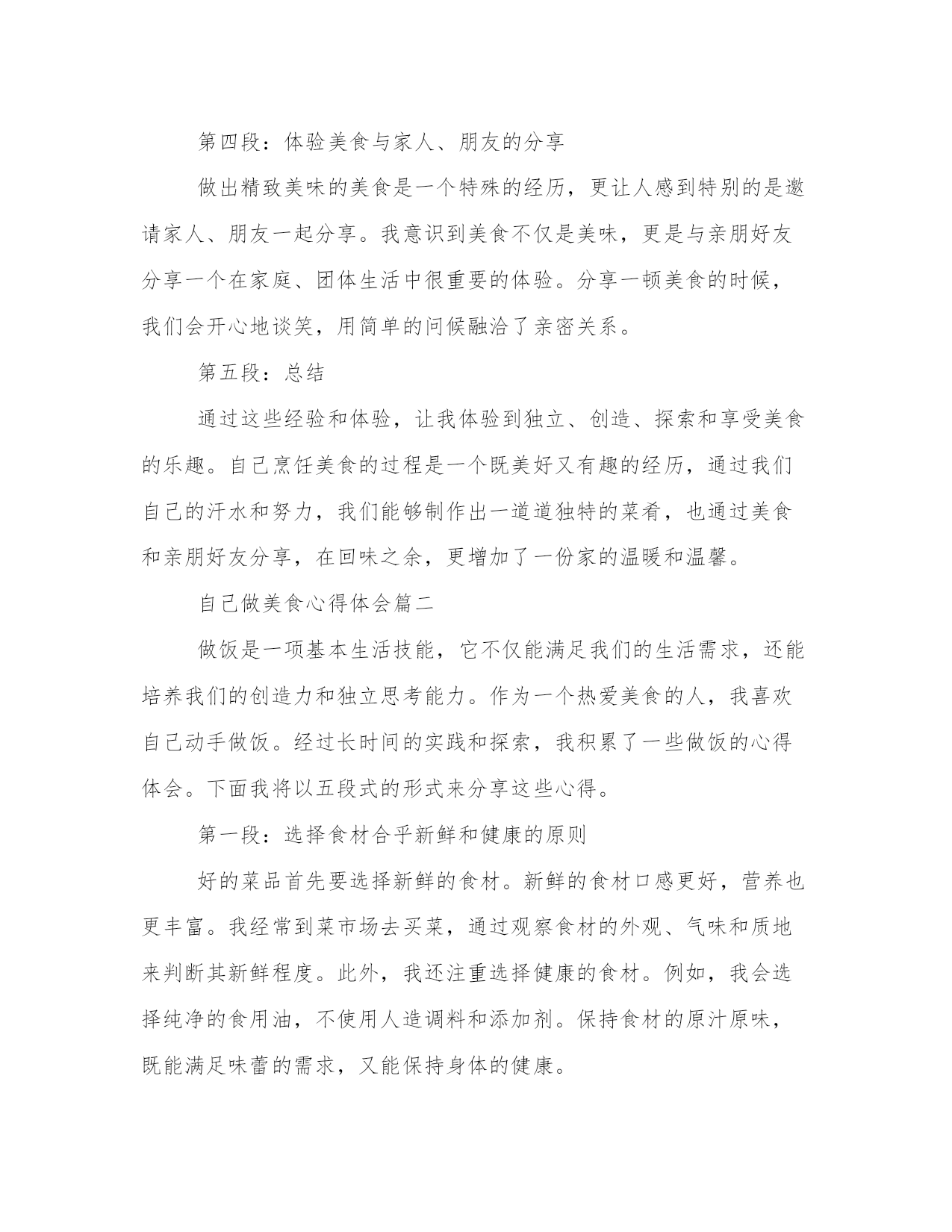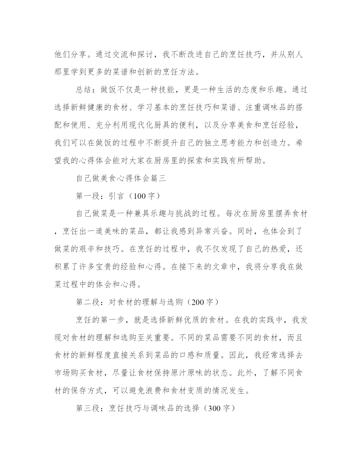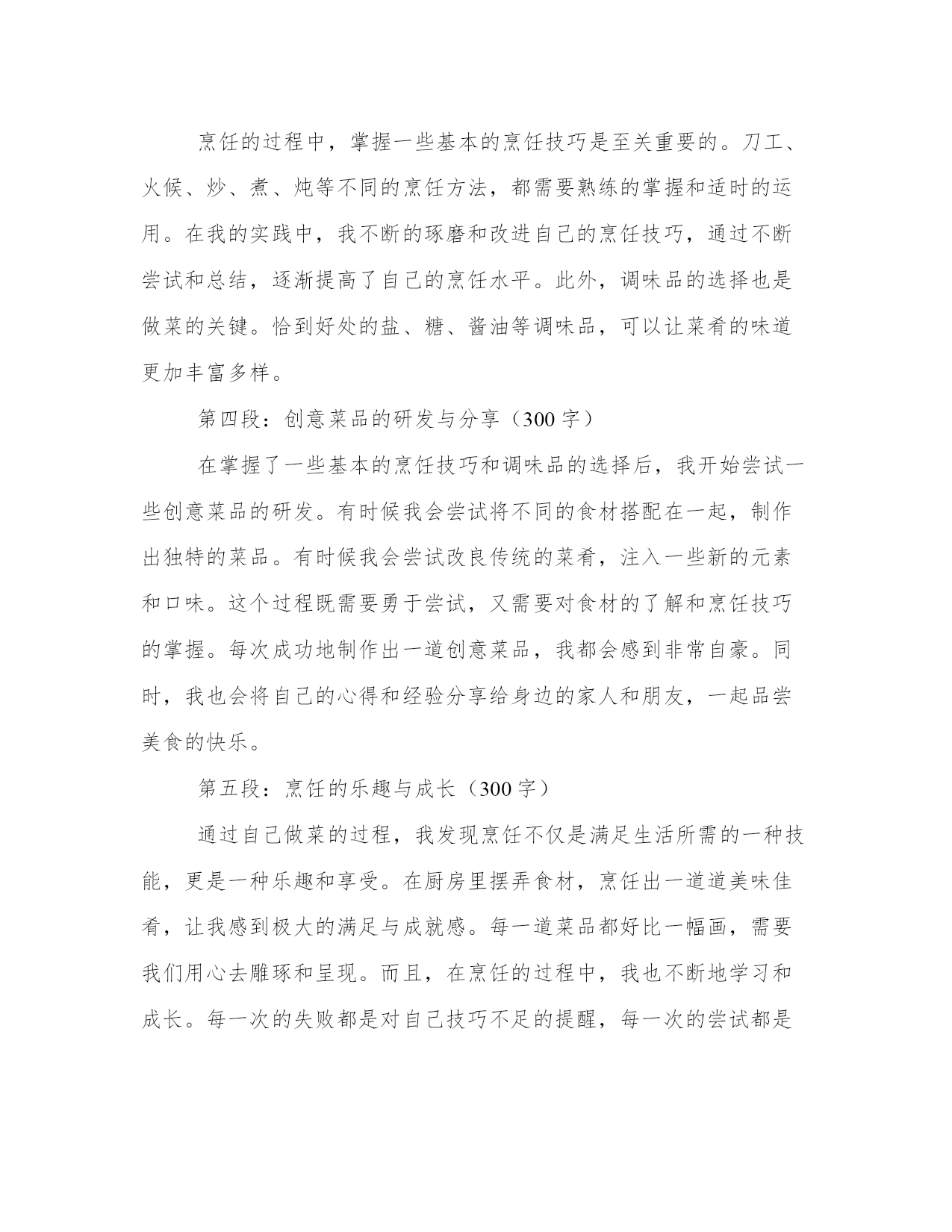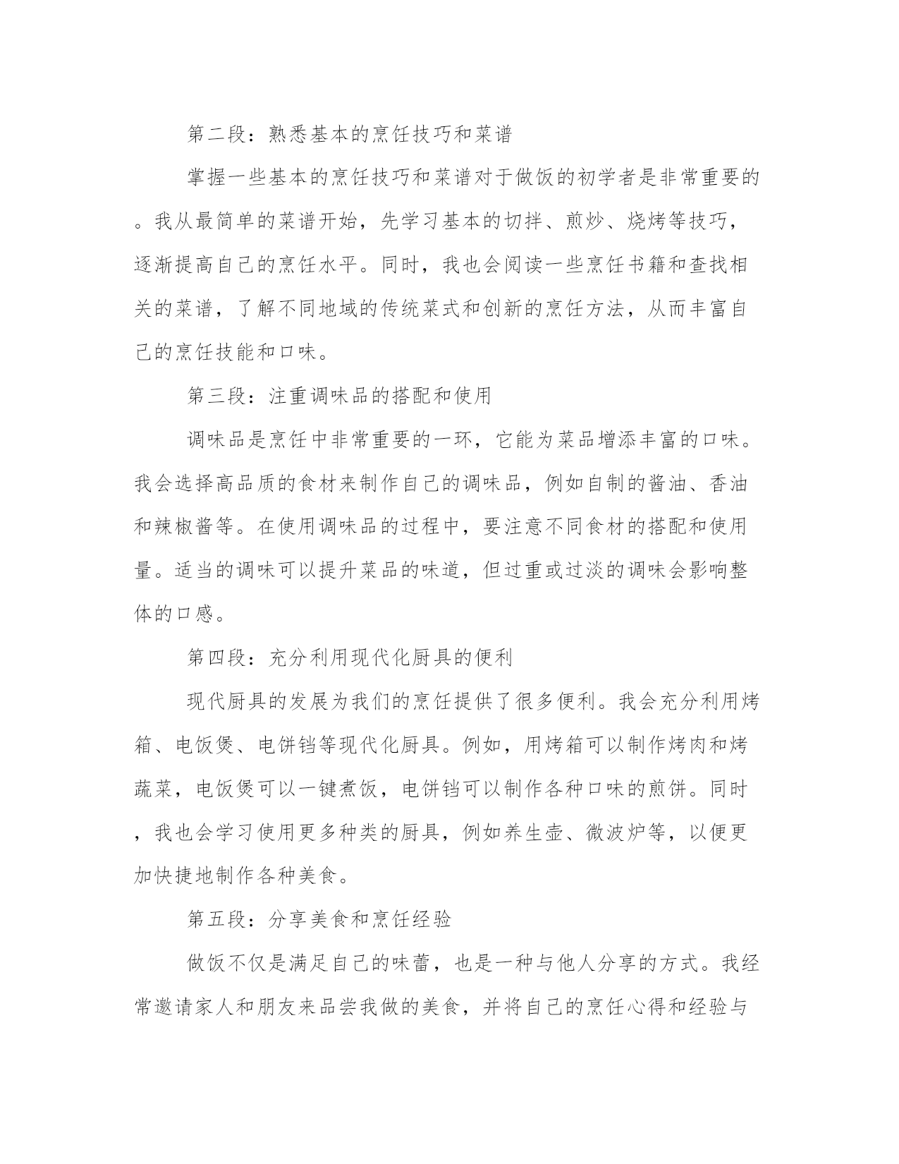专业自己做美食心得体会(汇总12篇)写心得体会可以让我们更好地整理和归纳自己的经验和知识。如何写一篇较为完美的心得体会是一个需要思考和实践的问题。以下是一些经典的心得体会范文,希望能给大家提供一些写作思路。自己做美食心得体会篇一最近我开始尝试在家里做美食。这是一个全新的经验,使我更加了解食物和烹饪的复杂性。自己动手做饭的过程让我体验了独立、自主和探索的乐趣。在这篇文章中,我将分享我是如何感受、欣赏并体验做美食的。第二段:享受创造美食的过程烹饪过程是自己做美食最重要的一部分。准备并规划好每一个原材料,由此开发出自己的想象力和创造力。随着烹饪过程的深入,我开始感觉到自己的思维逐渐清晰起来,工作效率逐渐提高,思考问题的方式逐渐得到加强。这些体验提高了我的信心并激发了我探索更多的可能性。第三段:享受美食带给我的味蕾体验在烹饪过程中,我开始尝试新的菜式,体验独特的风味和口感。自己动手制作的美食,无论是味道还是颜色都让我非常喜欢。自己做的美食总与众不同,有着自己独特的味道和口感,这让我内心深处有一股满足的感觉。第四段:体验美食与家人、朋友的分享做出精致美味的美食是一个特殊的经历,更让人感到特别的是邀请家人、朋友一起分享。我意识到美食不仅是美味,更是与亲朋好友分享一个在家庭、团体生活中很重要的体验。分享一顿美食的时候,我们会开心地谈笑,用简单的问候融洽了亲密关系。第五段:总结通过这些经验和体验,让我体验到独立、创造、探索和享受美食的乐趣。自己烹饪美食的过程是一个既美好又有趣的经历,通过我们自己的汗水和努力,我们能够制作出一道道独特的菜肴,也通过美食和亲朋好友分享,在回味之余,更增加了一份家的温暖和温馨。自己做美食心得体会篇二做饭是一项基本生活技能,它不仅能满足我们的生活需求,还能培养我们的创造力和独立思考能力。作为一个热爱美食的人,我喜欢自己动手做饭。经过长时间的实践和探索,我积累了一些做饭的心得体会。下面我将以五段式的形式来分享这些心得。第一段:选择食材合乎新鲜和健康的原则好的菜品首先要选择新鲜的食材。新鲜的食材口感更好,营养也更丰富。我经常到菜市场去买菜,通过观察食材的外观、气味和质地来判断其新鲜程度。此外,我还注重选择健康的食材。例如,我会选择纯净的食用油,不使用人造调料和添加剂。保持食材的原汁原味,既能满足味蕾的需求,又能保持身体的健康。第二段:熟悉基本的烹饪技巧和菜谱掌握一些基本的烹饪技巧和菜谱对于做饭的初学者是非常重要的。我从最简单的菜谱开始,先学习基本的切拌、煎炒、烧烤等技巧,逐渐提高自己的烹饪水平。同时,我也会阅读一些烹饪书籍和查找相关的菜谱,了解不同地域的传统菜式和创新的烹饪方法,从而丰富自己的烹饪技能和口味。第三段:注重调味品的搭配和使用调味品是烹饪中非常重要的一环,它能为菜品增添丰富的口味。我会选择高品质的食材来制作自己的调味品,例如自制的酱油、香油和辣椒酱等。在使用调味品的过程中,要注意不同食材的搭配和使用量。适当的调味可以提升菜品的味道,但过重或过淡的调味会影响整体的口感。第四段:充分利用现代化厨具的便利现代厨具的发展为我们的烹饪提供了很多便利。我会充分利用烤箱、电饭煲、电饼铛等现代化厨具。例如,用烤箱可以制作烤肉和烤蔬菜,电饭煲可以一键煮饭,电饼铛可以制作各种口味的煎饼。同时,我也会学习使用更多种类的厨具,例如养生壶、微波炉等,以便更加快捷地制作各种美食。第五段:分享美食和烹饪经验做饭不仅是满足自己的味蕾,也是一种与他人分享的方式。我经常邀请家人和朋友来品尝我做的美食,并将自己的烹饪心得和经验与他们分享。通过交流和探讨,我不断改进自己的烹饪技巧,并从别人那里学到更多的菜谱和创新的烹饪方法。总结:做饭不仅是一种技能,更是一种生活的态度和乐趣。通过选择新鲜健康的食材、学习基本的烹饪技巧和菜谱、注重调味品的搭配和使用、充分利用现代化厨具的便利,以及分享美食和烹饪经验,我们可以在做饭的过程中不断提升自己的独立思考能力和创造力。希望我的心得体会能对大家在厨房里的探索和实践有所帮助。自己做美食心得体会篇三第一段:引言(100字)自己做菜是一种兼具乐趣与挑战的过程。每次在厨房里摆弄食材,烹饪出一道美味的菜品,都让我感到异常兴奋。同时,也体会到了做菜的艰辛和技巧。在烹饪的过程中,我不仅发现了自己的热爱,还积累了许多宝贵的经验和心得。在接下来的文章中,我将分享我在做菜过程中的体会和心得。第二段:对食材的理解与选购(200字)烹饪的第一步,就是选择新鲜优质的食材。在我的实践中,我发现对食材的理解和选购至关重要。不同的菜品需要不同的食材,而且食材的新鲜程度直接关系到菜品的口感和质量。因此,我经常选择去市场购买食材,尽量让食材保持原汁原味的状态。此外,了解不同食材的保存方式,可