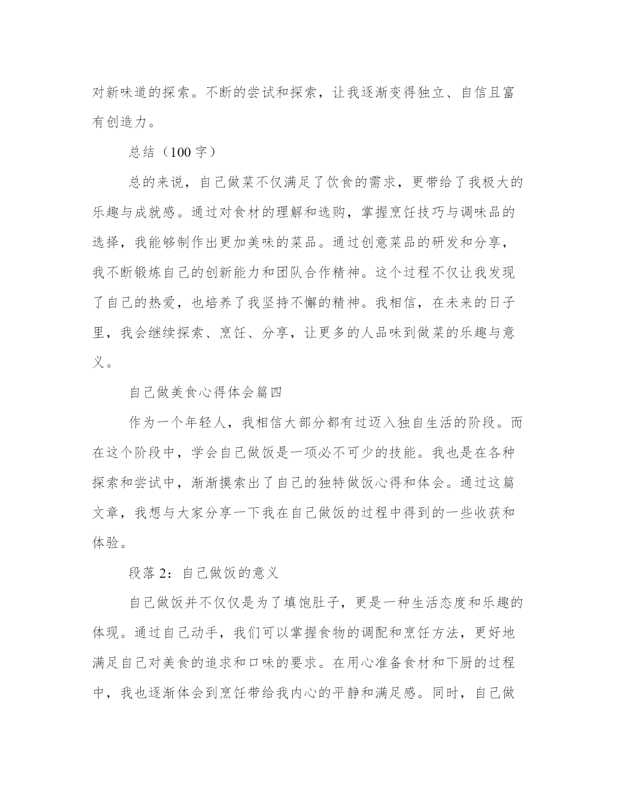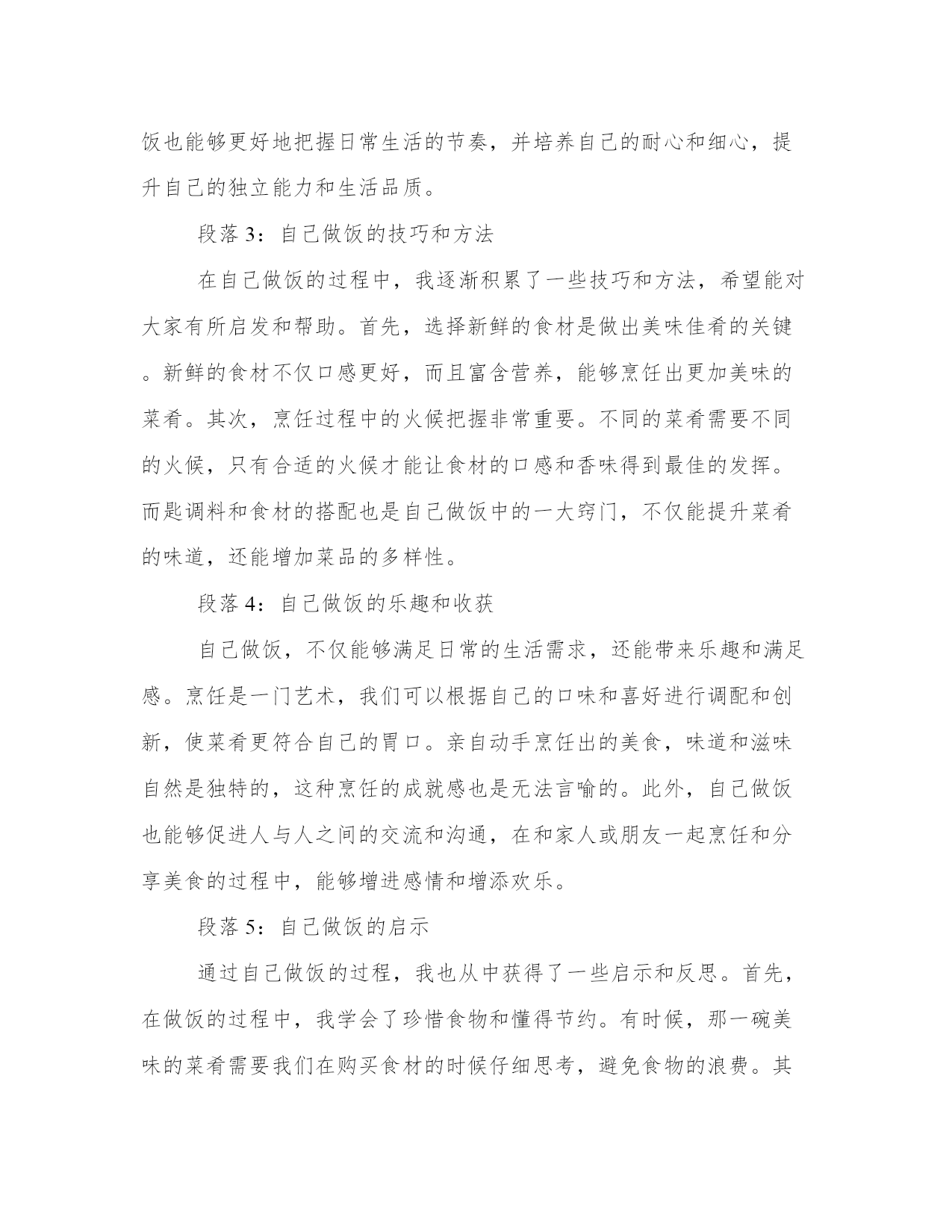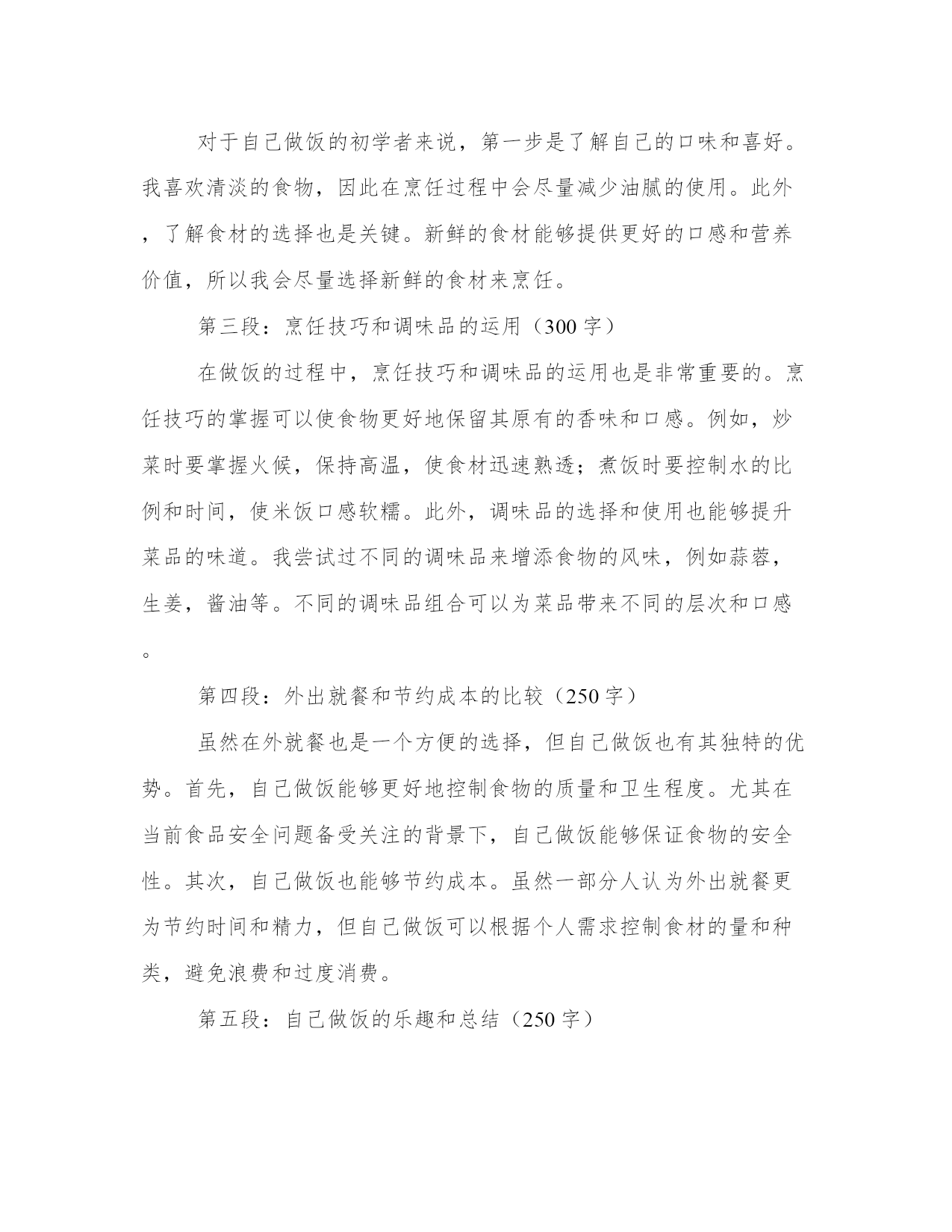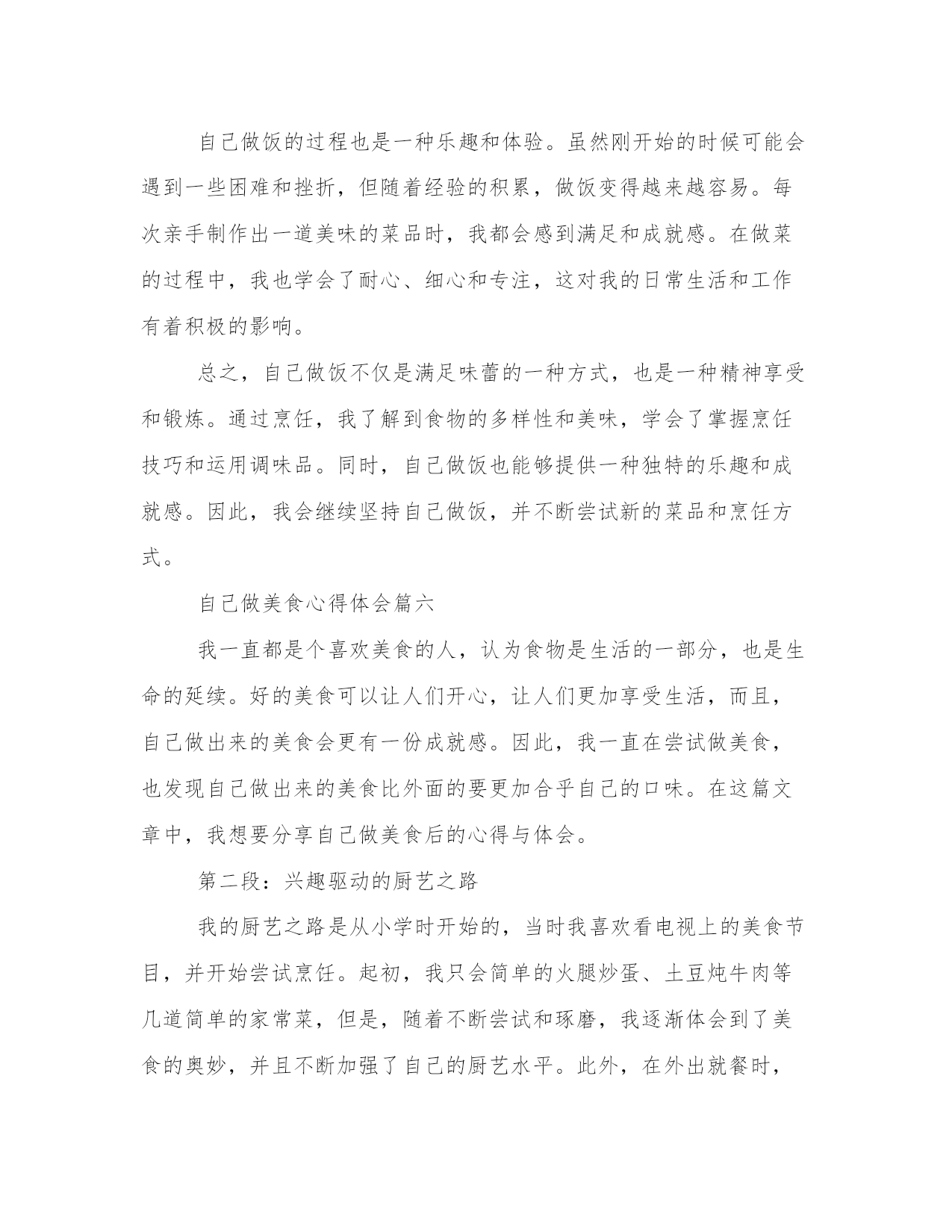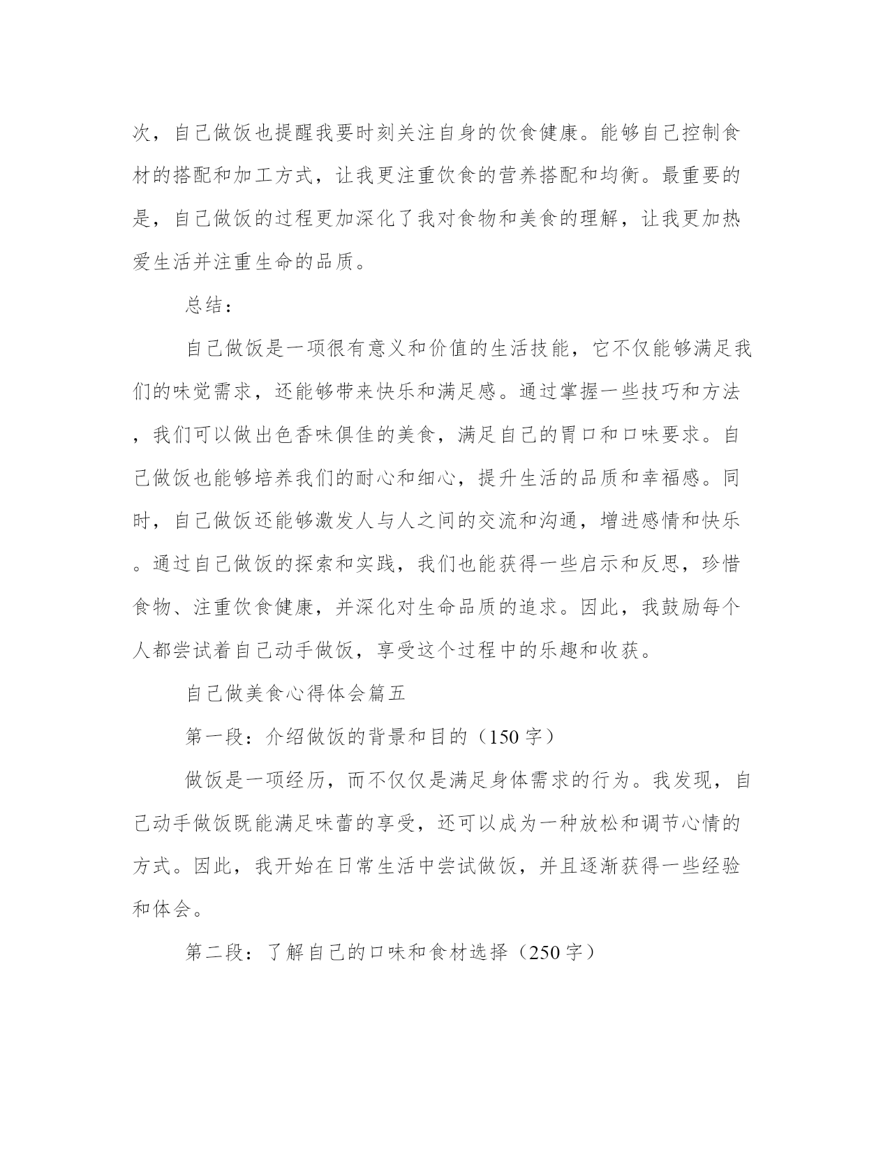 专业自己做美食心得体会(汇总12篇)写心得体会可以让我们更好地整理和归纳自己的经验和知识。如何写一篇较为完美的心得体会是一个需要思考和实践的问题。以下是一些经典的心得体会范文,希望能给大家提供一些写作思路。自己做美食心得体会篇一最近我开始尝试在家里做美食。这是一个全新的经验,使我更加了解食物和烹饪的复杂性。自己动手做饭的过程让我体验了独立、自主和探索的乐趣。在这篇文章中,我将分享我是如何感受、欣赏并体验做美食的。第二段:享受创造美食的过程烹饪过程是自己做美食最重要的一部分。准备并规划好每一个原材料,由此开发出自己的想象力和创造力。随着烹饪过程的深入,我开始感觉到自己的思维逐渐清晰起来,工作效率逐渐提高,思考问题的方式逐渐得到加强。这些体验提高了我的信心并激发了我探索更多的可能性。第三段:享受美食带给我的味蕾体验在烹饪过程中,我开始尝试新的菜式,体验独特的风味和口感。自己动手制作的美食,无论是味道还是颜色都让我非常喜欢。自己做的美食总与众不同,有着自己独特的味道和口感,这让我内心深处有一股满足的感觉。第四段:体验美食与家人、朋友的分享做出精致美味的美食是一个特殊的经历,更让人感到特别的是邀请家人、朋友一起分享。我意识到美食不仅是美味,更是与亲朋好友分享一个在家庭、团体生活中很重要的体验。分享一顿美食的时候,我们会开心地谈笑,用简单的问候融洽了亲密关系。第五段:总结通过这些经验和体验,让我体验到独立、创造、探索和享受美食的乐趣。自己烹饪美食的过程是一个既美好又有趣的经历,通过我们自己的汗水和努力,我们能够制作出一道道独特的菜肴,也通过美食和亲朋好友分享,在回味之余,更增加了一份家的温暖和温馨。自己做美食心得体会篇二做饭是一项基本生活技能,它不仅能满足我们的生活需求,还能培养我们的创造力和独立思考能力。作为一个热爱美食的人,我喜欢自己动手做饭。经过长时间的实践和探索,我积累了一些做饭的心得体会。下面我将以五段式的形式来分享这些心得。第一段:选择食材合乎新鲜和健康的原则好的菜品首先要选择新鲜的食材。新鲜的食材口感更好,营养也更丰富。我经常到菜市场去买菜,通过观察食材的外观、气味和质地来判断其新鲜程度。此外,我还注重选择健康的食材。例如,我会选择纯净的食用油,不使用人造调料和添加剂。保持食材的原汁原味,既能满足味蕾的需求,又能保持身体的健康。第二段:熟悉基本的烹饪技巧和菜谱掌握一些基本的烹饪技巧和菜谱对于做饭的初学者是非常重要的。我从最简单的菜谱开始,先学习基本的切拌、煎炒、烧烤等技巧,逐渐提高自己的烹饪水平。同时,我也会阅读一些烹饪书籍和查找相关的菜谱,了解不同地域的传统菜式和创新的烹饪方法,从而丰富自己的烹饪技能和口味。第三段:注重调味品的搭配和使用调味品是烹饪中非常重要的一环,它能为菜品增添丰富的口味。我会选择高品质的食材来制作自己的调味品,例如自制的酱油、香油和辣椒酱等。在使用调味品的过程中,要注意不同食材的搭配和使用量。适当的调味可以提升菜品的味道,但过重或过淡的调味会影响整体的口感。第四段:充分利用现代化厨具的便利现代厨具的发展为我们的烹饪提供了很多便利。我会充分利用烤箱、电饭煲、电饼铛等现代化厨具。例如,用烤箱可以制作烤肉和烤蔬菜,电饭煲可以一键煮饭,电饼铛可以制作各种口味的煎饼。同时,我也会学习使用更多种类的厨具,例如养生壶、微波炉等,以便更加快捷地制作各种美食。第五段:分享美食和烹饪经验做饭不仅是满足自己的味蕾,也是一种与他人分享的方式。我经常邀请家人和朋友来品尝我做的美食,并将自己的烹饪心得和经验与他们分享。通过交流和探讨,我不断改进自己的烹饪技巧,并从别人那里学到更多的菜谱和创新的烹饪方法。总结:做饭不仅是一种技能,更是一种生活的态度和乐趣。通过选择新鲜健康的食材、学习基本的烹饪技巧和菜谱、注重调味品的搭配和使用、充分利用现代化厨具的便利,以及分享美食和烹饪经验,我们可以在做饭的过程中不断提升自己的独立思考能力和创造力。希望我的心得体会能对大家在厨房里的探索和实践有所帮助。自己做美食心得体会篇三第一段:引言(100字)自己做菜是一种兼具乐趣与挑战的过程。每次在厨房里摆弄食材,烹饪出一道美味的菜品,都让我感到异常兴奋。同时,也体会到了做菜的艰辛和技巧。在烹饪的过程中,我不仅发现了自己的热爱,还积累了许多宝贵的经验和心得。在接下来的文章中,我将分享我在做菜过程中的体会和心得。第二段:对食材的理解与选购(200字)烹饪的第一步,就是选择新鲜优质的食材。在我的实践中,我发现对食材的理解和选购至关重要。不同的菜品需要不同的食材,而且食材的新鲜程度直接关系到菜品的口感和质量。因此,我经常选择去市场购买食材,尽量让食材保持原汁原味的状态。此外,了解不同食材的保存方式,可
