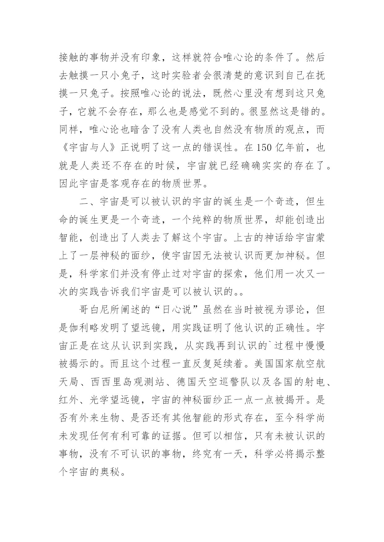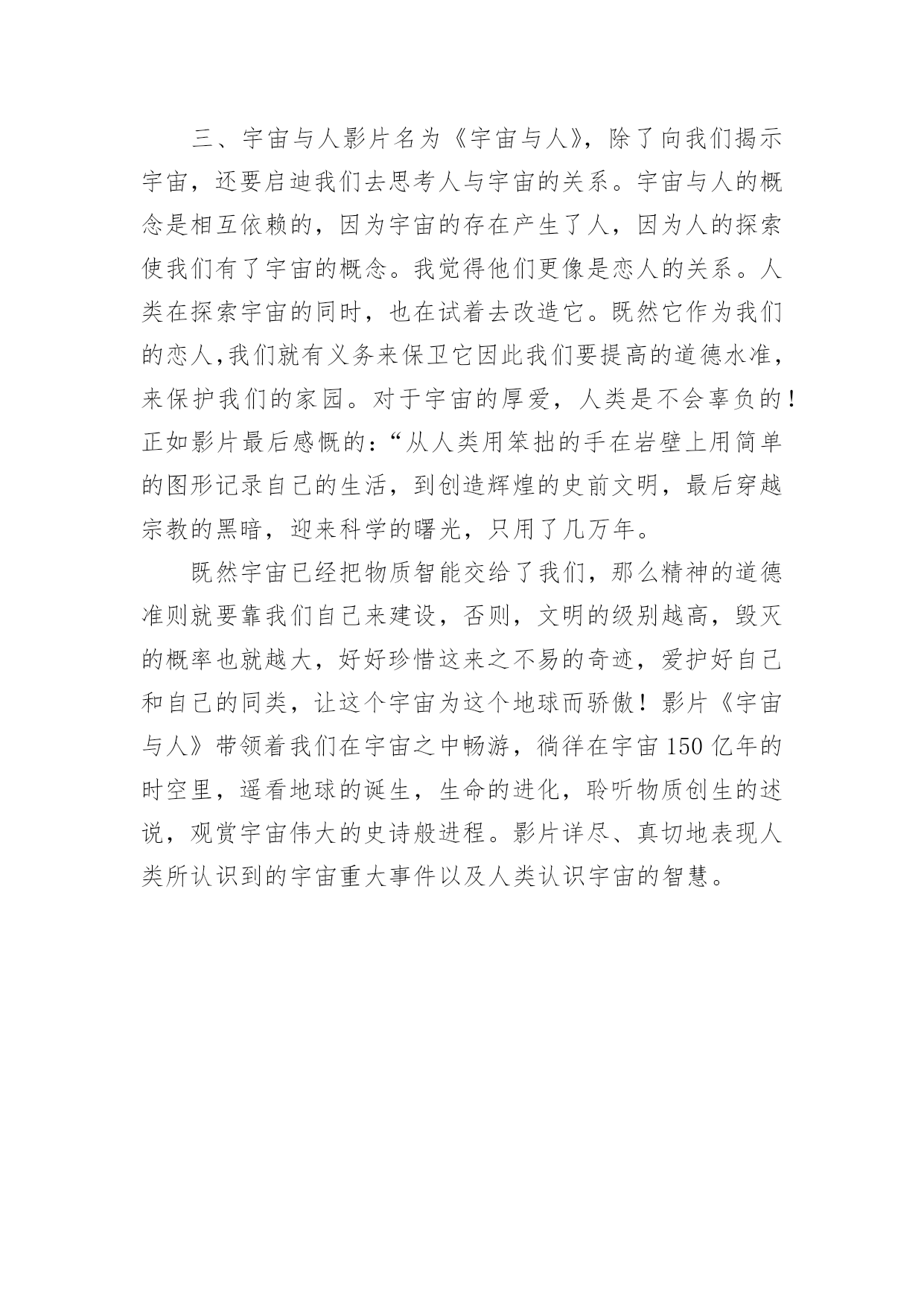 《宇宙与人》观后感的《宇宙与人》观后感的范文浩茫的宇宙充斥着未知与神秘,人这一小小而又奇妙的生物的诞生也揭开了探索宇宙的序幕。从上古描述天空的神话到“地心说”,从哥白尼的“日心说”到伽利略发明了望远镜,随着科技的发展,人们越来越了解到自己是如此渺小地生活在一个奥妙无穷的物质世界中。马克思主义不但向我们介绍了一个物质的世界,也帮助我们去认识这个宇宙与自身。一、宇宙是物质的,是客观存在的。从影片中,我们清楚的地了解到宇宙的本原是物质。150亿年前,一个温度高得不可思议的能量奇点突然爆裂,造就了这个充斥着大大小小星际物质的浩瀚宇宙。而且,这一爆炸过程至今仍在进行着,因为一旦宇宙停止向外运动,它必将会被自身的引力所灭亡。所以说运动是绝对的,从这里我们可以得到答案。宇宙的万物,大至一个星体,小至一粒尘埃,都是由原子所组成的,只不过是在原子的数目上的差异。而原子又由一些更小的微粒因受到微妙的力平衡而构成,微粒再由更小的微粒构成。正是这些运动着微粒构成了一个纯粹的物质世界。在探索宇宙的过程中,学者们各抒己见,大致可分为唯心论与唯物论。唯心论更加倾向于意识,认为物由心生,不去想,那个物体就不存在了。可是我们试想一下,先闭上眼睛,那么我们对接下来会接触的事物并没有印象,这样就符合唯心论的条件了。然后去触摸一只小兔子,这时实验者会很清楚的意识到自己在抚摸一只兔子。按照唯心论的说法,既然心里没有想到这只兔子,它就不会存在,那么也是感觉不到的。很显然这是错的。同样,唯心论也暗含了没有人类也自然没有物质的观点,而《宇宙与人》正说明了这一点的错误性。在150亿年前,也就是人类还不存在的时候,宇宙就已经确确实实的存在了。因此宇宙是客观存在的物质世界。二、宇宙是可以被认识的宇宙的诞生是一个奇迹,但生命的诞生更是一个奇迹,一个纯粹的物质世界,却能创造出智能,创造出了人类去了解这个宇宙。上古的神话给宇宙蒙上了一层神秘的面纱,使宇宙因无法被认识而更加神秘。但是,科学家们并没有停止过对宇宙的探索,他们用一次又一次的实践告诉我们宇宙是可以被认识的。。哥白尼所阐述的“日心说”虽然在当时被视为谬论,但是伽利略发明了望远镜,用实践证明了他认识的正确性。宇宙正是在这从认识到实践,从实践再到认识的`过程中慢慢被揭示的。而且这个过程一直反复延续着。美国国家航空航天局、西西里岛观测站、德国天空巡警队以及各国的射电、红外、光学望远镜,宇宙的神秘面纱正一点一点被揭开。是否有外来生物、是否还有其他智能的形式存在,至今科学尚未发现任何有利可靠的证据。但可以相信,只有未被认识的事物,没有不可认识的事物,终究有一天,科学必将揭示整个宇宙的奥秘。三、宇宙与人影片名为《宇宙与人》,除了向我们揭示宇宙,还要启迪我们去思考人与宇宙的关系。宇宙与人的概念是相互依赖的,因为宇宙的存在产生了人,因为人的探索使我们有了宇宙的概念。我觉得他们更像是恋人的关系。人类在探索宇宙的同时,也在试着去改造它。既然它作为我们的恋人,我们就有义务来保卫它因此我们要提高的道德水准,来保护我们的家园。对于宇宙的厚爱,人类是不会辜负的!正如影片最后感慨的:“从人类用笨拙的手在岩壁上用简单的图形记录自己的生活,到创造辉煌的史前文明,最后穿越宗教的黑暗,迎来科学的曙光,只用了几万年。既然宇宙已经把物质智能交给了我们,那么精神的道德准则就要靠我们自己来建设,否则,文明的级别越高,毁灭的概率也就越大,好好珍惜这来之不易的奇迹,爱护好自己和自己的同类,让这个宇宙为这个地球而骄傲!影片《宇宙与人》带领着我们在宇宙之中畅游,徜徉在宇宙150亿年的时空里,遥看地球的诞生,生命的进化,聆听物质创生的述说,观赏宇宙伟大的史诗般进程。影片详尽、真切地表现人类所认识到的宇宙重大事件以及人类认识宇宙的智慧。