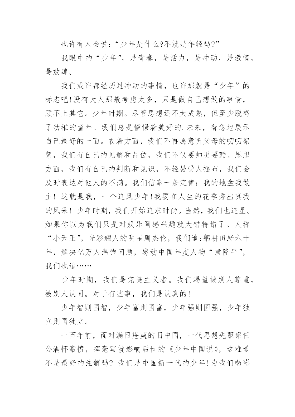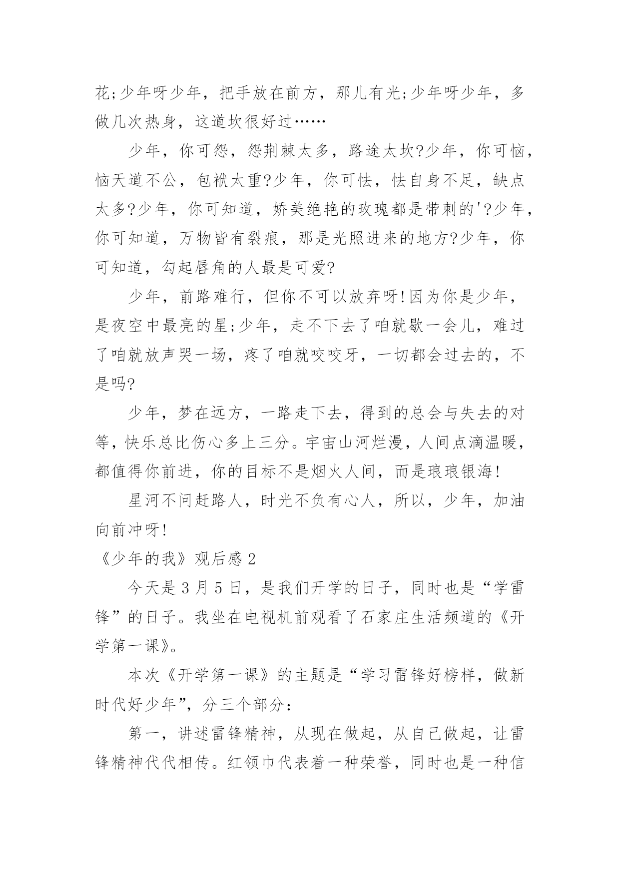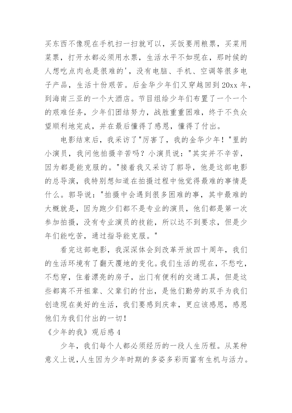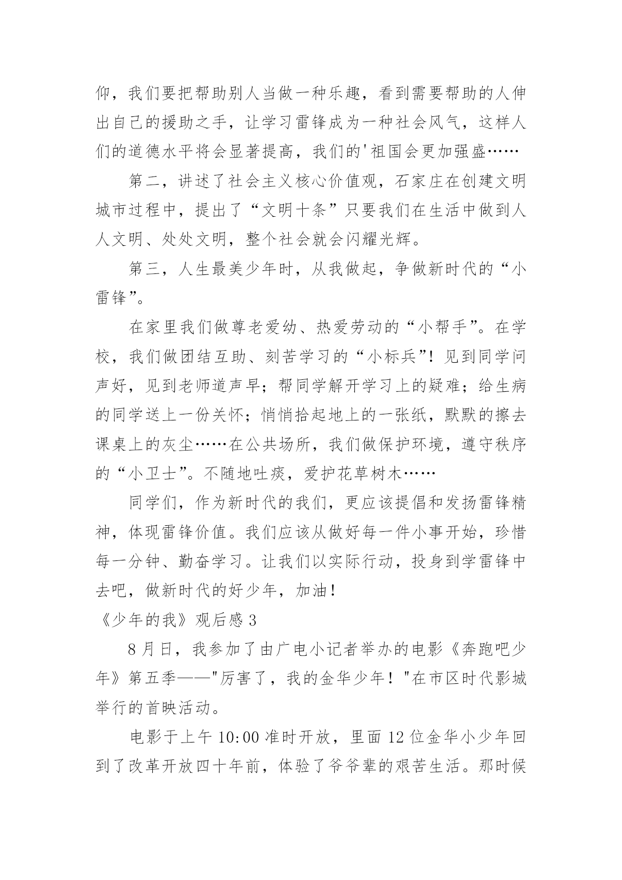 《少年的我》观后感《少年的我》观后感当认真看完一部影视作品后,相信大家的收获肯定不少吧,何不写一篇观后感记录下呢?那要怎么写好观后感呢?以下是小编为大家收集的《少年的我》观后感,欢迎大家借鉴与参考,希望对大家有所帮助。《少年的我》观后感1翩翩少年郎,眉眼轻狂,不可一世。——题记莫峻说:“少年与爱永不老去,即使披荆斩棘,丢失怒马鲜衣。”余光中说:“少年还是少年的月光,九州一色还是李白的霜。”张晓风说:“少年振衣,可作千里风幡;少年瞬目,亦是万古清流。”我说,少年轻狂,驰骋远方。少年的狂是李白的酒,浓而烈,又醉人的紧。清醒时胸怀鸿鹄之志,烂醉时把月光揉碎,掷向远方;少年的狂是杜甫的山,高而远,又让人心怀斗志。为家国献力,览众山之小,即使前路蜿蜒坎坷,仍坚信峰回路转,柳暗花明;少年的狂是纳兰的花,美而短,又让人回味无穷。青春像一场烟火,美得让人窒息,又短的让人落泪。少年终会长大,站在成长的尽头咀嚼过去,总会为曾经的狂而啼笑皆非。少年呀少年,你的肩上是清风明月,你的远方是诗与繁花;少年呀少年,把手放在前方,那儿有光;少年呀少年,多做几次热身,这道坎很好过……少年,你可怨,怨荆棘太多,路途太坎?少年,你可恼,恼天道不公,包袱太重?少年,你可怯,怯自身不足,缺点太多?少年,你可知道,娇美绝艳的玫瑰都是带刺的'?少年,你可知道,万物皆有裂痕,那是光照进来的地方?少年,你可知道,勾起唇角的人最是可爱?少年,前路难行,但你不可以放弃呀!因为你是少年,是夜空中最亮的星;少年,走不下去了咱就歇一会儿,难过了咱就放声哭一场,疼了咱就咬咬牙,一切都会过去的,不是吗?少年,梦在远方,一路走下去,得到的总会与失去的对等,快乐总比伤心多上三分。宇宙山河烂漫,人间点滴温暖,都值得你前进,你的目标不是烟火人间,而是琅琅银海!星河不问赶路人,时光不负有心人,所以,少年,加油向前冲呀!《少年的我》观后感2今天是3月5日,是我们开学的日子,同时也是“学雷锋”的日子。我坐在电视机前观看了石家庄生活频道的《开学第一课》。本次《开学第一课》的主题是“学习雷锋好榜样,做新时代好少年”,分三个部分:第一,讲述雷锋精神,从现在做起,从自己做起,让雷锋精神代代相传。红领巾代表着一种荣誉,同时也是一种信仰,我们要把帮助别人当做一种乐趣,看到需要帮助的人伸出自己的援助之手,让学习雷锋成为一种社会风气,这样人们的道德水平将会显著提高,我们的'祖国会更加强盛……第二,讲述了社会主义核心价值观,石家庄在创建文明城市过程中,提出了“文明十条”只要我们在生活中做到人人文明、处处文明,整个社会就会闪耀光辉。第三,人生最美少年时,从我做起,争做新时代的“小雷锋”。在家里我们做尊老爱幼、热爱劳动的“小帮手”。在学校,我们做团结互助、刻苦学习的“小标兵”!见到同学问声好,见到老师道声早;帮同学解开学习上的疑难;给生病的同学送上一份关怀;悄悄拾起地上的一张纸,默默的擦去课桌上的灰尘……在公共场所,我们做保护环境,遵守秩序的“小卫士”。不随地吐痰,爱护花草树木……同学们,作为新时代的我们,更应该提倡和发扬雷锋精神,体现雷锋价值。我们应该从做好每一件小事开始,珍惜每一分钟、勤奋学习。让我们以实际行动,投身到学雷锋中去吧,做新时代的好少年,加油!《少年的我》观后感38月日,我参加了由广电小记者举办的电影《奔跑吧少年》第五季——"厉害了,我的金华少年!"在市区时代影城举行的首映活动。电影于上午10:00准时开放,里面12位金华小少年回到了改革开放四十年前,体验了爷爷辈的艰苦生活。那时候买东西不像现在手机扫一扫就可以,买饭要用粮票,买菜用菜票,打开水都必须用水票,生活水平不如现在,那时候的人想吃点肉也是很难的',没有电脑、手机、空调等很多电子产品,生活十份艰苦。后金华少年们又穿越回到20xx年,到海南三亚的一个大酒店。节目组给少年们布置了一个一个的艰难任务,少年们团结努力,战胜重重困难,终于不负众望顺利地完成,并在最后懂得了感恩,懂得了付出。电影结束后,我采访了"厉害了,我的金华少年!"里的小演员,我问他拍摄辛苦吗?小演员说:"其实并不辛苦,因为都是能克服的。"接着我又采访了郭导,他是这部电影的总导演,我特别想知道在拍摄过程中他觉得最难的事情是什么。郭导说:"拍摄中会遇到很多困难的事,其中最难的大概就是,因为跑少们都不是专业的演员,他们都是第一次参加拍摄,没有专业演员的技能,所以达不到要求,但是少年们能吃苦,通过指导能克服。"看完这部电影,我深深体会到改革开放四十周年,我们的生活环境有了翻天覆地的变化。我们生活的现在,不愁吃,不愁穿,住着漂亮的房子,出门有便利的交通工具,但是这些都离不开祖辈、父辈们的付出,是他们勤劳的双手为我们创造现在美好的生活,我们要感到庆幸,更应该感恩,感恩他们为我们付出的一切!《少年的我