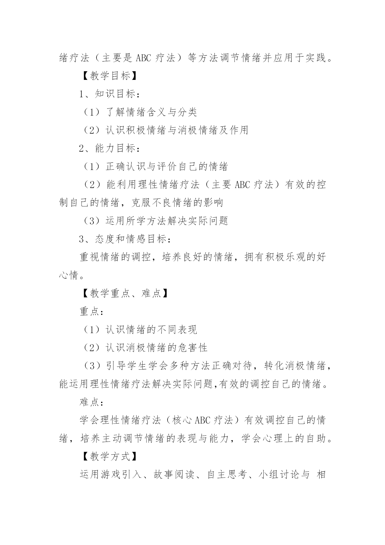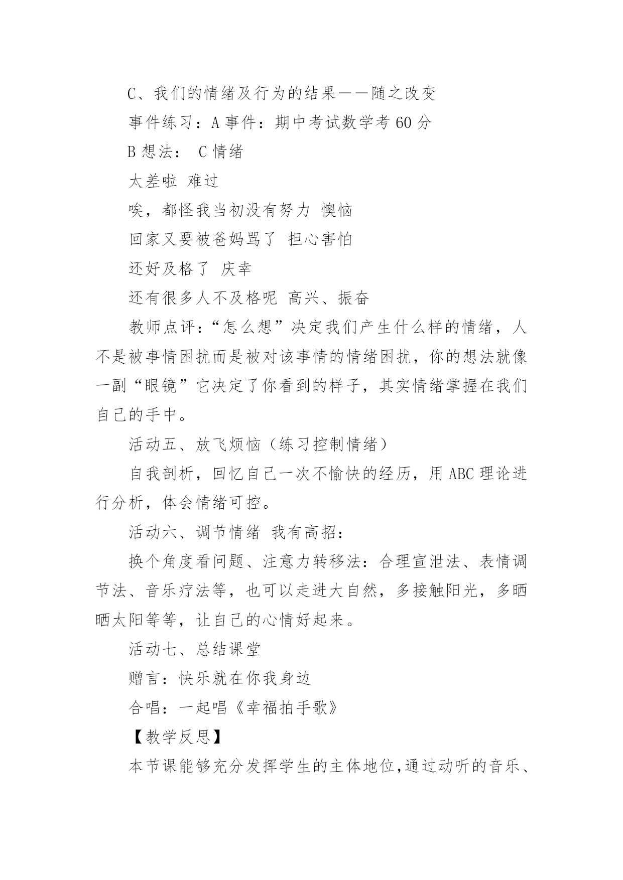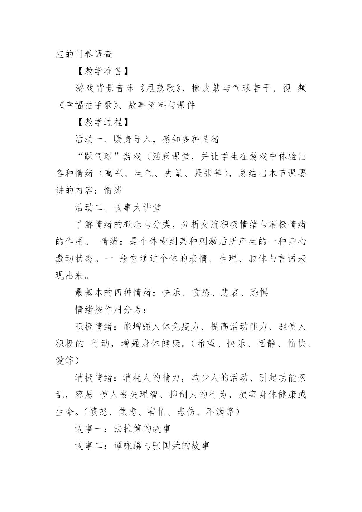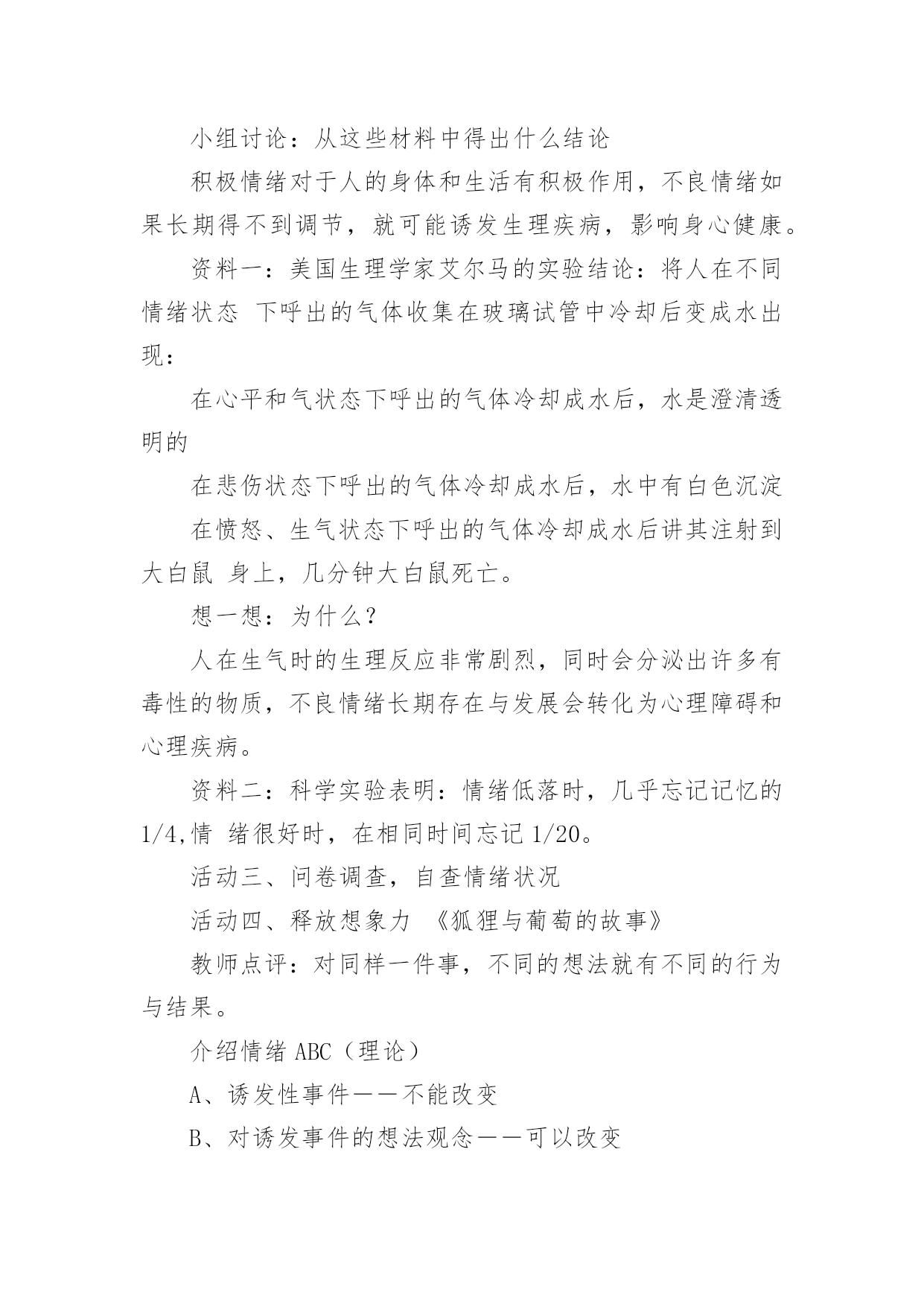 情绪心理健康教案作为一名老师,编写教案是必不可少的,借助教案可以恰当地选择和运用教学方法,调动学生学习的积极性。教案应该怎么写呢?下面是小编为大家整理的情绪心理健康教案,仅供参考,大家一起来看看吧。情绪心理健康教案1【教学对象】初二年级学生【教学课时】1课时(45分钟)【设计意图】中小学心理健康教育的目标要求使学生不断正确的认识自我,增强调控自我,承受挫折,适应环境的能力;培养学生乐观向上的心理品质,促进学生人格的健康发展。情绪是人的内心世界的反映,是人们在认识和处理事物的过程中表现出来的一种反应,拥有良好的情绪则是衡量一个人心理健康的一个重要指标。本节辅导课依据八年级学生的心理特点设计,进入青春期后的他们虽然已有一定的独立意识,但心理还不够成熟,容易出现内心需要与意志调控之间的失调。在情绪特征上表现为好冲动、不稳定、极端化等特点。我从学生的实际出发,采用自主思考、交流感悟、讨论探究等方式,使学生懂得一些情绪方面的理论知识,并学会用理性情绪疗法(主要是ABC疗法)等方法调节情绪并应用于实践。【教学目标】1、知识目标:(1)了解情绪含义与分类(2)认识积极情绪与消极情绪及作用2、能力目标:(1)正确认识与评价自己的情绪(2)能利用理性情绪疗法(主要ABC疗法)有效的控制自己的情绪,克服不良情绪的影响(3)运用所学方法解决实际问题3、态度和情感目标:重视情绪的调控,培养良好的情绪,拥有积极乐观的好心情。【教学重点、难点】重点:(1)认识情绪的不同表现(2)认识消极情绪的危害性(3)引导学生学会多种方法正确对待,转化消极情绪,能运用理性情绪疗法解决实际问题,有效的调控自己的情绪。难点:学会理性情绪疗法(核心ABC疗法)有效调控自己的情绪,培养主动调节情绪的表现与能力,学会心理上的自助。【教学方式】运用游戏引入、故事阅读、自主思考、小组讨论与相应的问卷调查【教学准备】游戏背景音乐《甩葱歌》、橡皮筋与气球若干、视频《幸福拍手歌》、故事资料与课件【教学过程】活动一、暖身导入,感知多种情绪“踩气球”游戏(活跃课堂,并让学生在游戏中体验出各种情绪(高兴、生气、失望、紧张等),总结出本节课要讲的内容:情绪活动二、故事大讲堂了解情绪的概念与分类,分析交流积极情绪与消极情绪的作用。情绪:是个体受到某种刺激后所产生的一种身心激动状态。一般它通过个体的表情、生理、肢体与言语表现出来。最基本的四种情绪:快乐、愤怒、悲哀、恐惧情绪按作用分为:积极情绪:能增强人体免疫力、提高活动能力、驱使人积极的行动,增强身体健康。(希望、快乐、恬静、愉快、爱等)消极情绪:消耗人的精力,减少人的活动、引起功能紊乱,容易使人丧失理智、抑制人的行为,损害身体健康或生命。(愤怒、焦虑、害怕、悲伤、不满等)故事一:法拉第的故事故事二:谭咏麟与张国荣的故事小组讨论:从这些材料中得出什么结论积极情绪对于人的身体和生活有积极作用,不良情绪如果长期得不到调节,就可能诱发生理疾病,影响身心健康。资料一:美国生理学家艾尔马的实验结论:将人在不同情绪状态下呼出的气体收集在玻璃试管中冷却后变成水出现:在心平和气状态下呼出的气体冷却成水后,水是澄清透明的在悲伤状态下呼出的气体冷却成水后,水中有白色沉淀在愤怒、生气状态下呼出的气体冷却成水后讲其注射到大白鼠身上,几分钟大白鼠死亡。想一想:为什么?人在生气时的生理反应非常剧烈,同时会分泌出许多有毒性的物质,不良情绪长期存在与发展会转化为心理障碍和心理疾病。资料二:科学实验表明:情绪低落时,几乎忘记记忆的1/4,情绪很好时,在相同时间忘记1/20。活动三、问卷调查,自查情绪状况活动四、释放想象力《狐狸与葡萄的故事》教师点评:对同样一件事,不同的想法就有不同的行为与结果。介绍情绪ABC(理论)A、诱发性事件――不能改变B、对诱发事件的想法观念――可以改变C、我们的情绪及行为的结果――随之改变事件练习:A事件:期中考试数学考60分B想法:C情绪太差啦难过唉,都怪我当初没有努力懊恼回家又要被爸妈骂了担心害怕还好及格了庆幸还有很多人不及格呢高兴、振奋教师点评:“怎么想”决定我们产生什么样的情绪,人不是被事情困扰而是被对该事情的情绪困扰,你的想法就像一副“眼镜”它决定了你看到的样子,其实情绪掌握在我们自己的手中。活动五、放飞烦恼(练习控制情绪)自我剖析,回忆自己一次不愉快的经历,用ABC理论进行分析,体会情绪可控。活动六、调节情绪我有高招:换个角度看问题、注意力转移法:合理宣泄法、表情调节法、音乐疗法等,也可以走进大自然,多接触阳光,多晒晒太阳等等,让自己的心情好起来。活动七、总结课堂赠言:快乐就在你我身边合唱:一起唱《幸福拍手歌》【教学反思】本节课能够充分发挥学生的主体地位,通过动听的音乐、好玩的游戏,有趣的故事,采用自主思考、交流感悟、讨论探究等多种方式来使