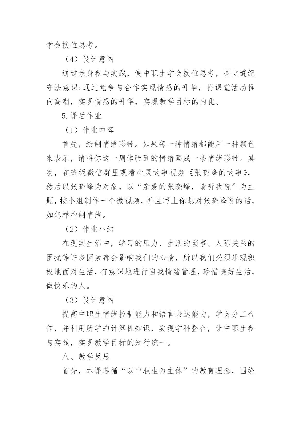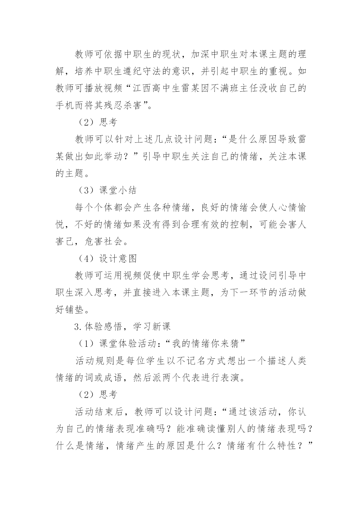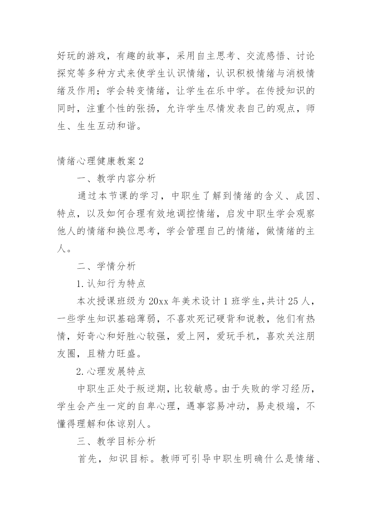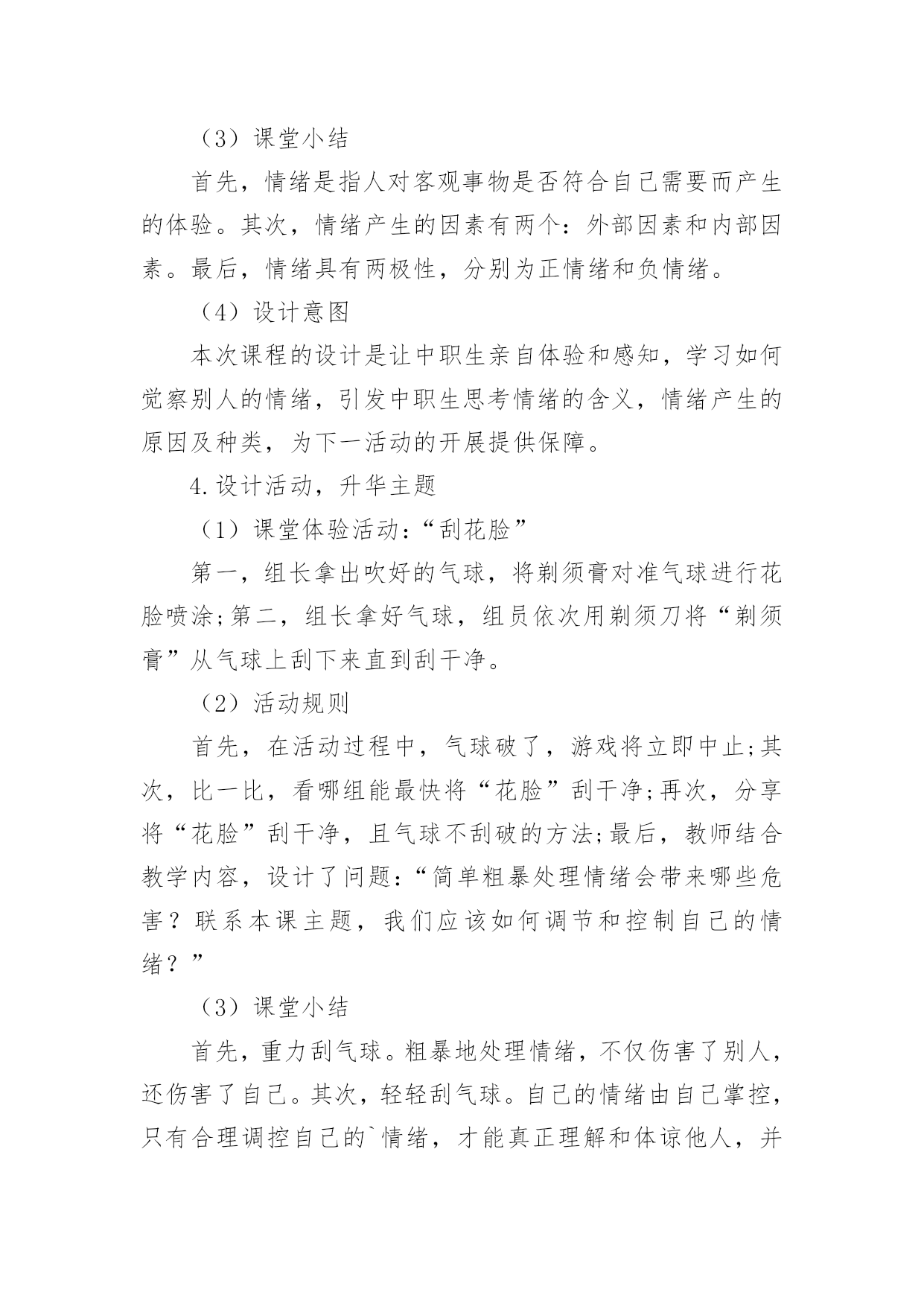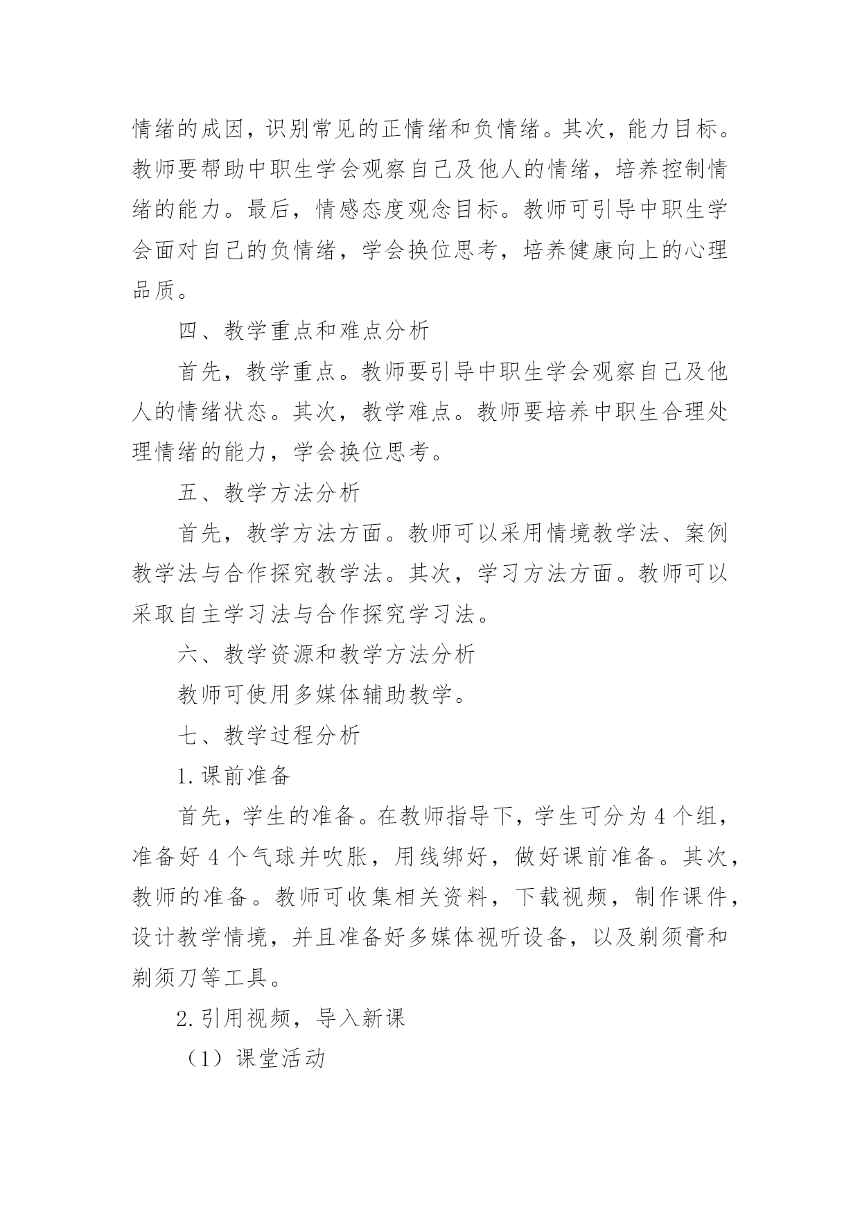 情绪心理健康教案作为一名老师,编写教案是必不可少的,借助教案可以恰当地选择和运用教学方法,调动学生学习的积极性。教案应该怎么写呢?下面是小编为大家整理的情绪心理健康教案,仅供参考,大家一起来看看吧。情绪心理健康教案1【教学对象】初二年级学生【教学课时】1课时(45分钟)【设计意图】中小学心理健康教育的目标要求使学生不断正确的认识自我,增强调控自我,承受挫折,适应环境的能力;培养学生乐观向上的心理品质,促进学生人格的健康发展。情绪是人的内心世界的反映,是人们在认识和处理事物的过程中表现出来的一种反应,拥有良好的情绪则是衡量一个人心理健康的一个重要指标。本节辅导课依据八年级学生的心理特点设计,进入青春期后的他们虽然已有一定的独立意识,但心理还不够成熟,容易出现内心需要与意志调控之间的失调。在情绪特征上表现为好冲动、不稳定、极端化等特点。我从学生的实际出发,采用自主思考、交流感悟、讨论探究等方式,使学生懂得一些情绪方面的理论知识,并学会用理性情绪疗法(主要是ABC疗法)等方法调节情绪并应用于实践。【教学目标】1、知识目标:(1)了解情绪含义与分类(2)认识积极情绪与消极情绪及作用2、能力目标:(1)正确认识与评价自己的情绪(2)能利用理性情绪疗法(主要ABC疗法)有效的控制自己的情绪,克服不良情绪的影响(3)运用所学方法解决实际问题3、态度和情感目标:重视情绪的调控,培养良好的情绪,拥有积极乐观的好心情。【教学重点、难点】重点:(1)认识情绪的不同表现(2)认识消极情绪的危害性(3)引导学生学会多种方法正确对待,转化消极情绪,能运用理性情绪疗法解决实际问题,有效的调控自己的情绪。难点:学会理性情绪疗法(核心ABC疗法)有效调控自己的情绪,培养主动调节情绪的表现与能力,学会心理上的自助。【教学方式】运用游戏引入、故事阅读、自主思考、小组讨论与相应的问卷调查【教学准备】游戏背景音乐《甩葱歌》、橡皮筋与气球若干、视频《幸福拍手歌》、故事资料与课件【教学过程】活动一、暖身导入,感知多种情绪“踩气球”游戏(活跃课堂,并让学生在游戏中体验出各种情绪(高兴、生气、失望、紧张等),总结出本节课要讲的内容:情绪活动二、故事大讲堂了解情绪的概念与分类,分析交流积极情绪与消极情绪的作用。情绪:是个体受到某种刺激后所产生的一种身心激动状态。一般它通过个体的表情、生理、肢体与言语表现出来。最基本的四种情绪:快乐、愤怒、悲哀、恐惧情绪按作用分为:积极情绪:能增强人体免疫力、提高活动能力、驱使人积极的行动,增强身体健康。(希望、快乐、恬静、愉快、爱等)消极情绪:消耗人的精力,减少人的活动、引起功能紊乱,容易使人丧失理智、抑制人的行为,损害身体健康或生命。(愤怒、焦虑、害怕、悲伤、不满等)故事一:法拉第的故事故事二:谭咏麟与张国荣的故事小组讨论:从这些材料中得出什么结论积极情绪对于人的身体和生活有积极作用,不良情绪如果长期得不到调节,就可能诱发生理疾病,影响身心健康。资料一:美国生理学家艾尔马的实验结论:将人在不同情绪状态下呼出的气体收集在玻璃试管中冷却后变成水出现:在心平和气状态下呼出的气体冷却成水后,水是澄清透明的在悲伤状态下呼出的气体冷却成水后,水中有白色沉淀在愤怒、生气状态下呼出的气体冷却成水后讲其注射到大白鼠身上,几分钟大白鼠死亡。想一想:为什么?人在生气时的生理反应非常剧烈,同时会分泌出许多有毒性的物质,不良情绪长期存在与发展会转化为心理障碍和心理疾病。资料二:科学实验表明:情绪低落时,几乎忘记记忆的1/4,情绪很好时,在相同时间忘记1/20。活动三、问卷调查,自查情绪状况活动四、释放想象力《狐狸与葡萄的故事》教师点评:对同样一件事,不同的想法就有不同的行为与结果。介绍情绪ABC(理论)A、诱发性事件――不能改变B、对诱发事件的想法观念――可以改变C、我们的情绪及行为的结果――随之改变事件练习:A事件:期中考试数学考60分B想法:C情绪太差啦难过唉,都怪我当初没有努力懊恼回家又要被爸妈骂了担心害怕还好及格了庆幸还有很多人不及格呢高兴、振奋教师点评:“怎么想”决定我们产生什么样的情绪,人不是被事情困扰而是被对该事情的情绪困扰,你的想法就像一副“眼镜”它决定了你看到的样子,其实情绪掌握在我们自己的手中。活动五、放飞烦恼(练习控制情绪)自我剖析,回忆自己一次不愉快的经历,用ABC理论进行分析,体会情绪可控。活动六、调节情绪我有高招:换个角度看问题、注意力转移法:合理宣泄法、表情调节法、音乐疗法等,也可以走进大自然,多接触阳光,多晒晒太阳等等,让自己的心情好起来。活动七、总结课堂赠言:快乐就在你我身边合唱:一起唱《幸福拍手歌》【教学反思】本节课能够充分发挥学生的主体地位,通过动听的音乐、好玩的游戏,有趣的故事,采用自主思考、交流感悟、讨论探究等多种方式来使
